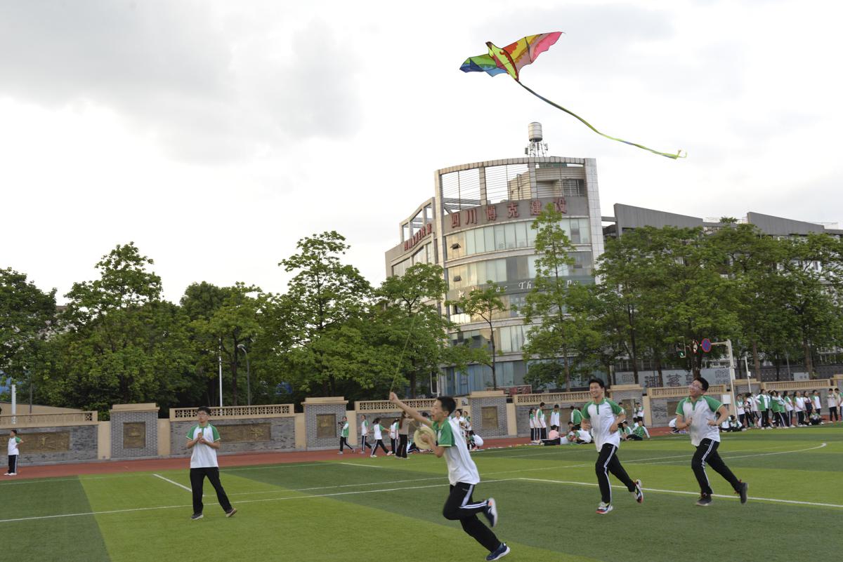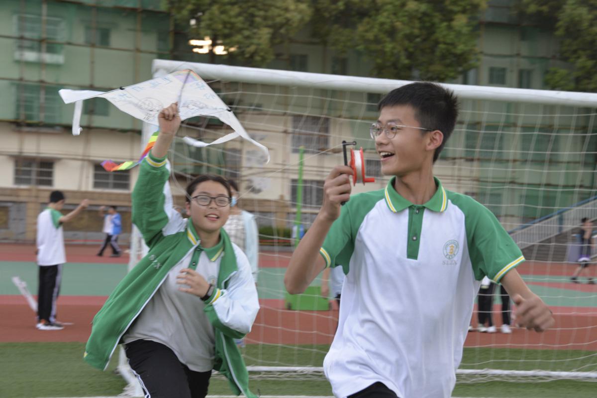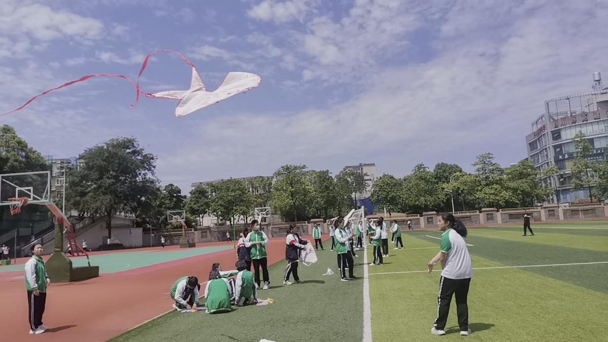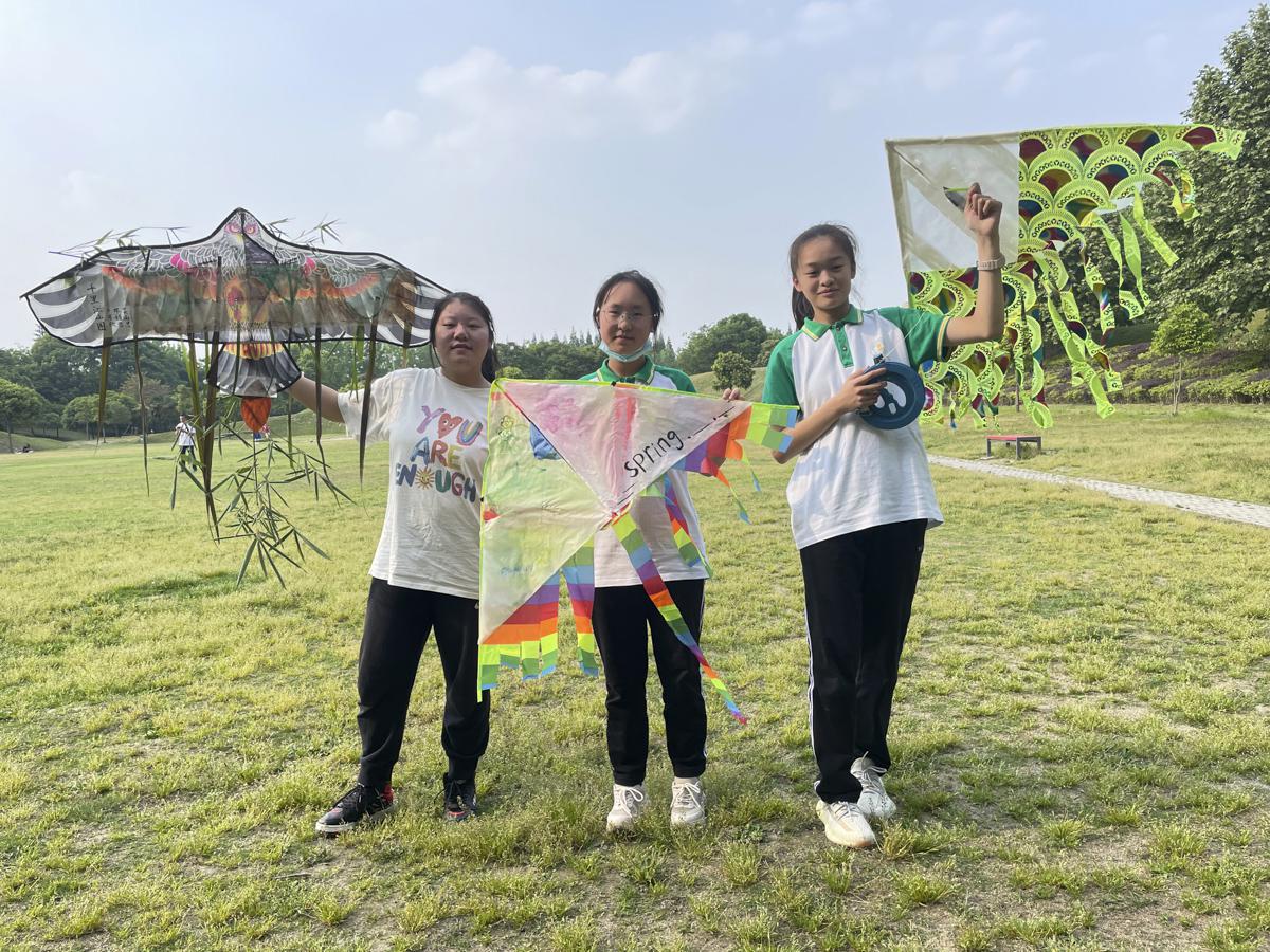 同學(xué)帶上自制風(fēng)箏到操場(chǎng)試