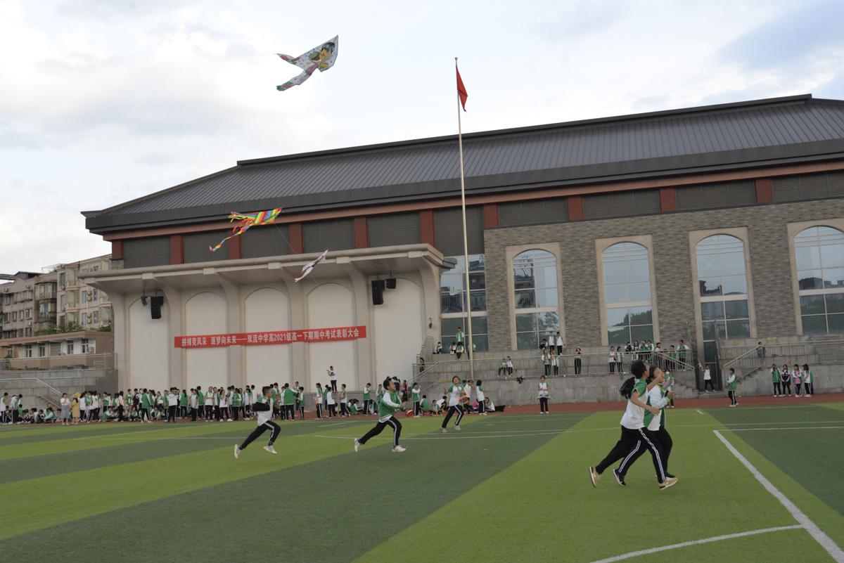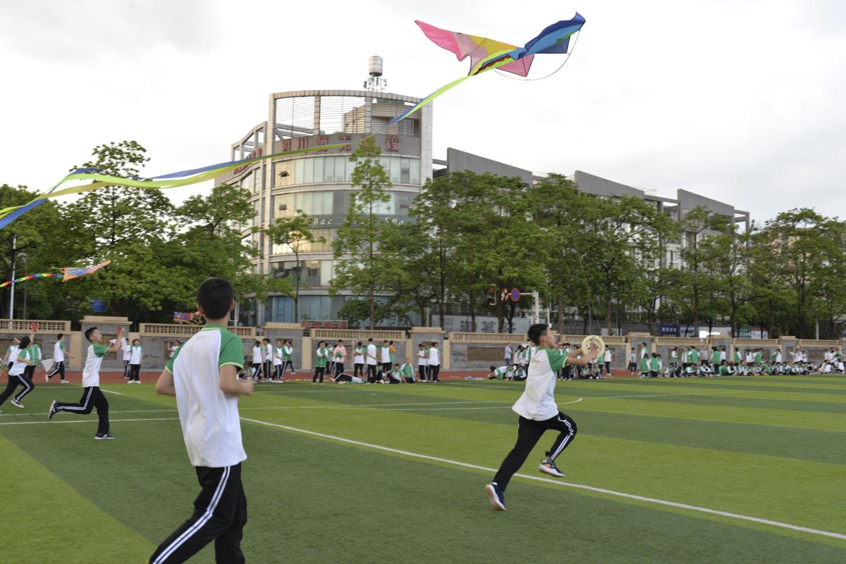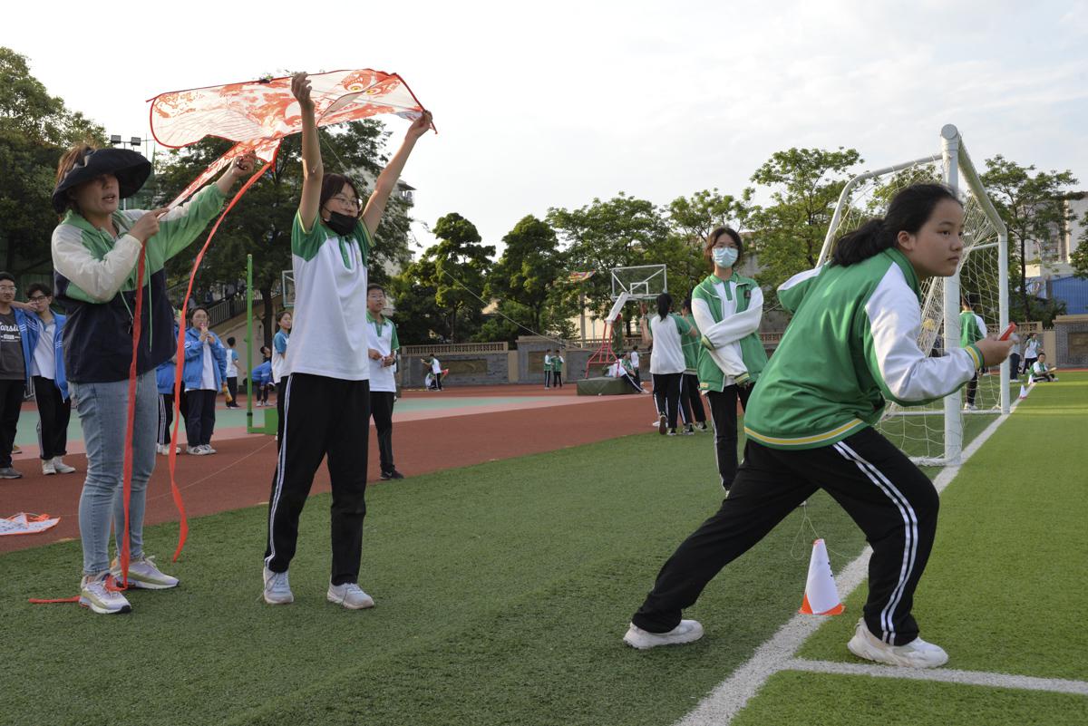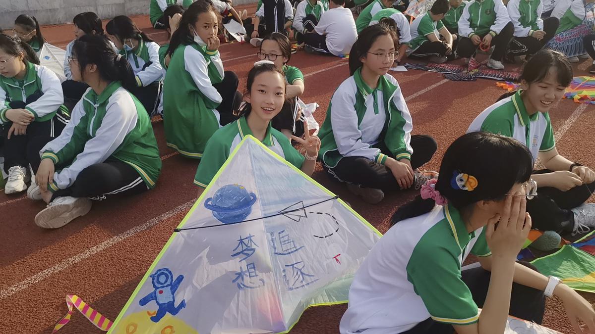 數(shù)學(xué)趙江老師組織本班同學(xué)帶上自制風(fēng)箏到操場(chǎng)試