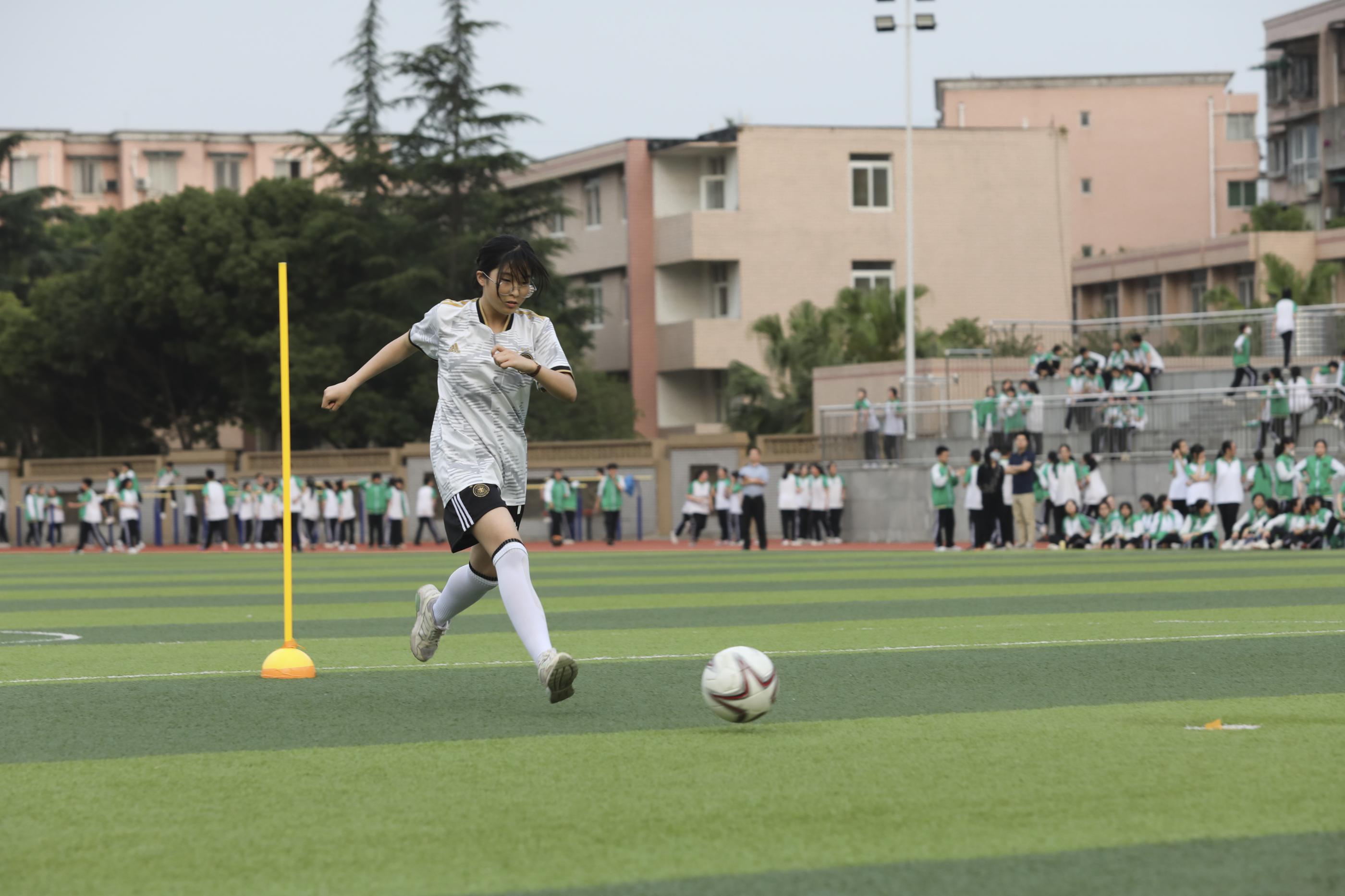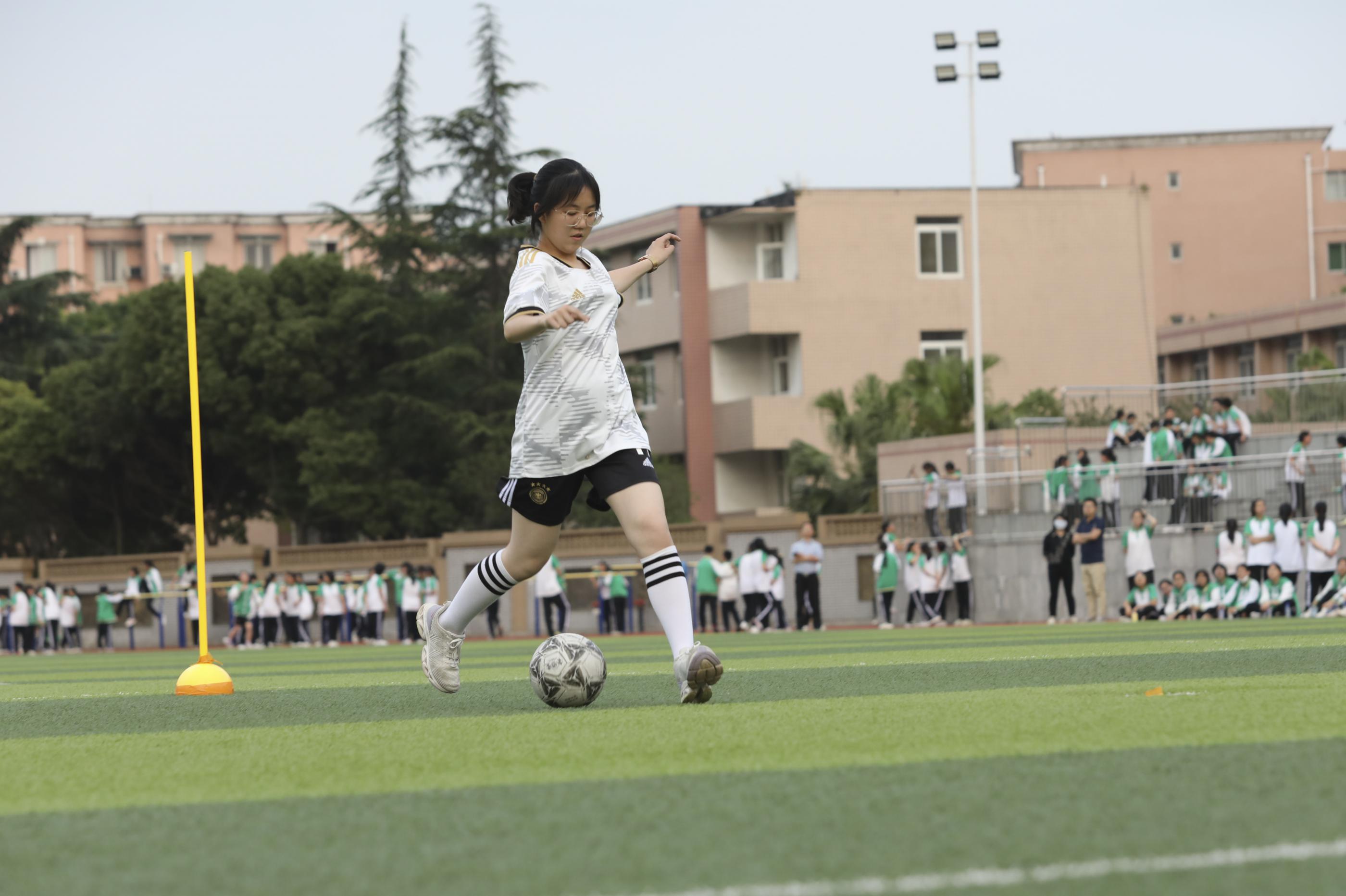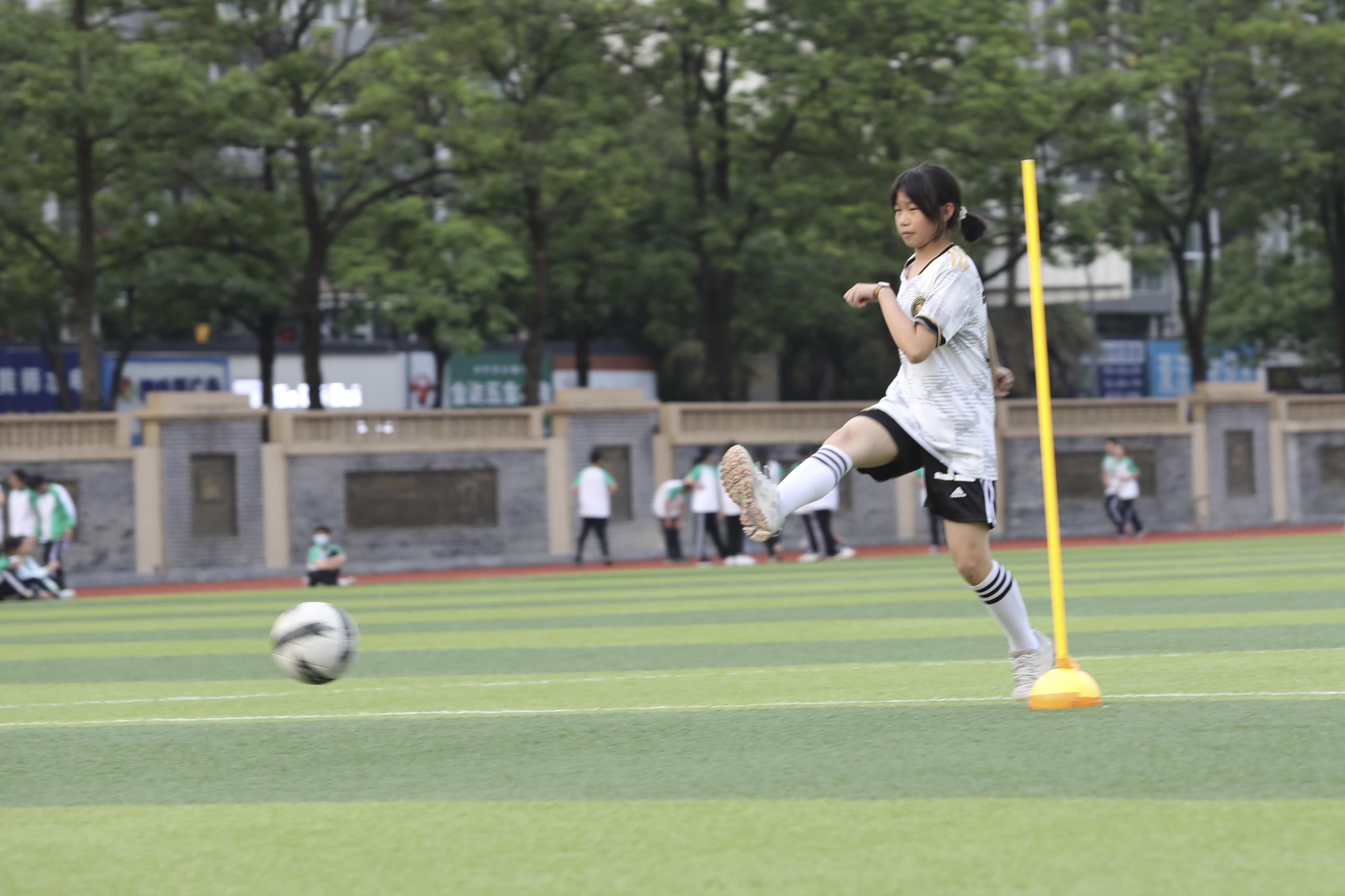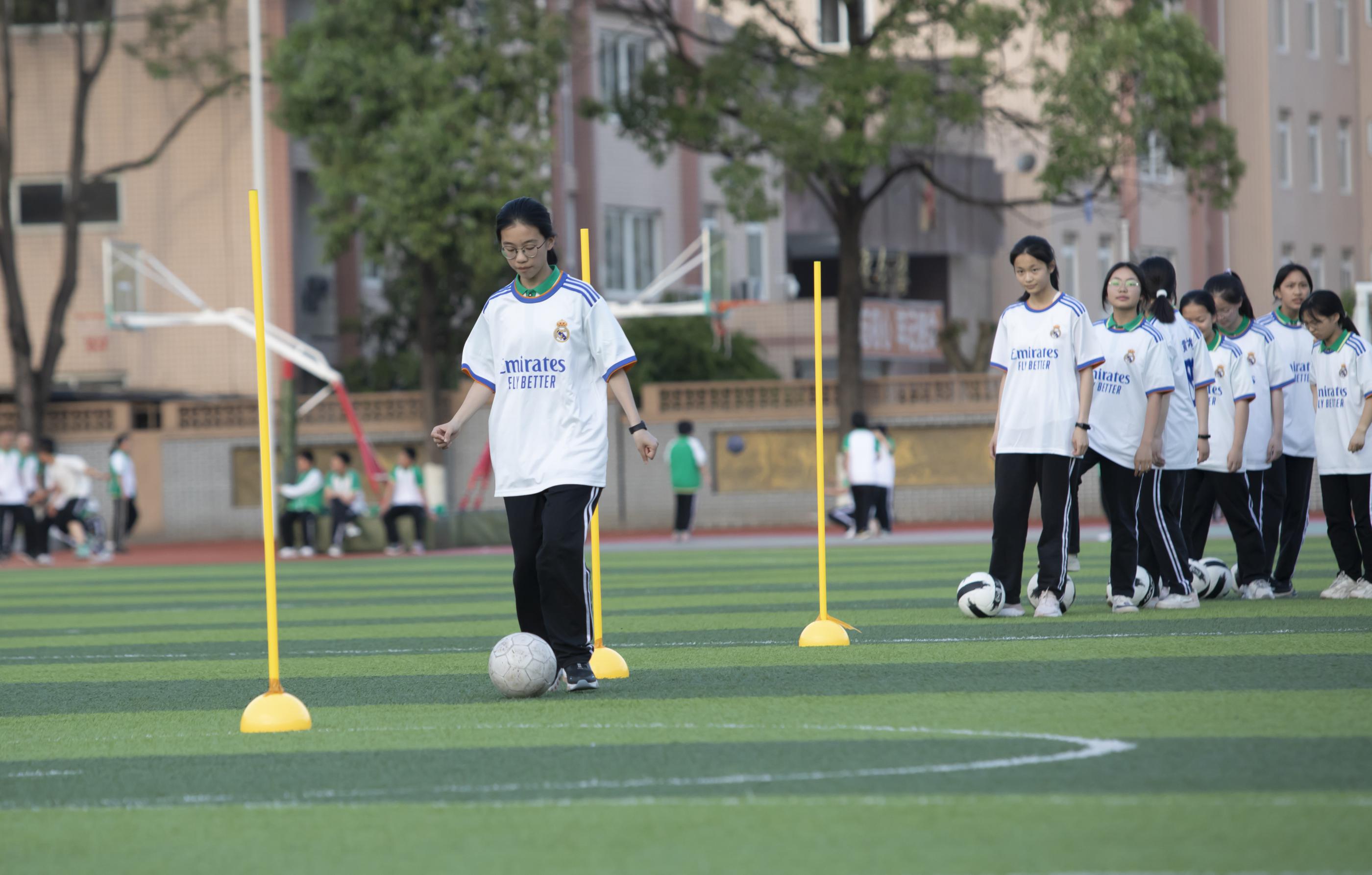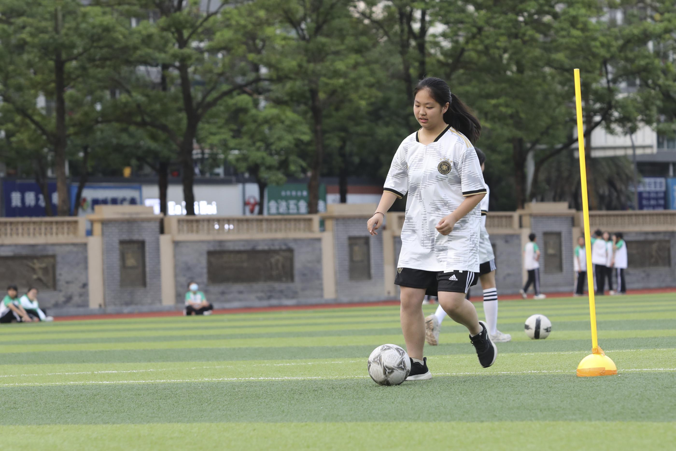 2021年5月11日,八年級(jí)3班女子足球隊(duì)員進(jìn)行繞桿射門比賽
