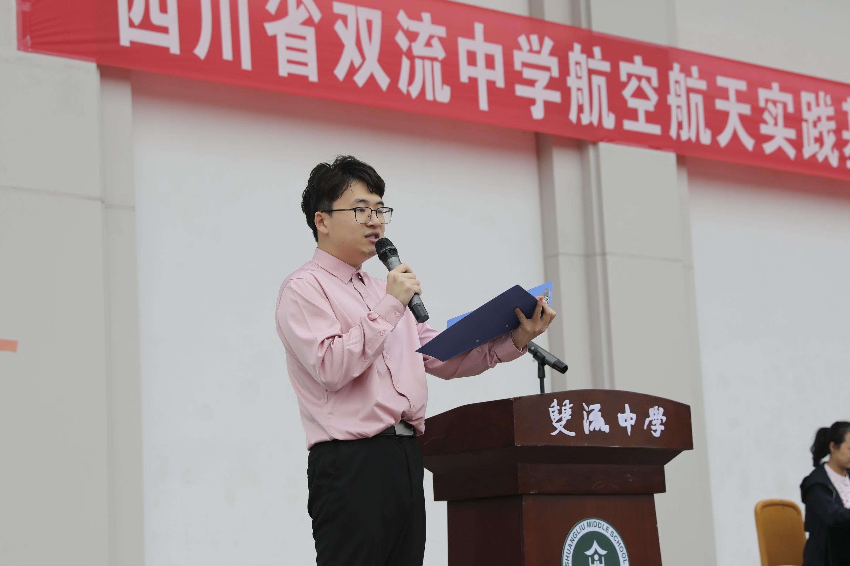2022年5月21日四川省雙流中學(xué)在運動場舉行航空航天實踐基地授牌儀式暨綜合實踐活動(圖為 林俊言老師主持活動)