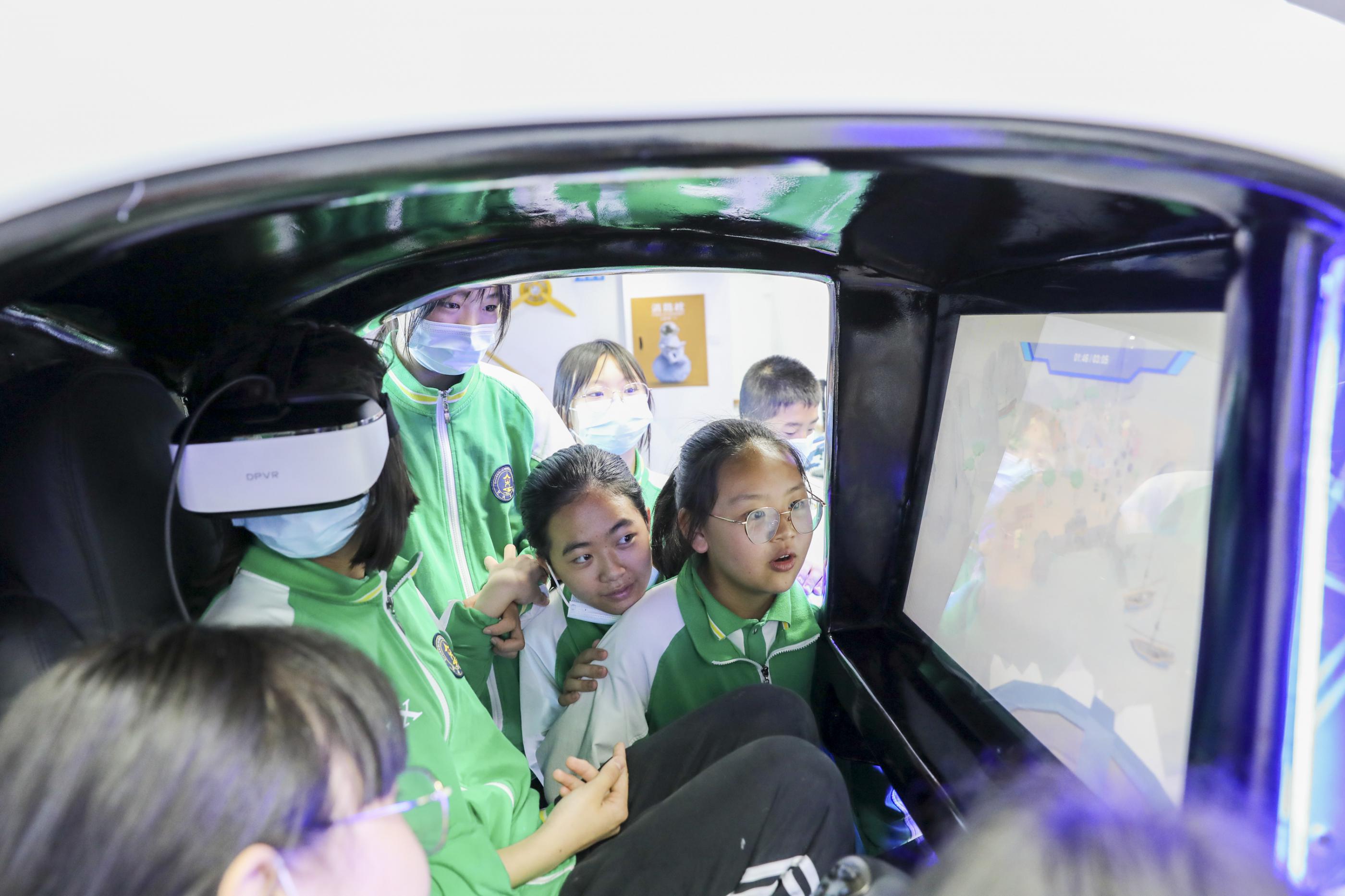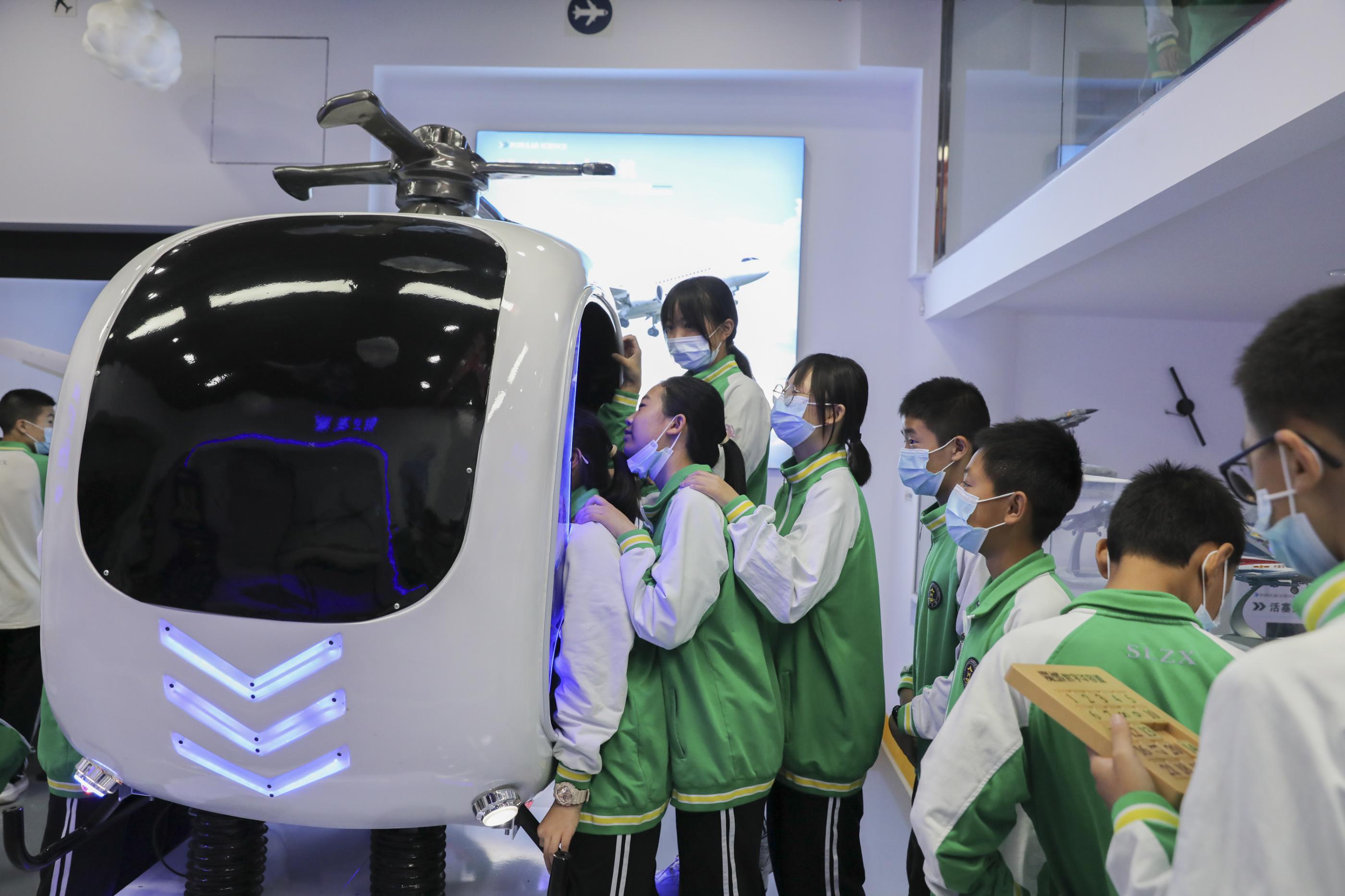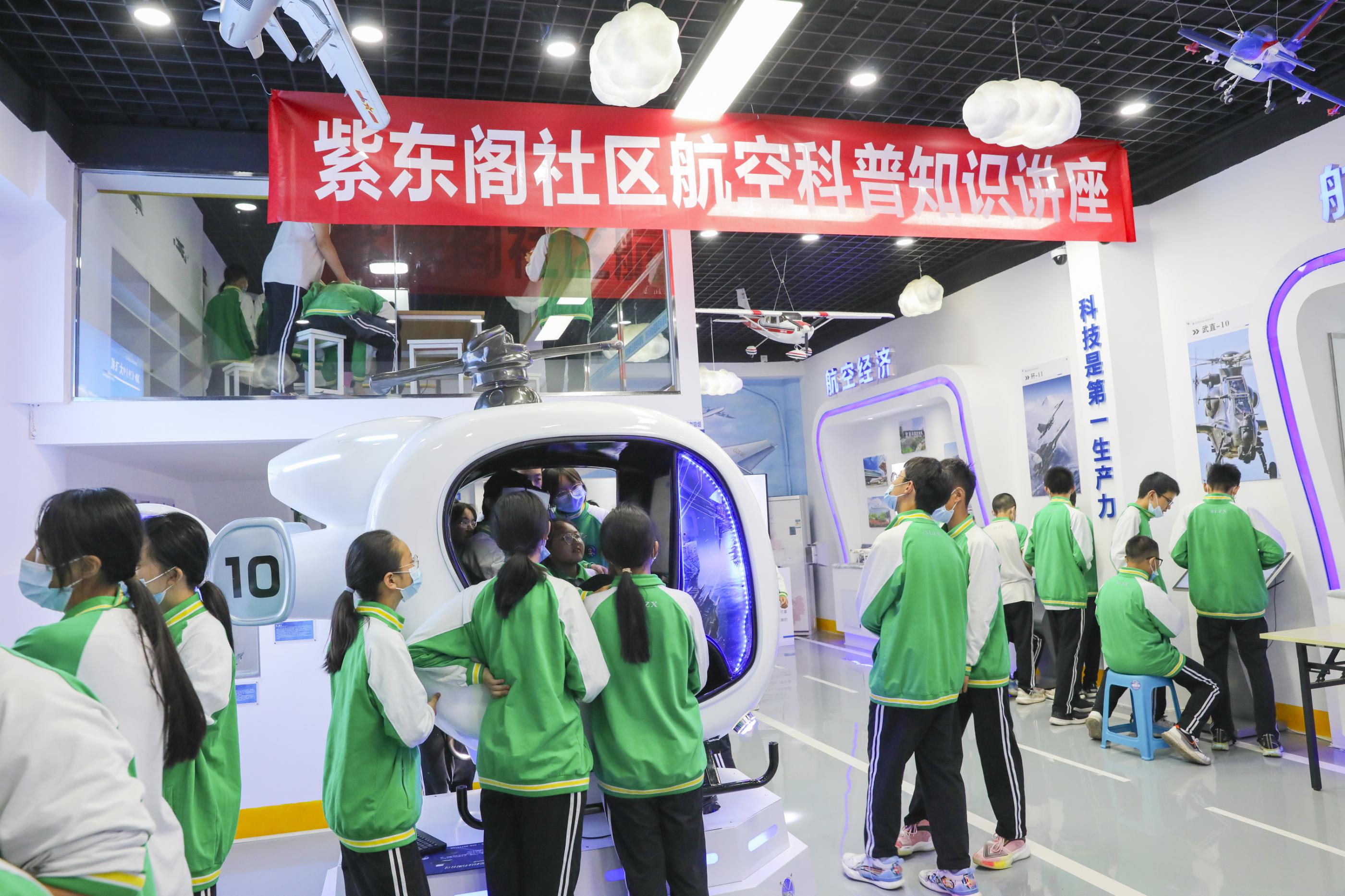 雙中學(xué)生在紫東閣航空體驗館體驗直升機模擬飛行