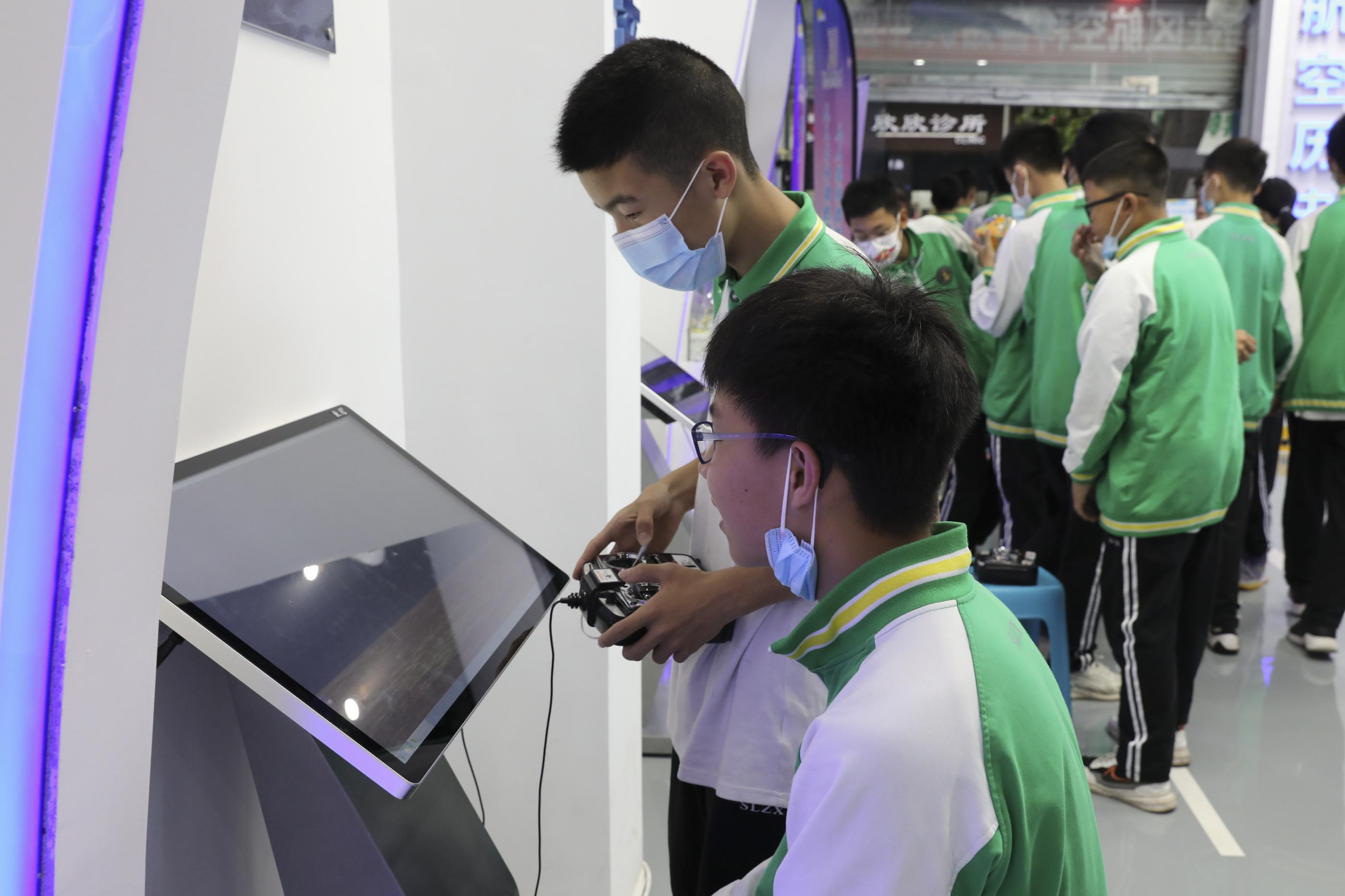 雙中學(xué)生在紫東閣航空體驗館體驗航模的模擬飛行