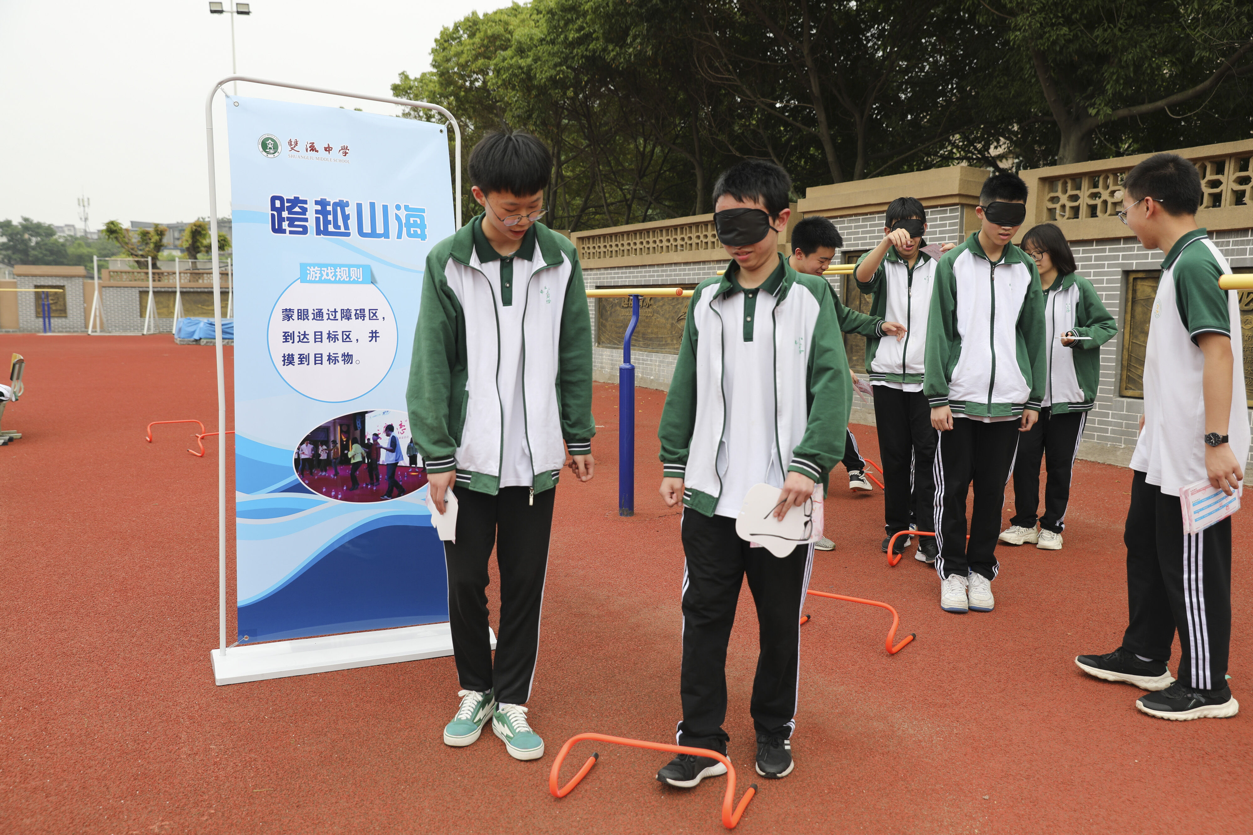 游園活動項(xiàng)目——跨越山海。規(guī)則:蒙眼,在同伴的引導(dǎo)下通過障礙區(qū),到達(dá)目標(biāo)區(qū),并摸到目標(biāo)物。