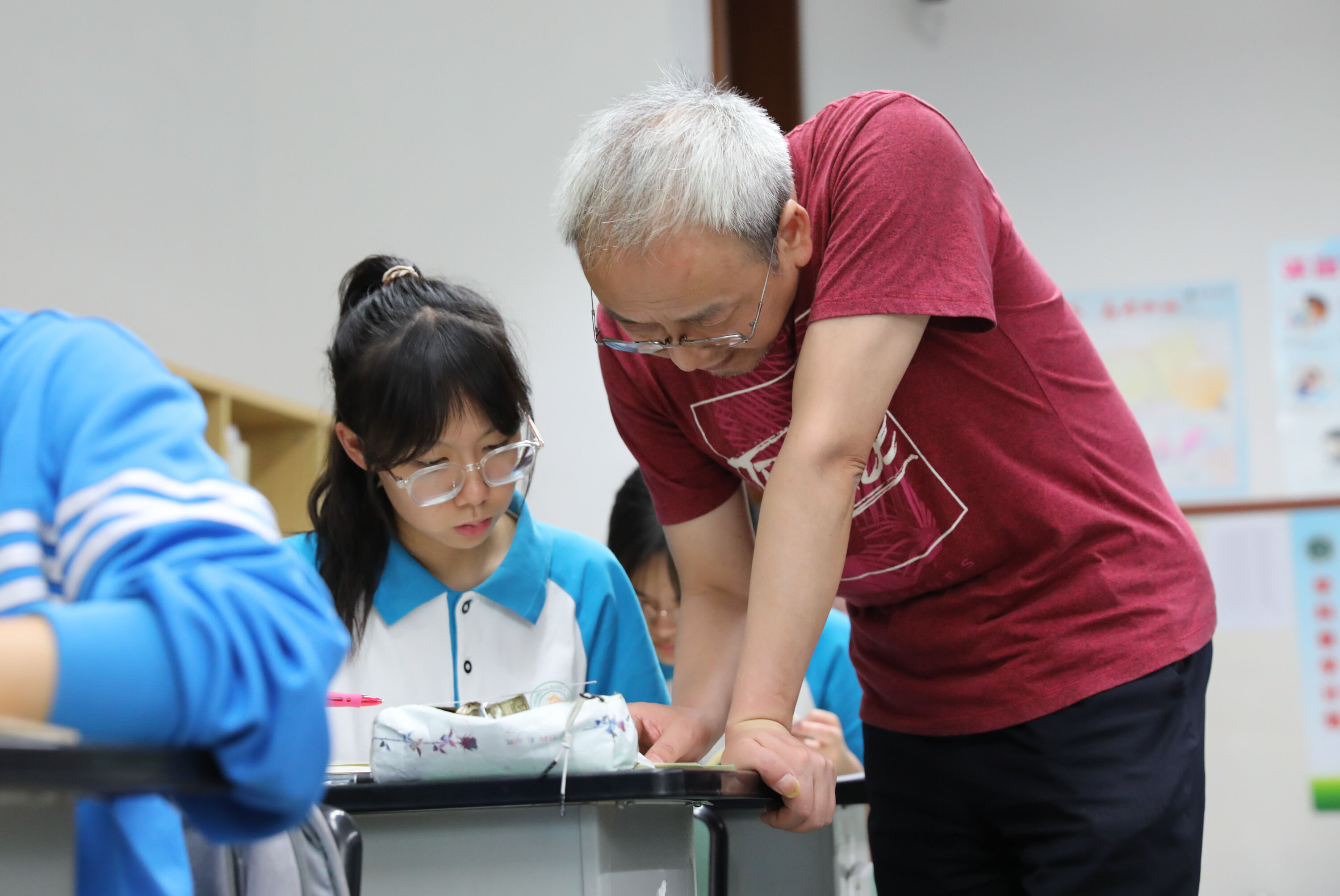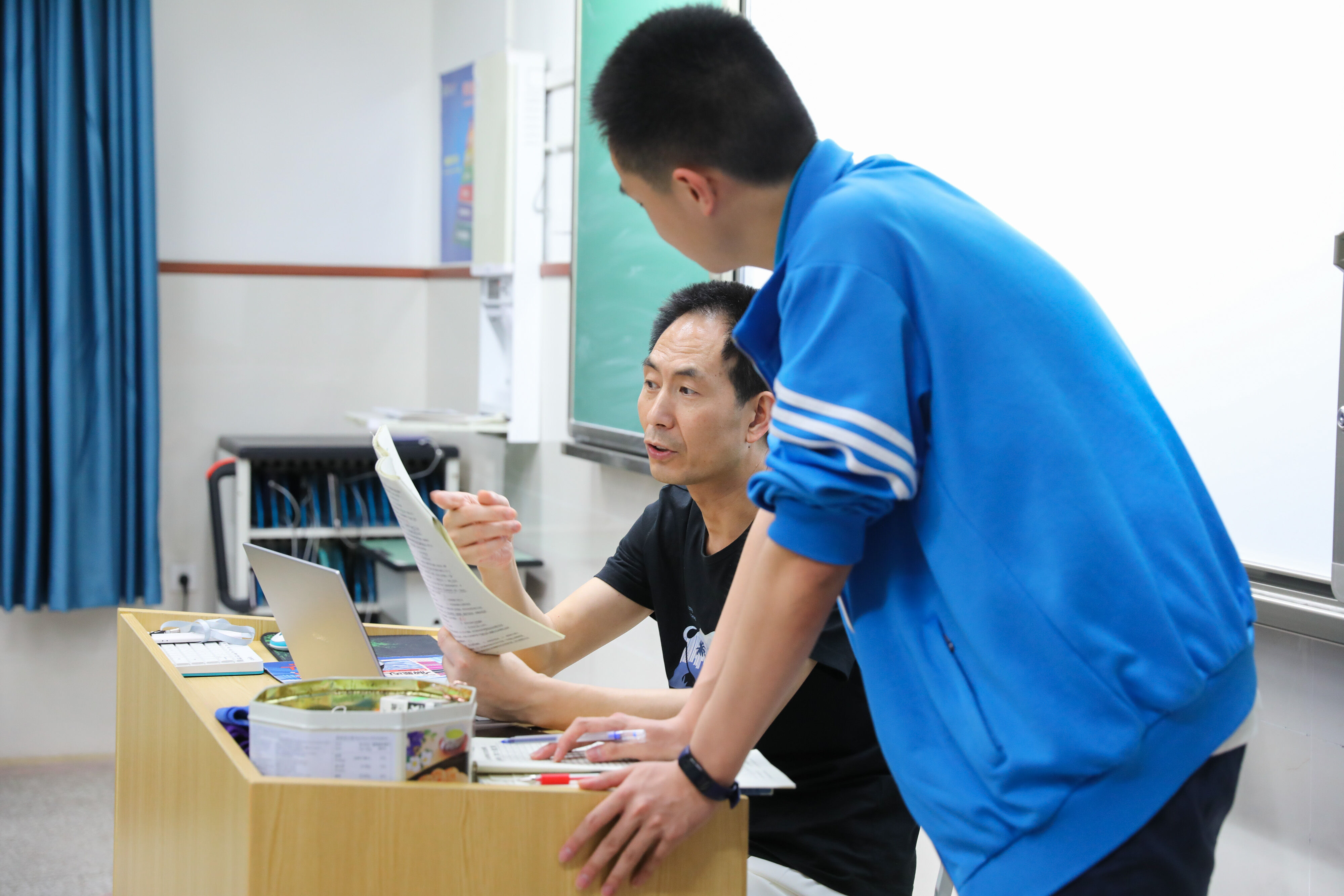 教室外的臨時(shí)課桌前,楊東老師為學(xué)生解疑。