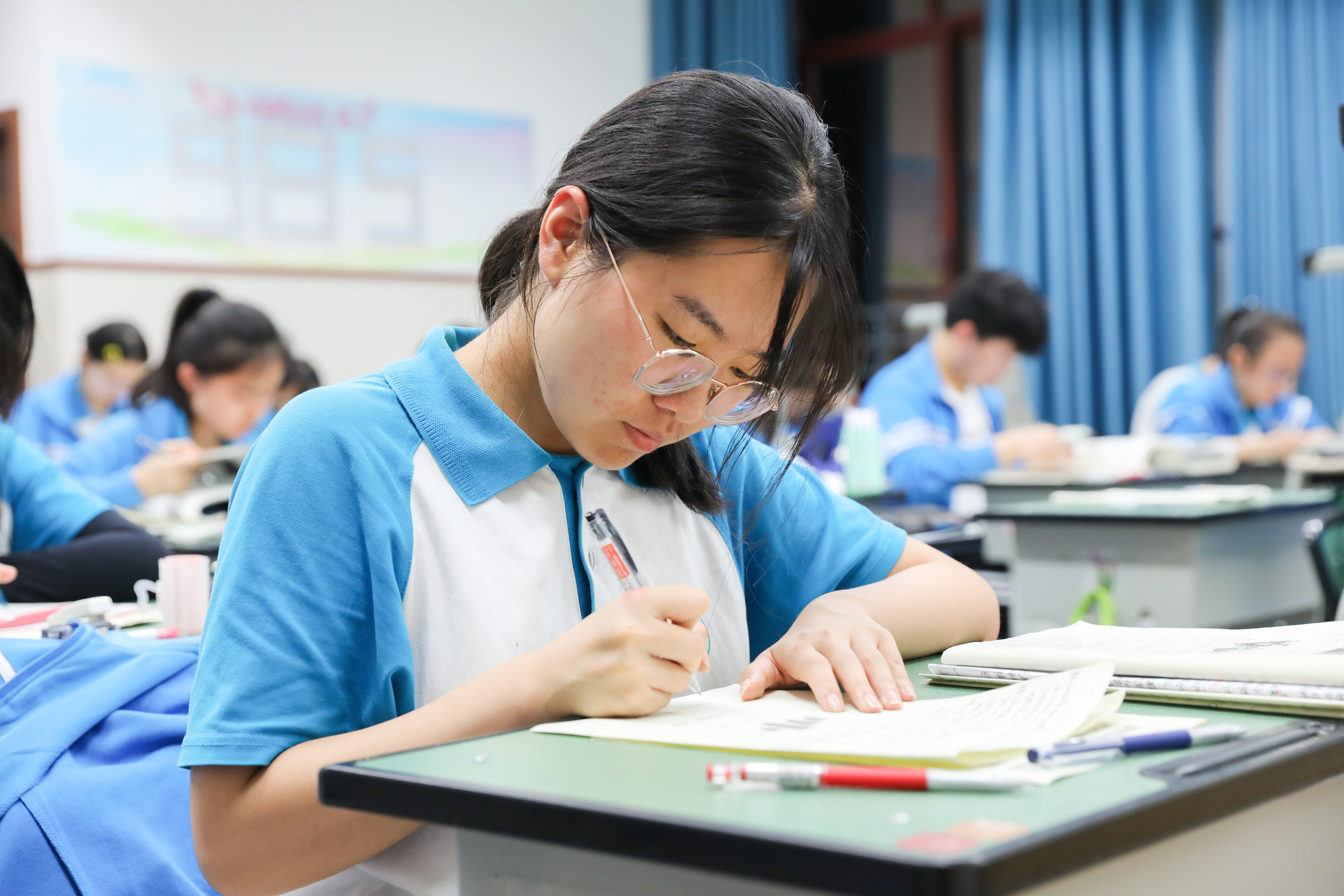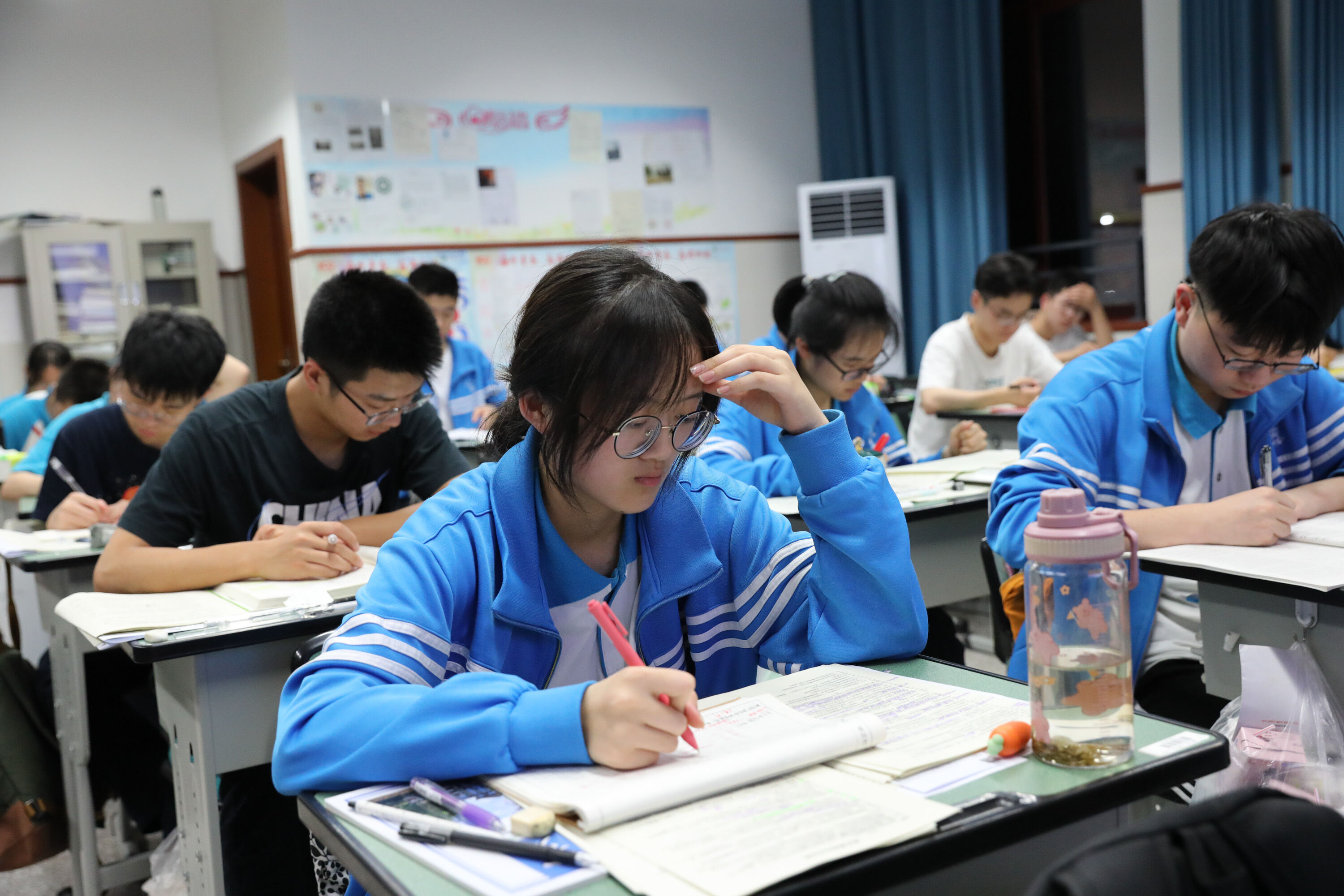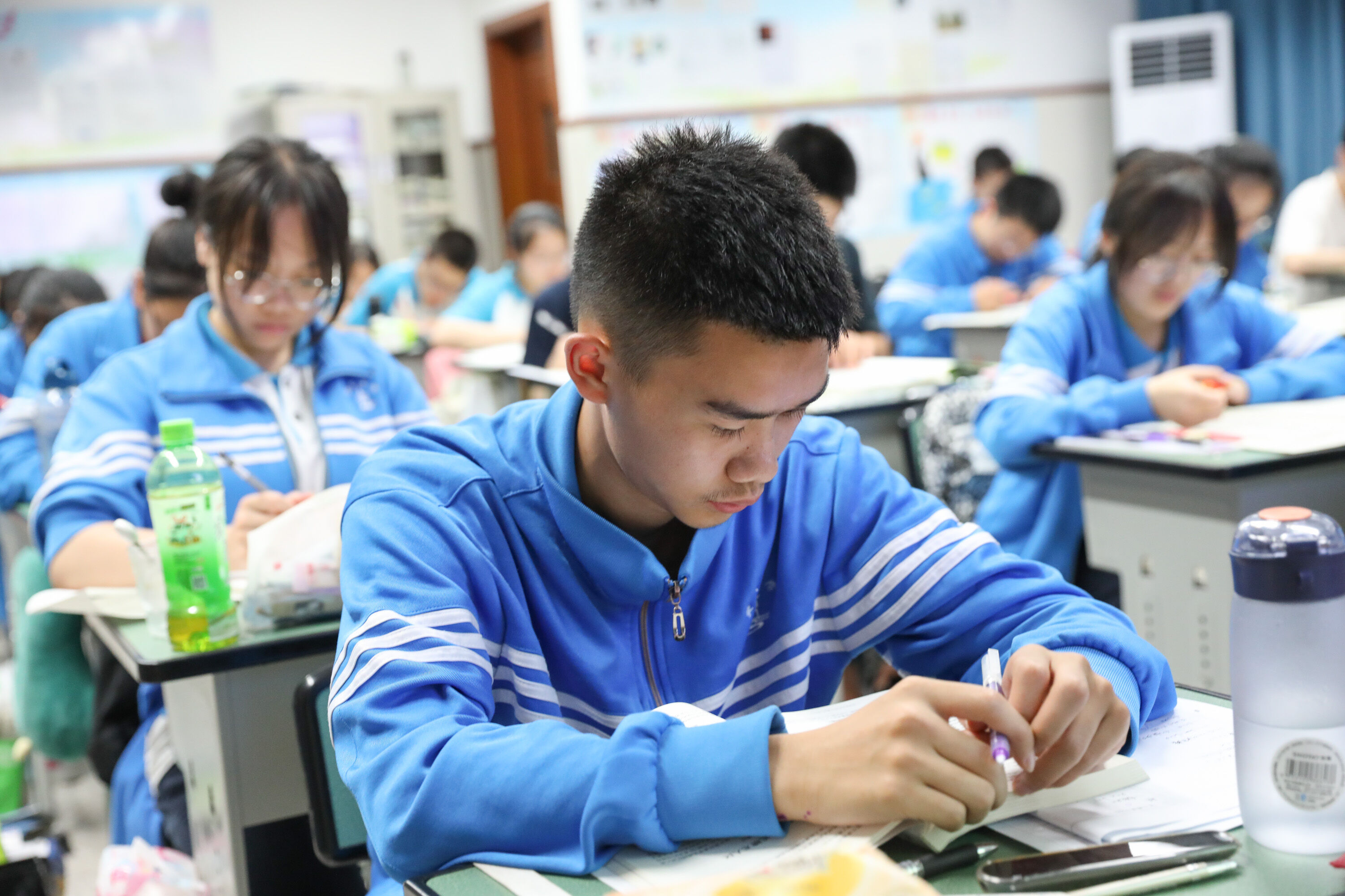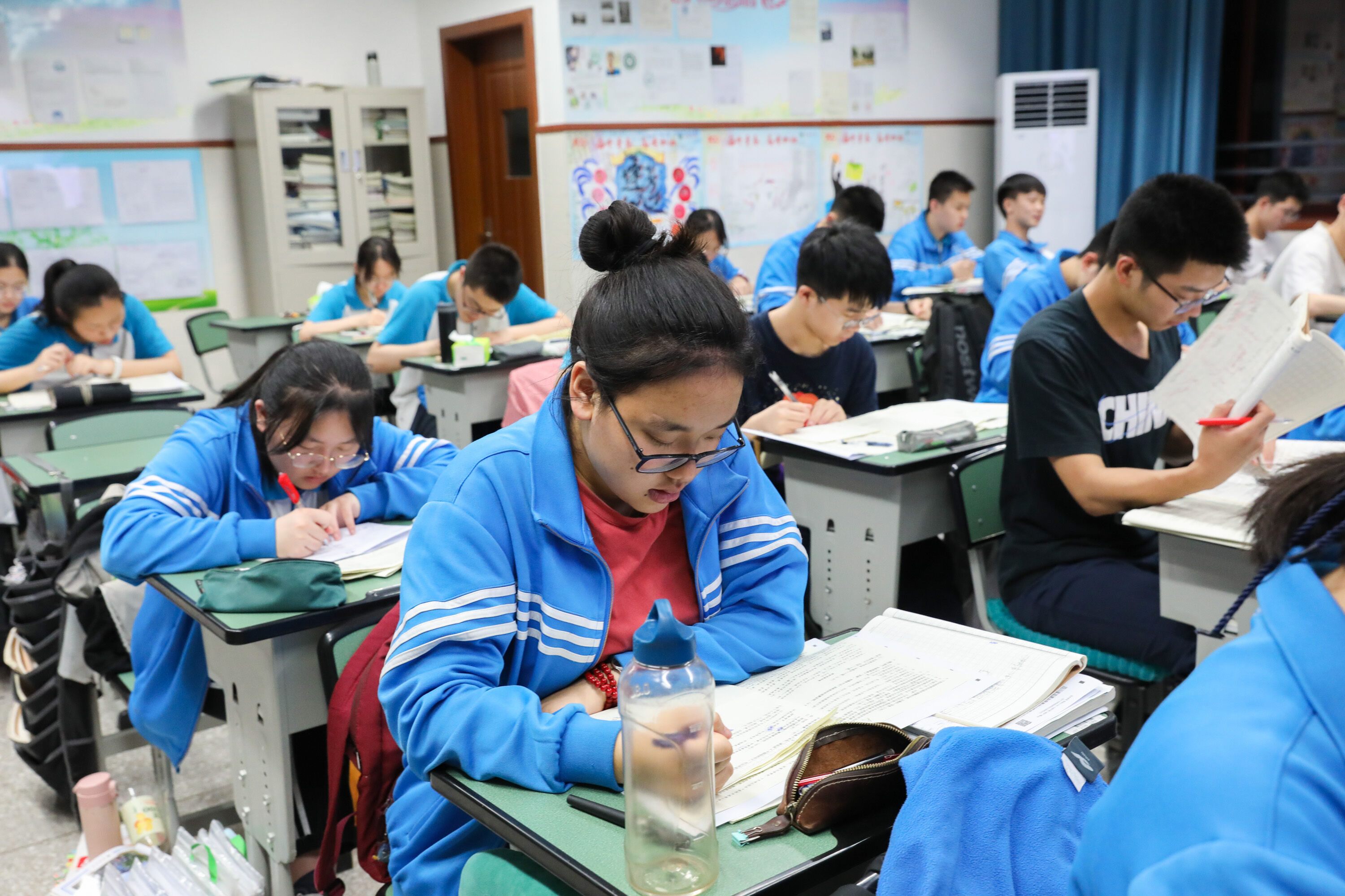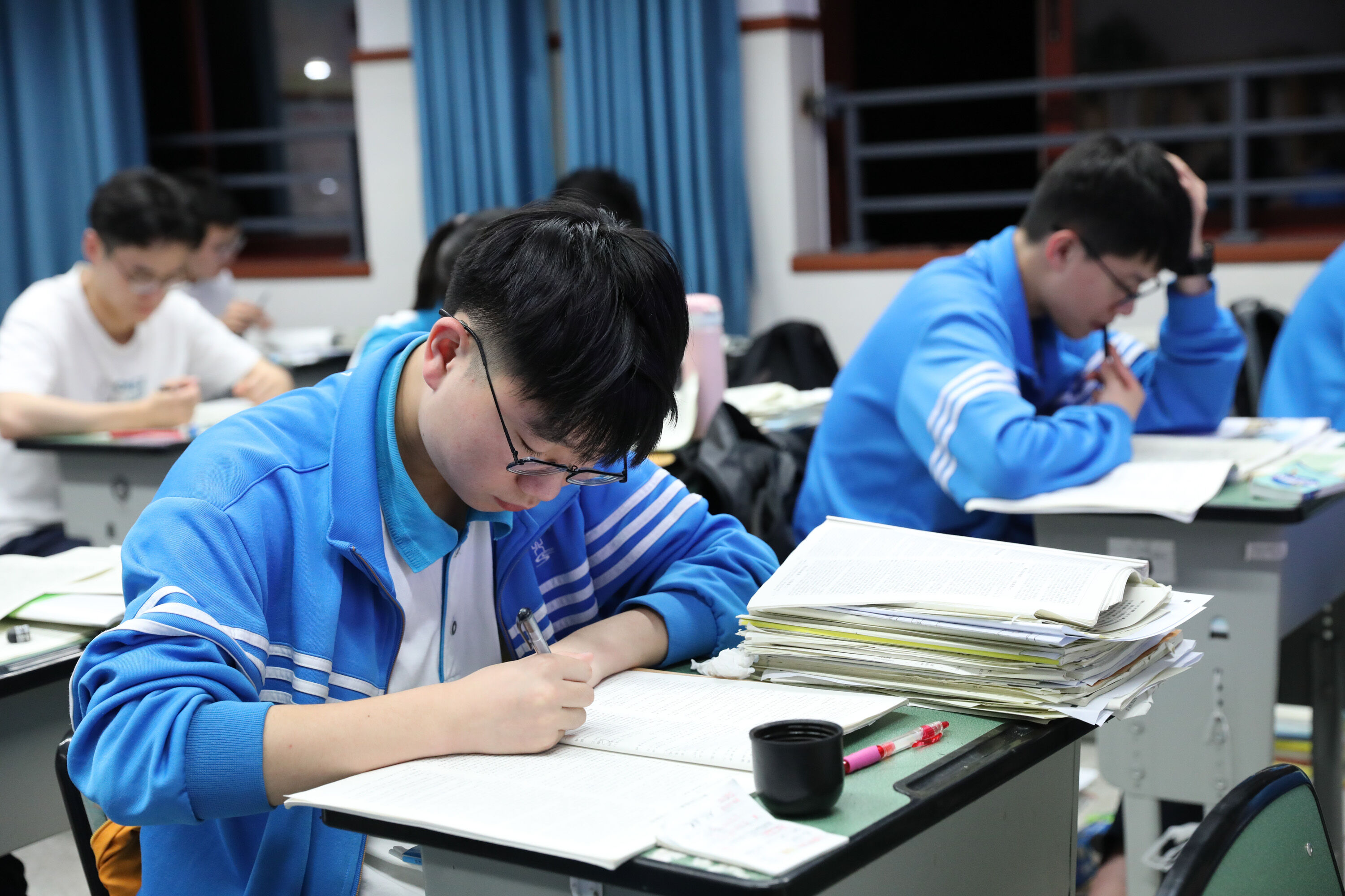 高三學(xué)生認(rèn)真復(fù)習(xí)備考,墻上隱約可見(jiàn)的“985”是他們共同的目標(biāo)。
