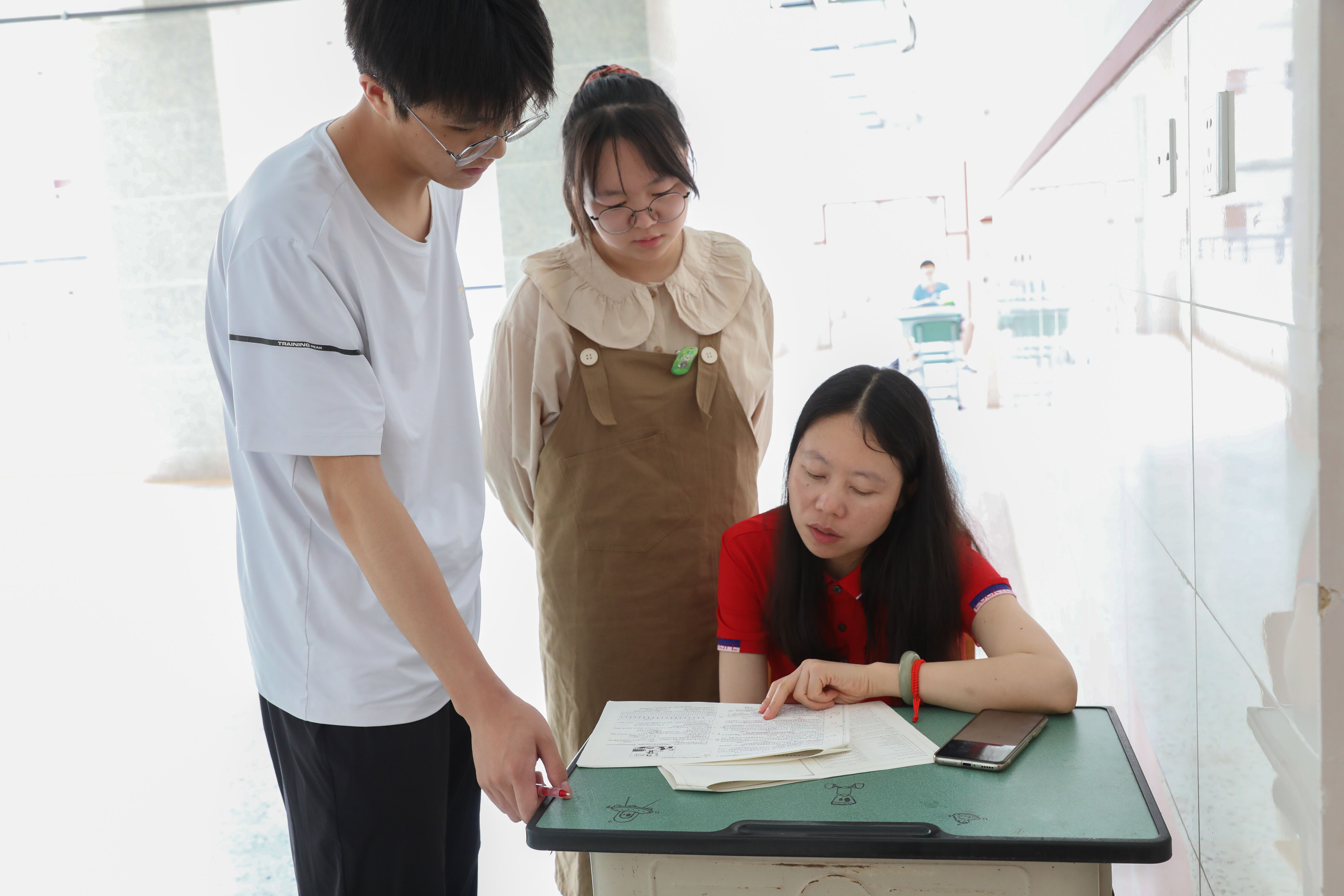2022年6月6日上午,高考倒計時1天!政治教師李萍在教室外的臨時課桌前為學(xué)生解疑。