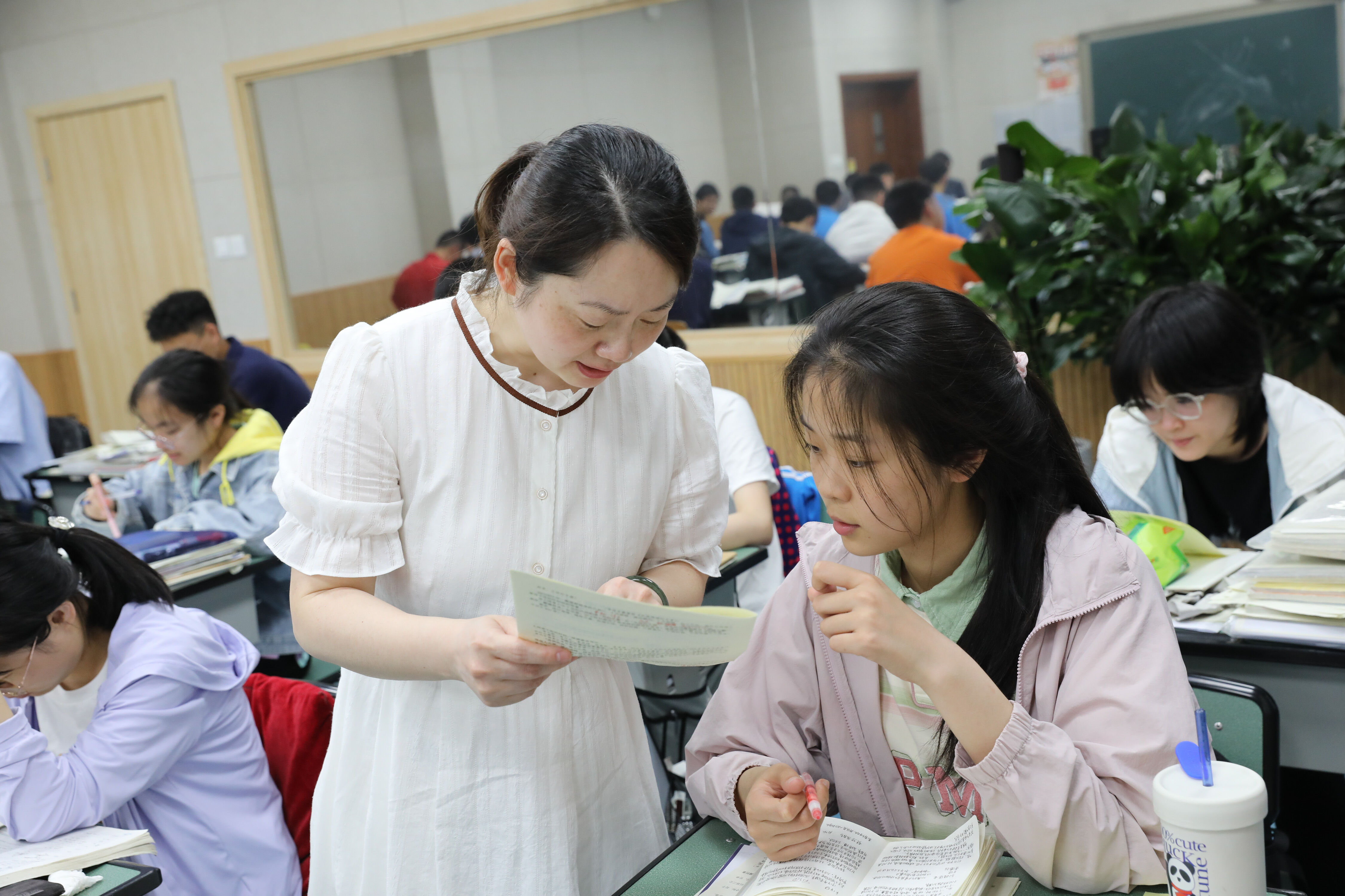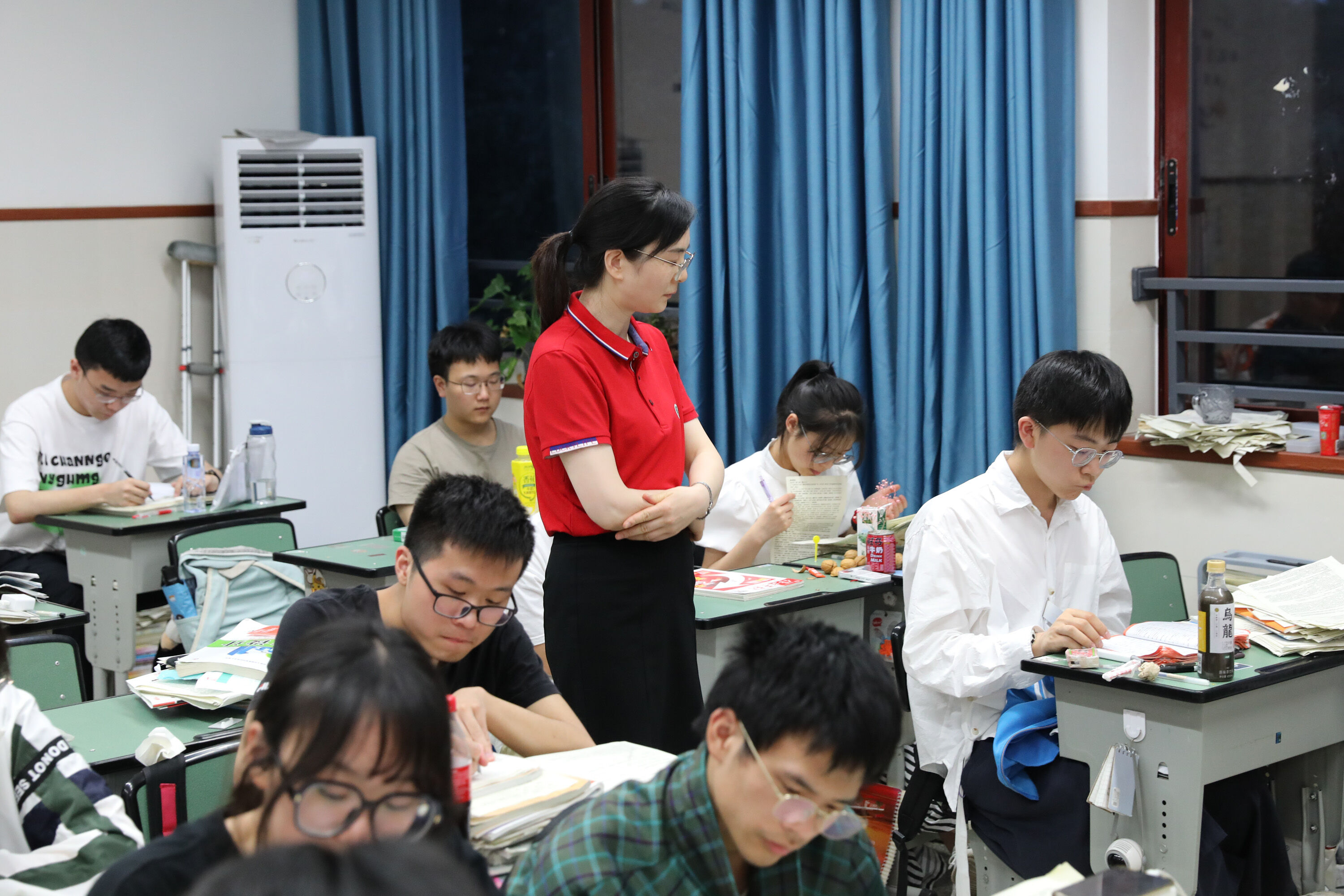 2022年6月6日晚,高三高考前最后1次晚自習(xí),語文老師謝萍陪伴學(xué)生復(fù)習(xí)。
