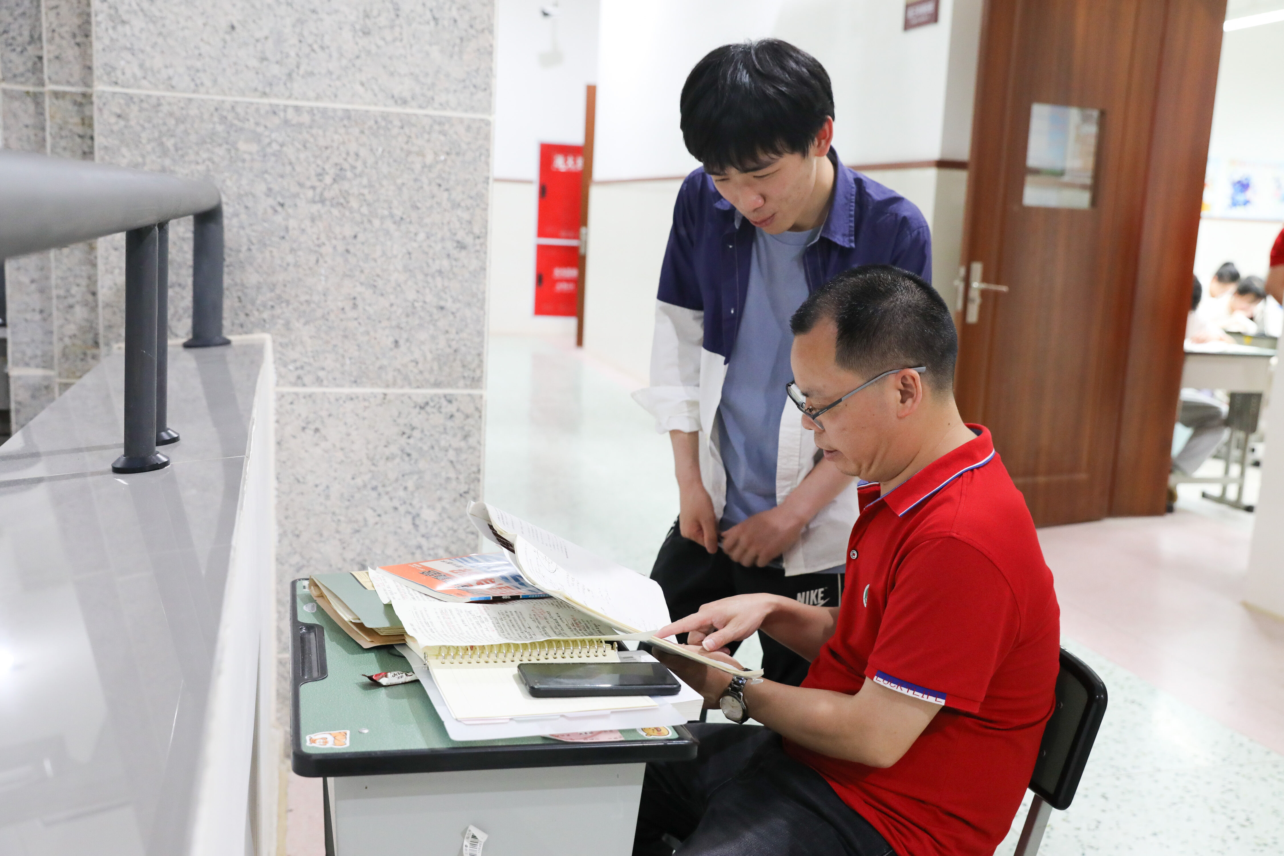 2022年6月6日晚,高考倒計(jì)時(shí)1天即將過去,今晚的晚自習(xí)也是高考前的最后一個(gè)晚自習(xí)。圖為:老楊老師給小楊學(xué)生解答數(shù)學(xué)問題。