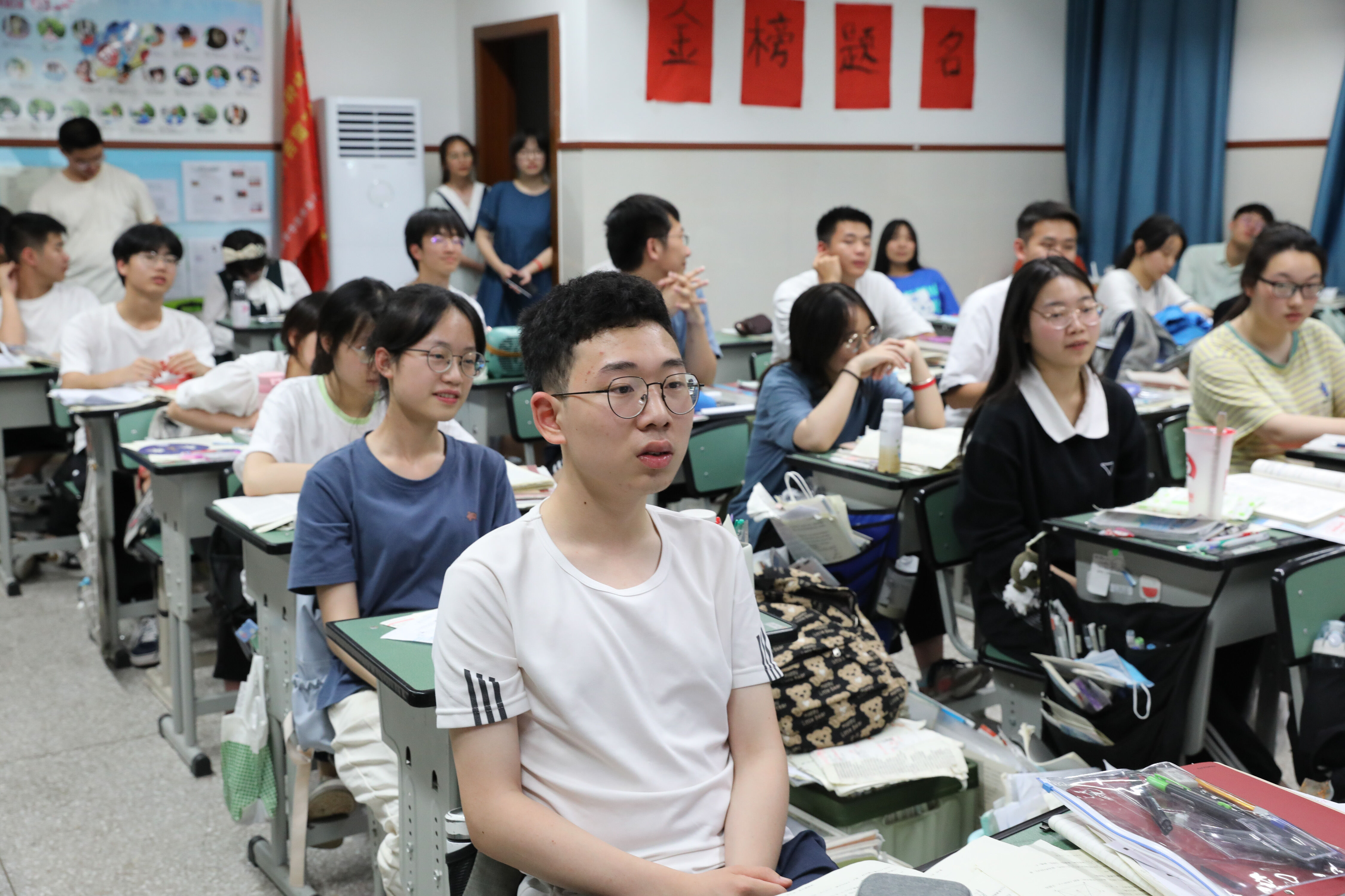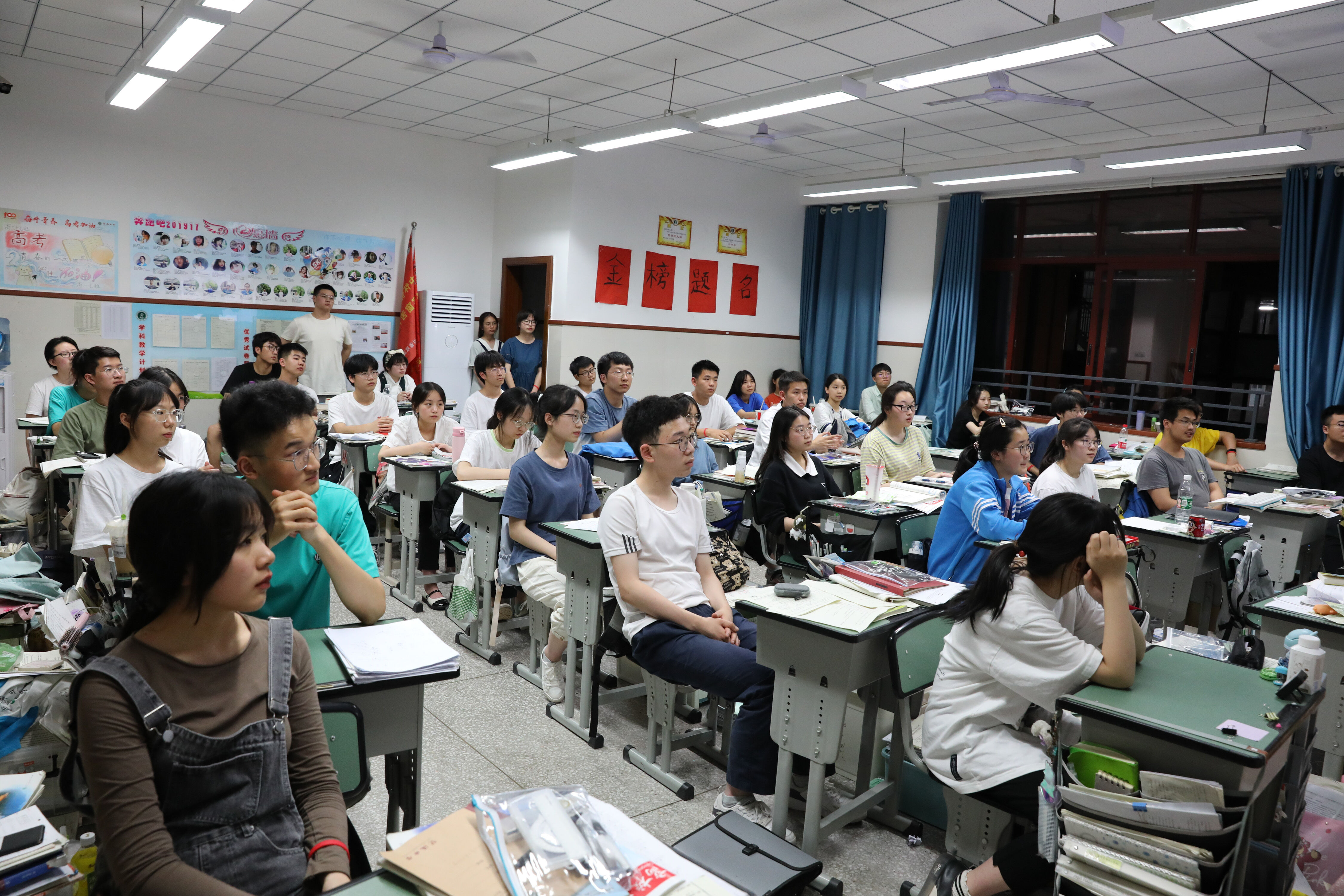 2022年6月6日晚,高三高考前最后1次晚自習(xí),數(shù)學(xué)老師黃大海給2班學(xué)生講解數(shù)學(xué)考試的技巧,學(xué)生認(rèn)真聽講。