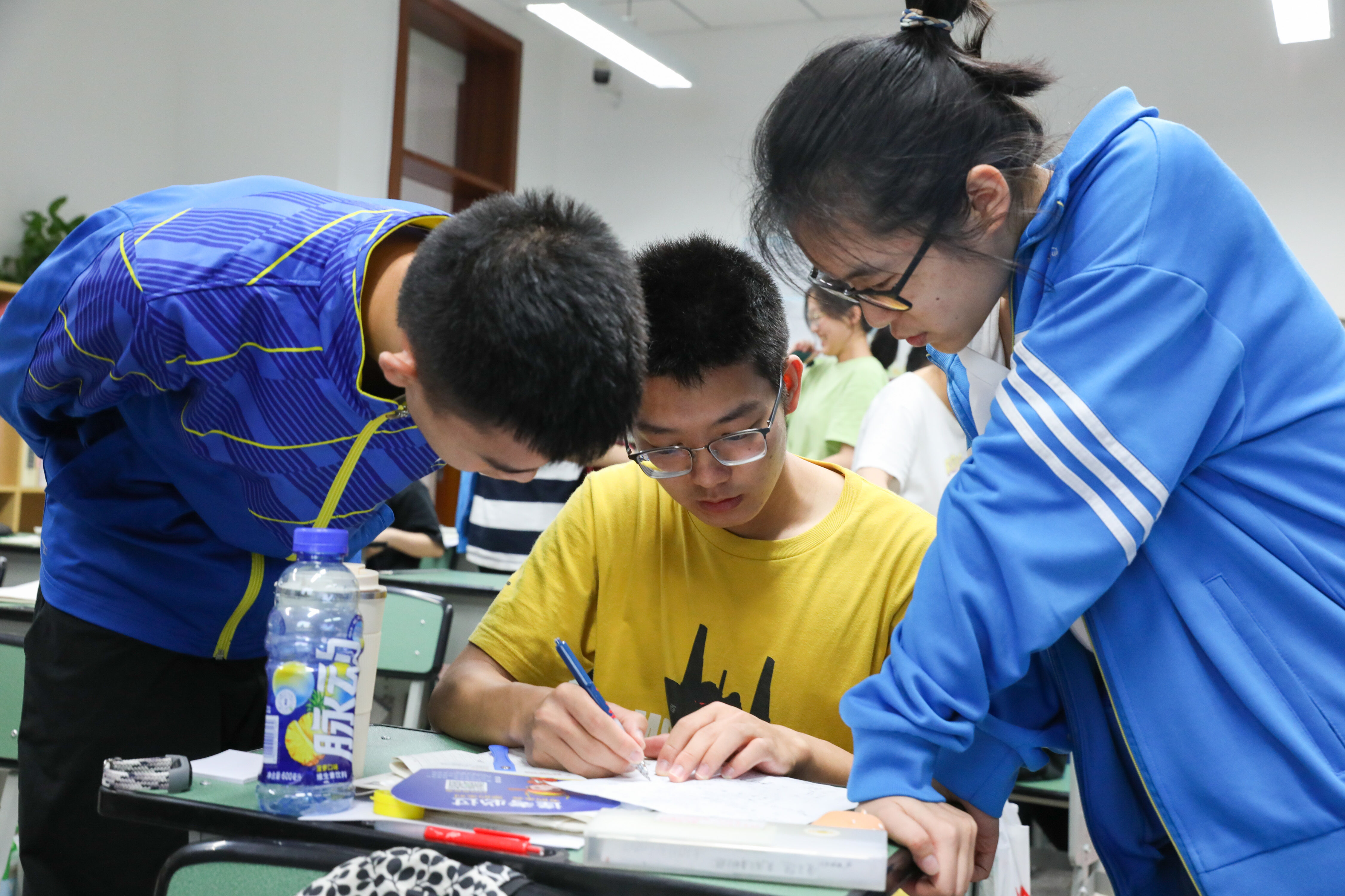 下課了,有一位同學(xué)被張老師的話深深感動(dòng)了,其他同學(xué)都上前鼓勵(lì)。