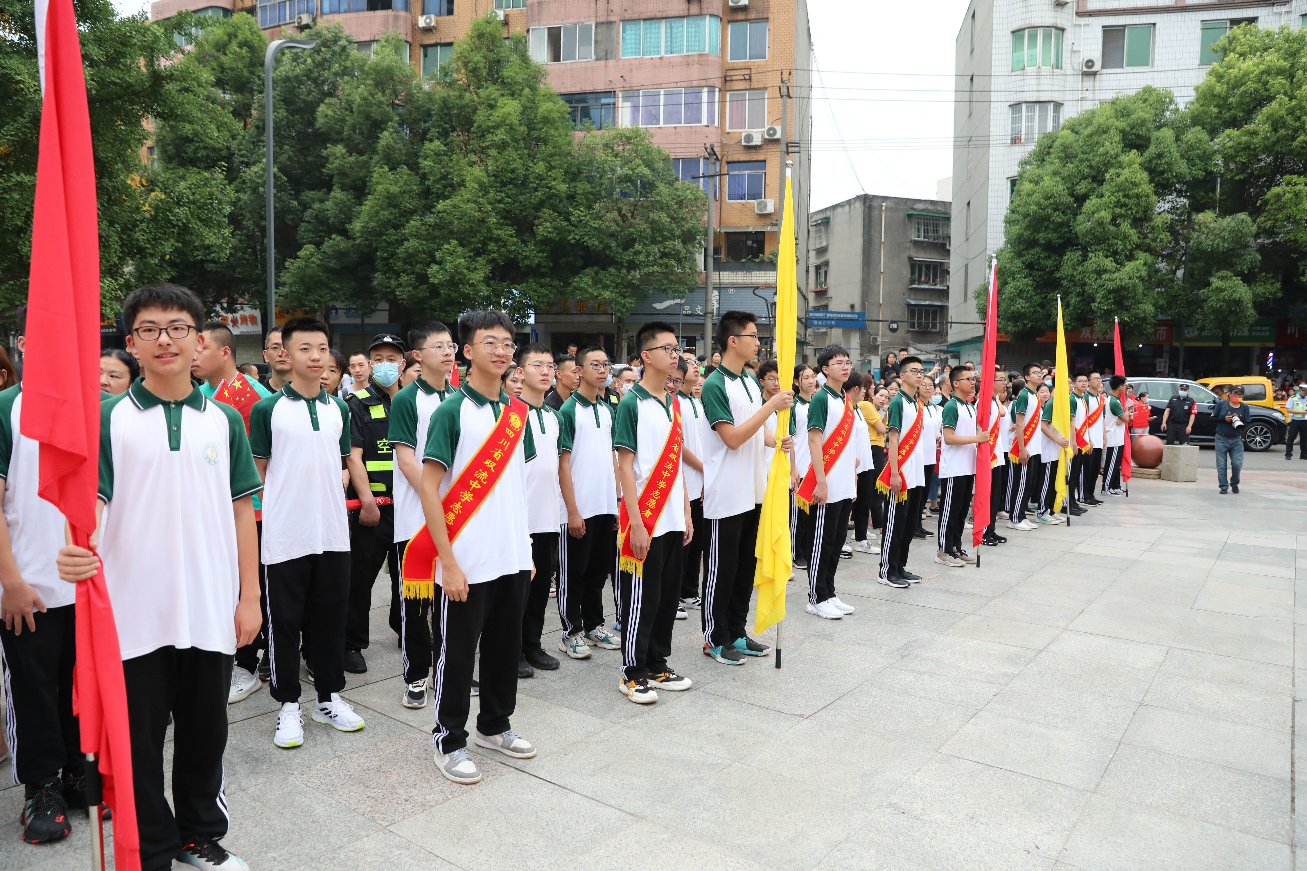 出發(fā)了!老師、家長、低年級同學(xué)都為高三考生搖旗吶喊,祝他們考出好成績!