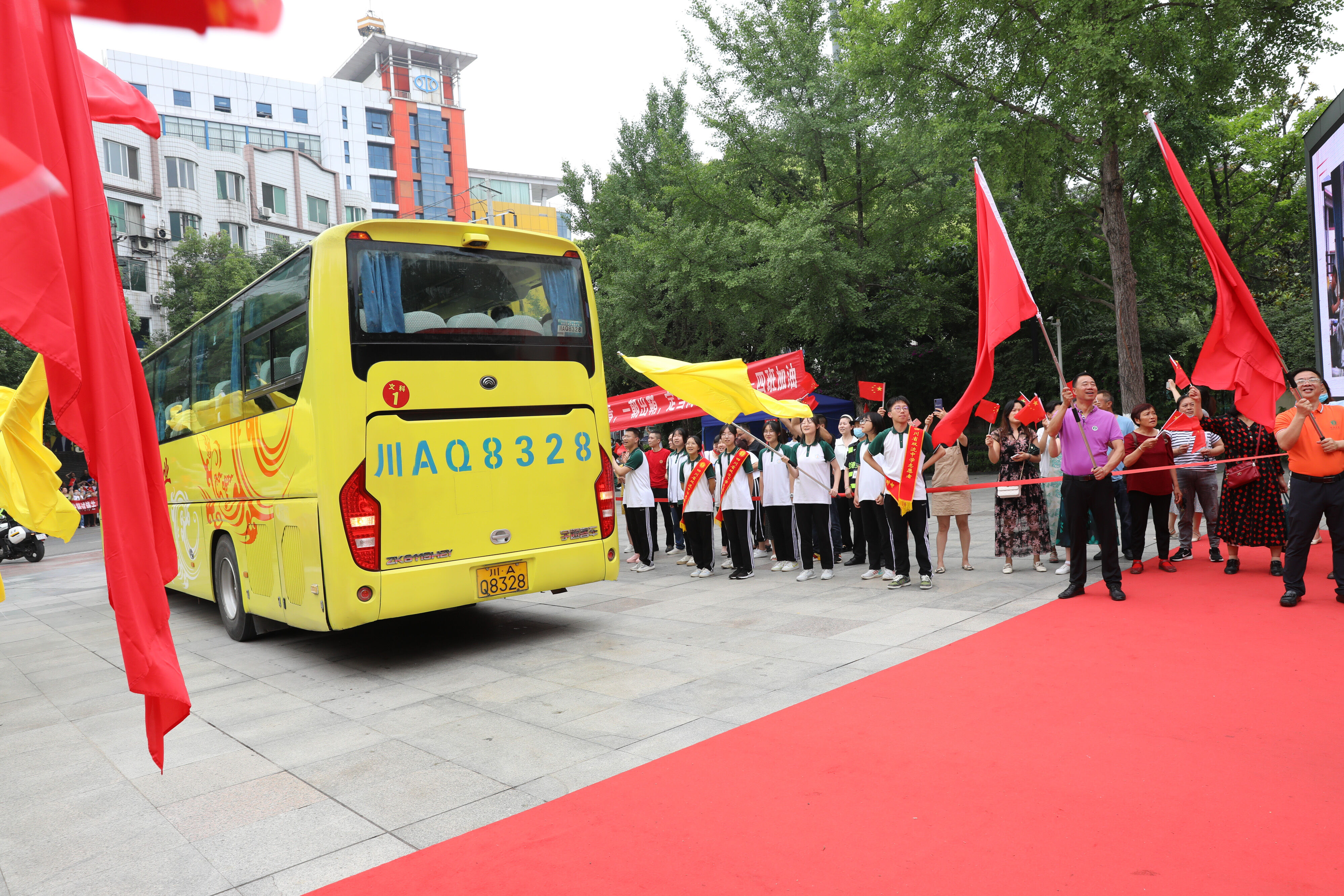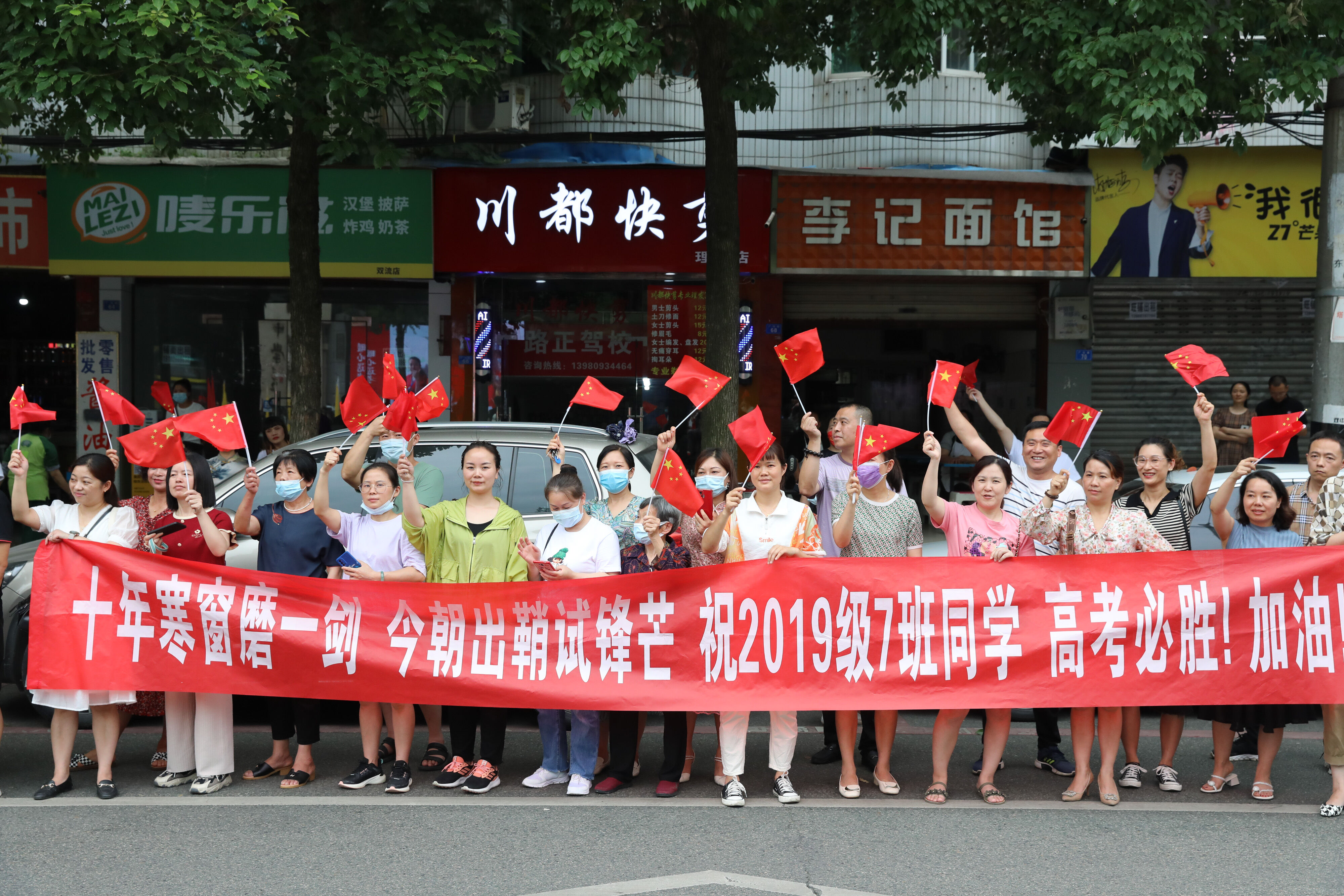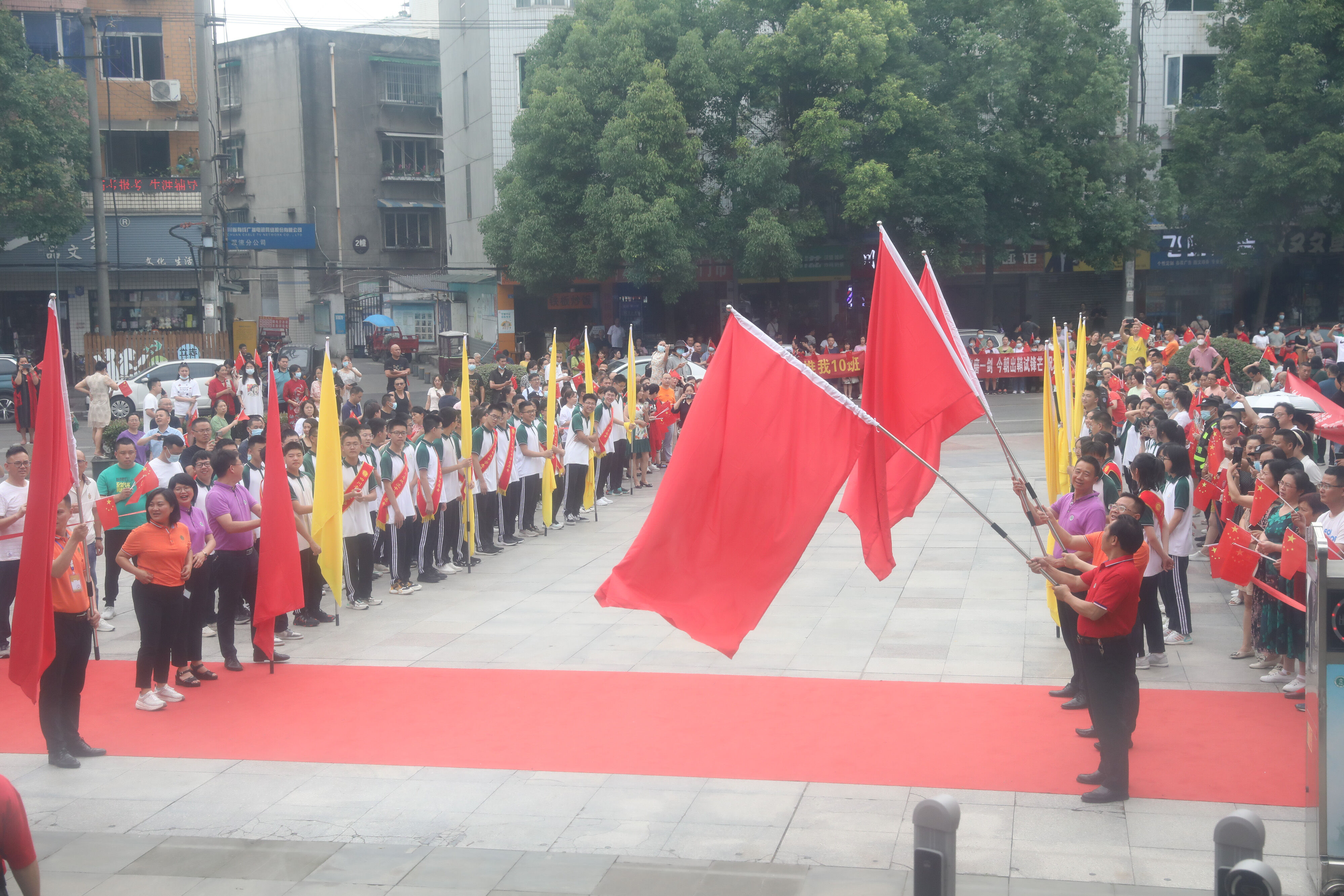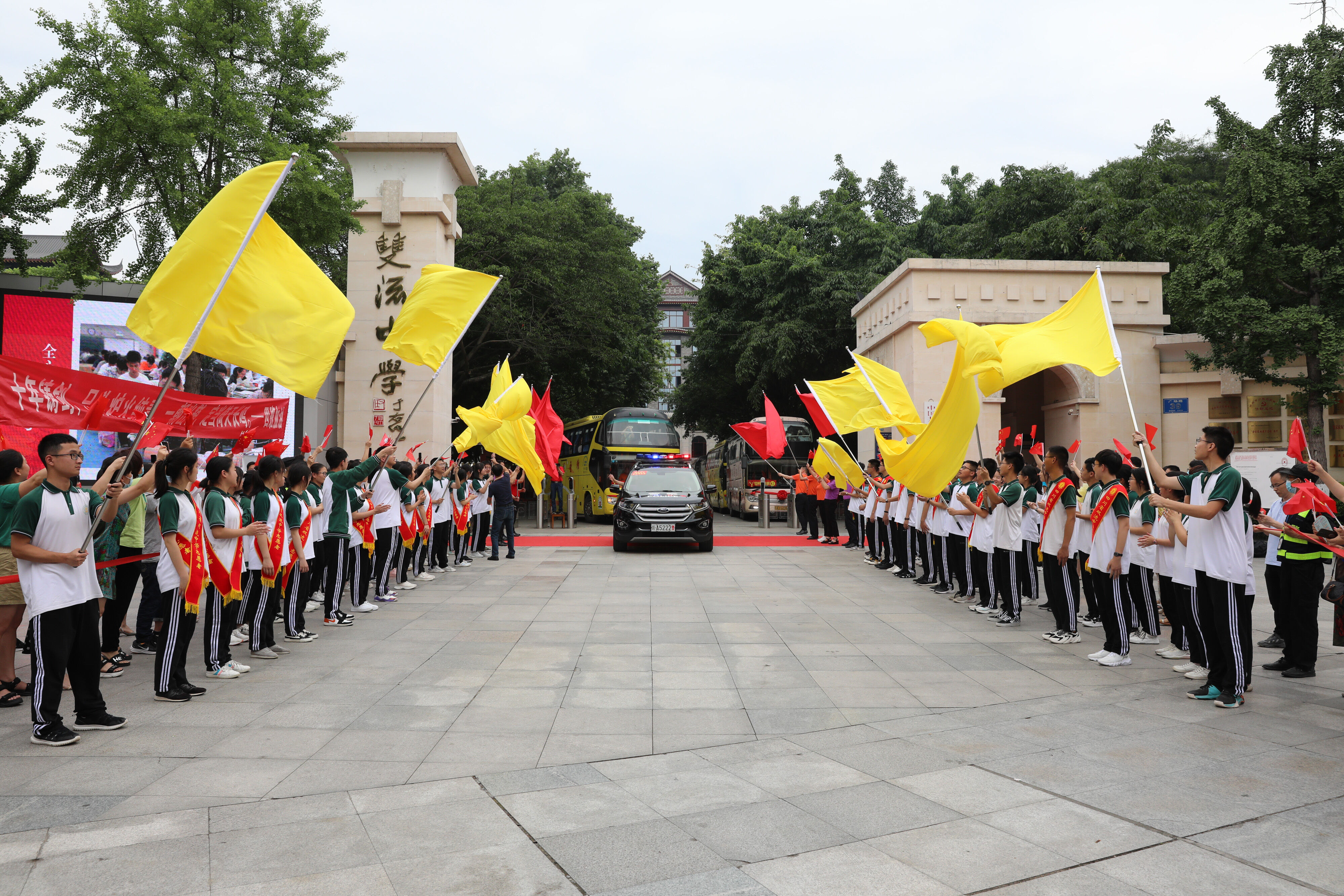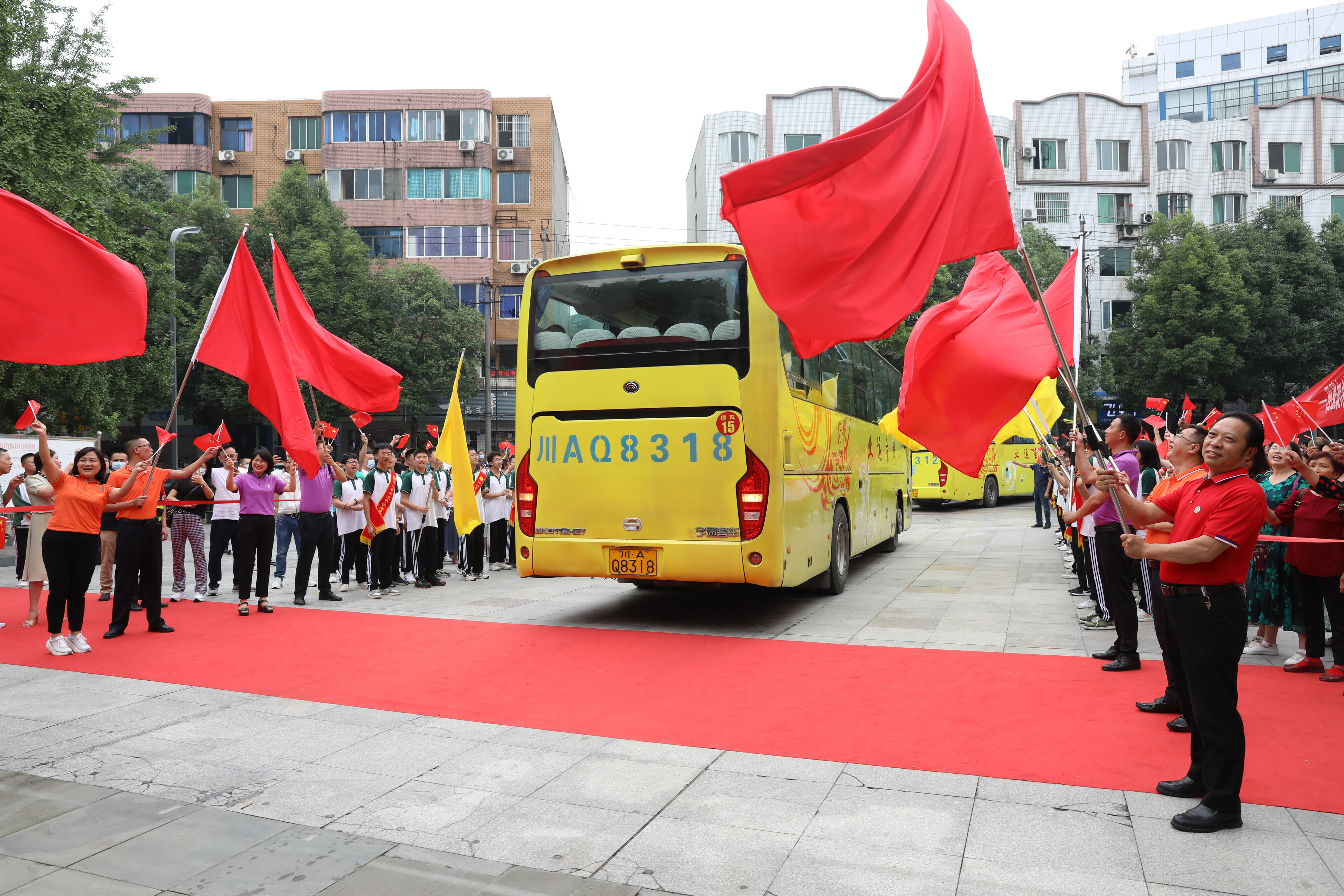 龍校長和部分行政干部揮舞彩旗歡送高三學(xué)子前往考場參加最后一堂外語考試。
