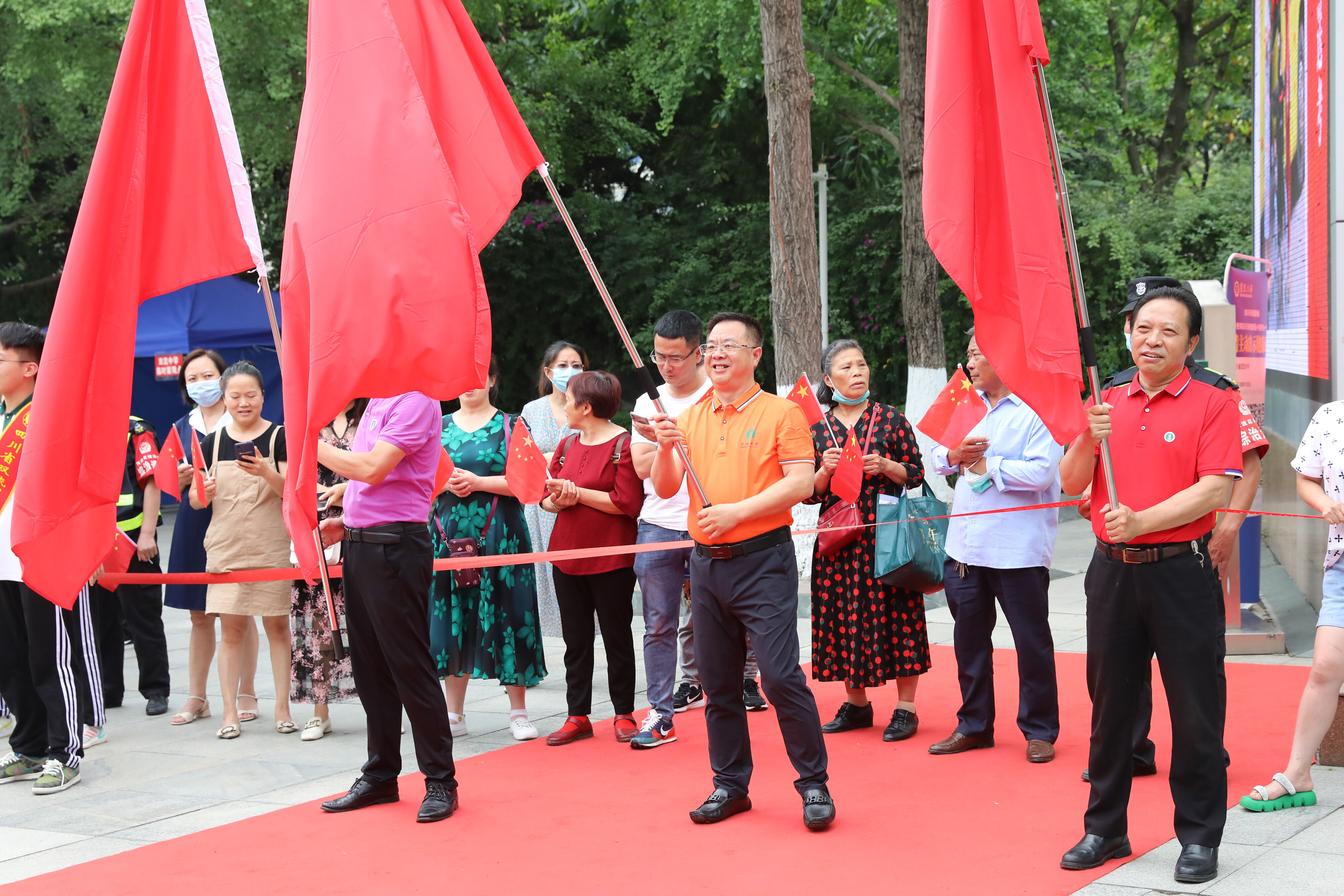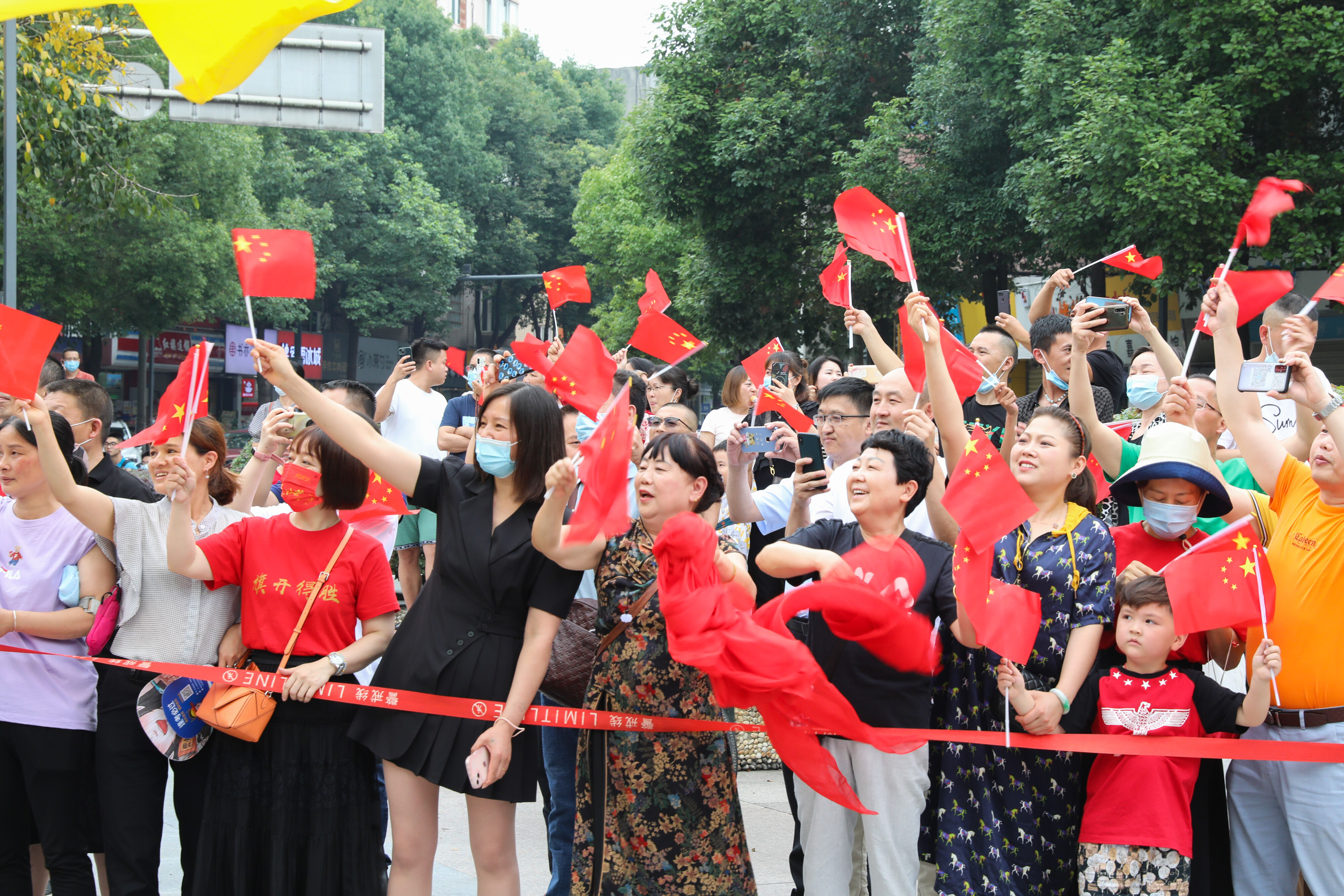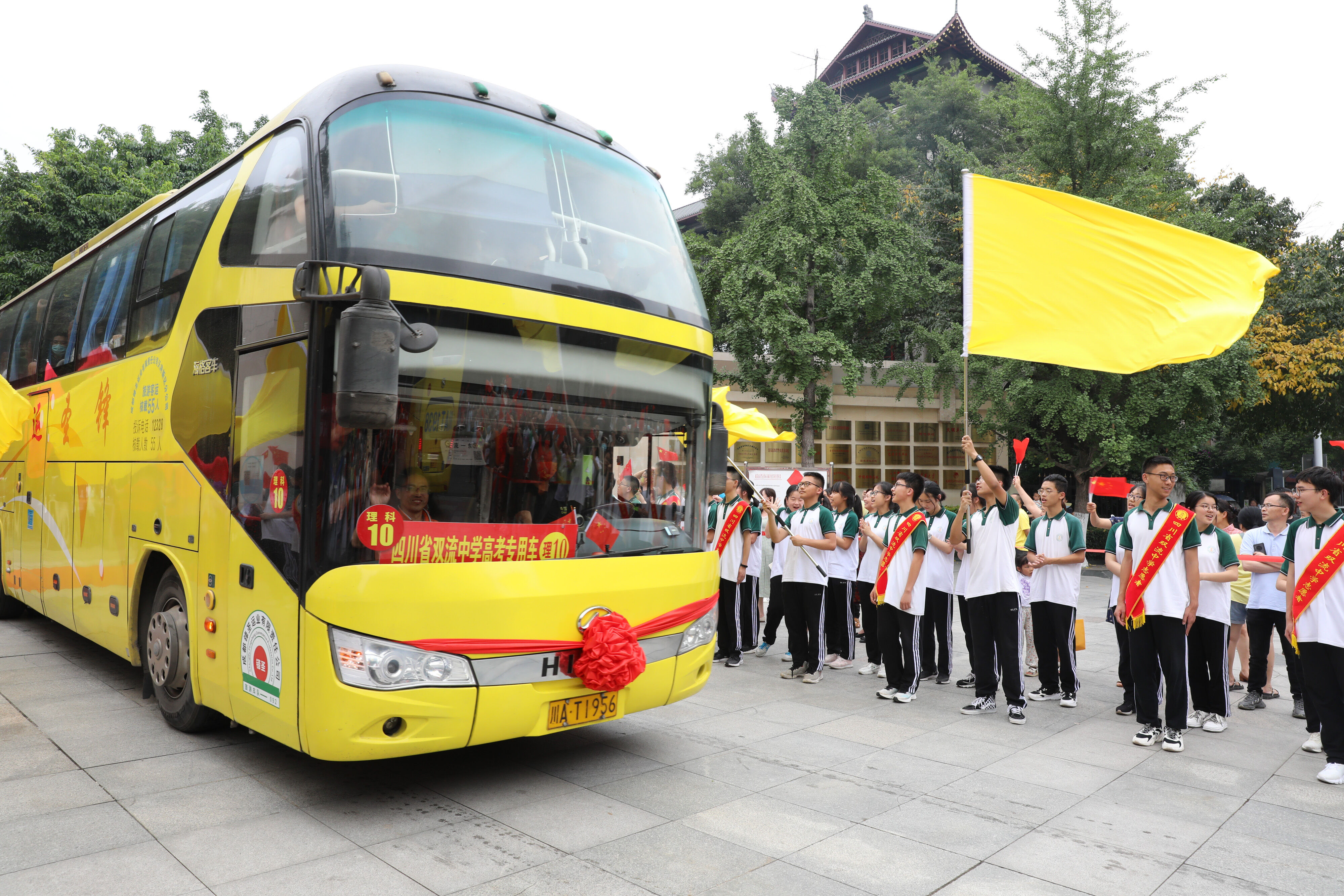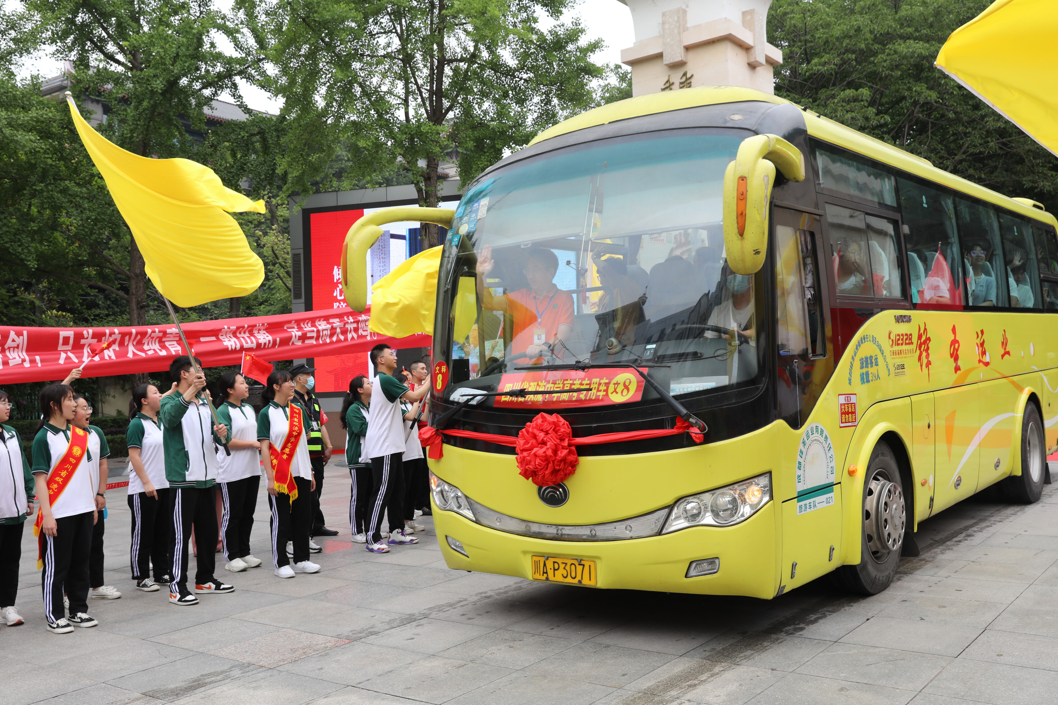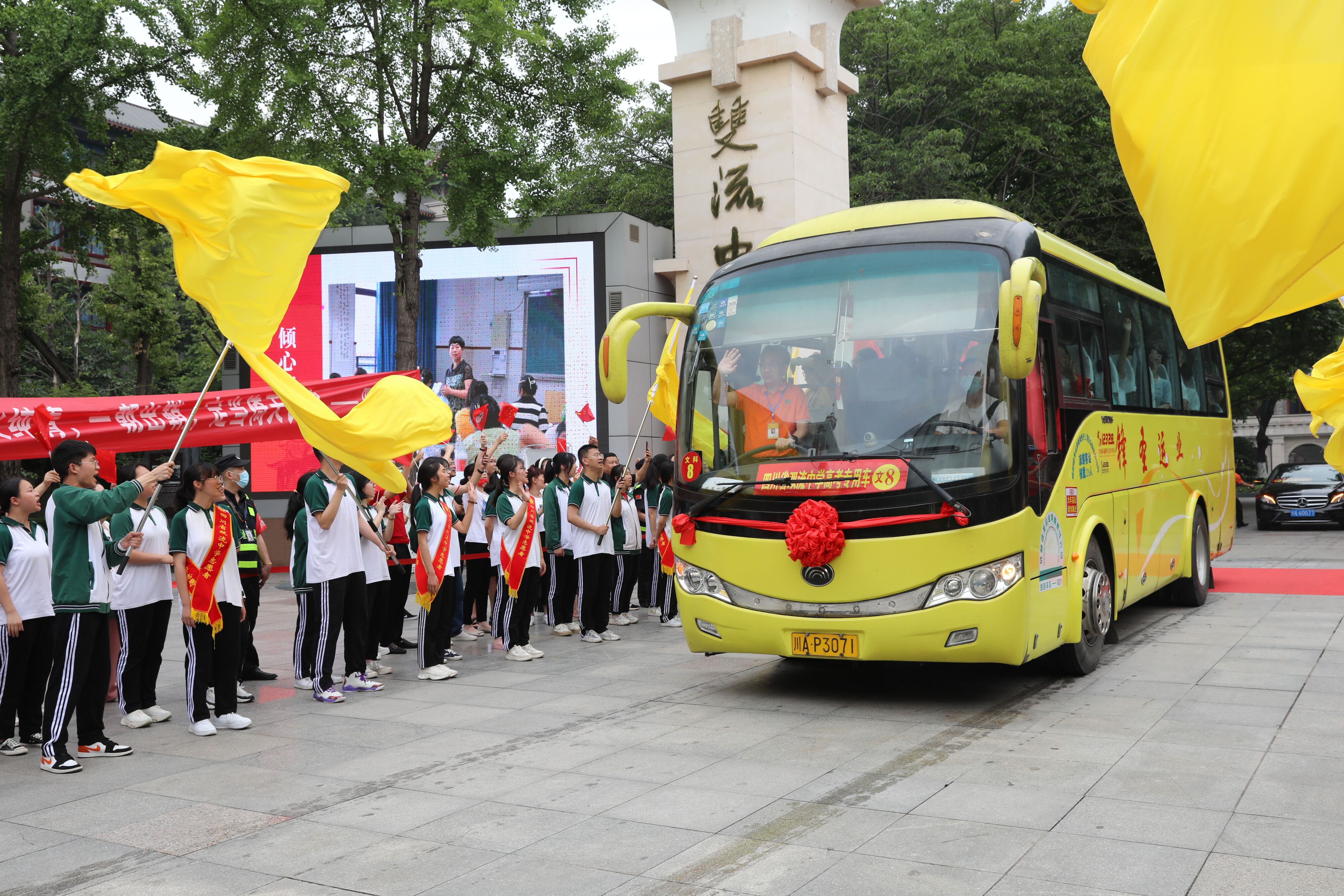 龍校長和部分行政干部揮舞彩旗歡送高三學(xué)子前往考場參加最后一堂外語考試。