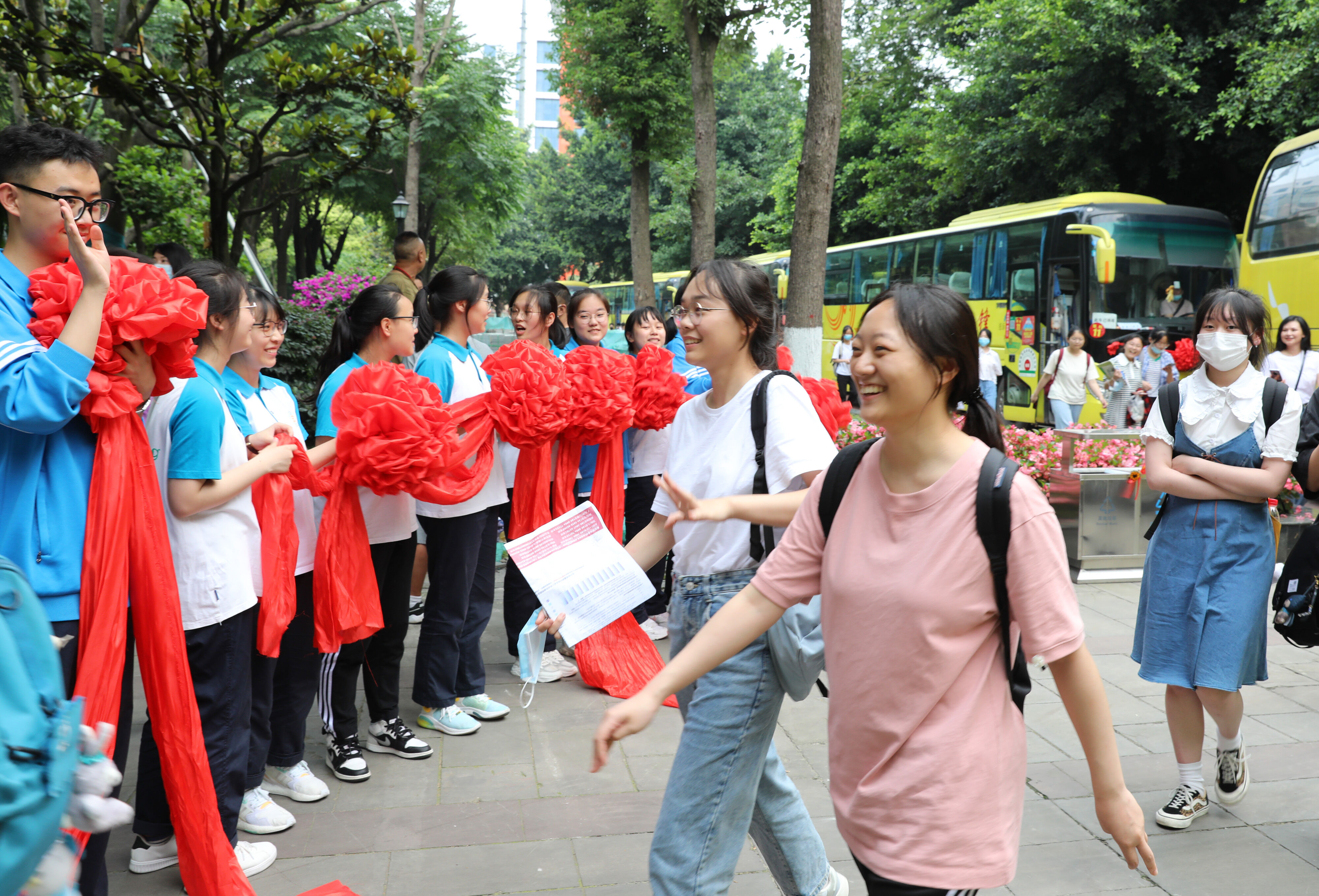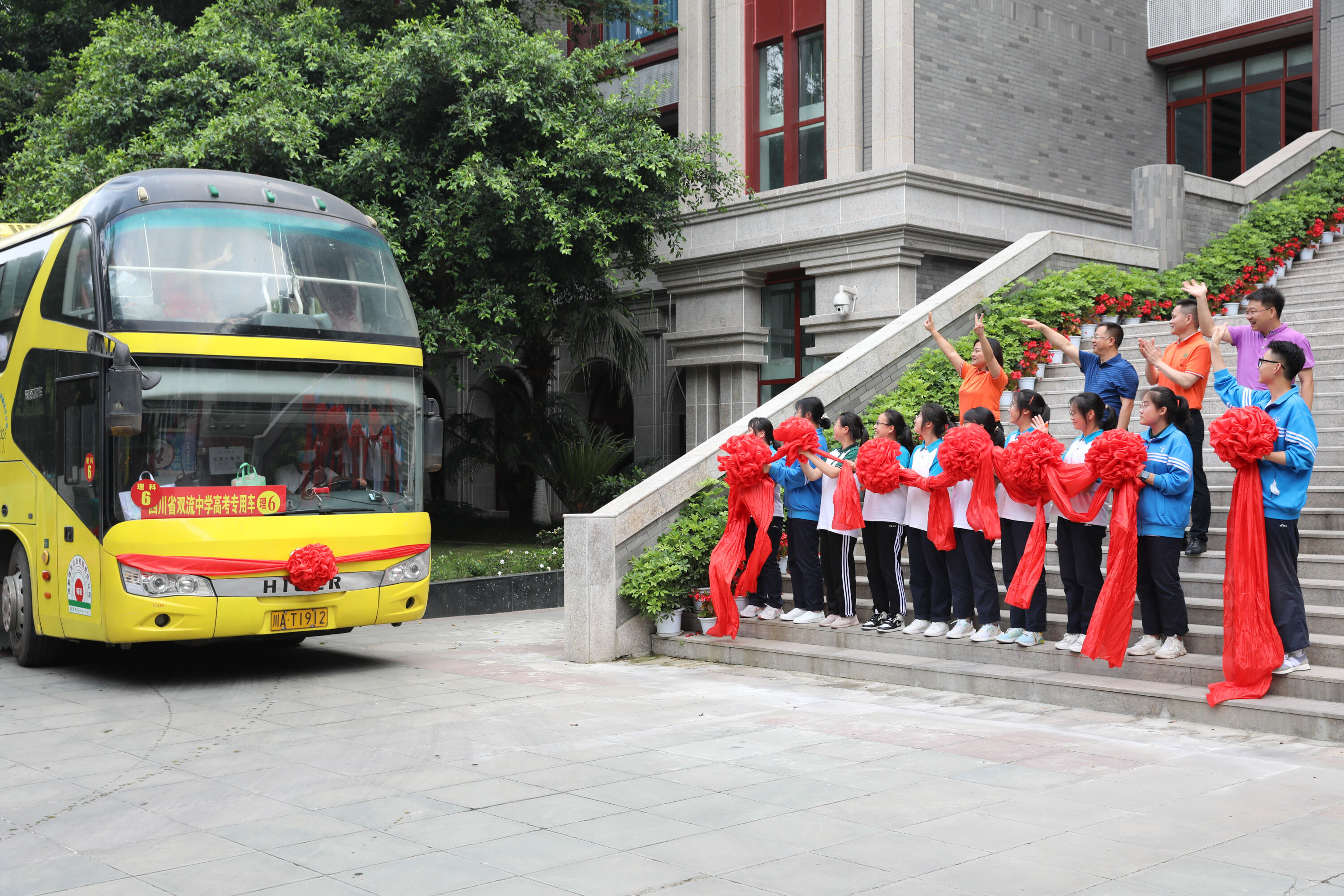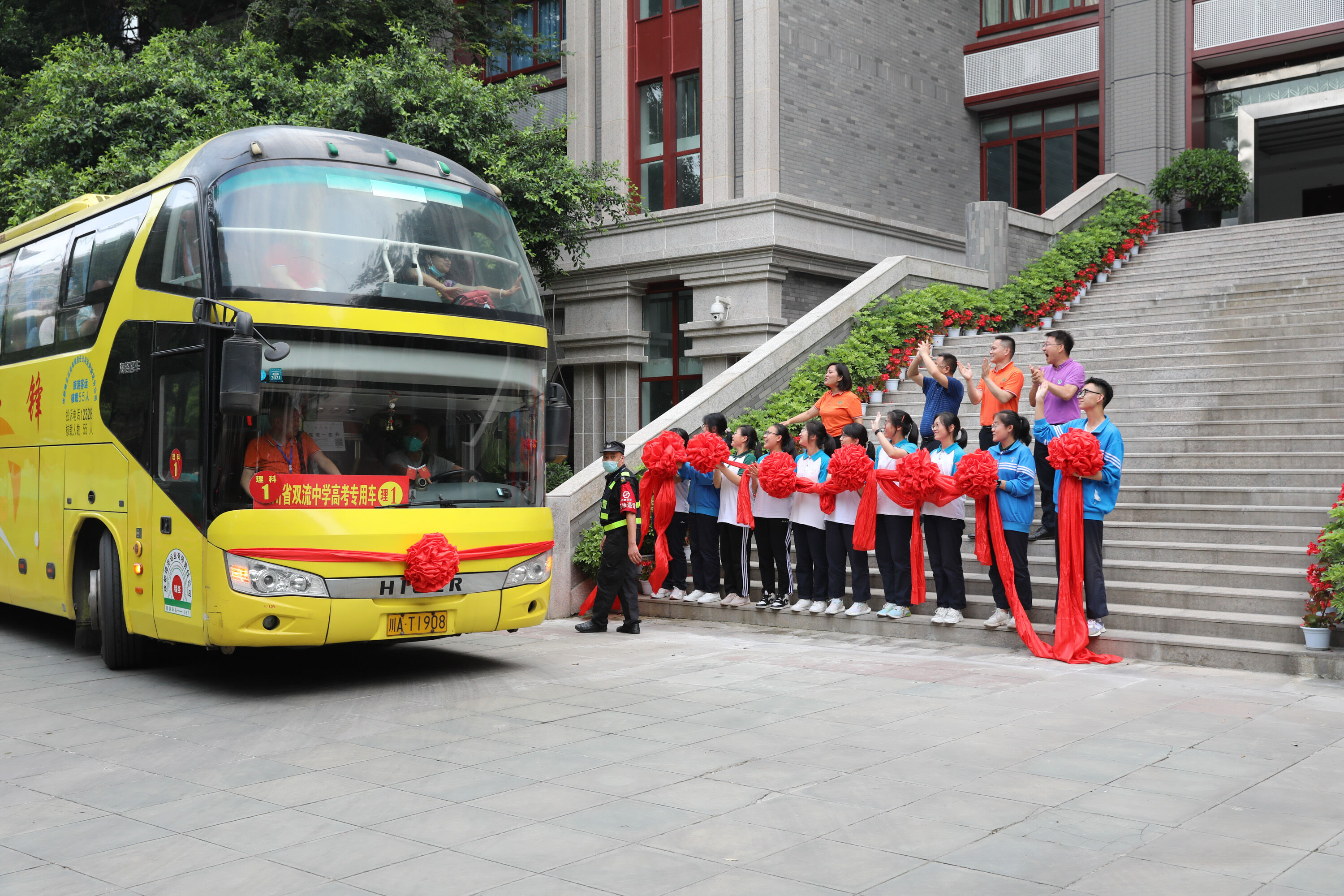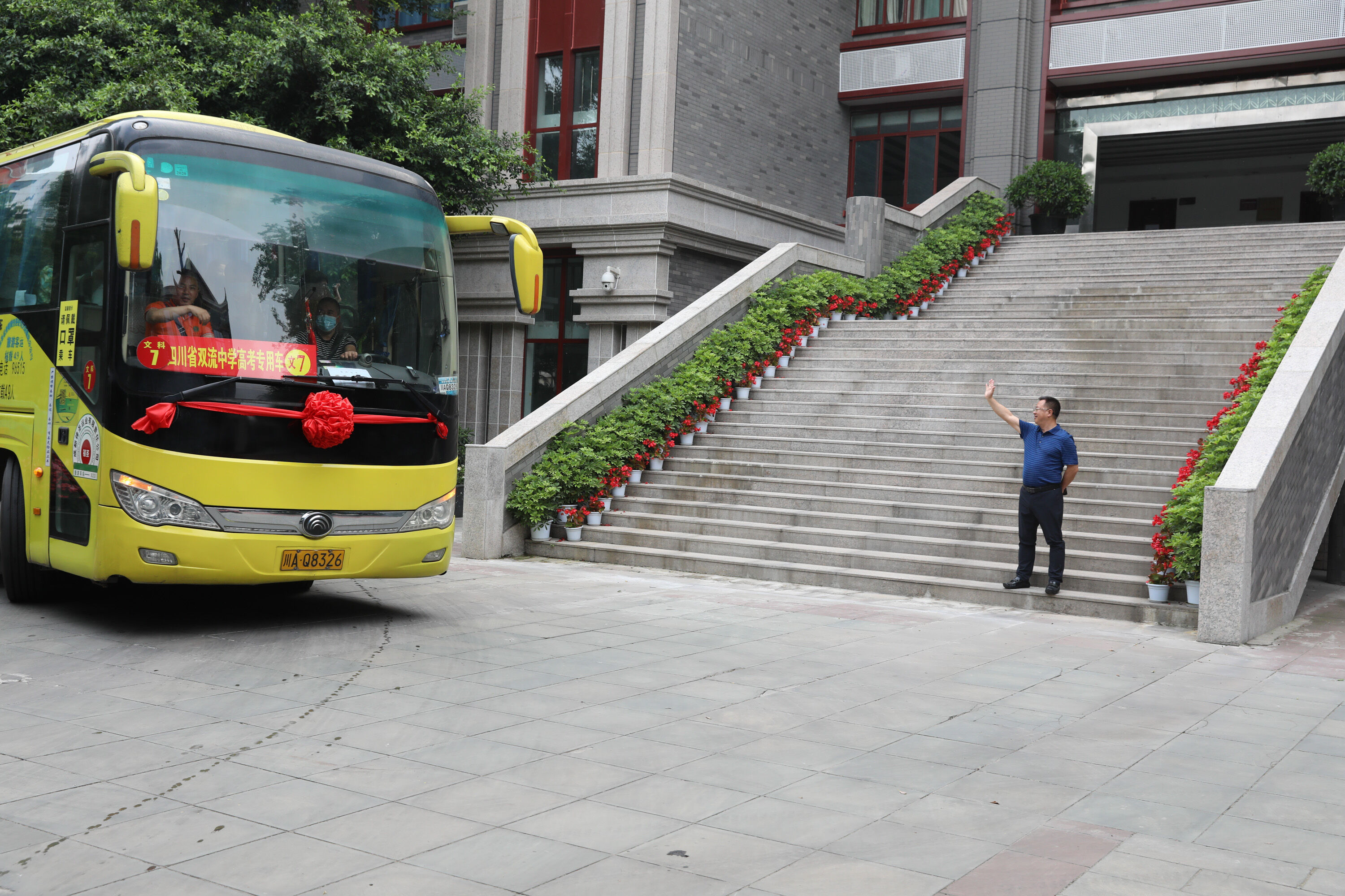 2022年6月8日,高考結束。龍校長在學校科技樓前親自迎接剛參加完高考的雙中考生歸隊。圖為:龍校長迎接文科考生車隊凱旋