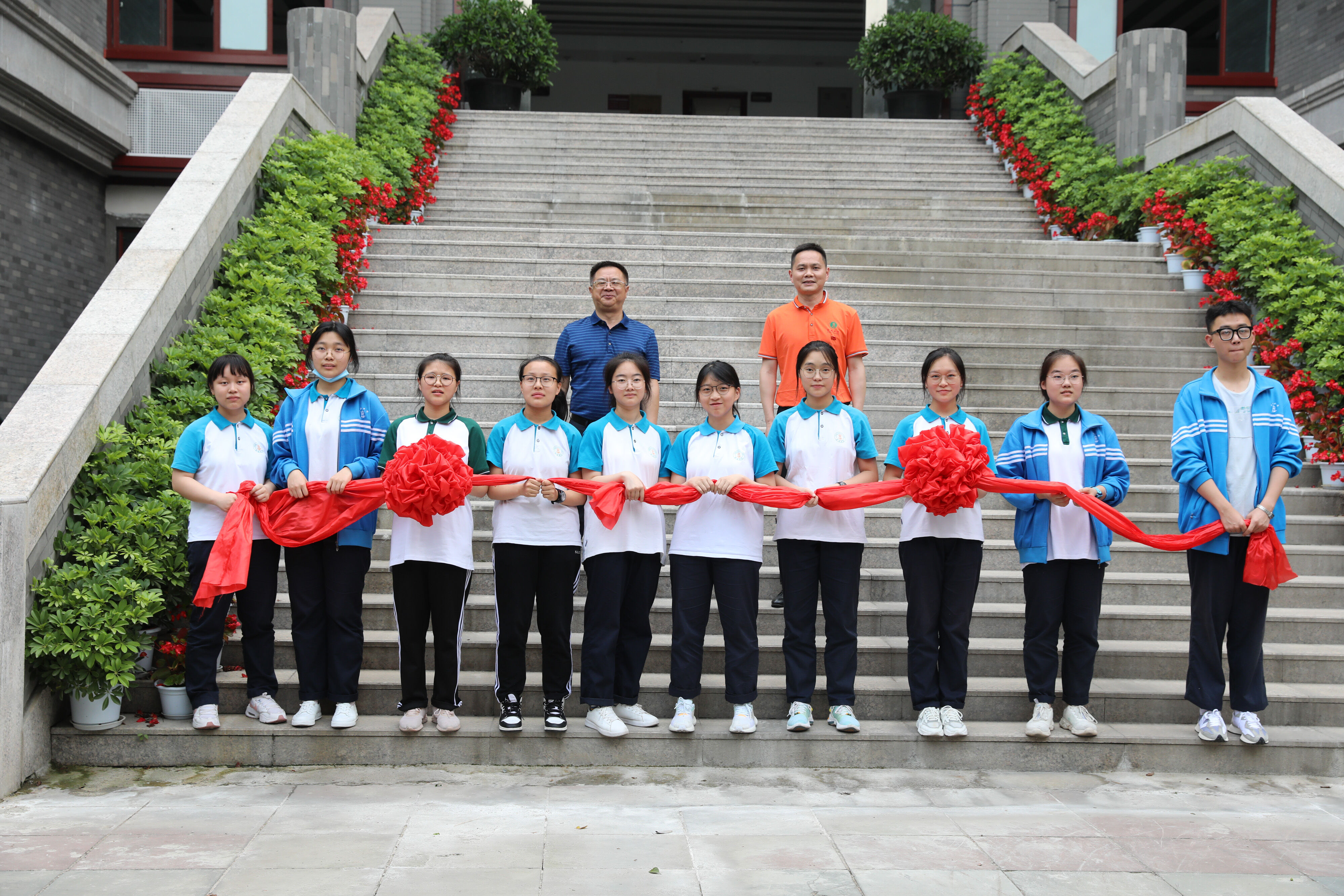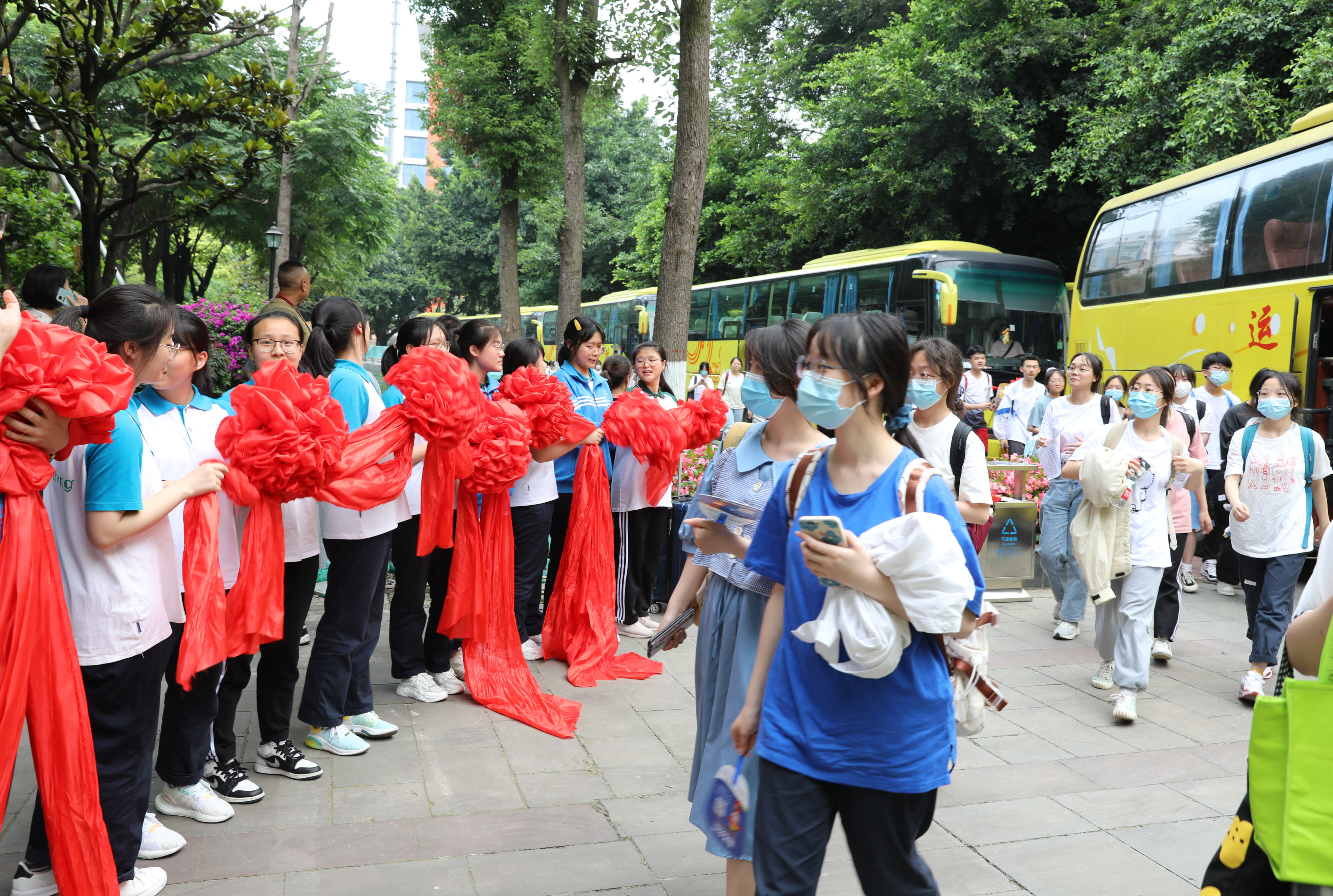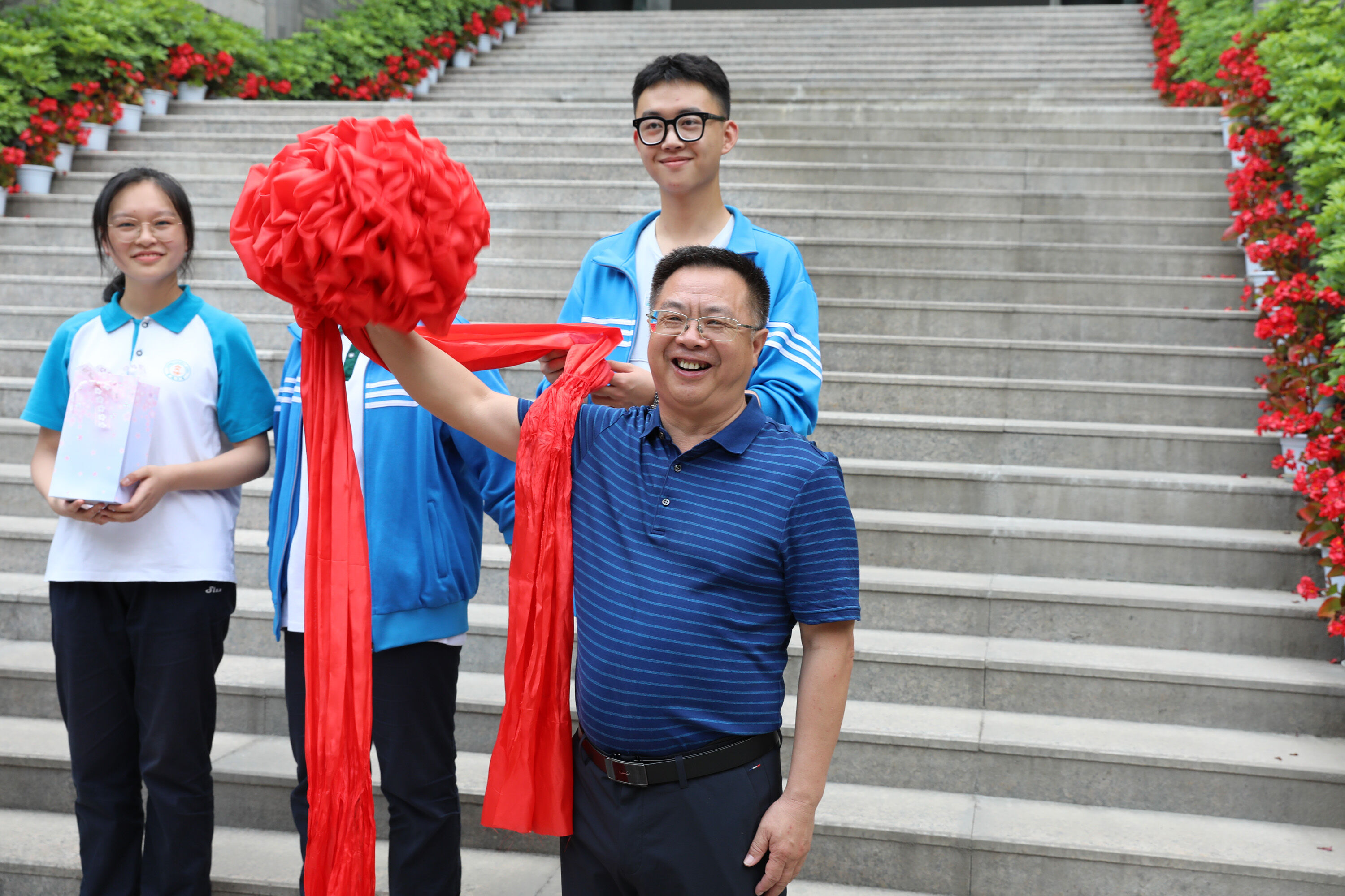 龍校長、徐校長和高二13班的學生拿著大紅花準備迎接即將歸來的理科考生