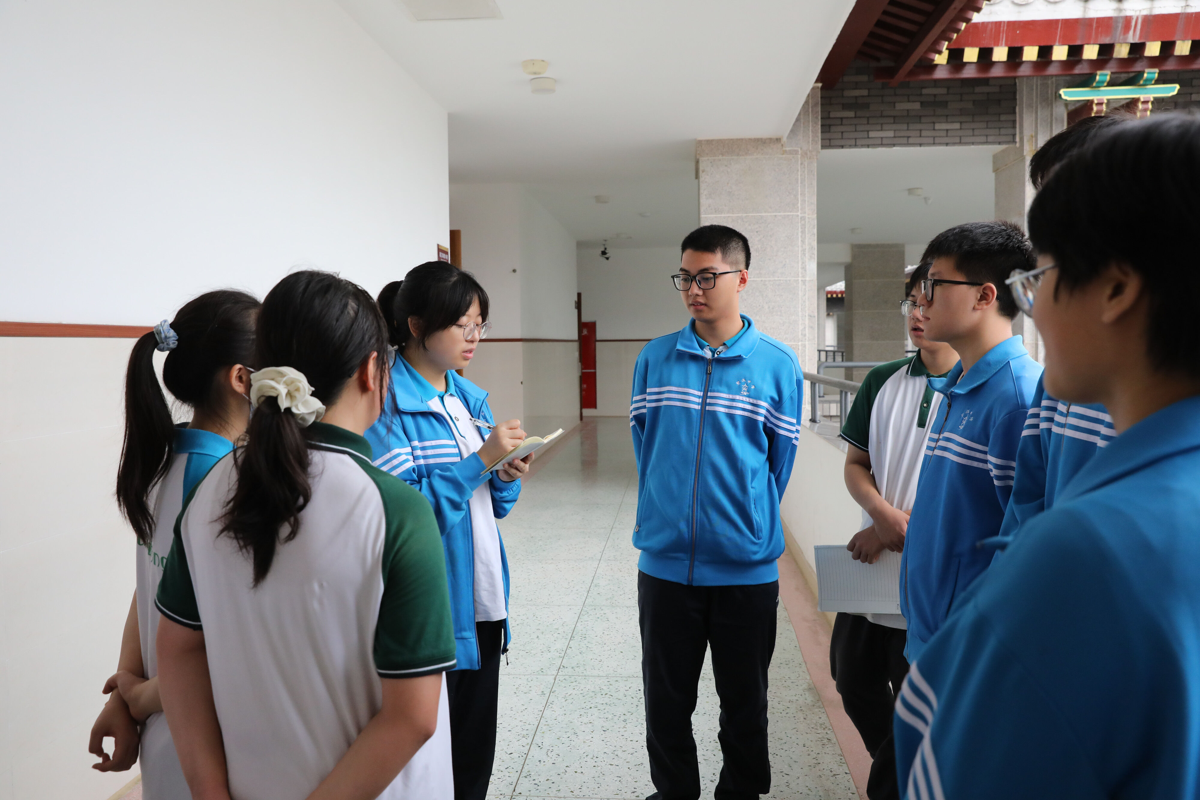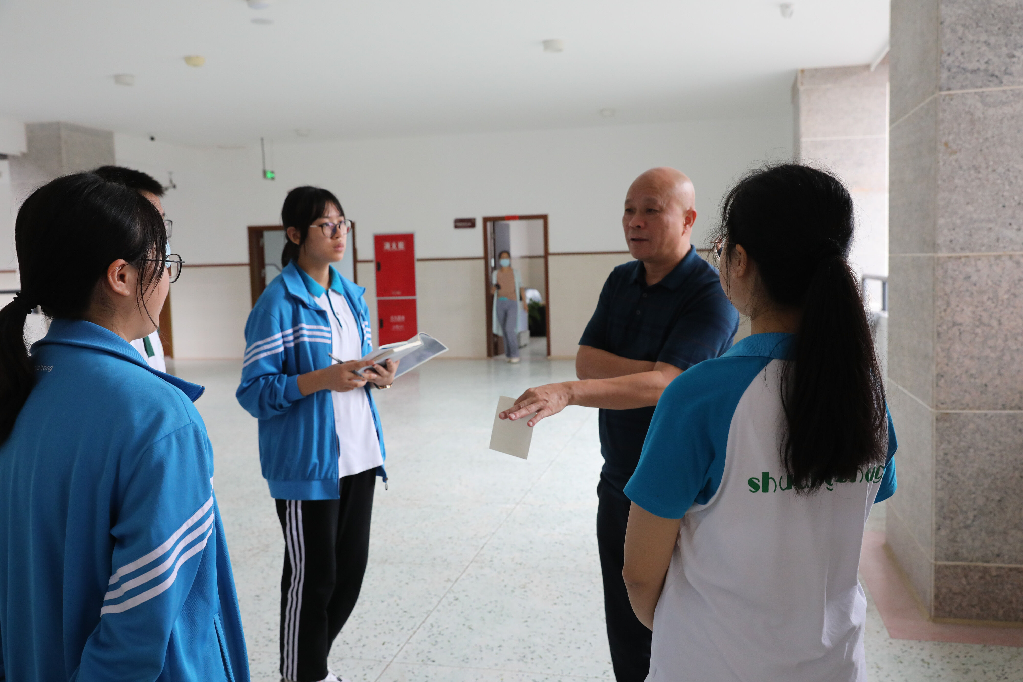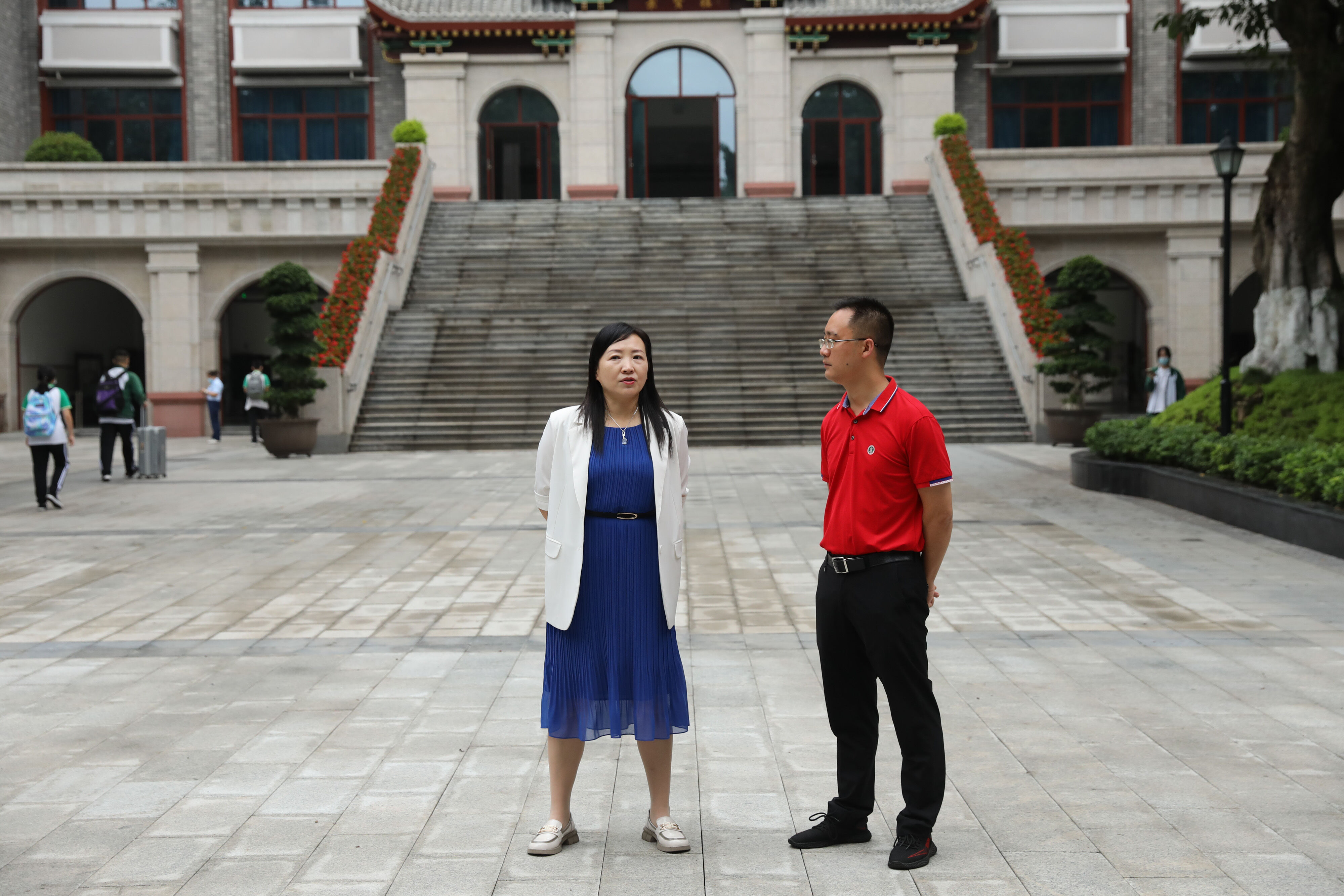 譚校長、杜校長在景賢樓前看望歸隊的學生。