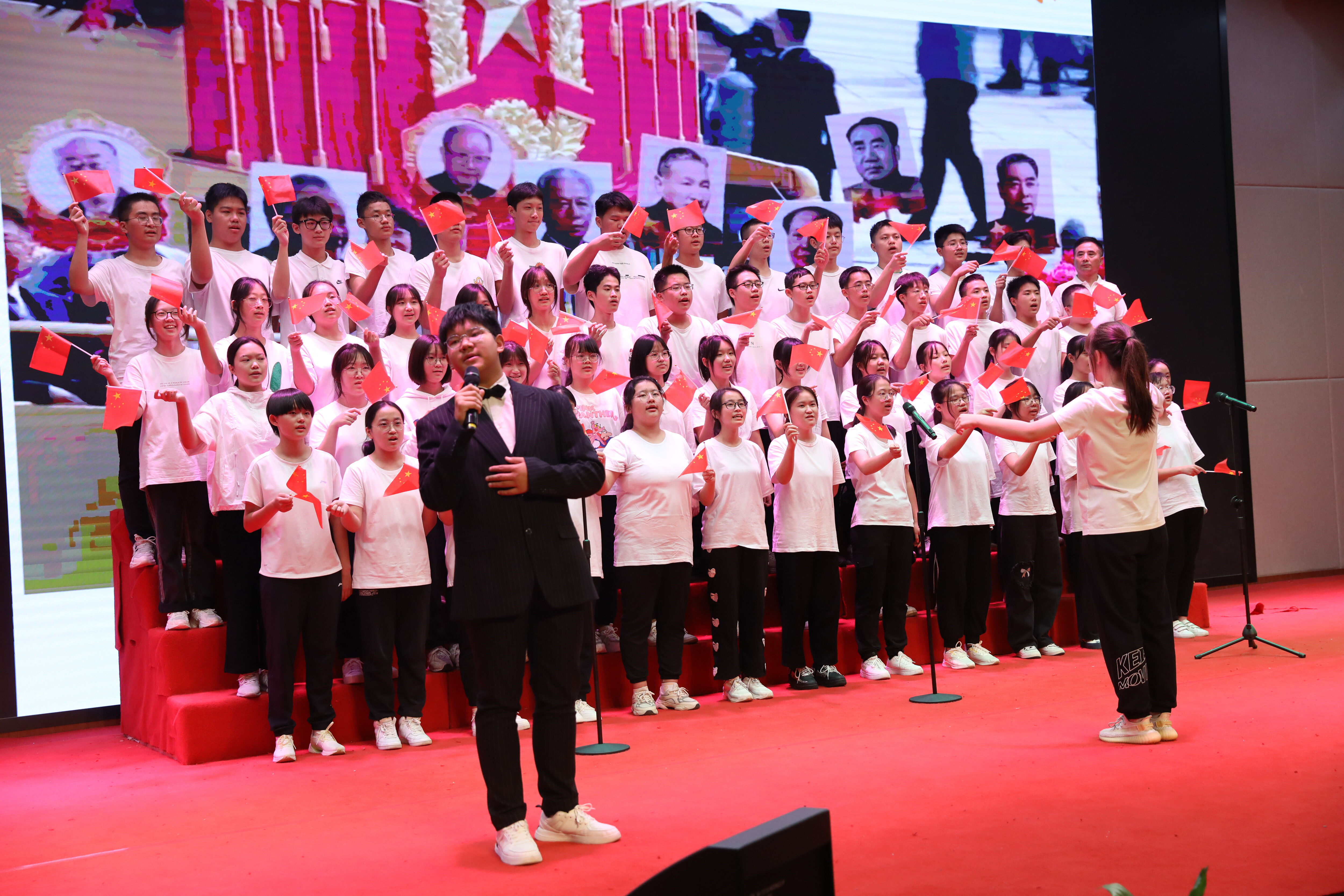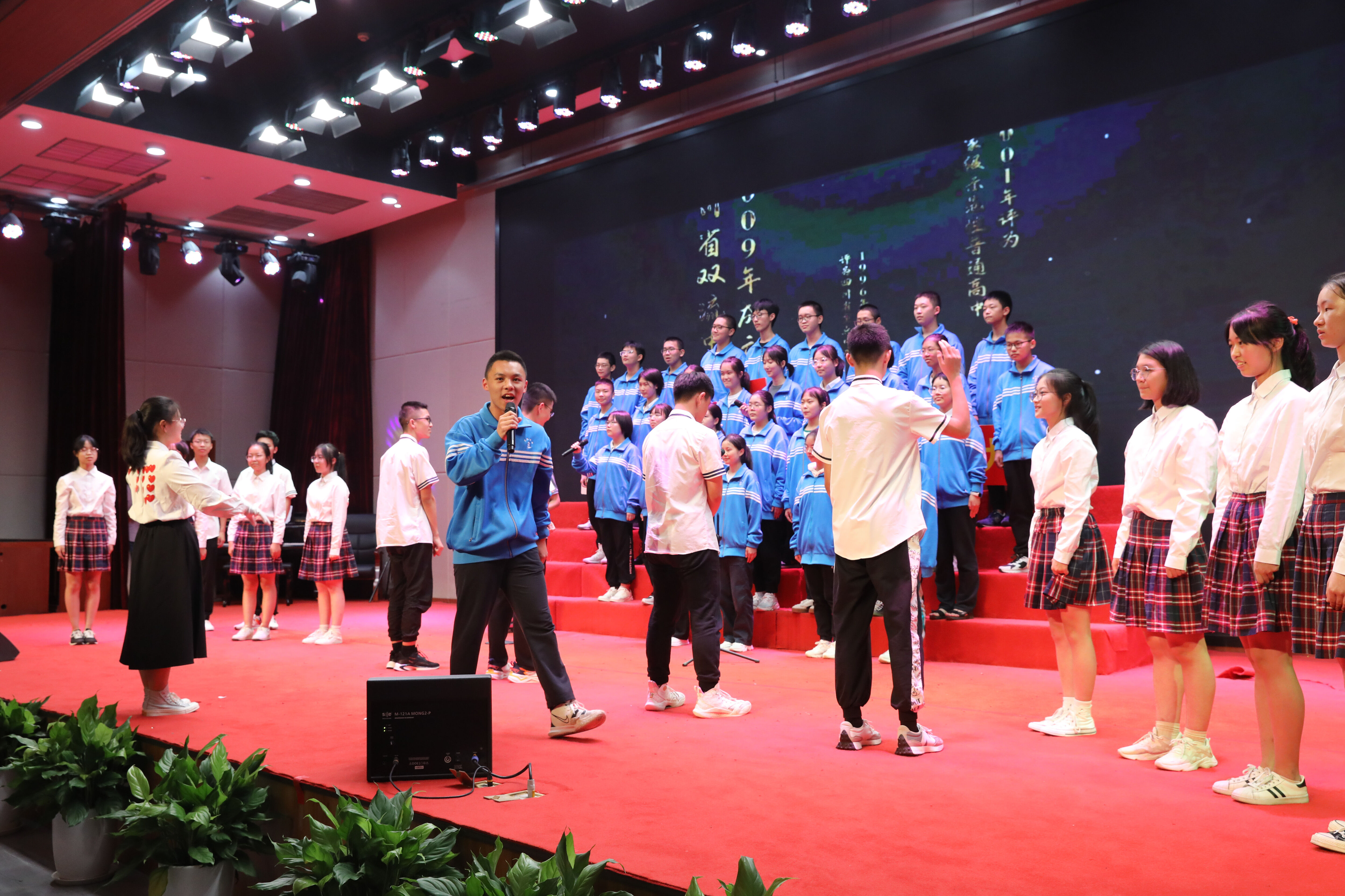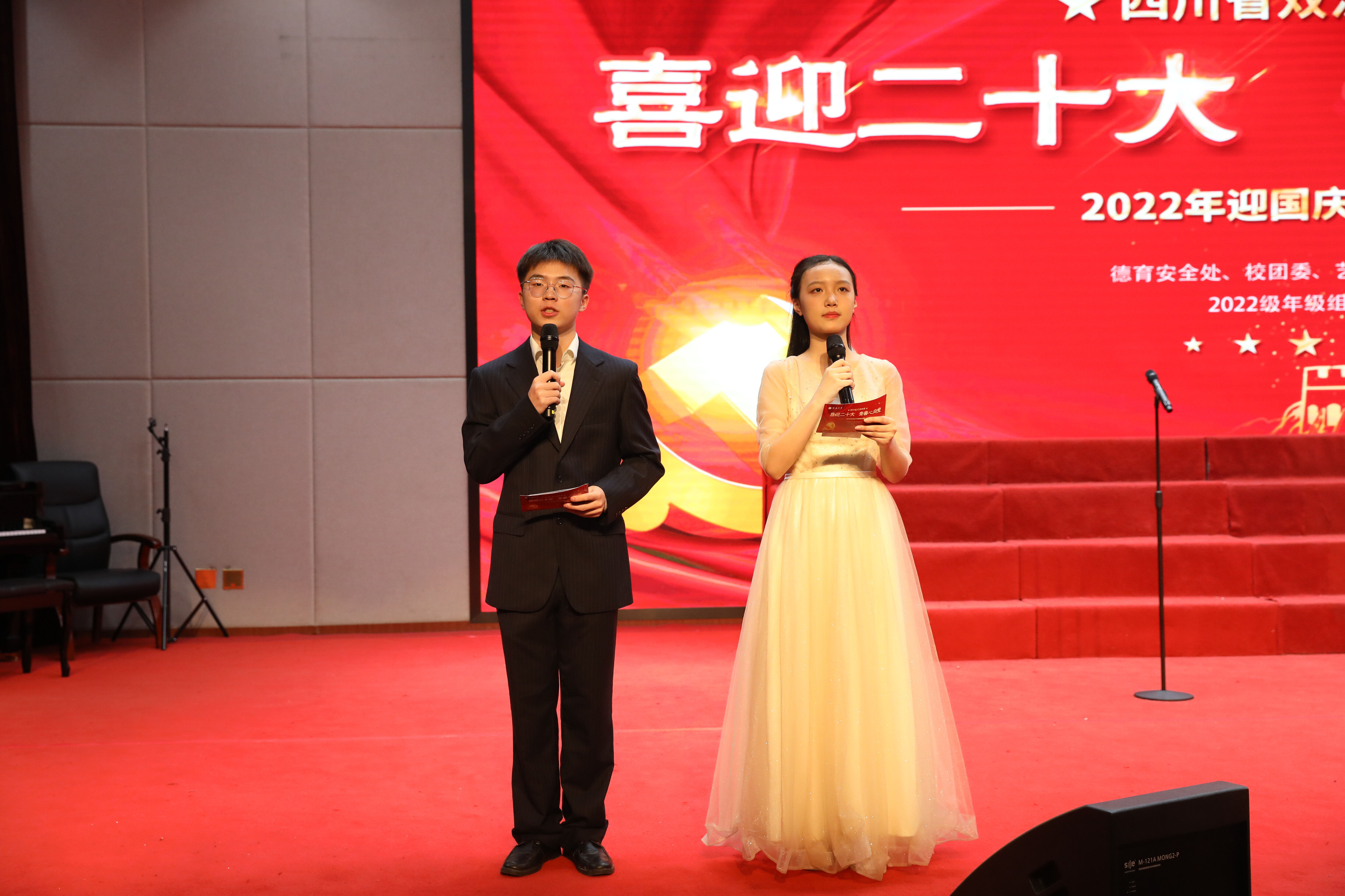 為慶祝黨的二十大勝利召開,培養(yǎng)學(xué)生的民族精神,豐富學(xué)生的課余生活,增進(jìn)師生、生生了解,增強(qiáng)班級(jí)凝聚力,雙流中學(xué)在國慶來臨之際舉辦了以“喜迎二十大·青春心向黨”為主題的合唱比賽。2022年9月29日,高一年級(jí)在玉蘭廳舉行合唱比賽。(圖為:合唱比賽主持人)
