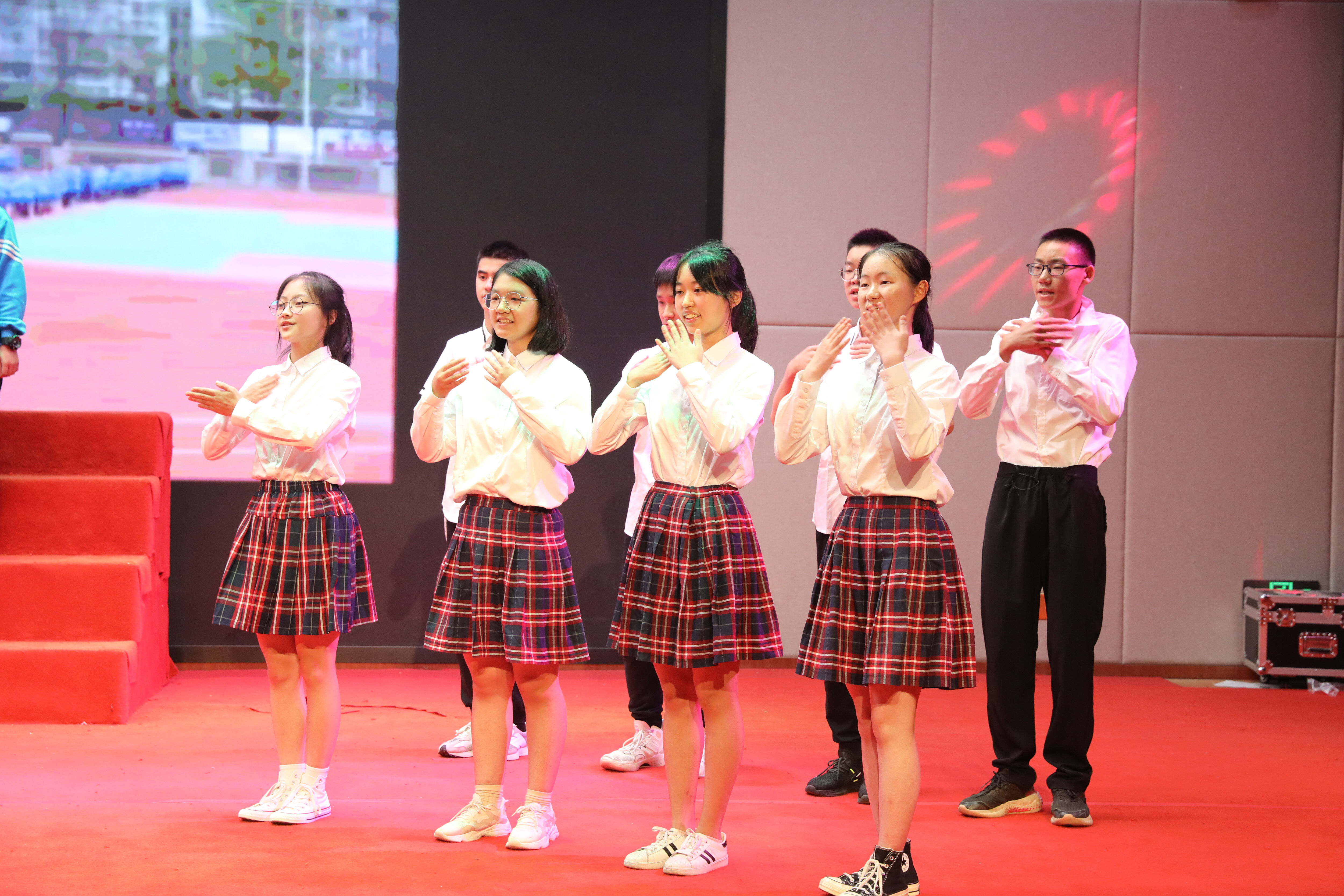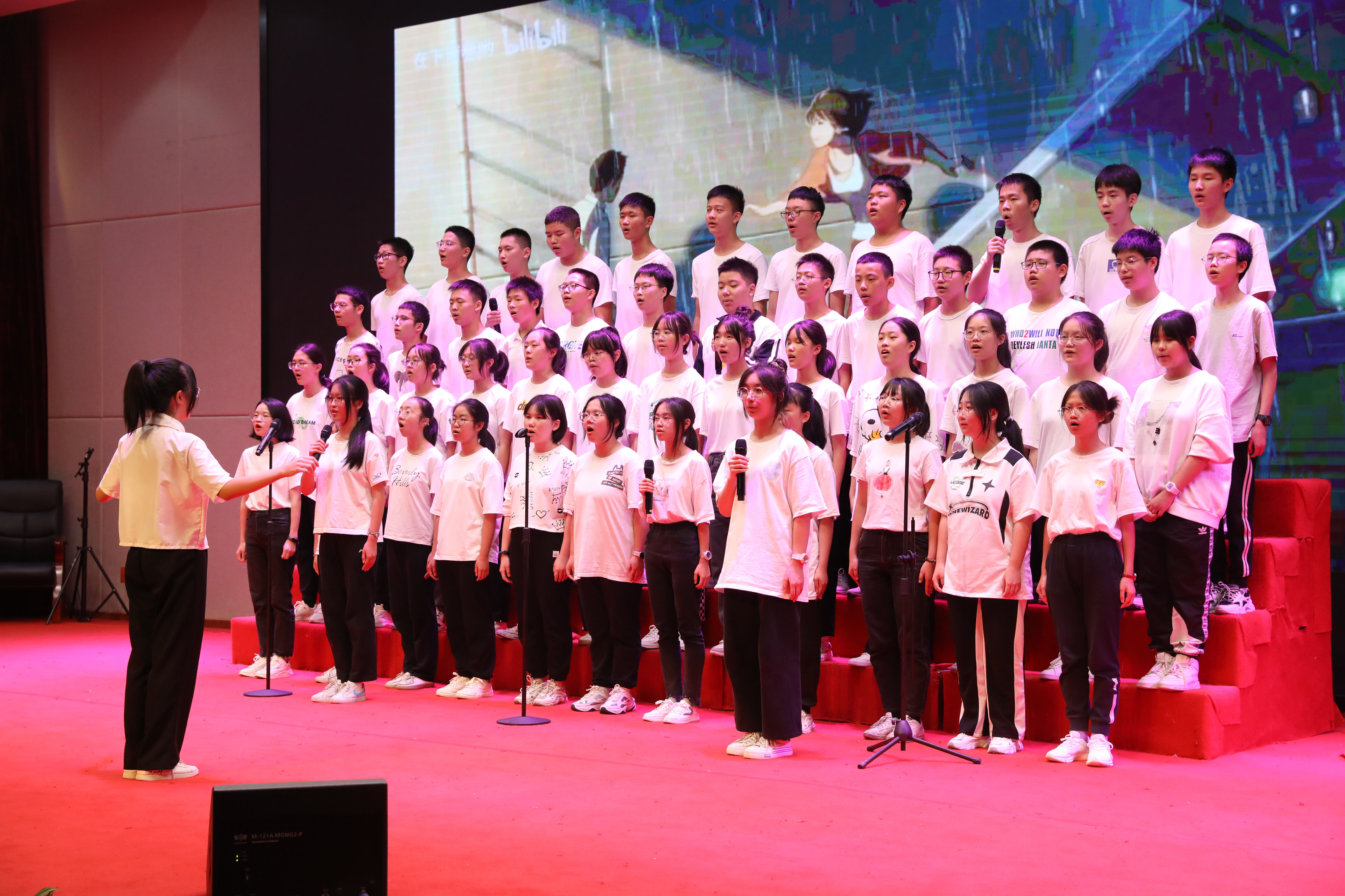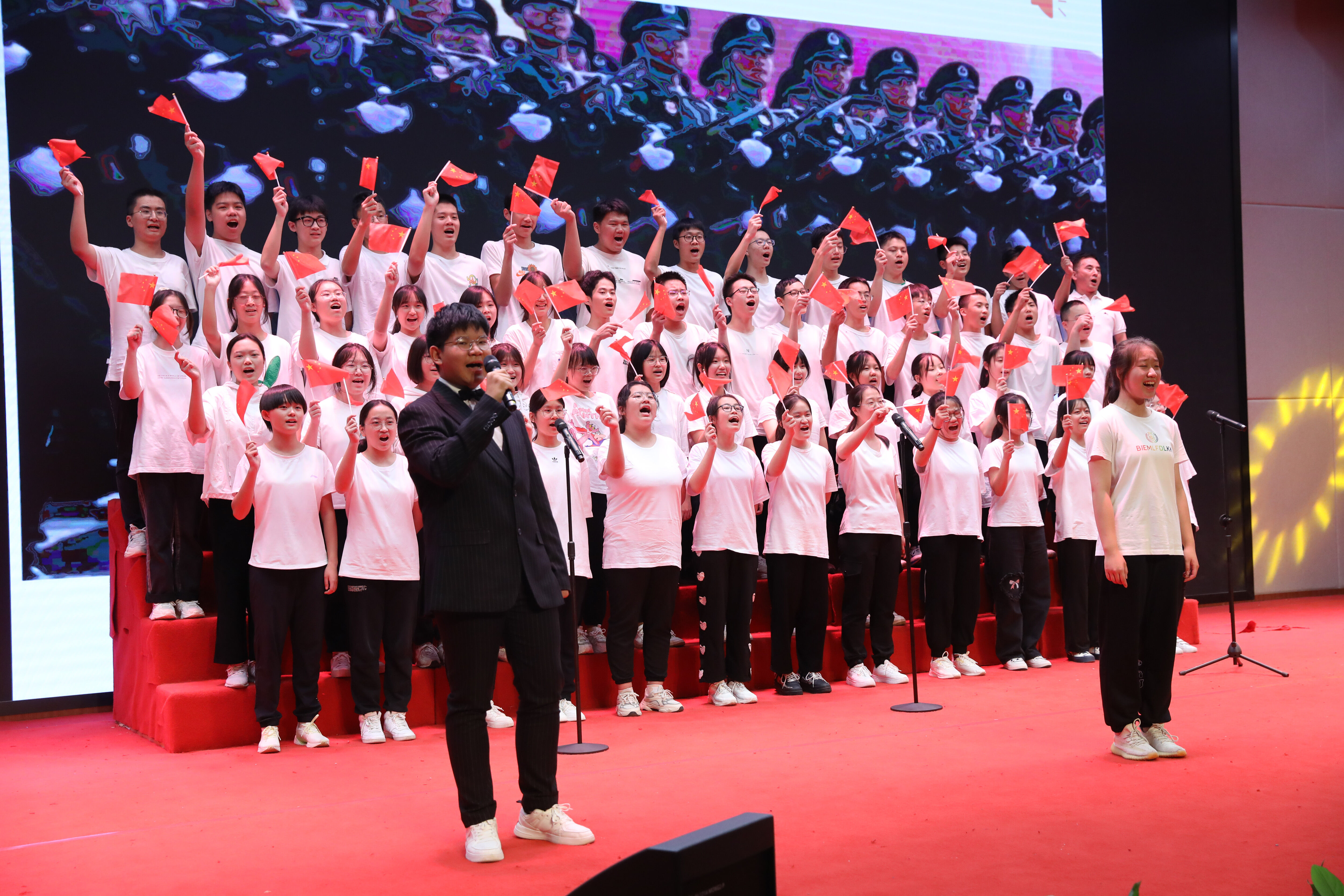 為慶祝黨的二十大勝利召開,培養(yǎng)學(xué)生的民族精神,豐富學(xué)生的課余生活,增進(jìn)師生、生生了解,增強(qiáng)班級(jí)凝聚力,雙流中學(xué)在國慶來臨之際舉辦了以“喜迎二十大·青春心向黨”為主題的合唱比賽。2022年9月29日,高一年級(jí)在玉蘭廳舉行合唱比賽。(圖為:合唱比賽主持人)