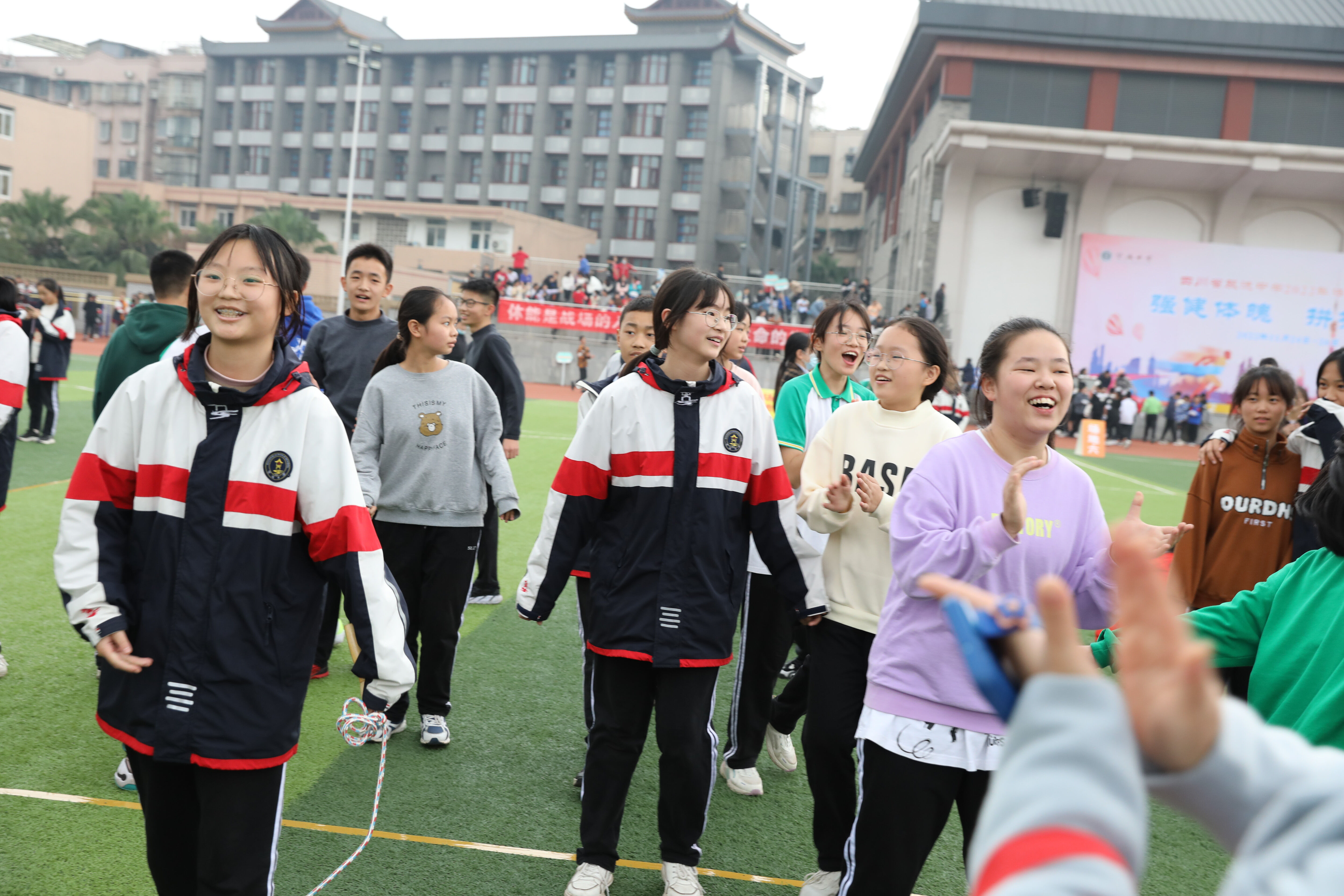 八年級(jí)趣味跳繩比賽,完成比賽的班級(jí)慶祝勝利