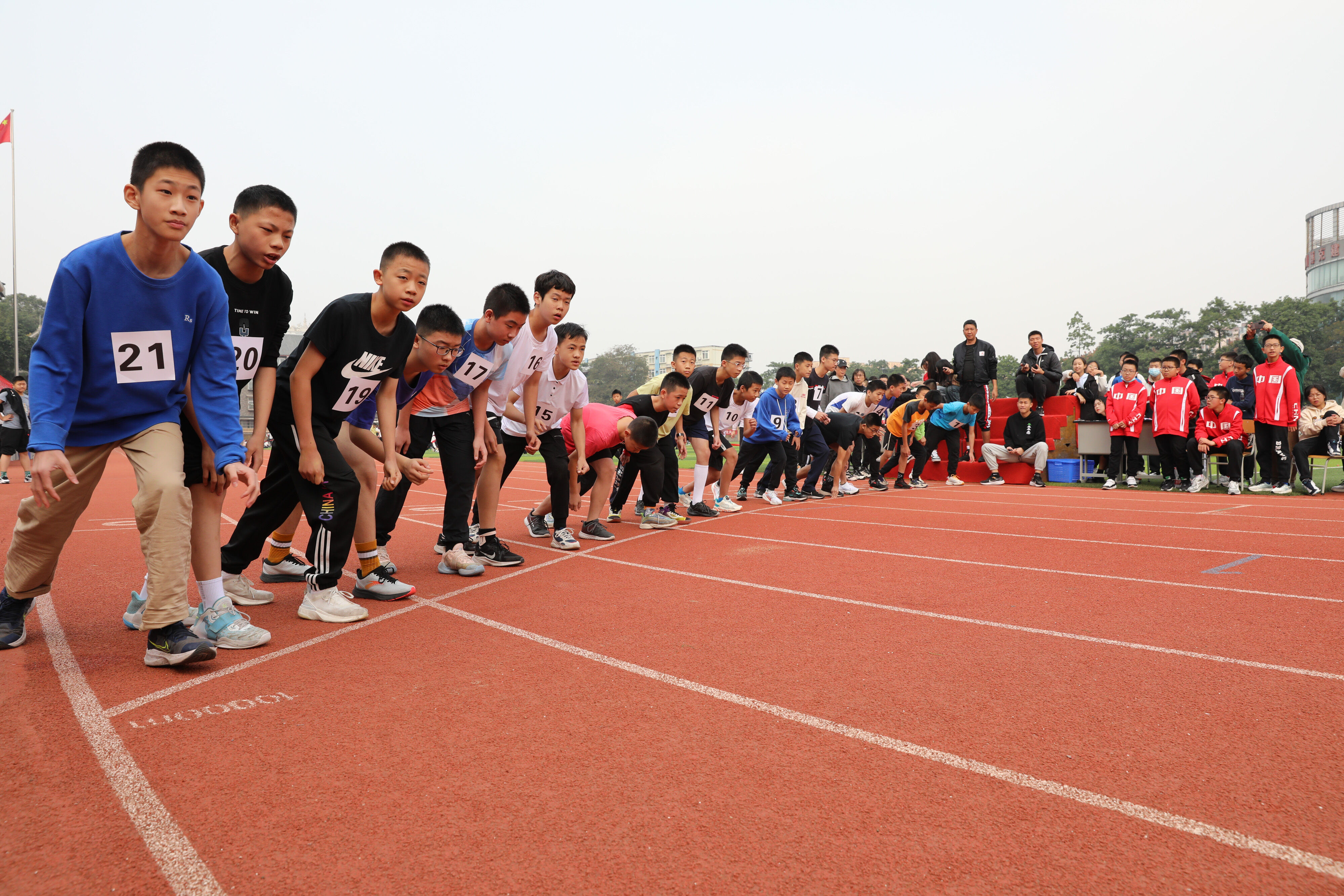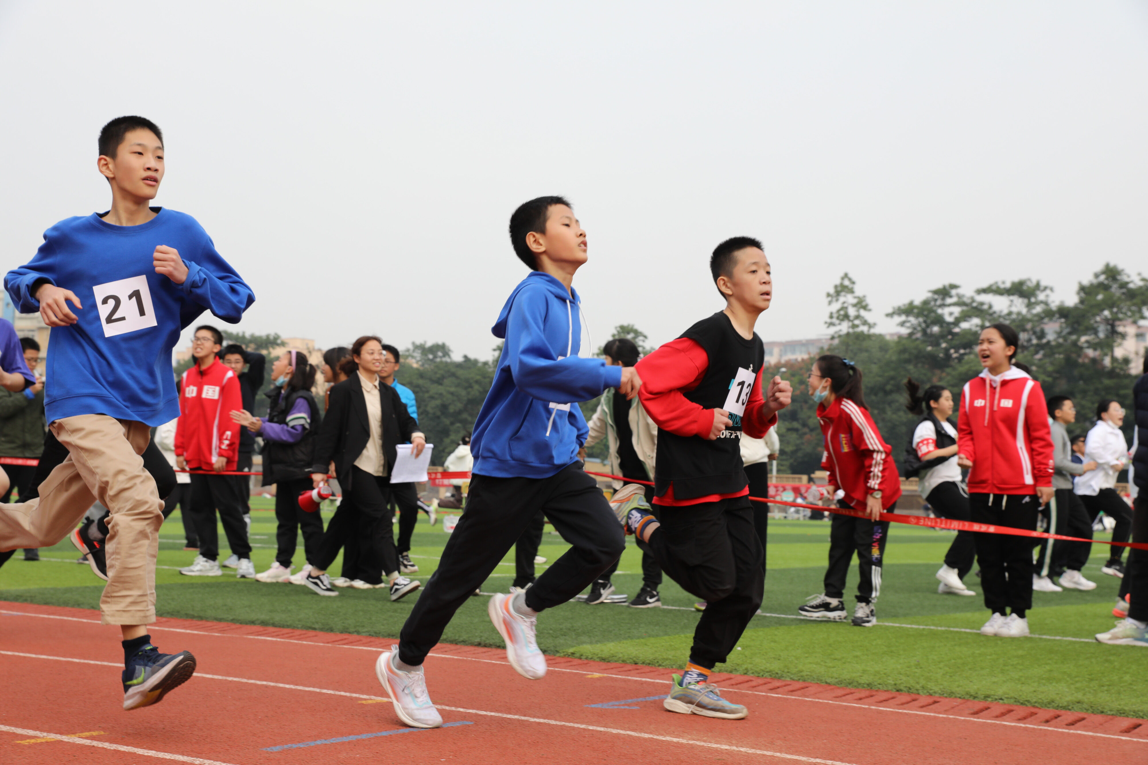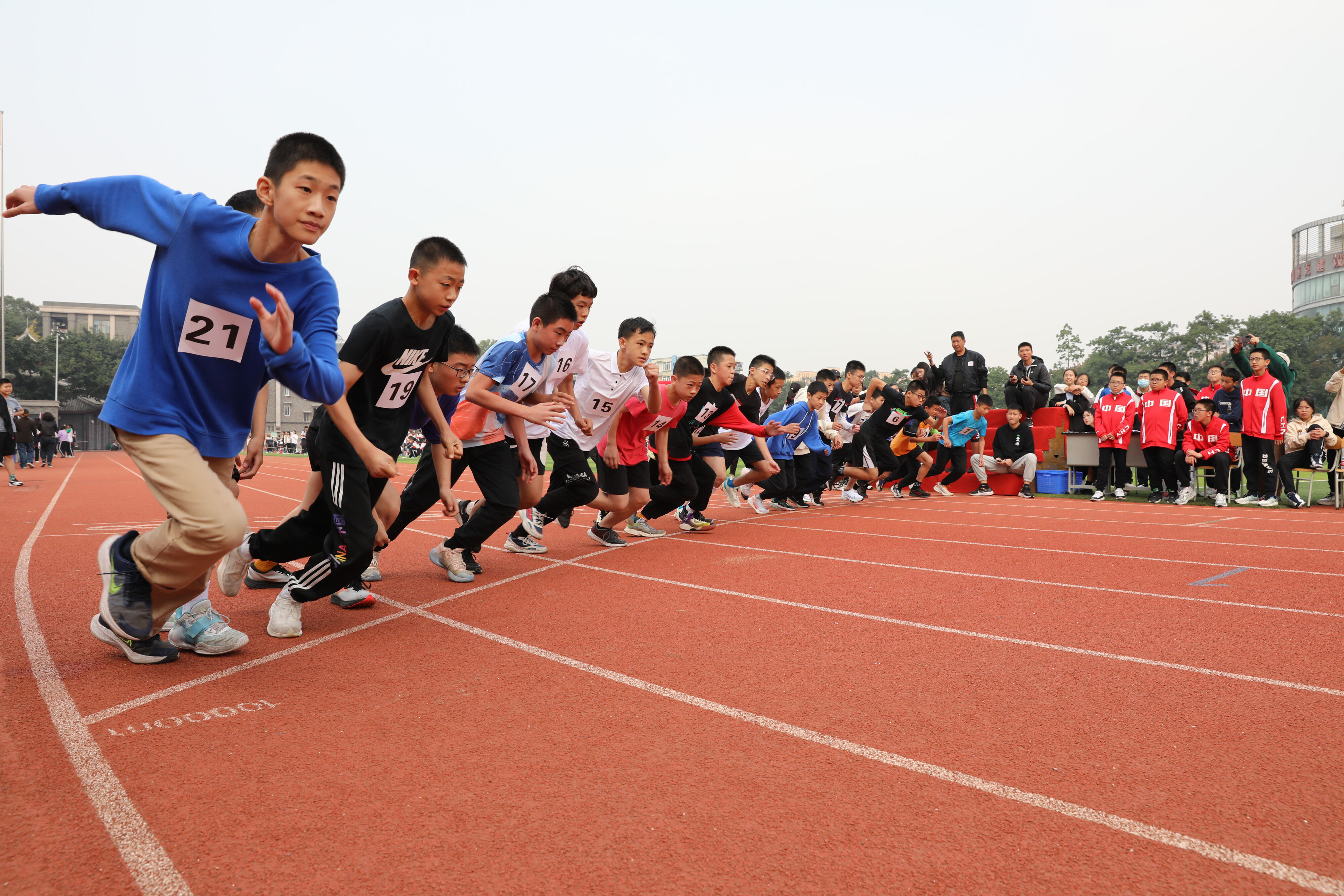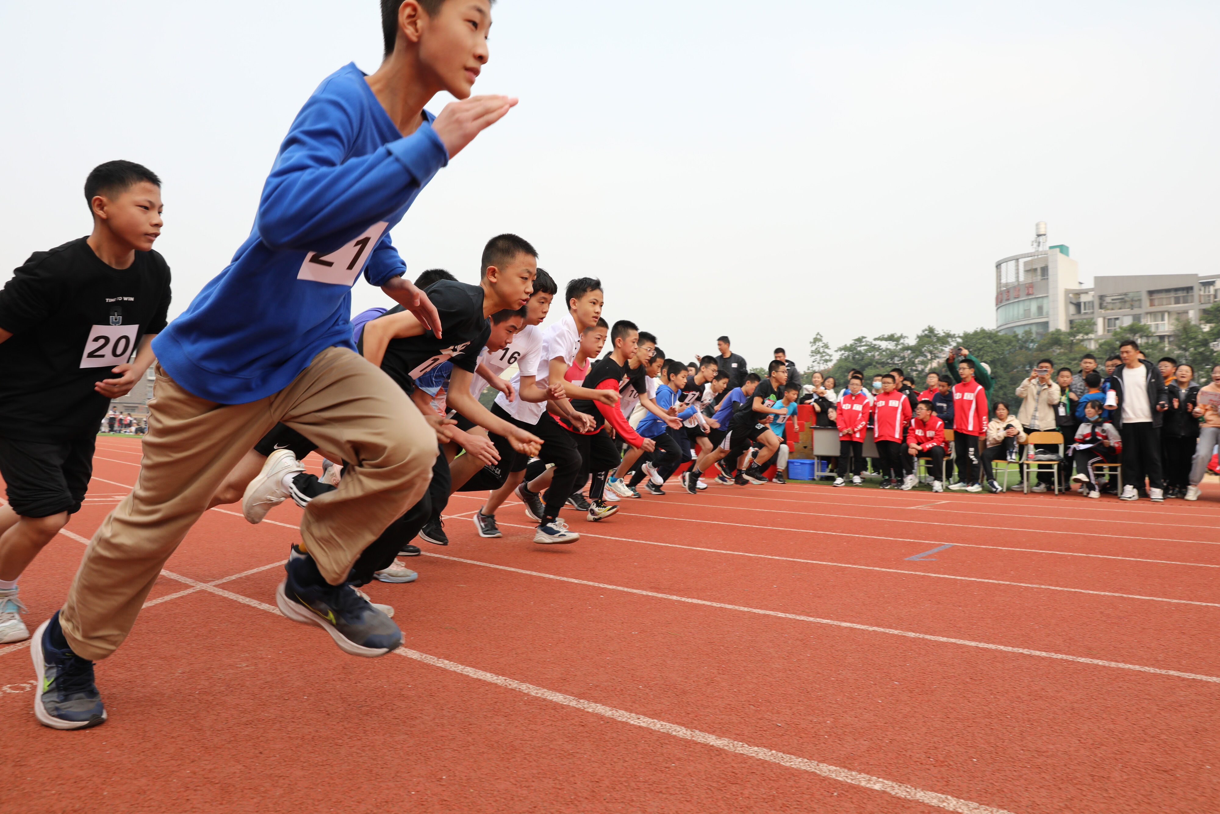 2022年11月24日上午11:00,在雙流中學體育文化藝術節(jié)上,七年級800米比賽在運動場舉行。圖為 七年級男子800米比賽運動員起跑瞬間