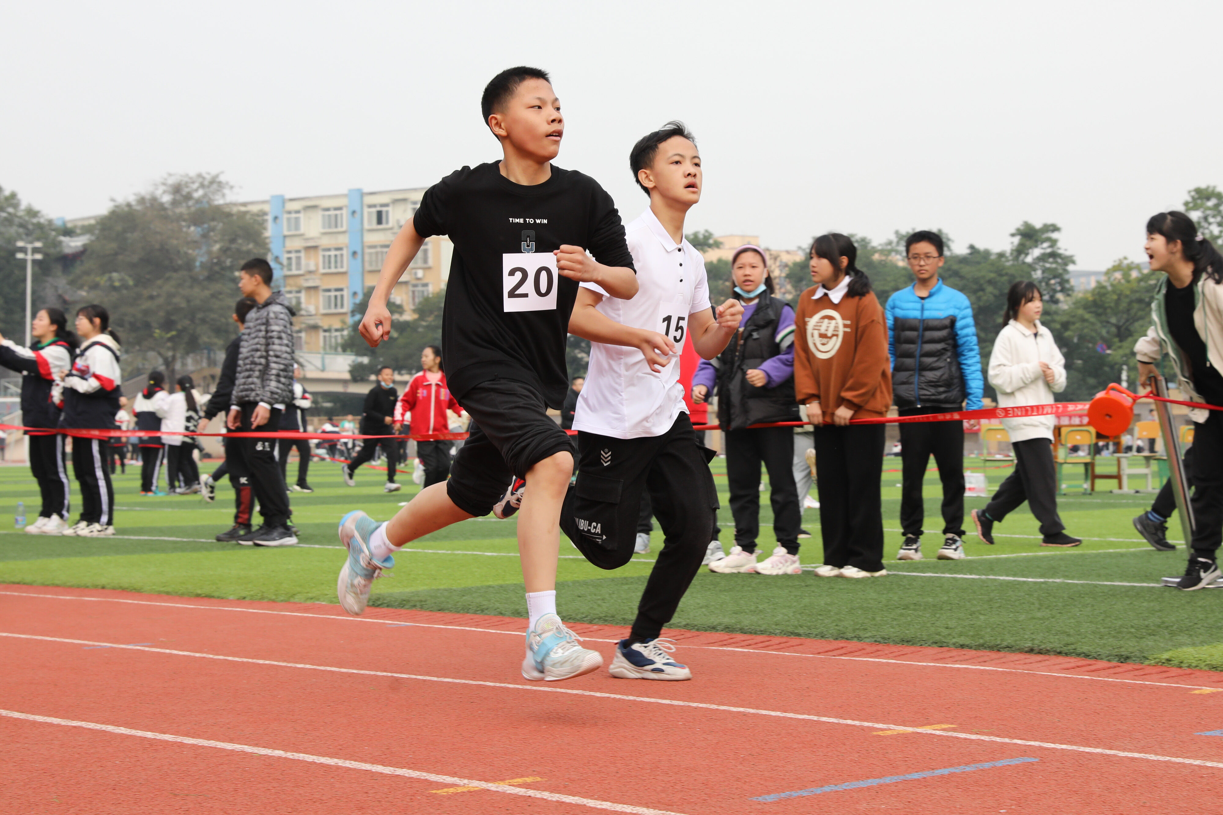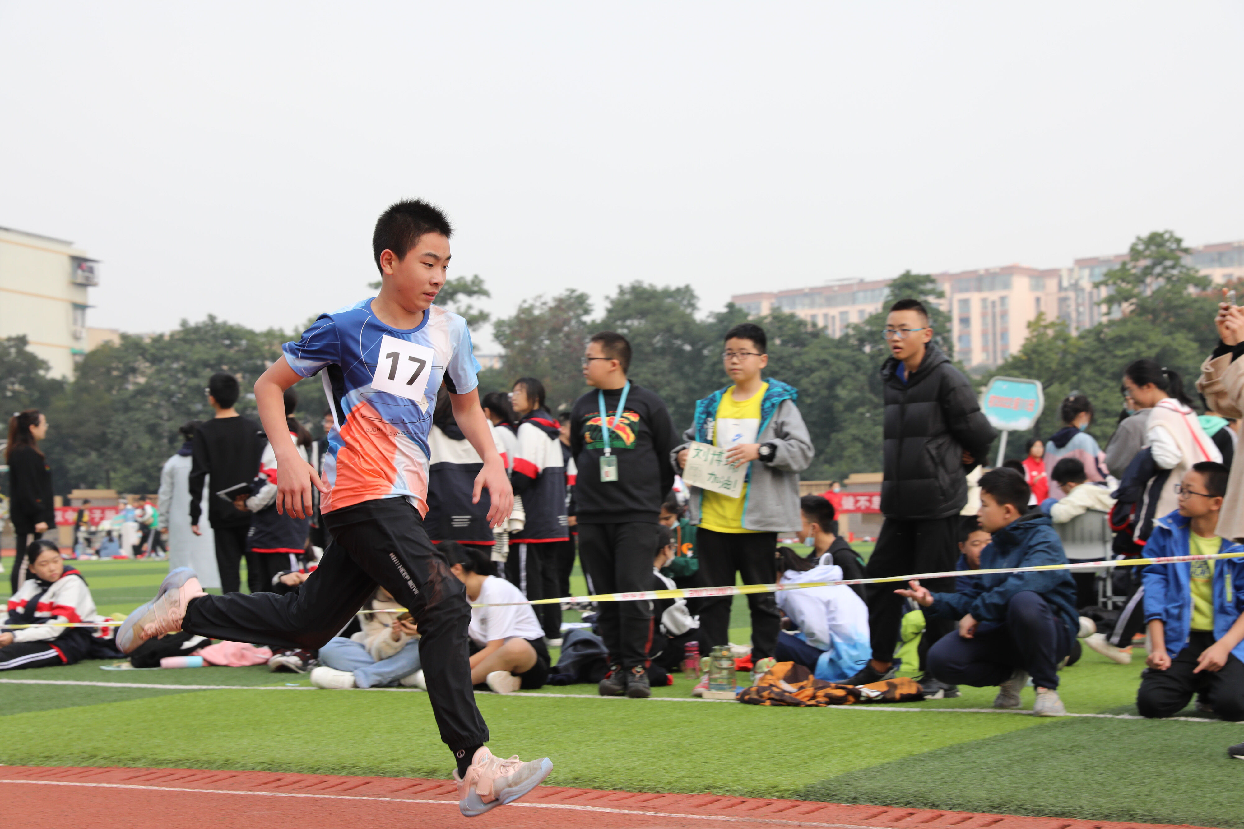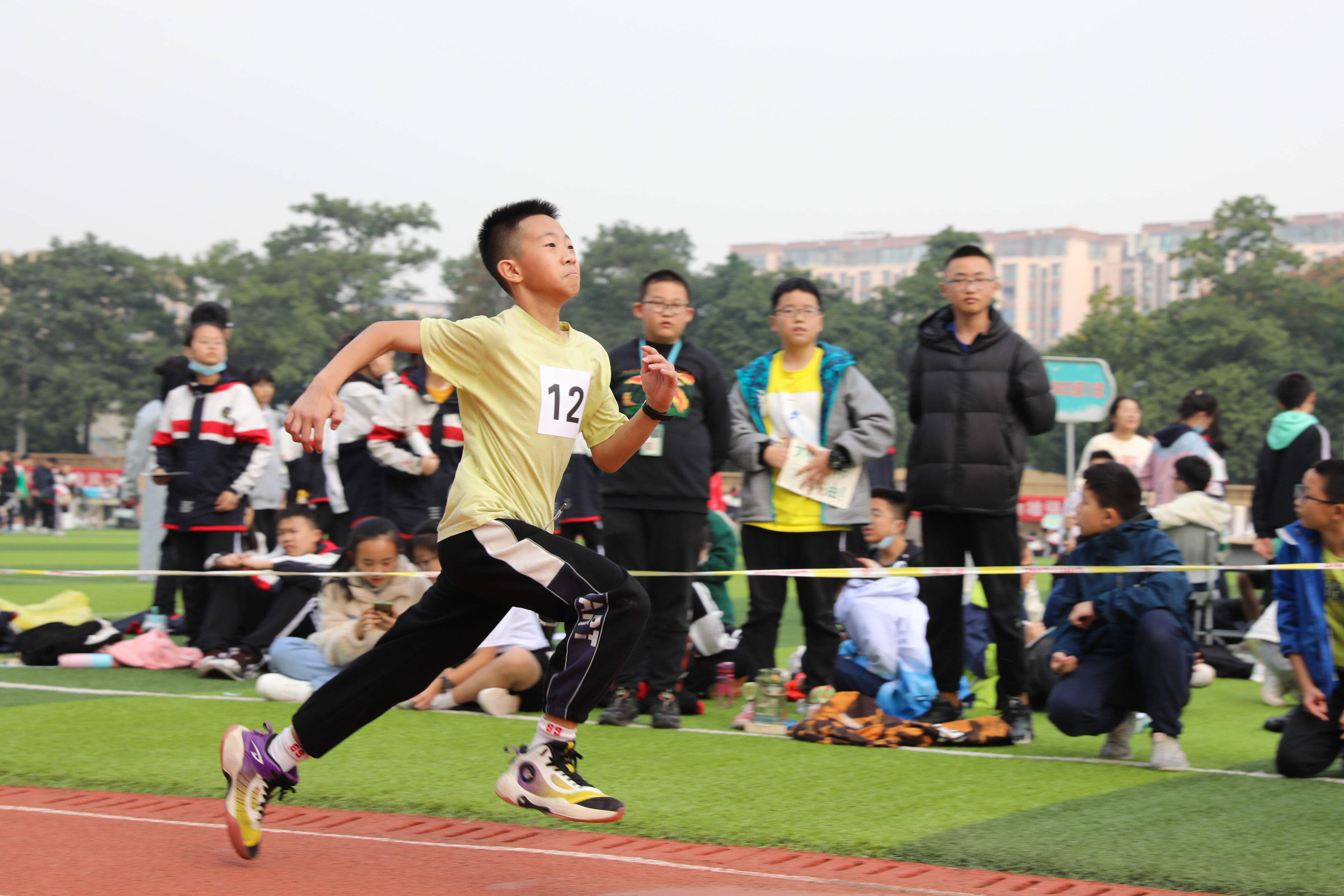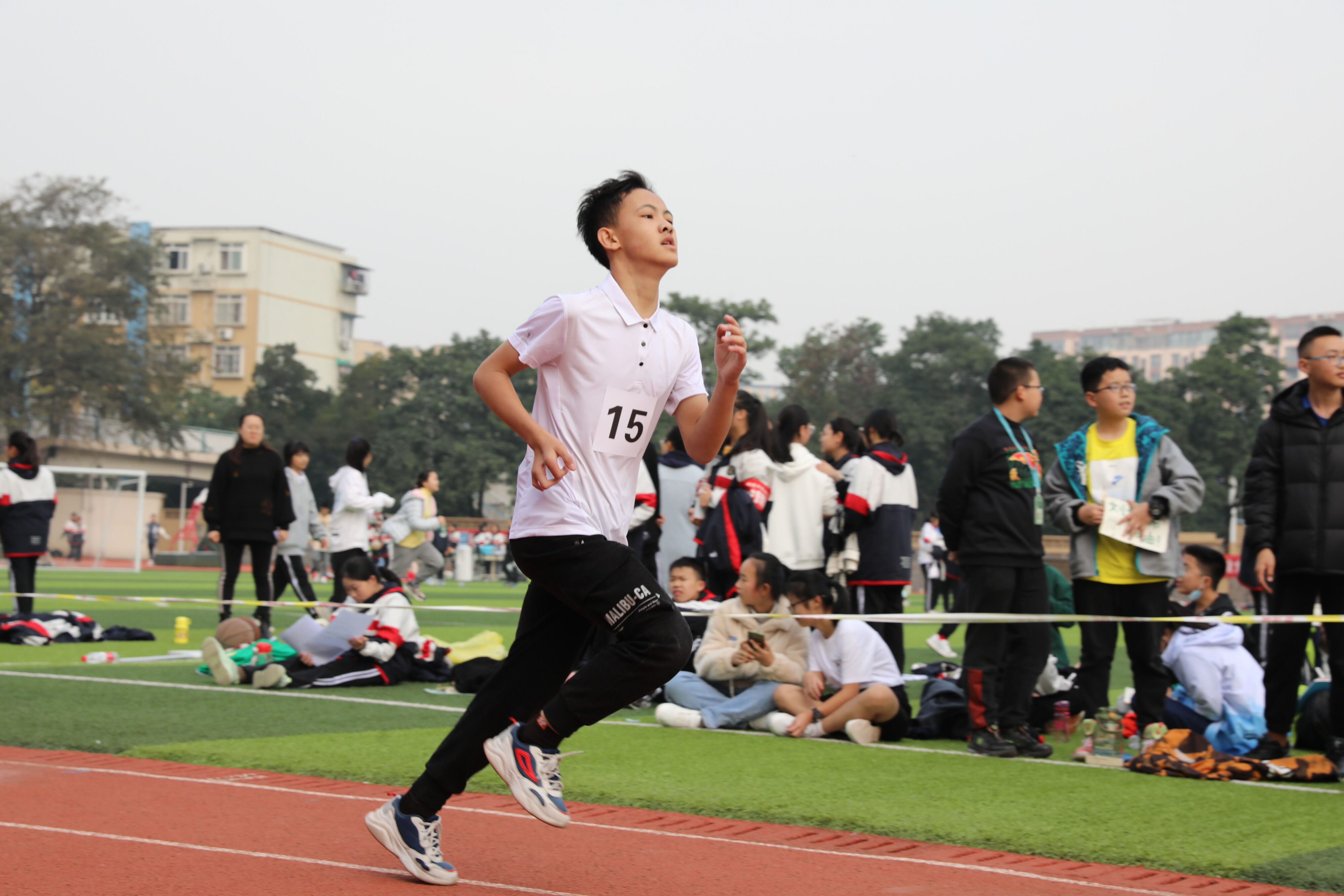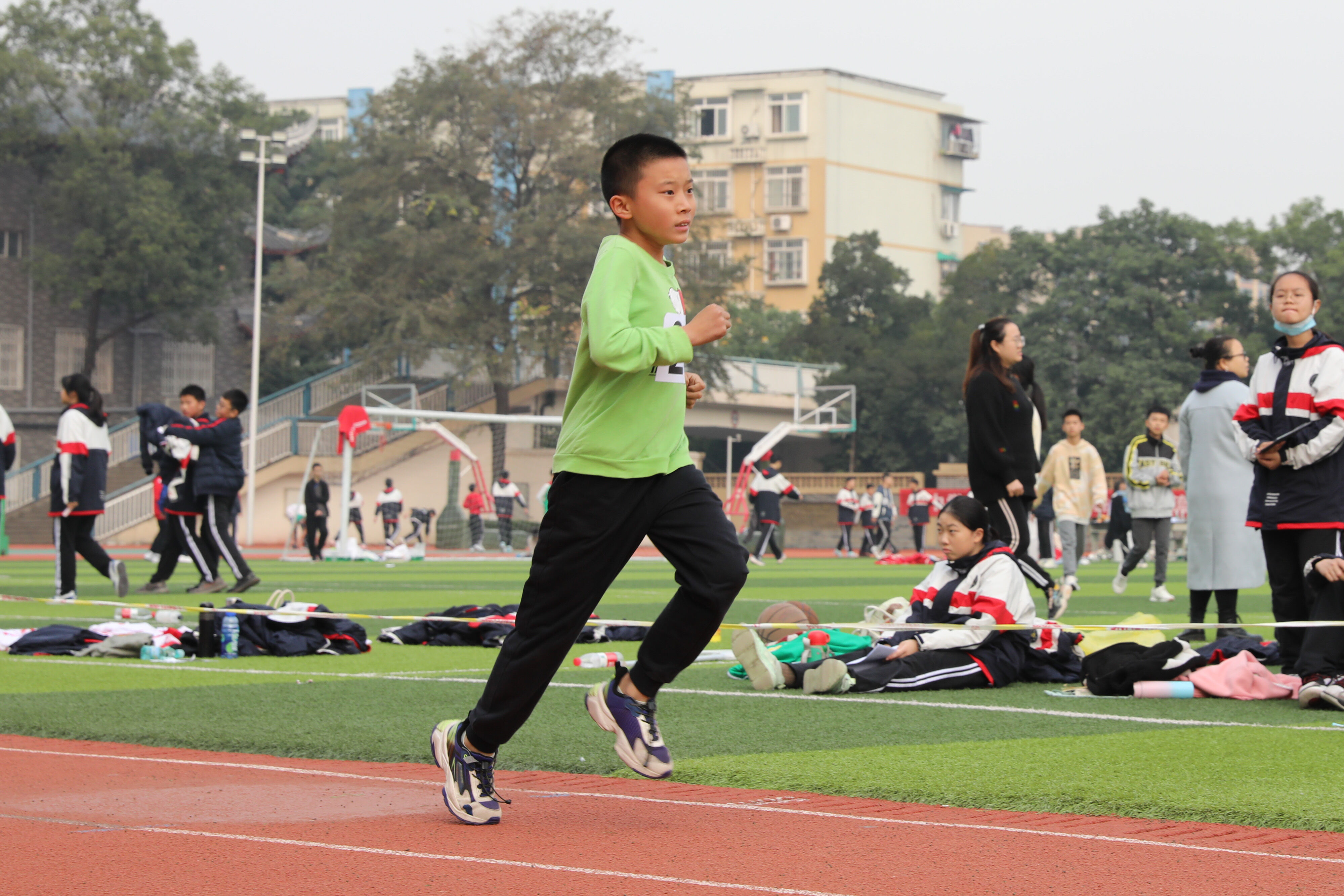 2022年11月24日上午11:00,在雙流中學體育文化藝術節(jié)上,七年級800米比賽在運動場舉行。圖為 七年級男子800米比賽運動員起跑瞬間