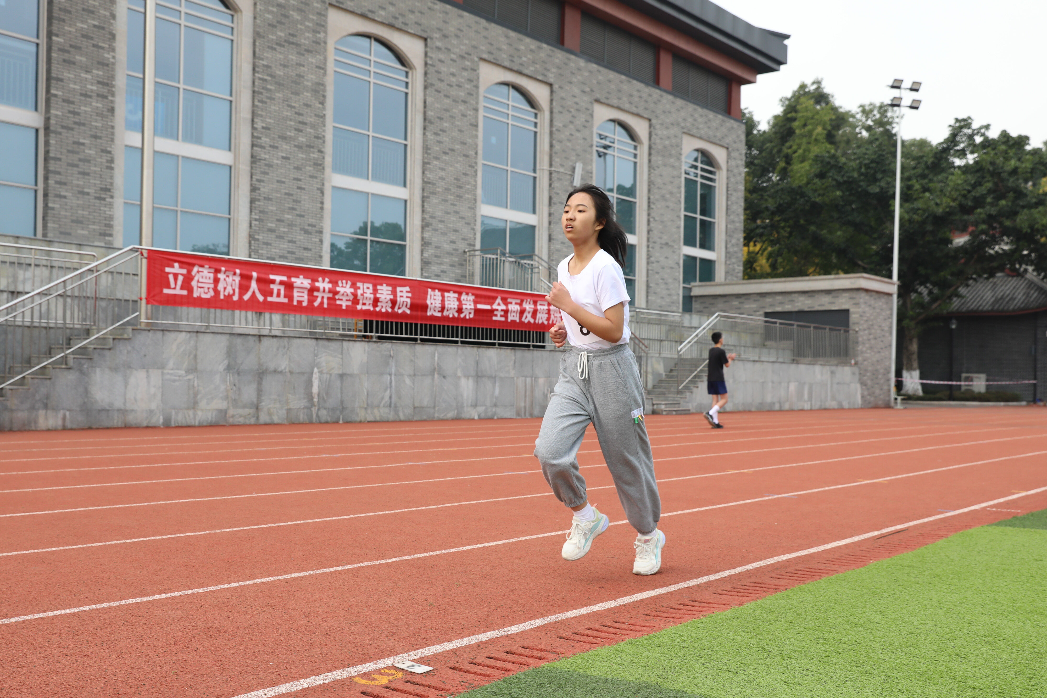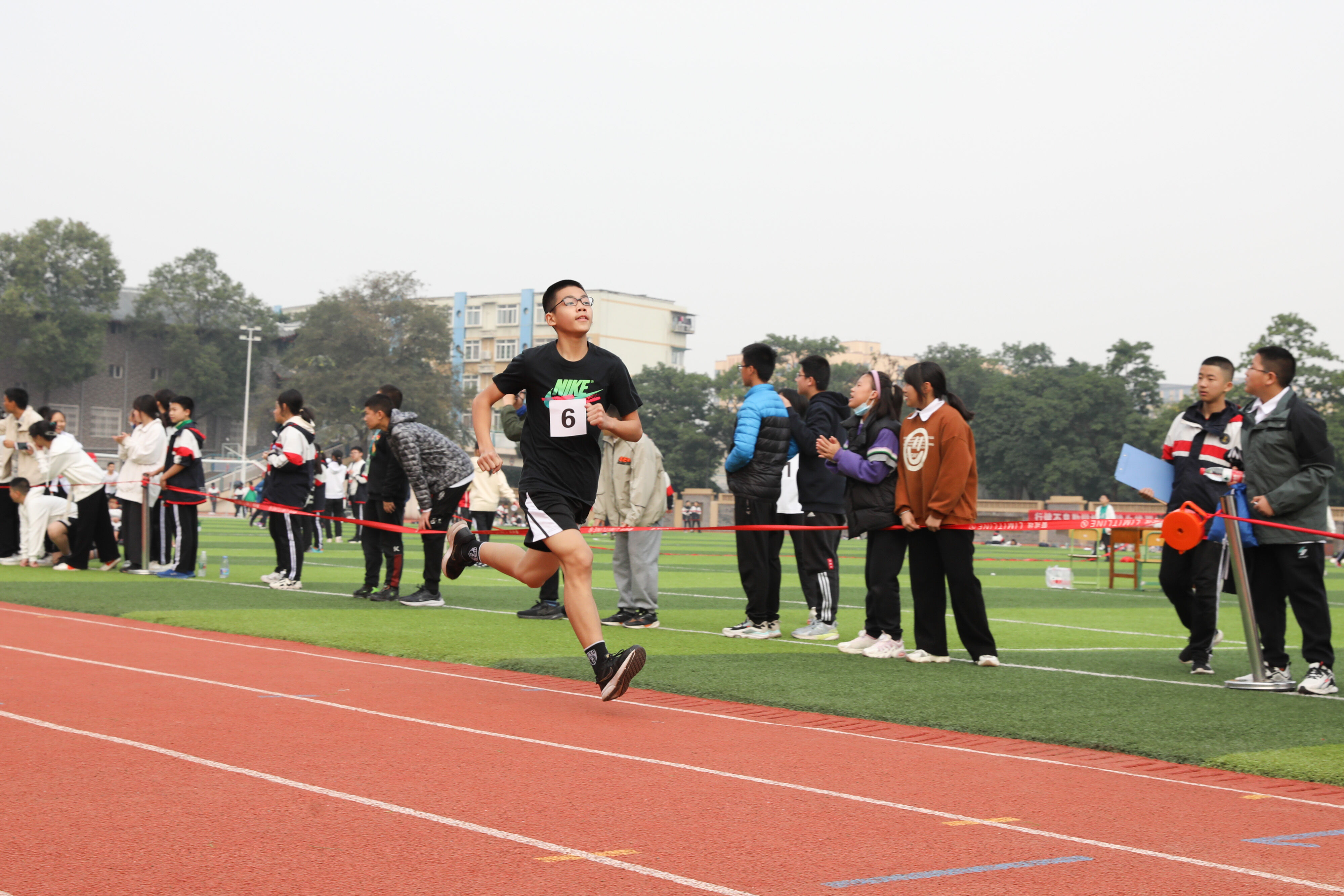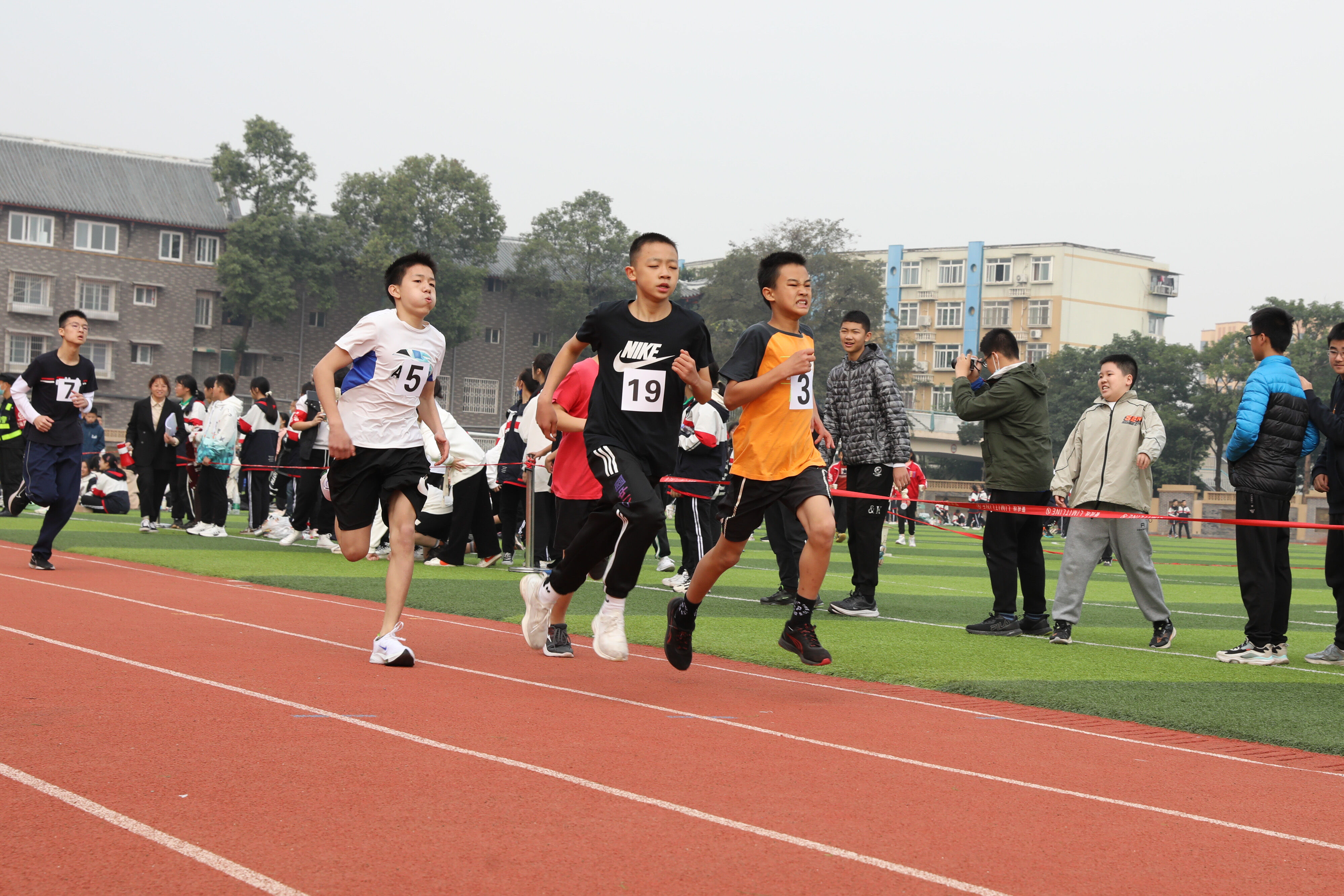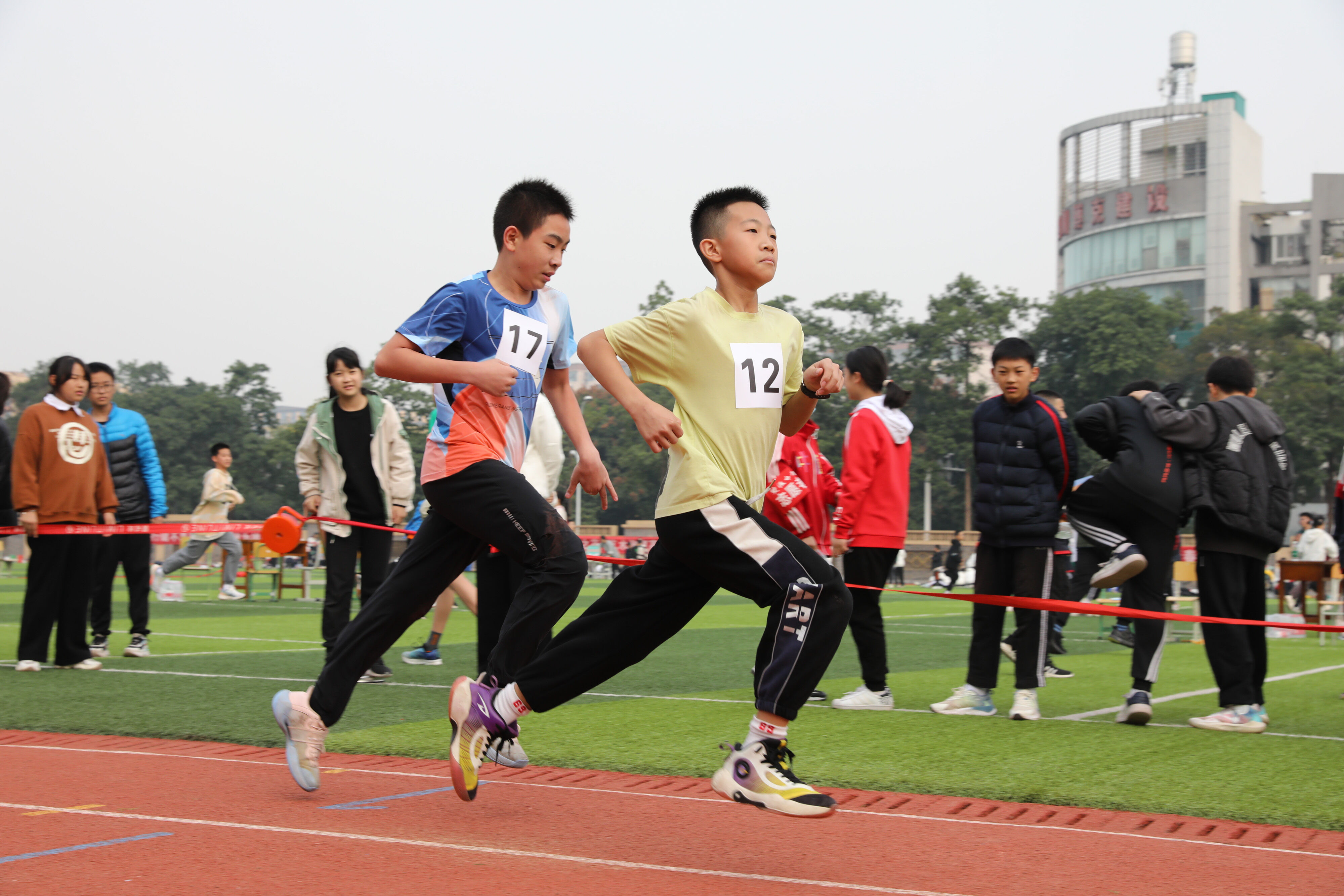 2022年11月24日上午11:00,在雙流中學體育文化藝術節(jié)上,七年級800米比賽在運動場舉行。圖為 七年級男子800米比賽運動員起跑瞬間