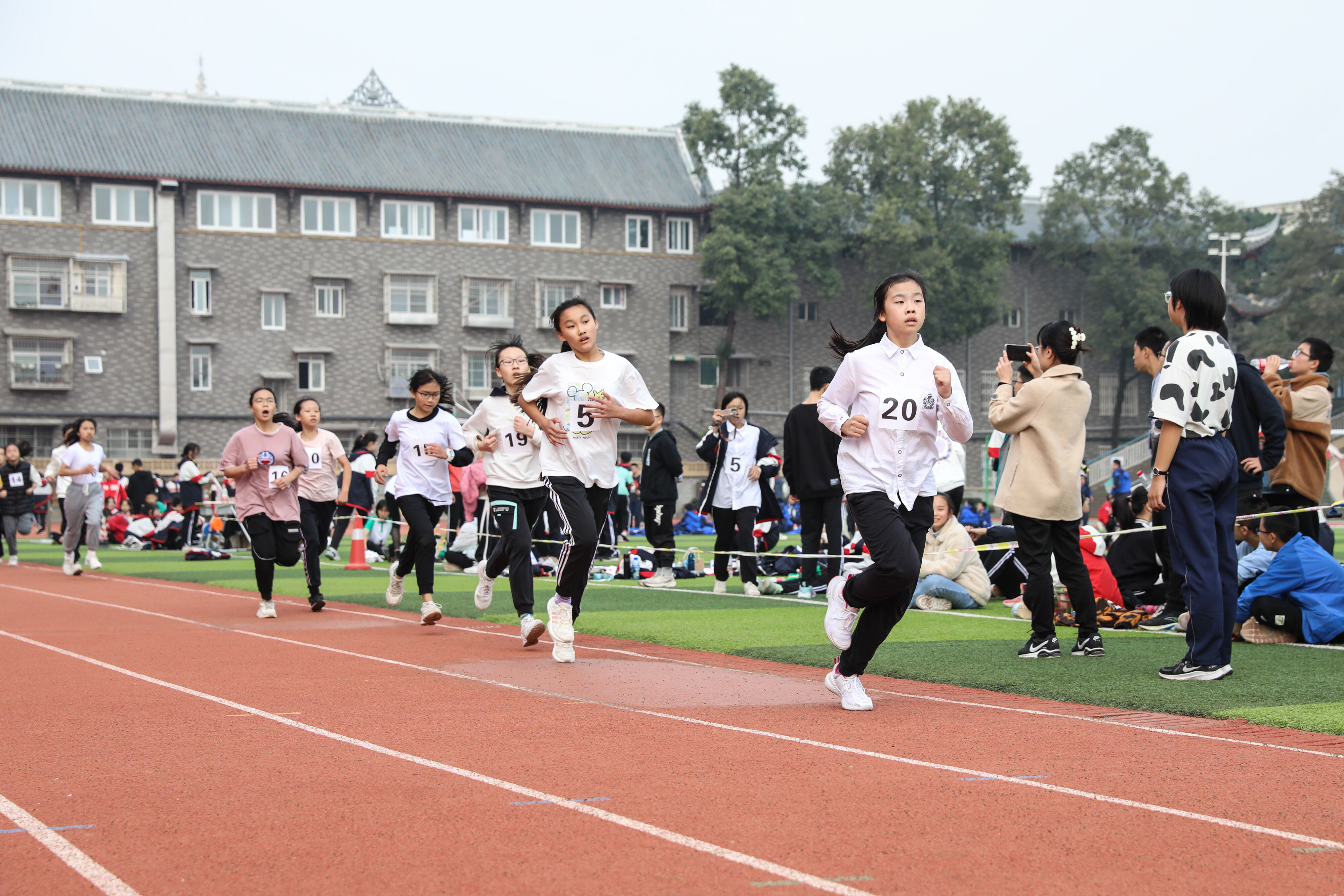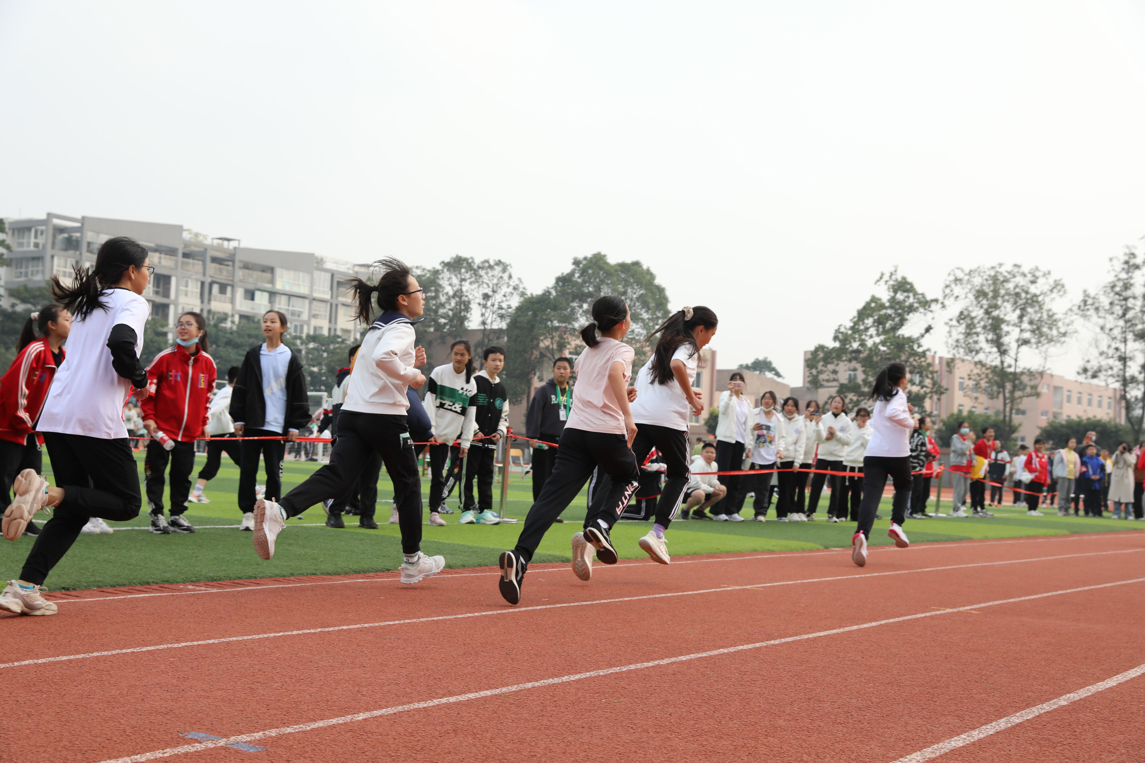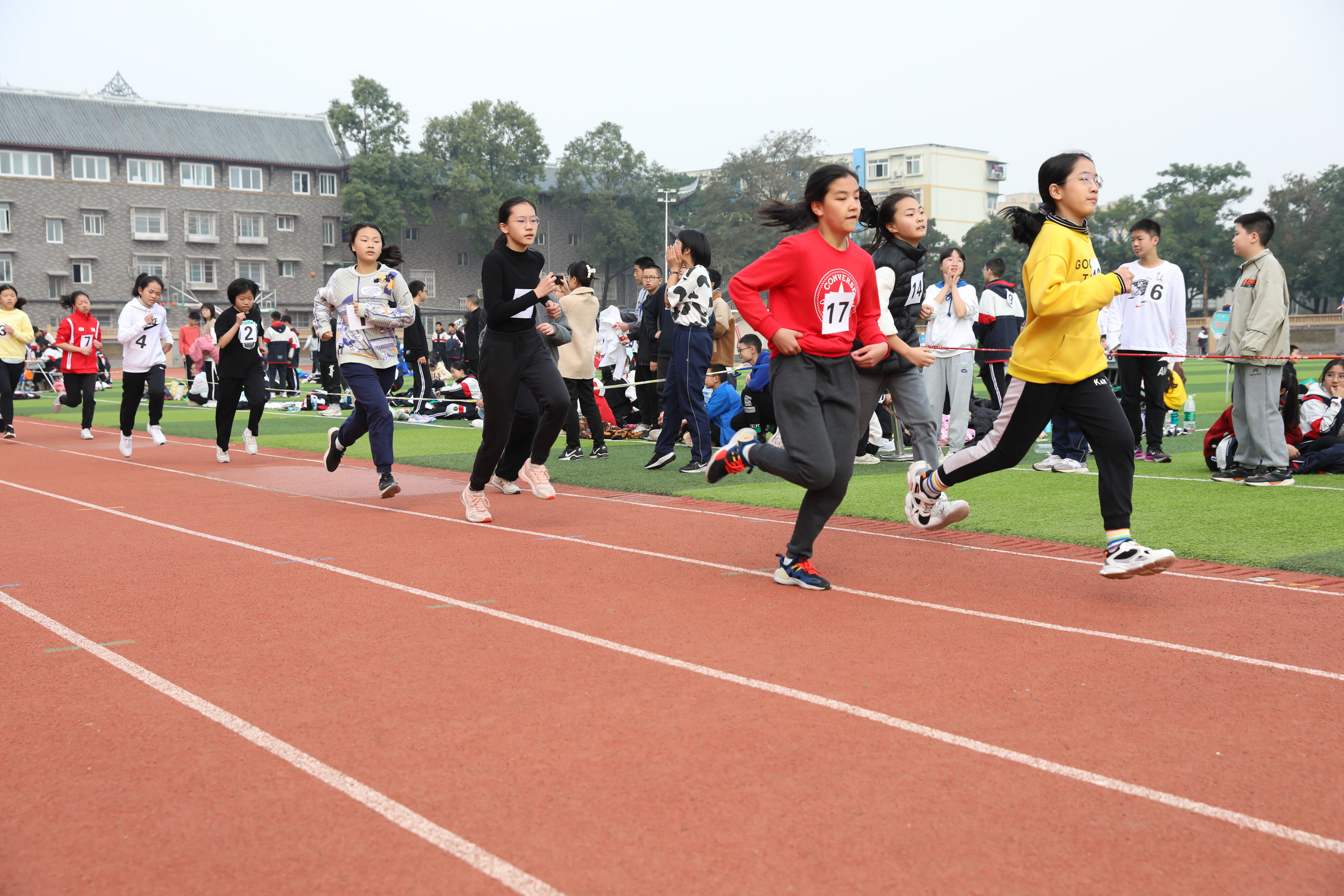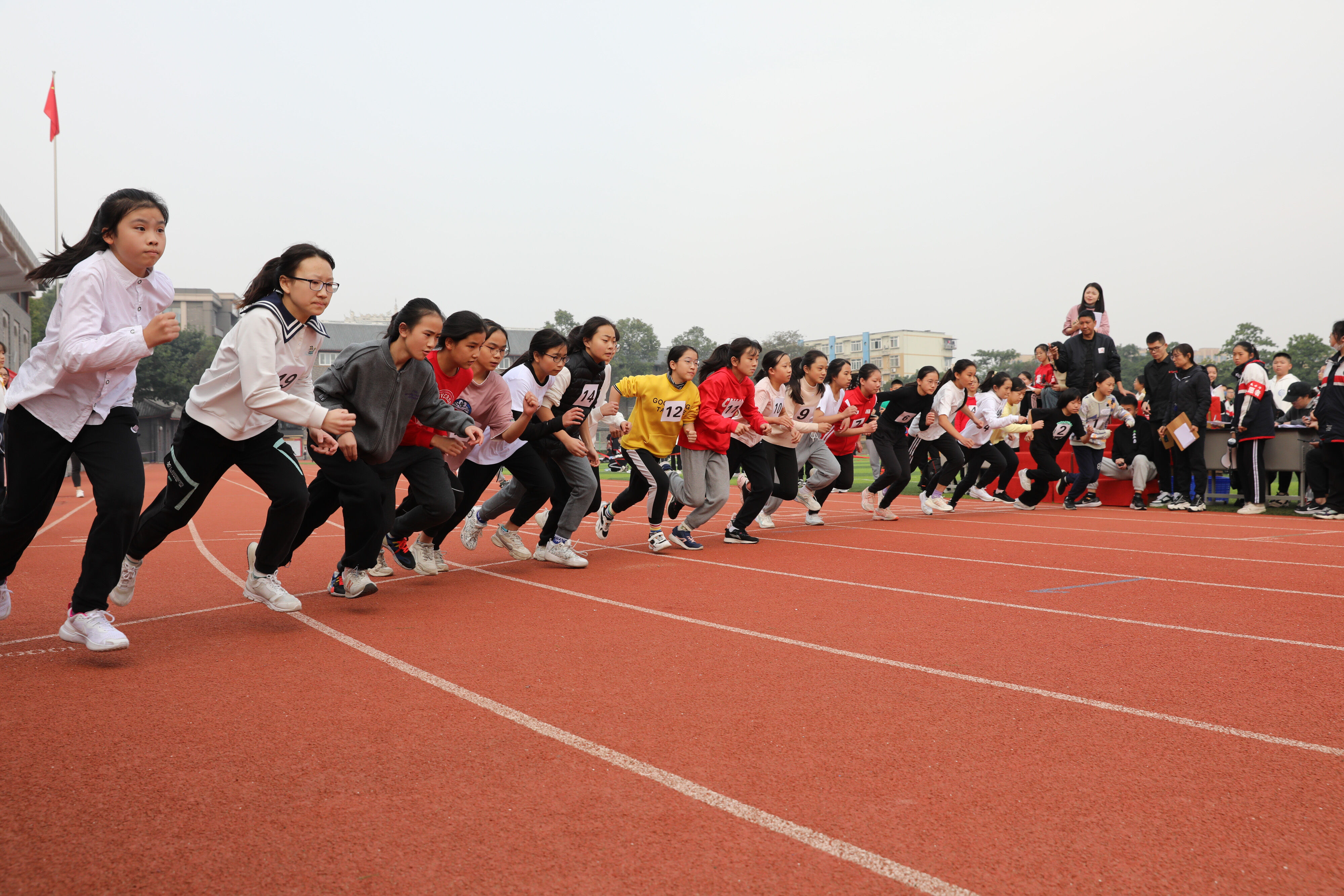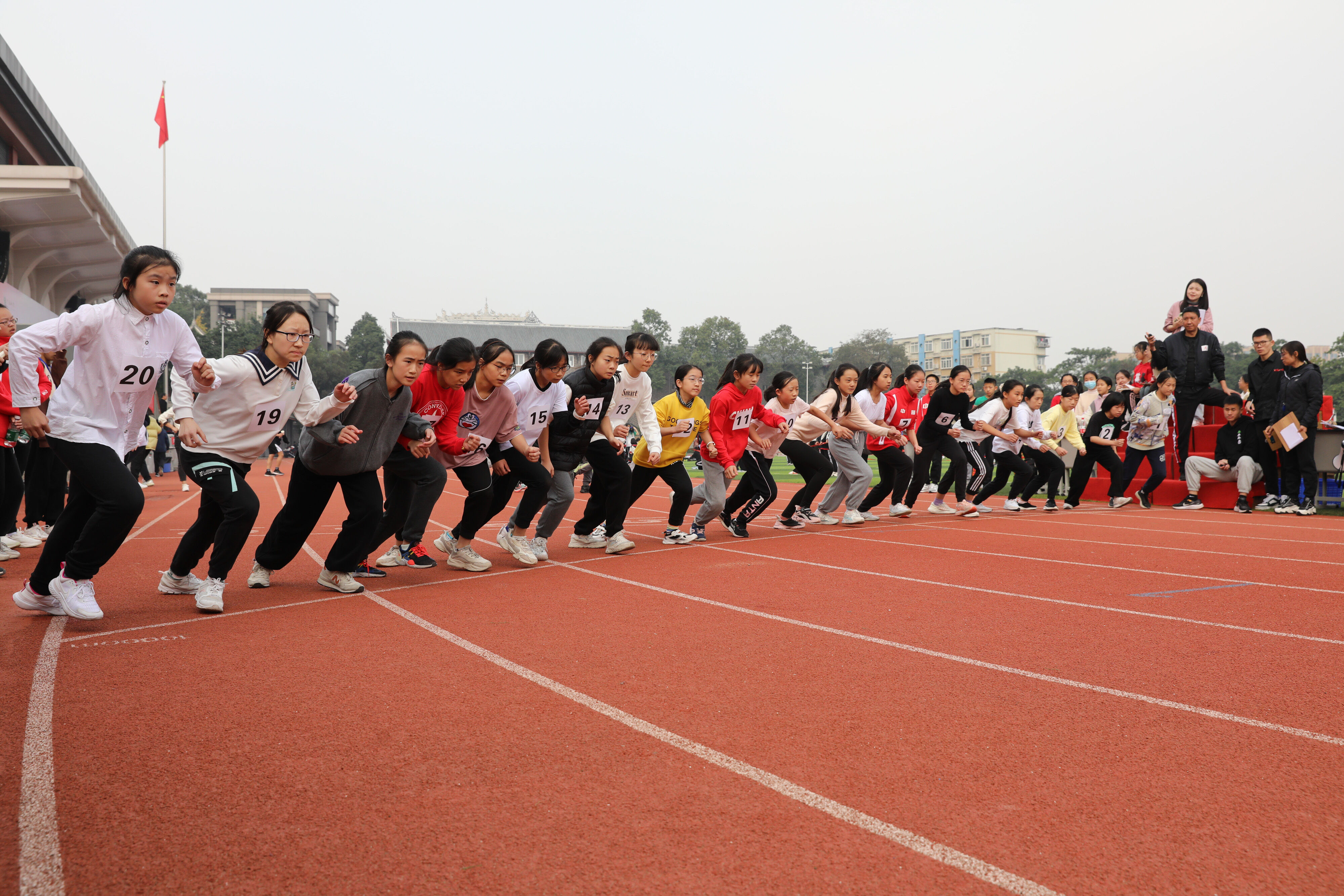 2022年11月24日上午11:00,在雙流中學體育文化藝術節(jié)上,七年級800米比賽在運動場舉行。圖為 七年級女子800米比賽運動員起跑瞬間