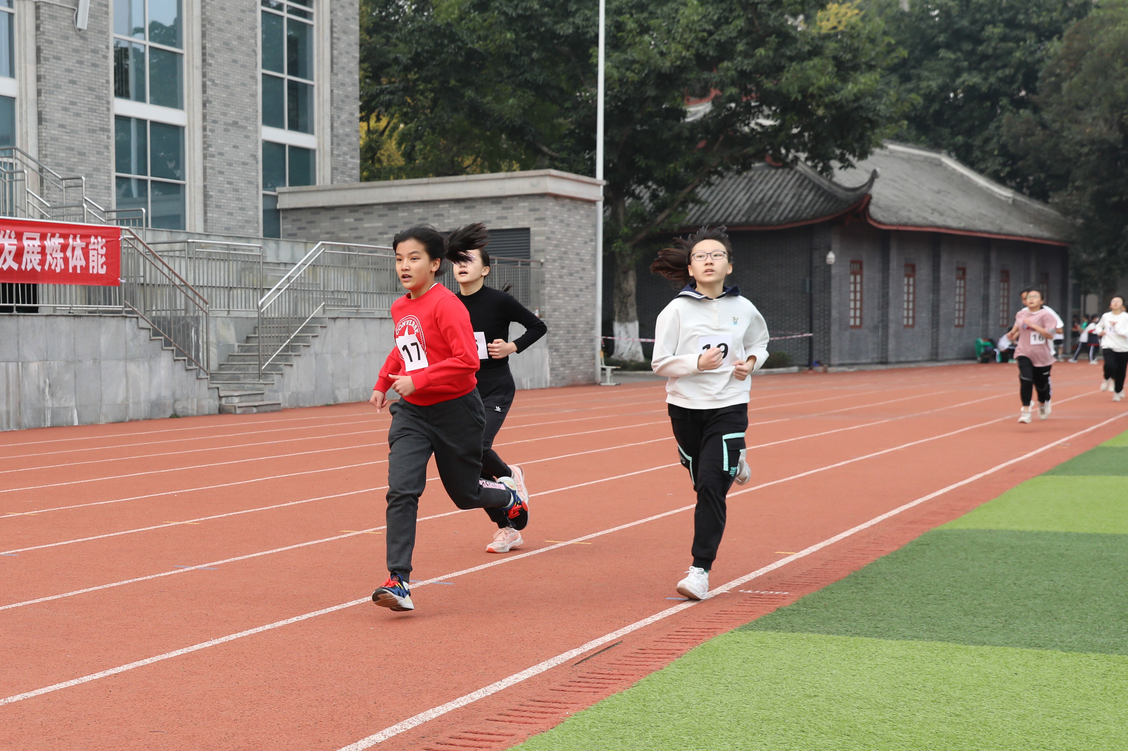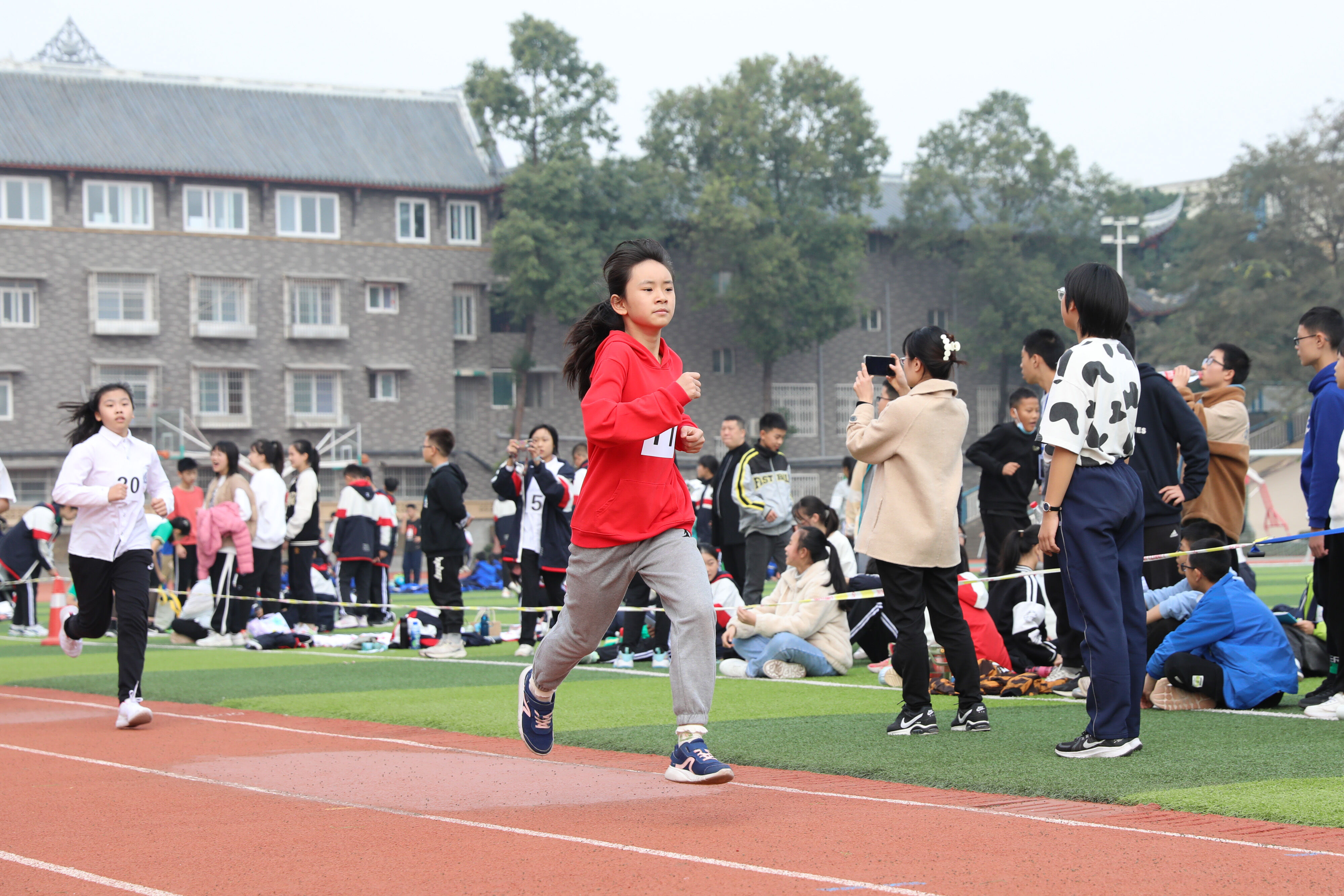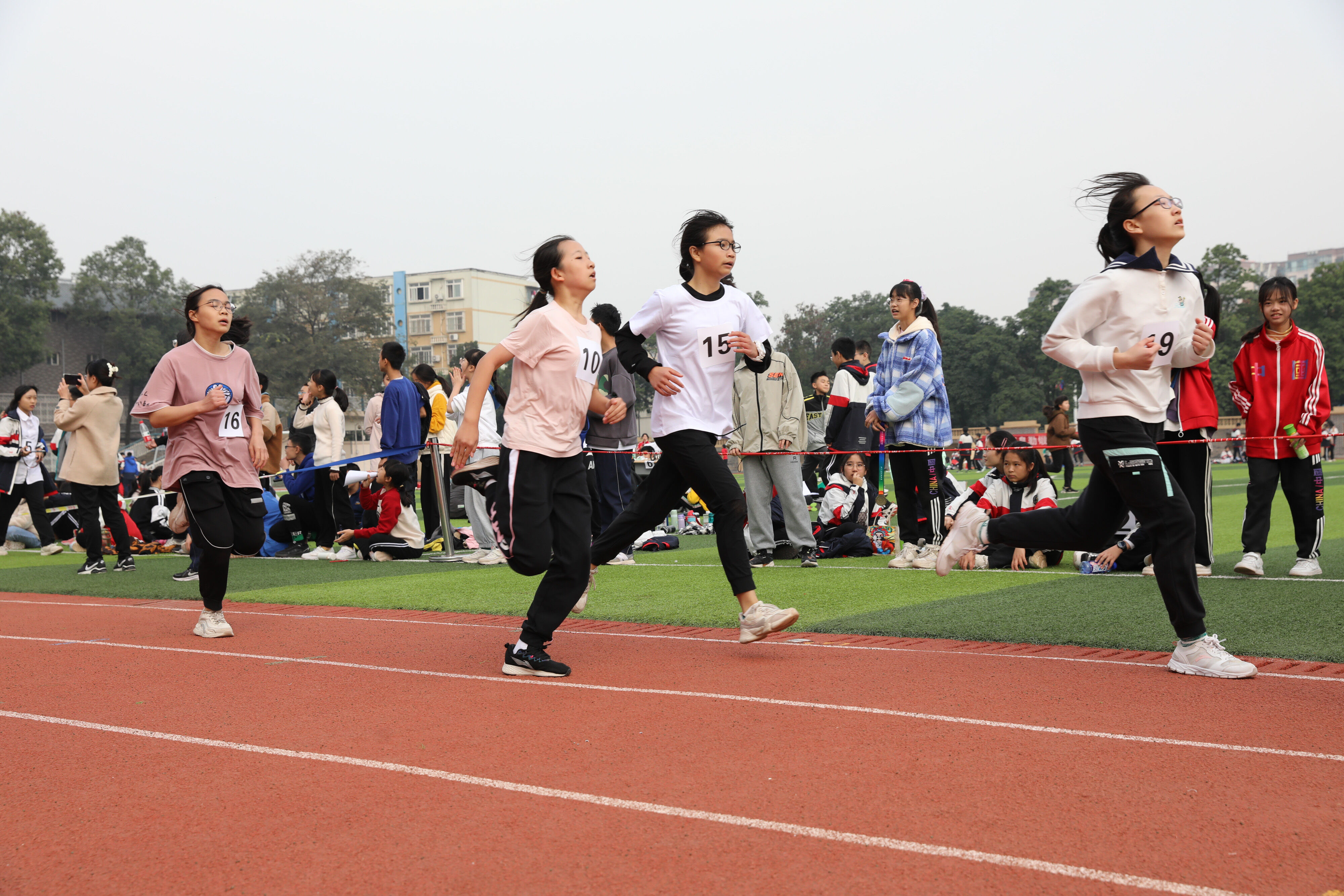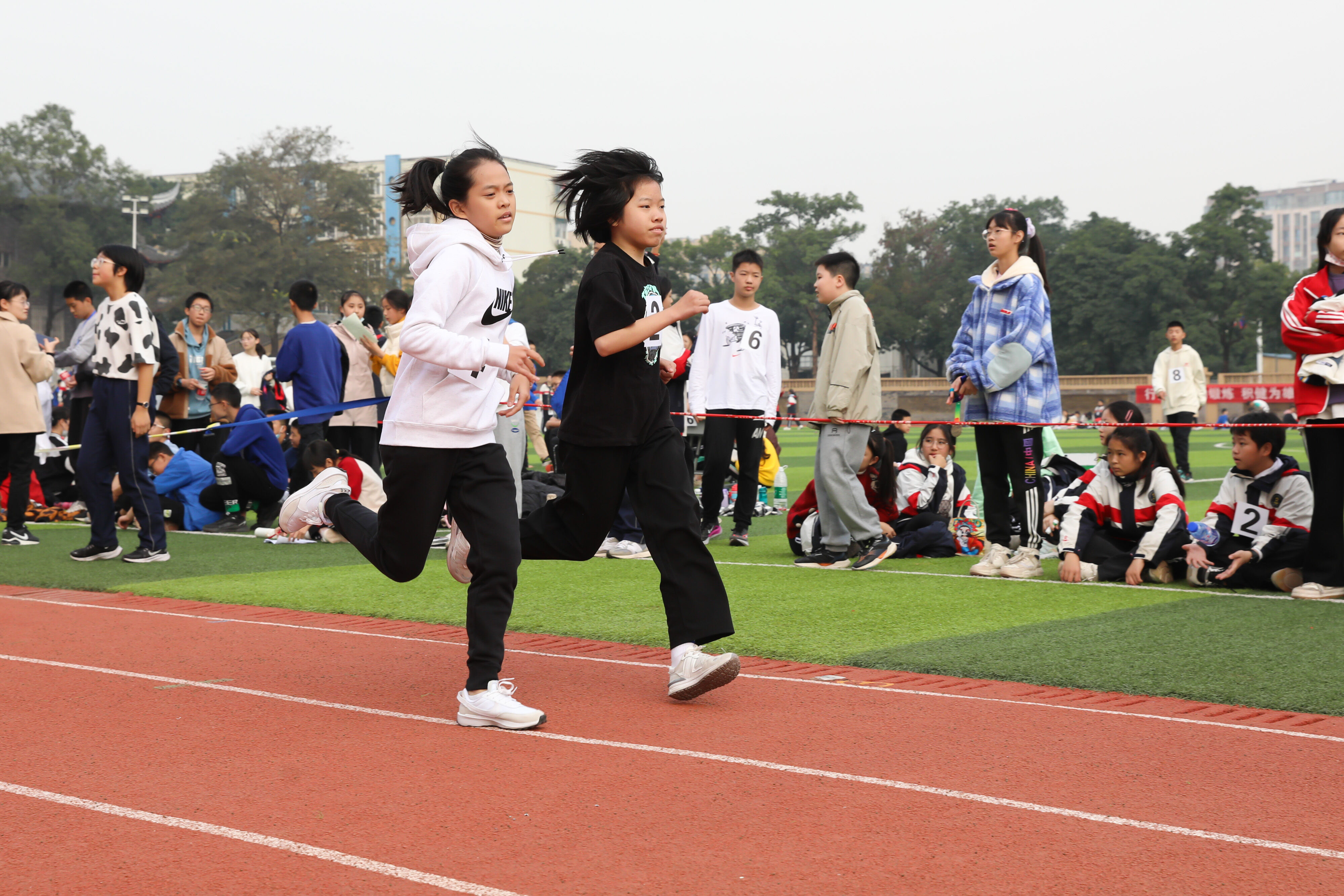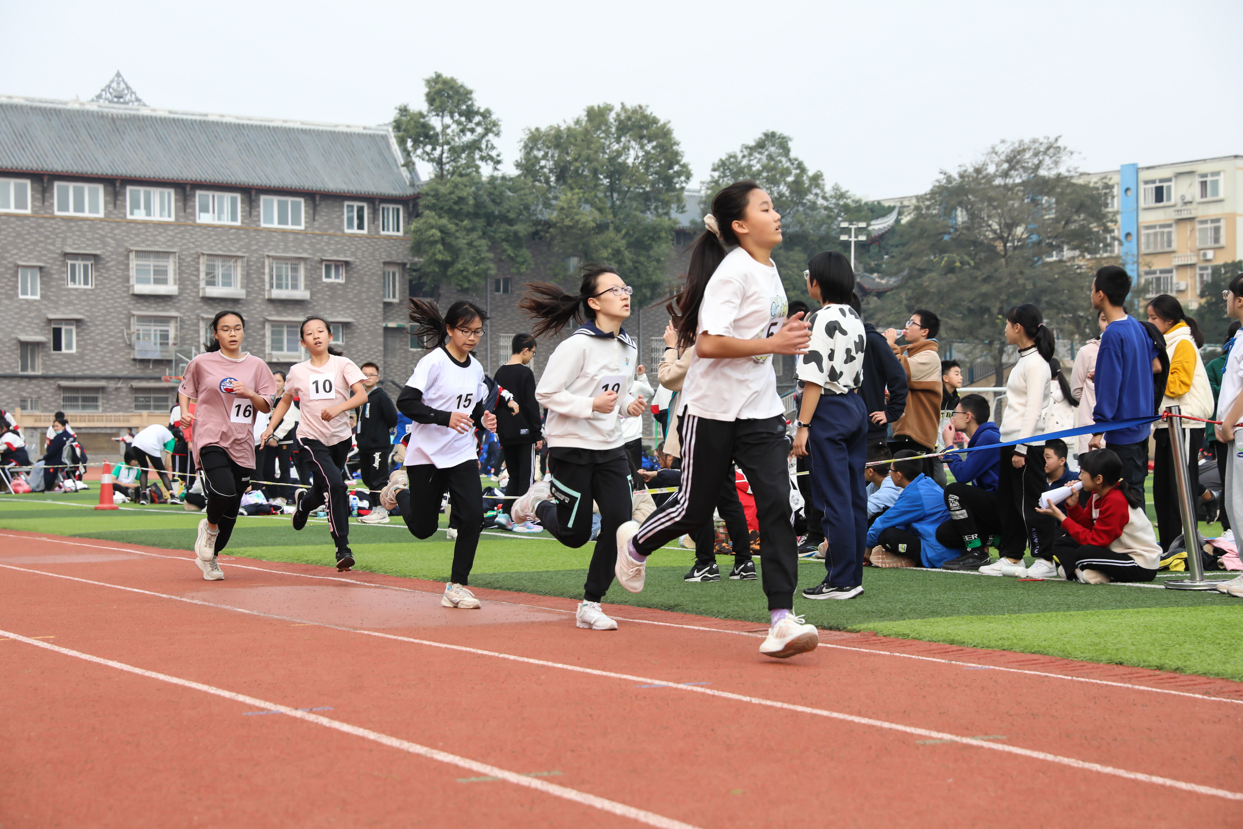 2022年11月24日上午11:00,在雙流中學體育文化藝術節(jié)上,七年級800米比賽在運動場舉行。圖為 七年級女子800米比賽運動員起跑瞬間