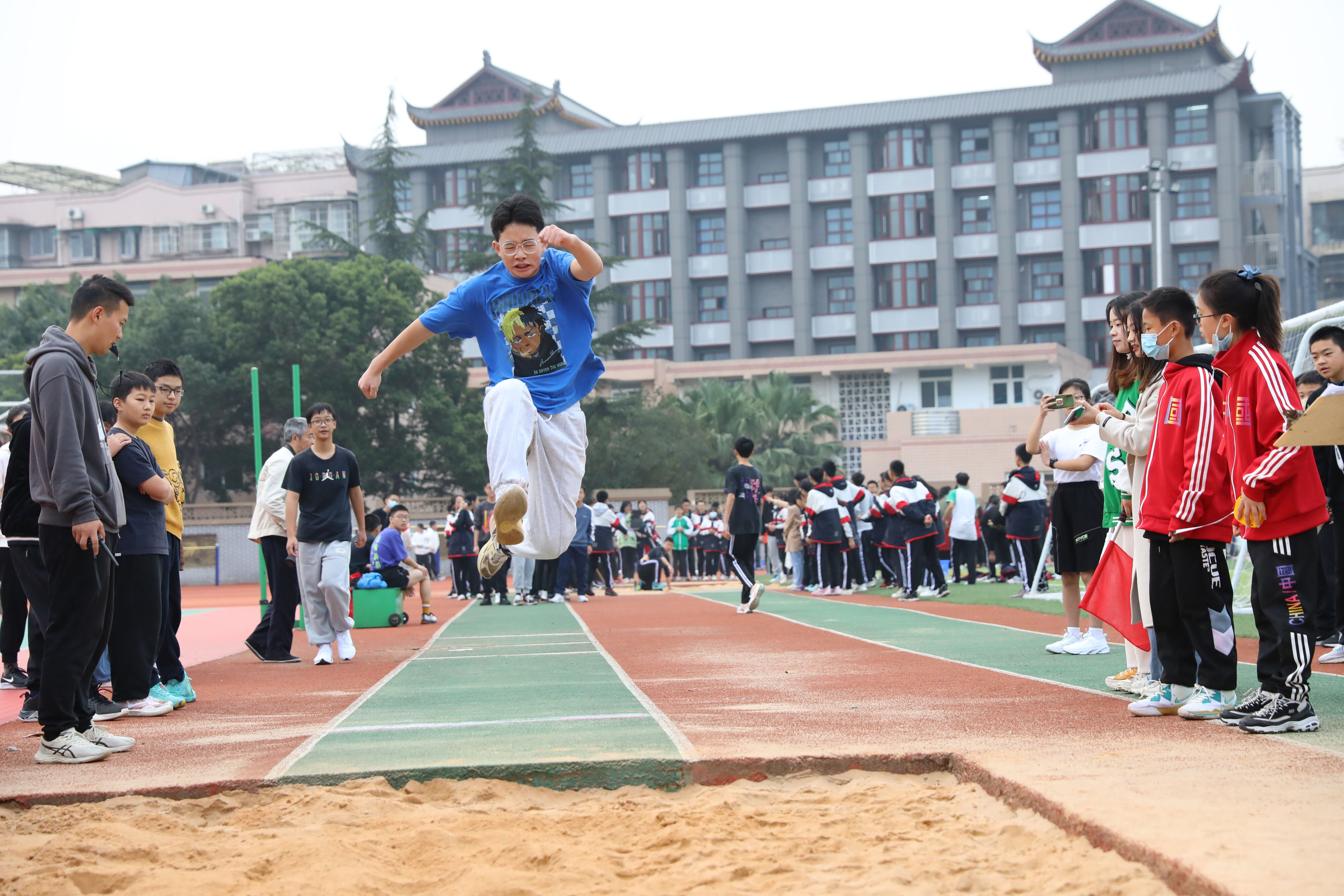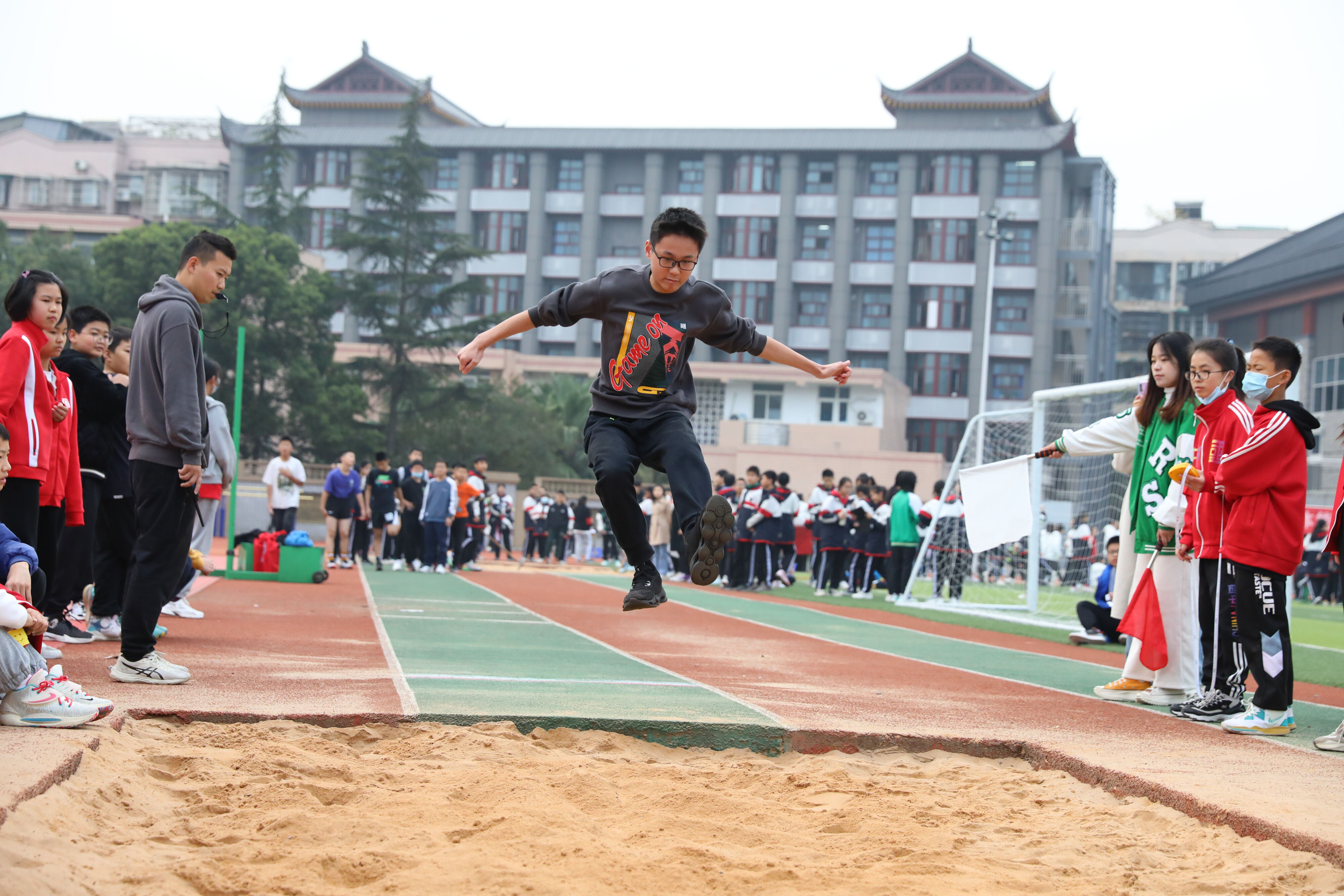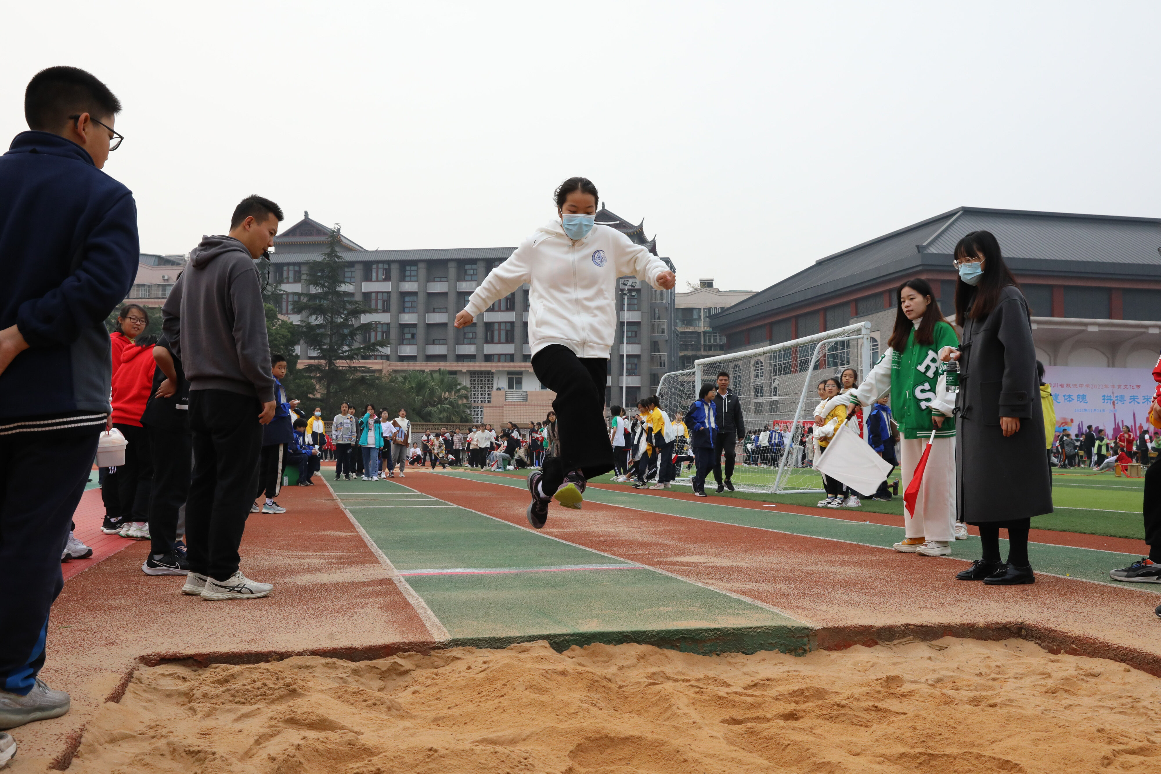 2022年11月24日上午,在雙流中學(xué)體育文化藝術(shù)節(jié)上,舉行了七年級(jí)跳遠(yuǎn)比賽,同學(xué)們踴躍參與。