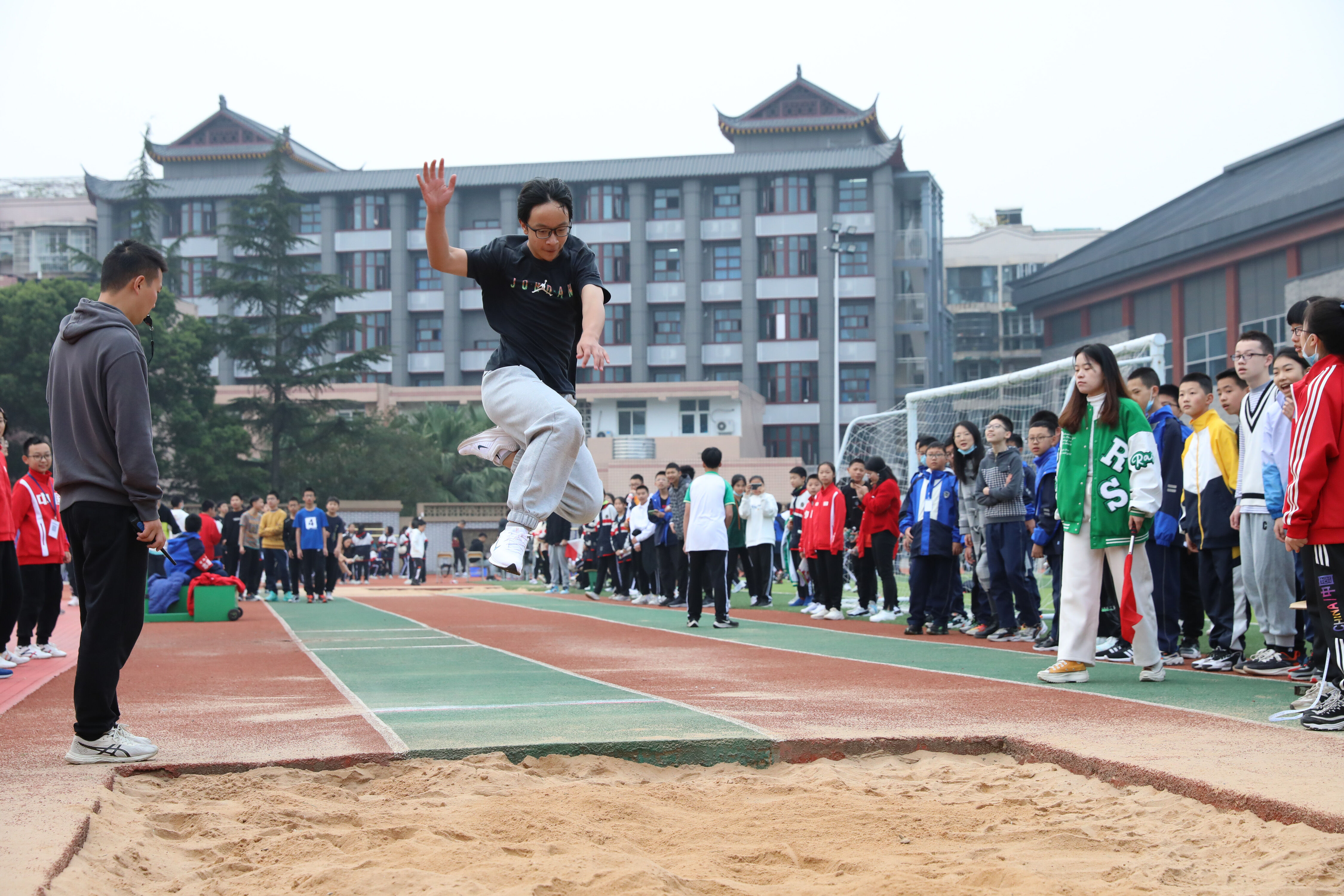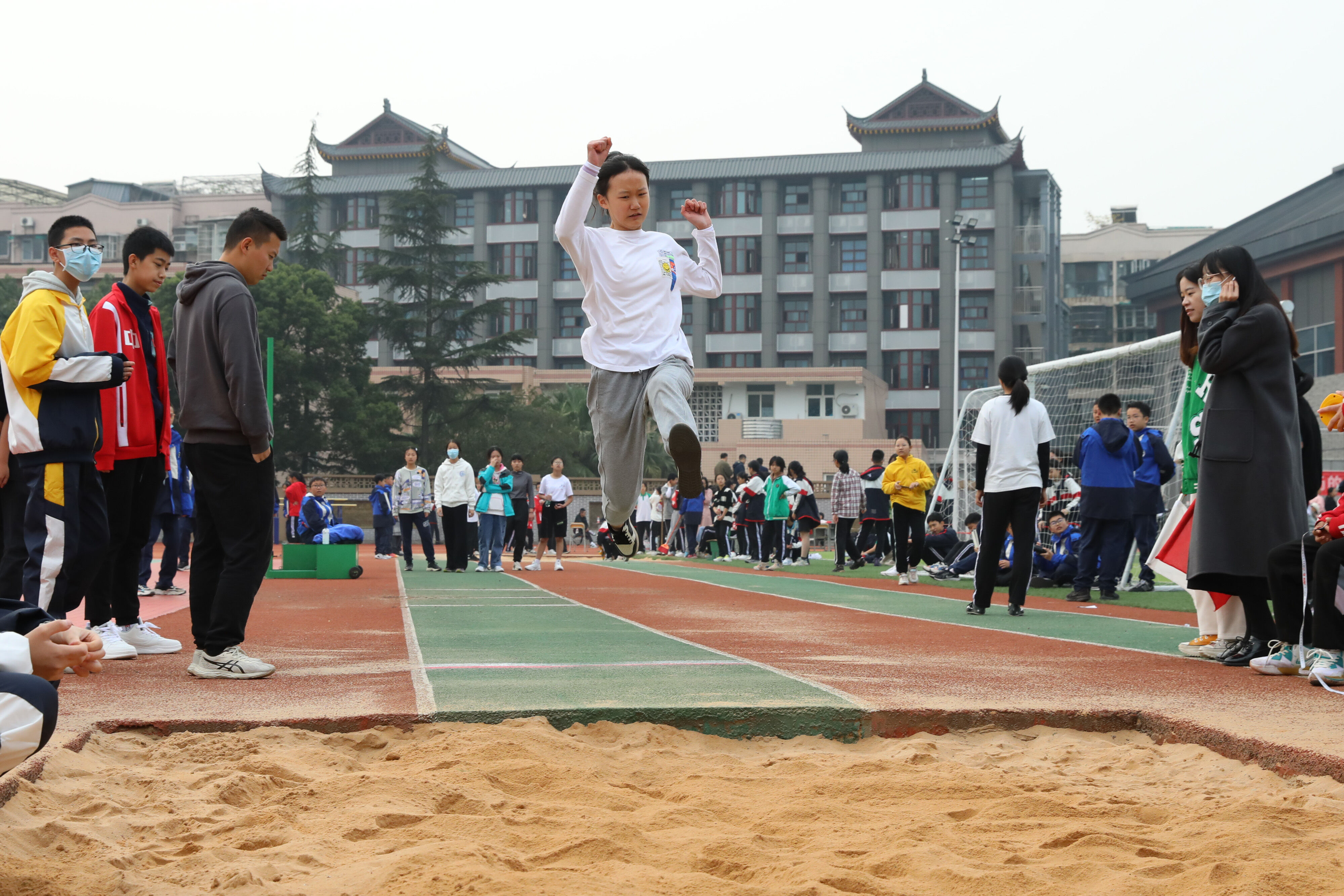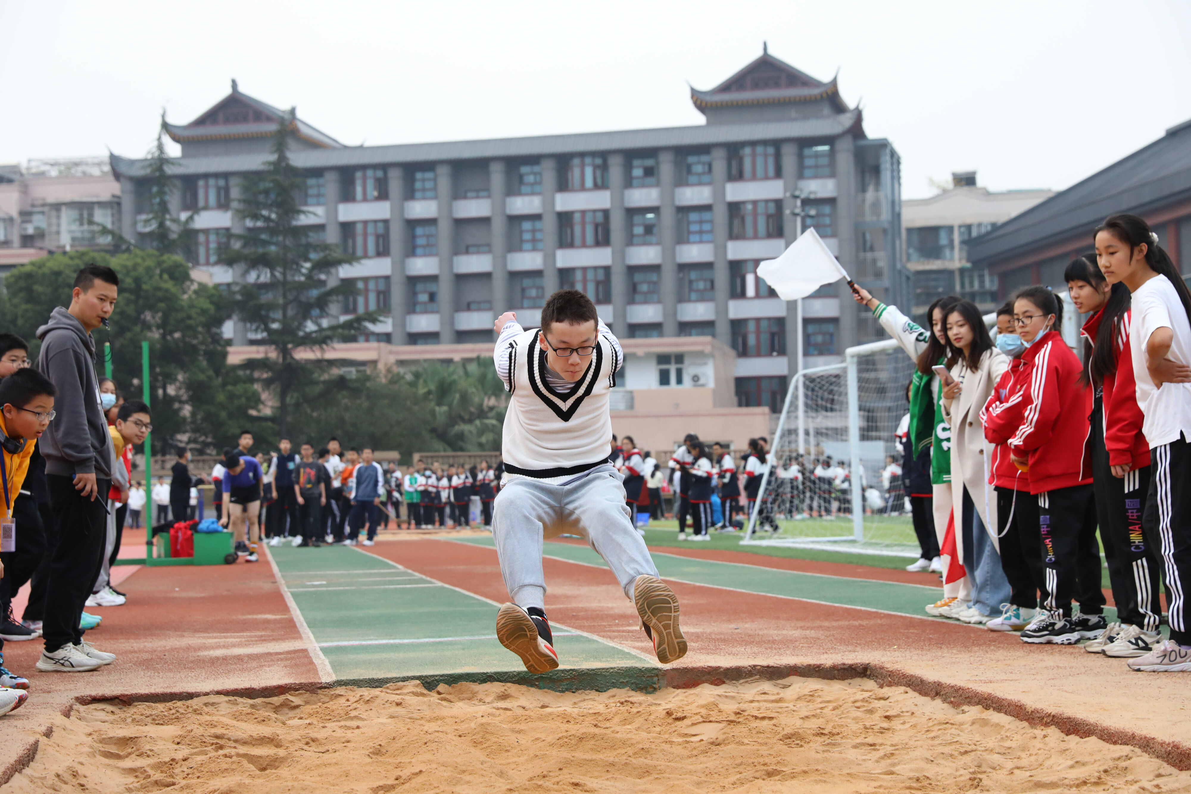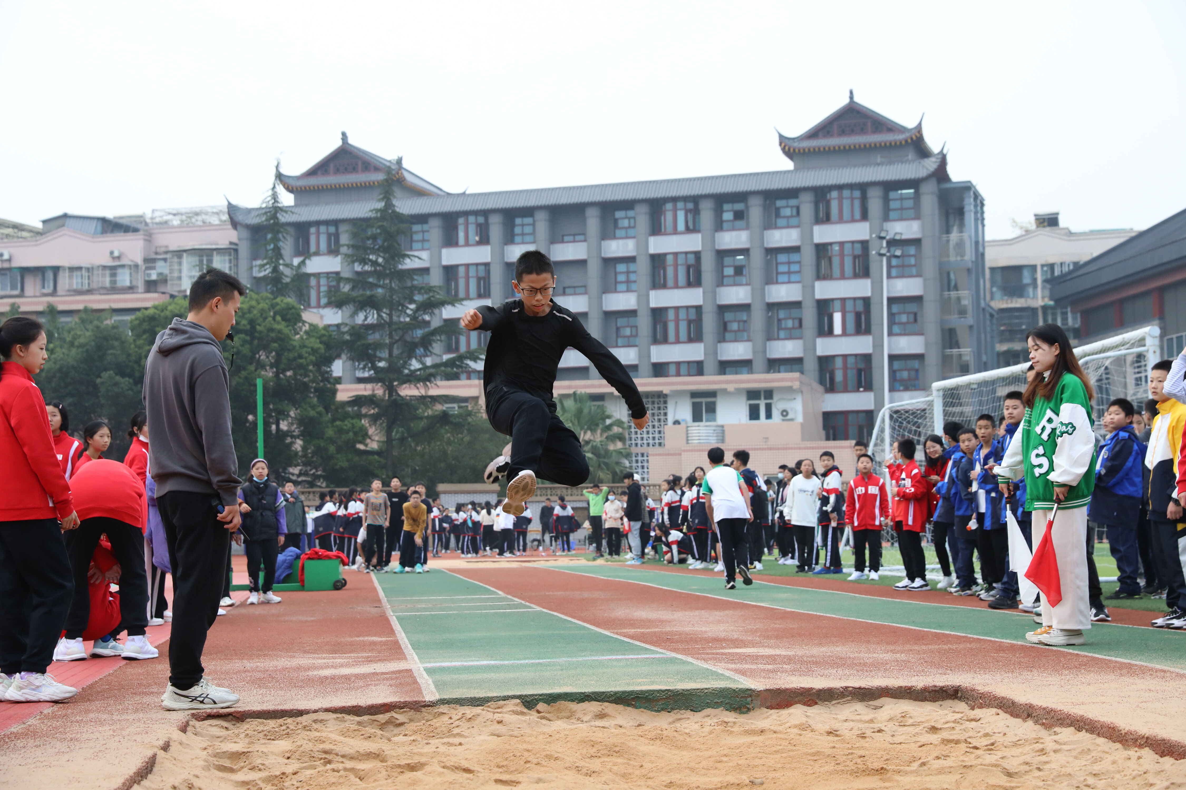 2022年11月24日上午,在雙流中學(xué)體育文化藝術(shù)節(jié)上,舉行了七年級(jí)跳遠(yuǎn)比賽,同學(xué)們踴躍參與。