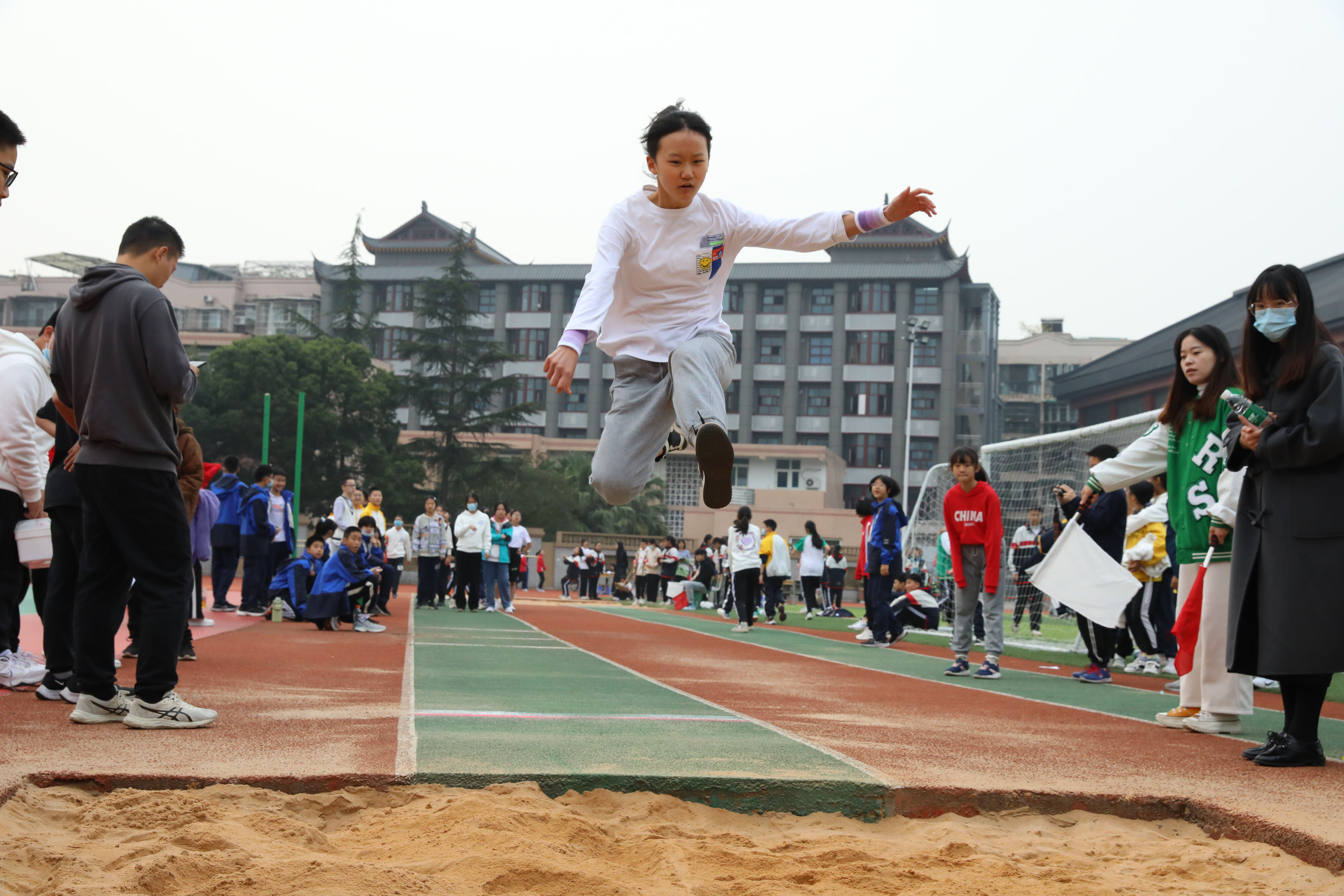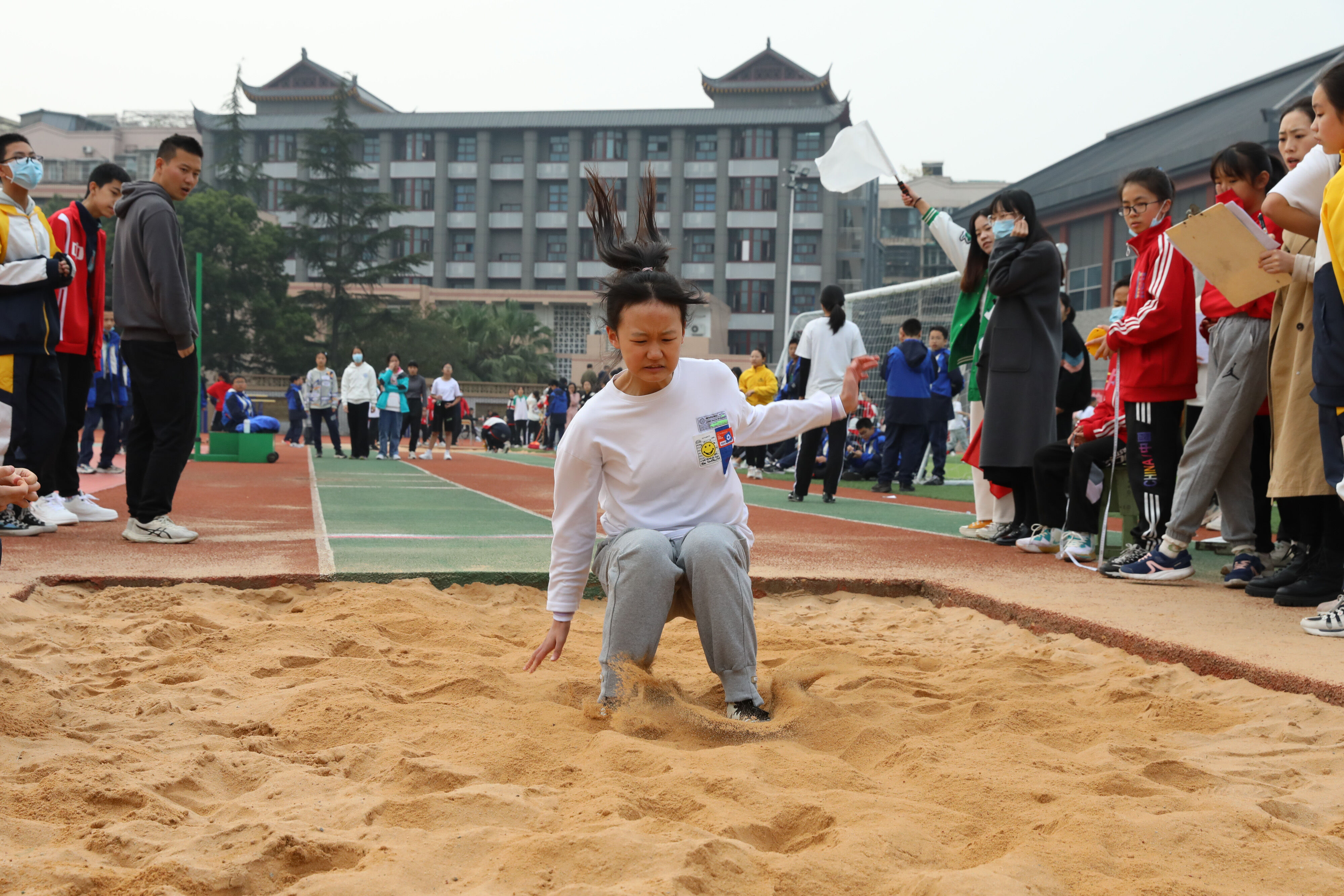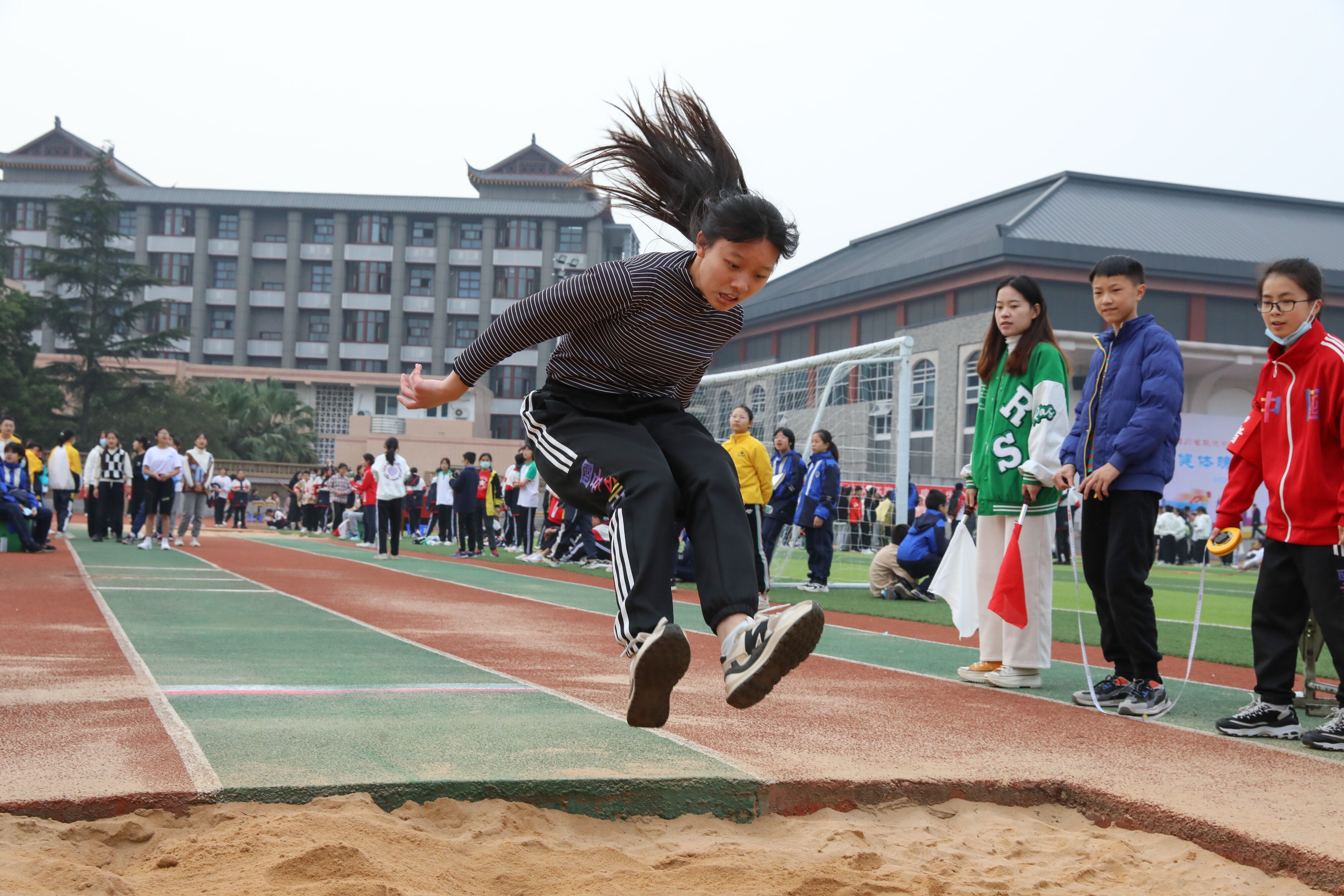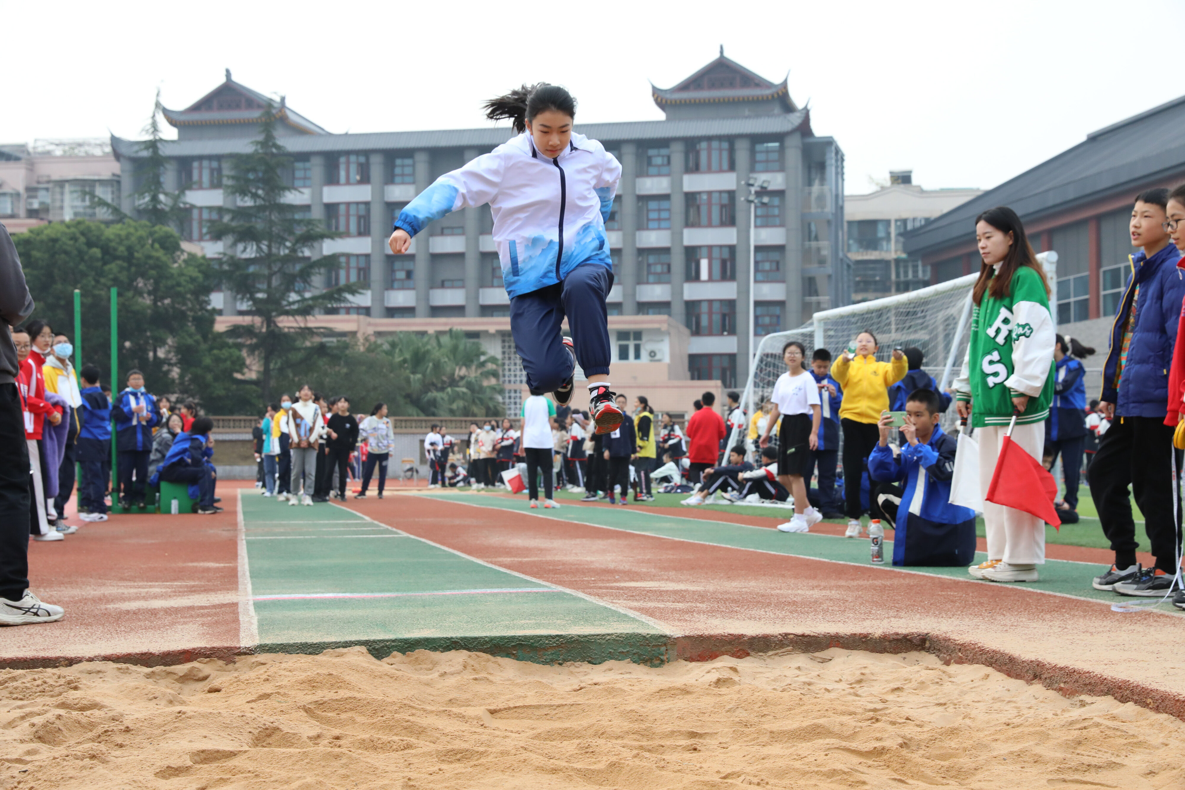 七年級(jí)跳遠(yuǎn)比賽,裁判員老師記錄選手參賽成績(jī)