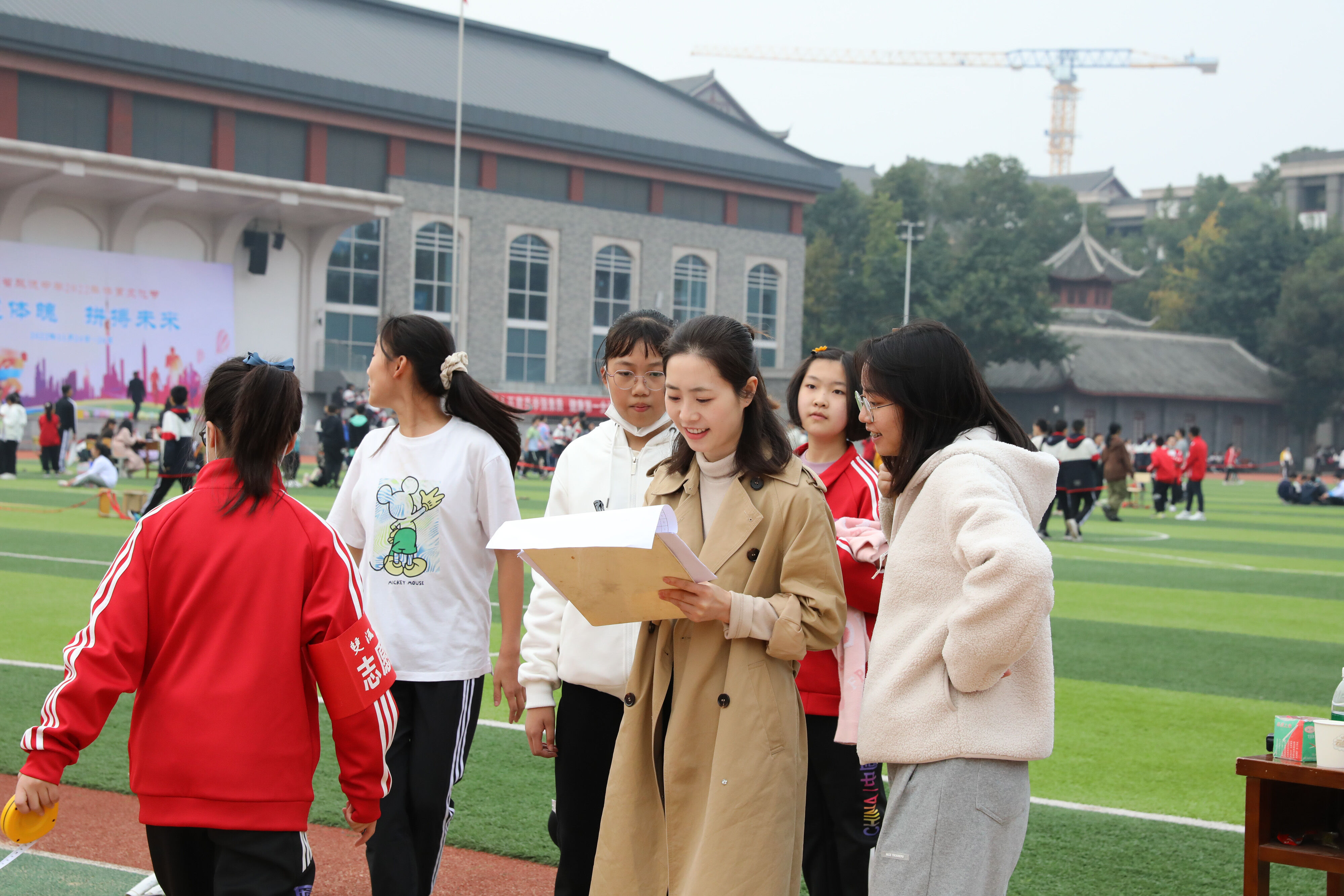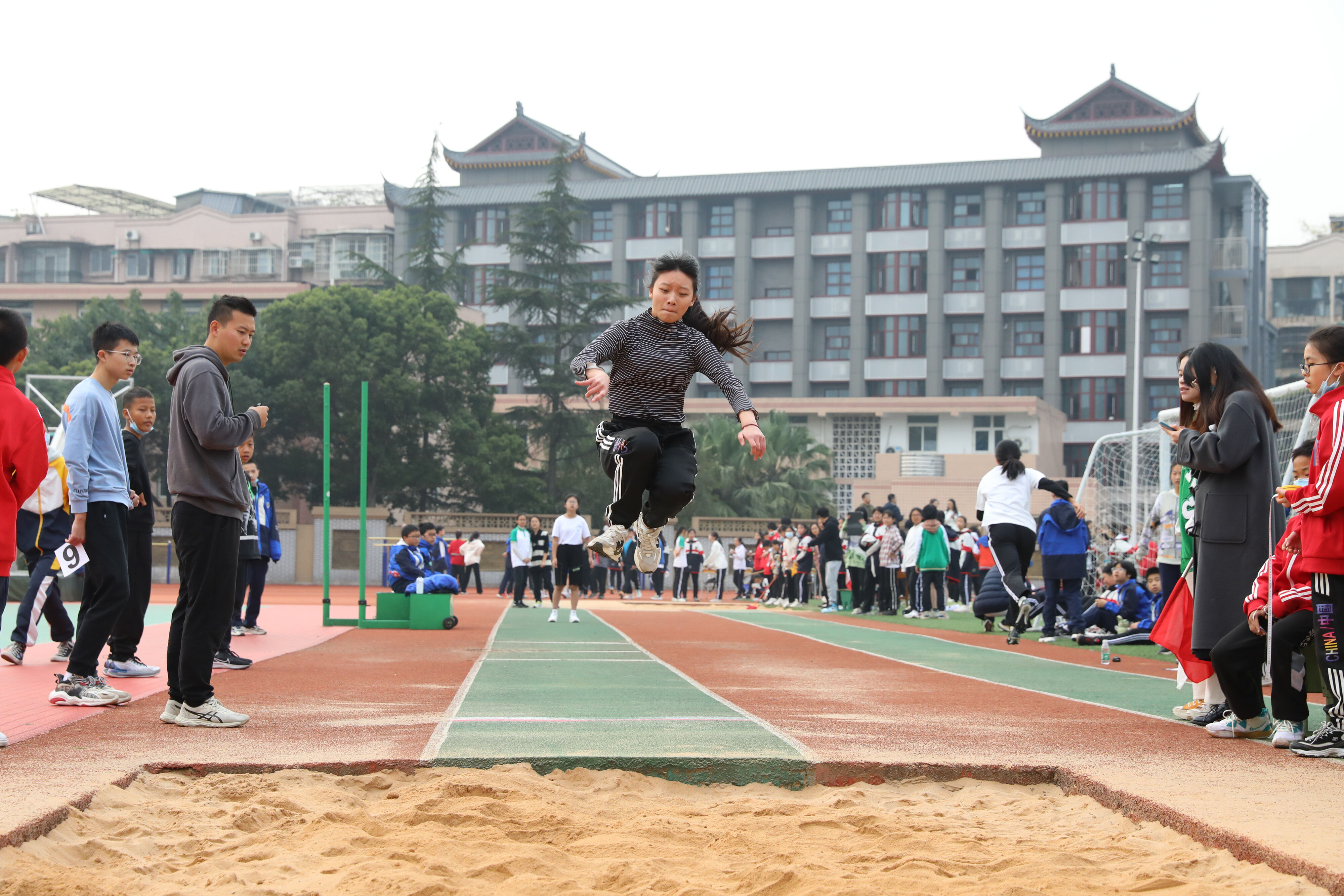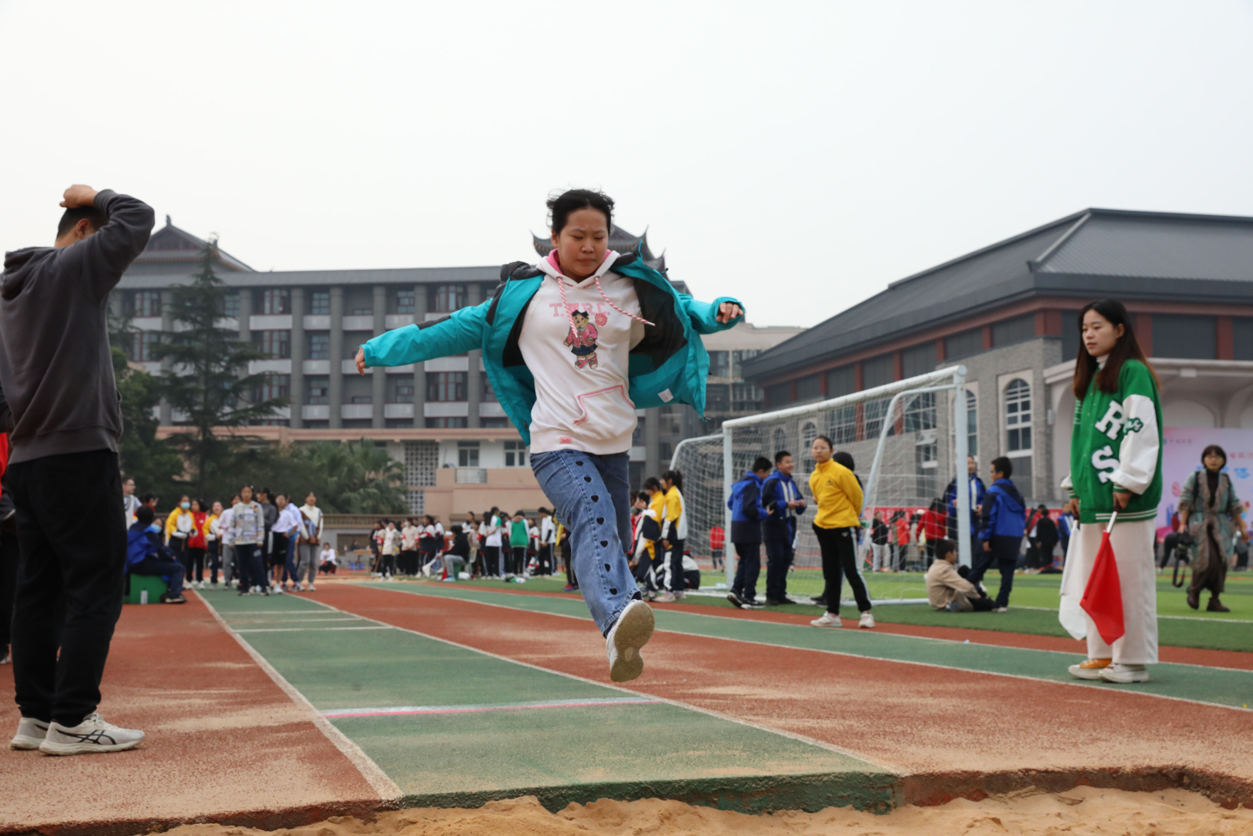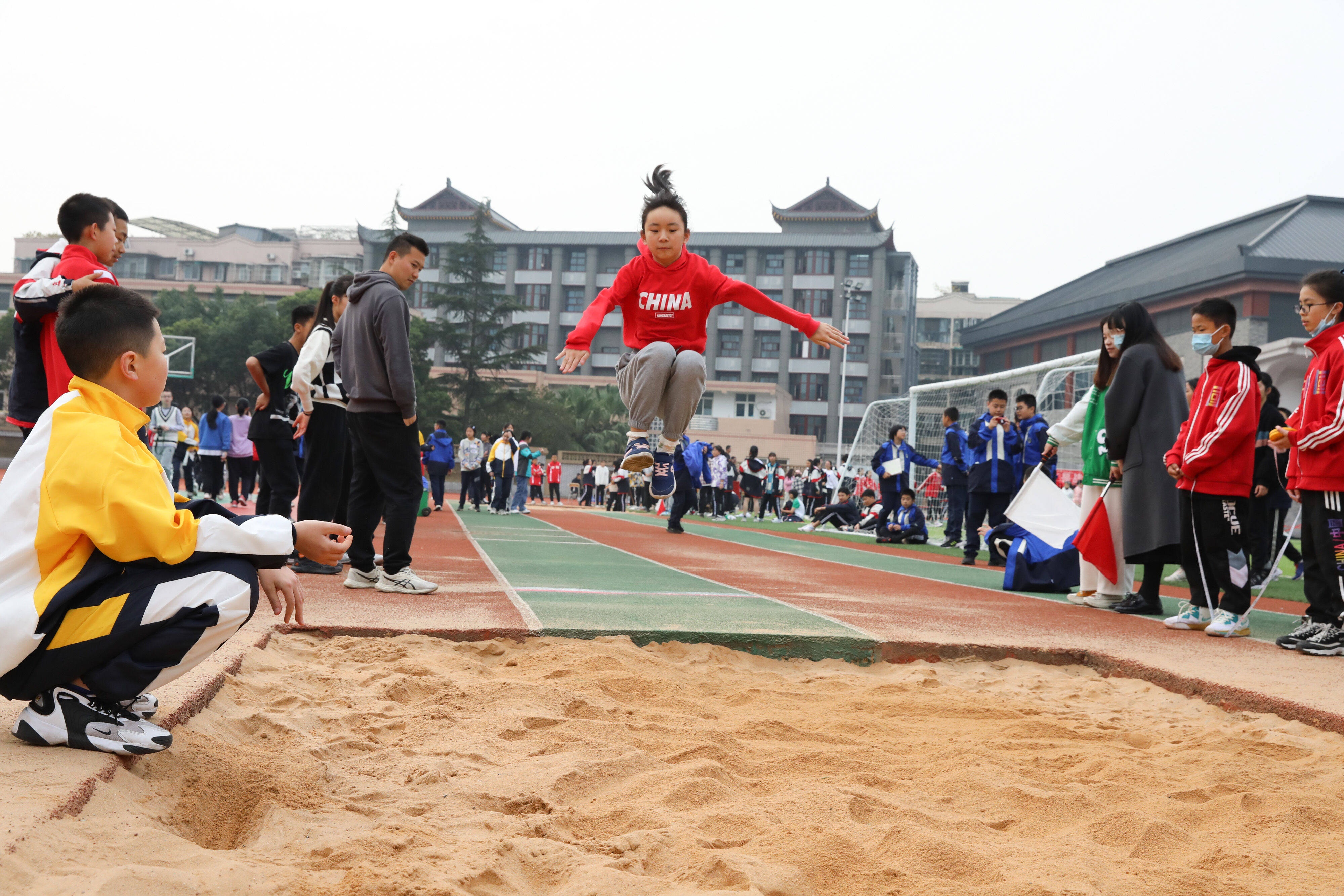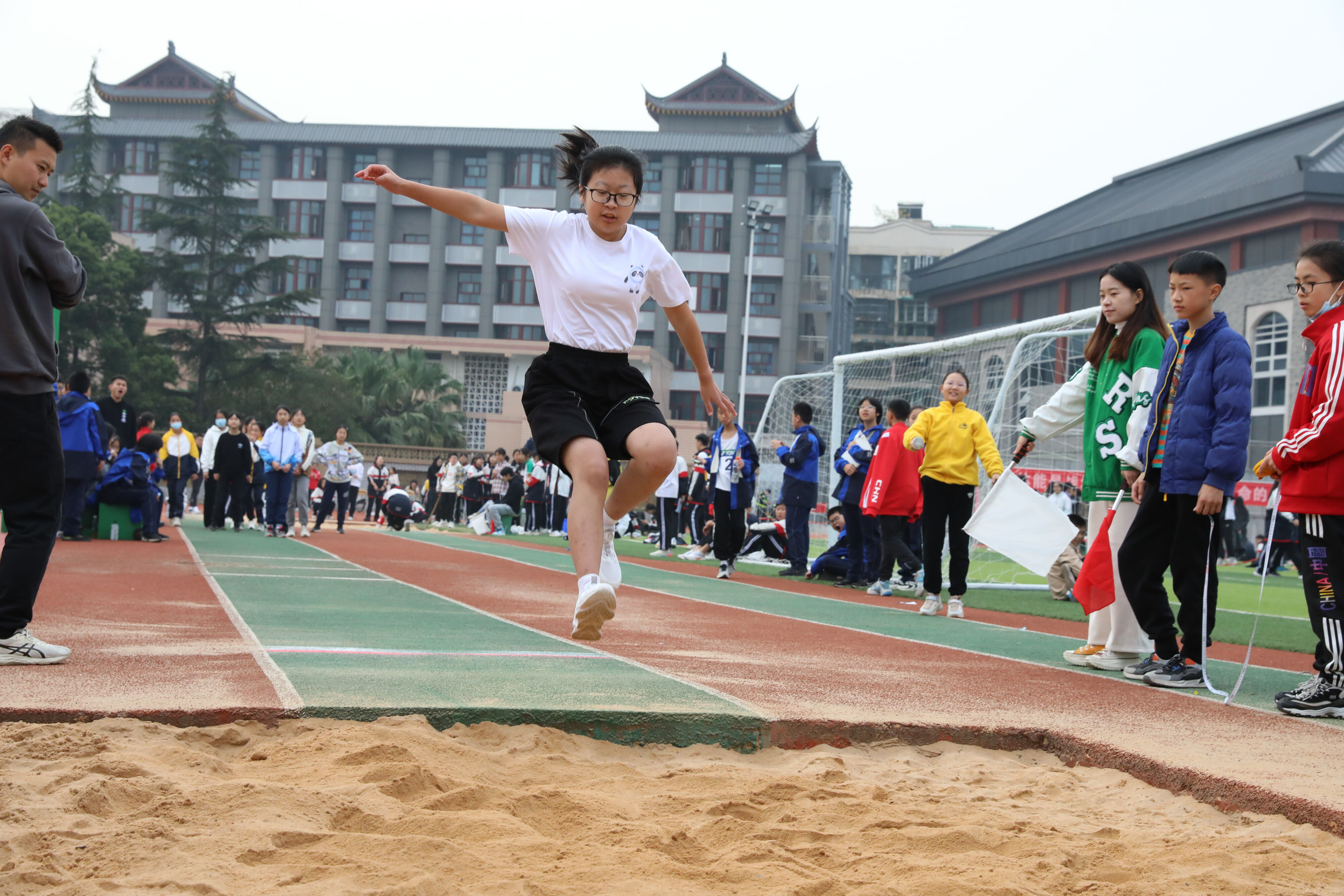 七年級(jí)跳遠(yuǎn)比賽,裁判員老師記錄選手參賽成績(jī)