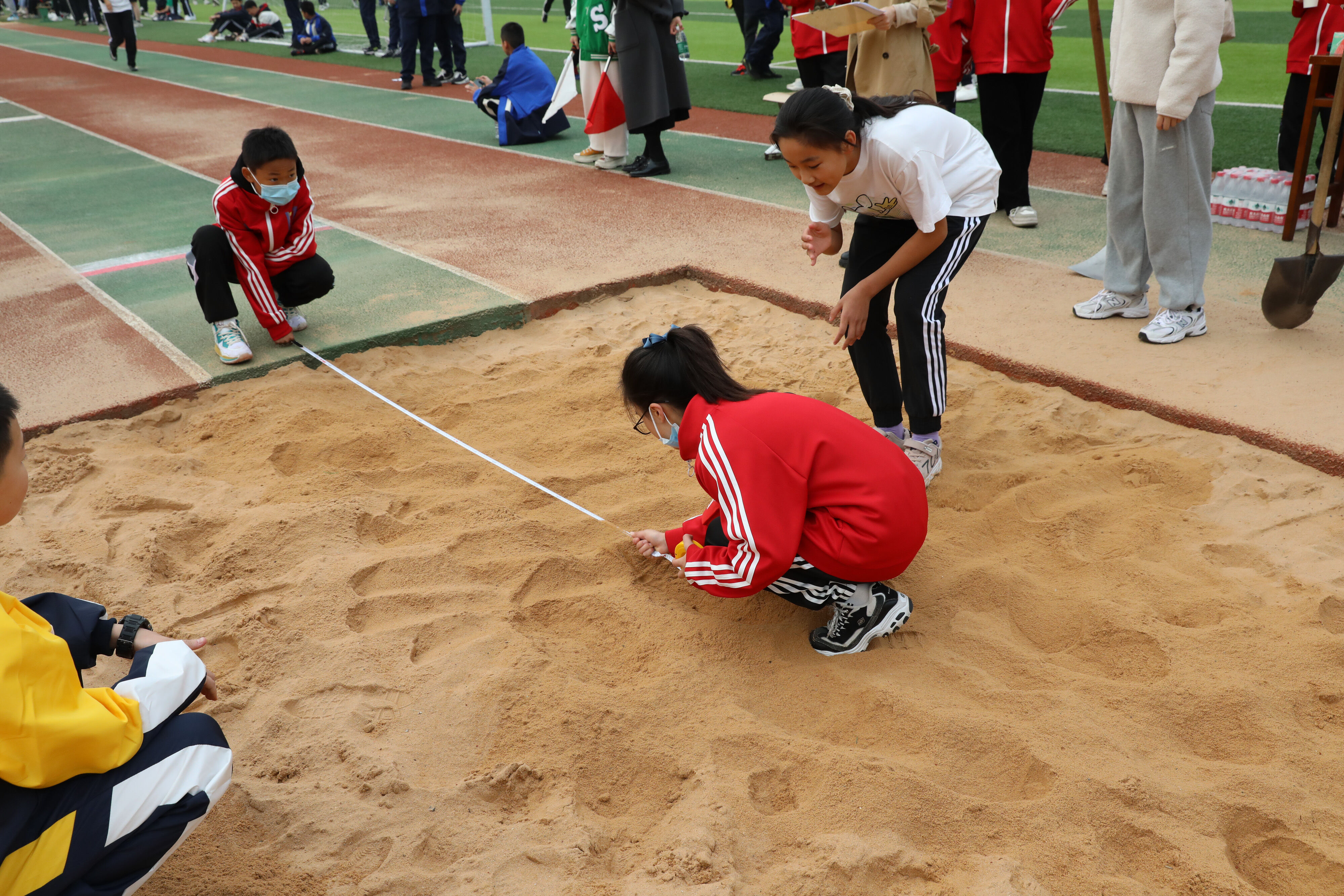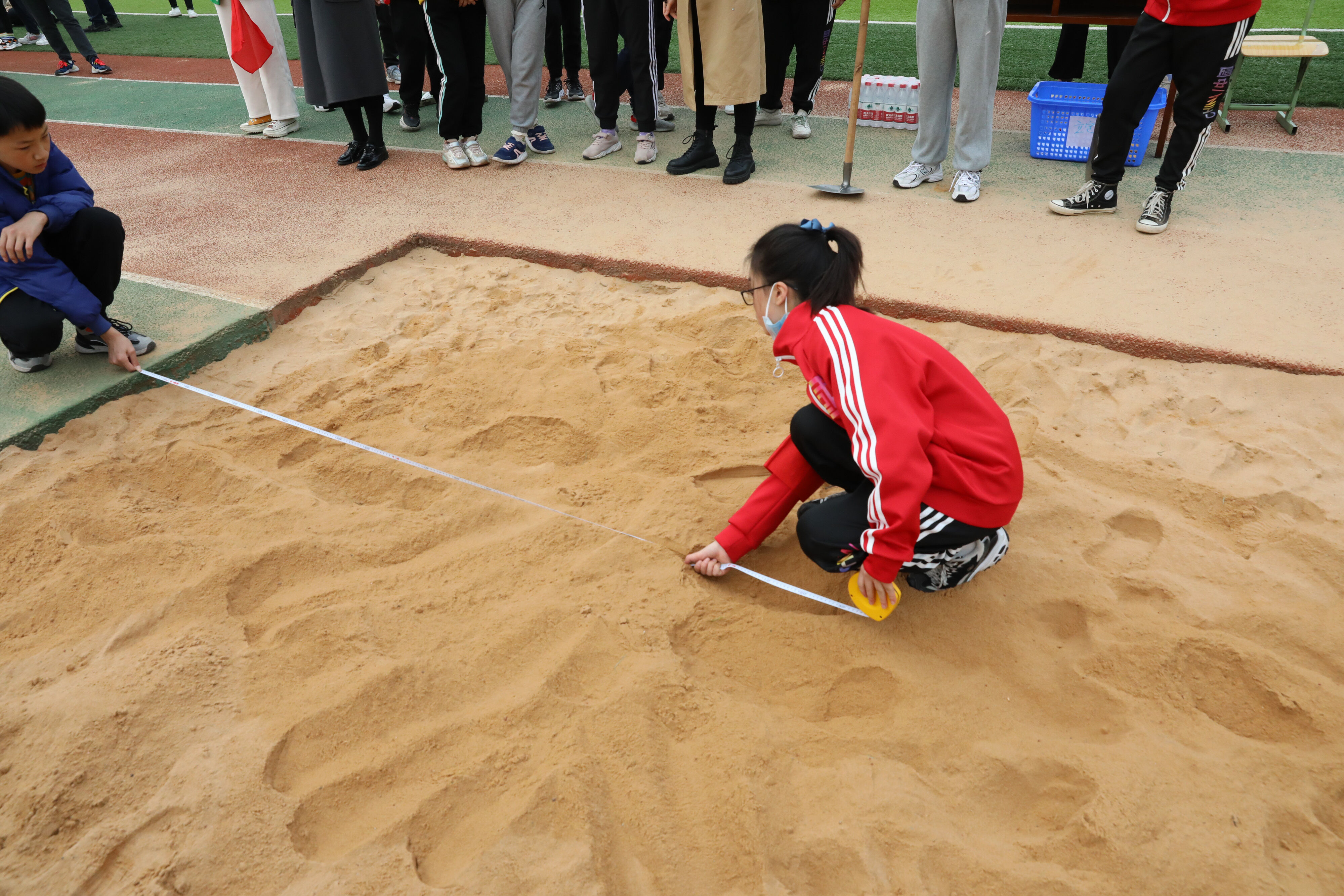 七年級(jí)跳遠(yuǎn)比賽,志愿者學(xué)生認(rèn)真測(cè)量選手成績(jī)。