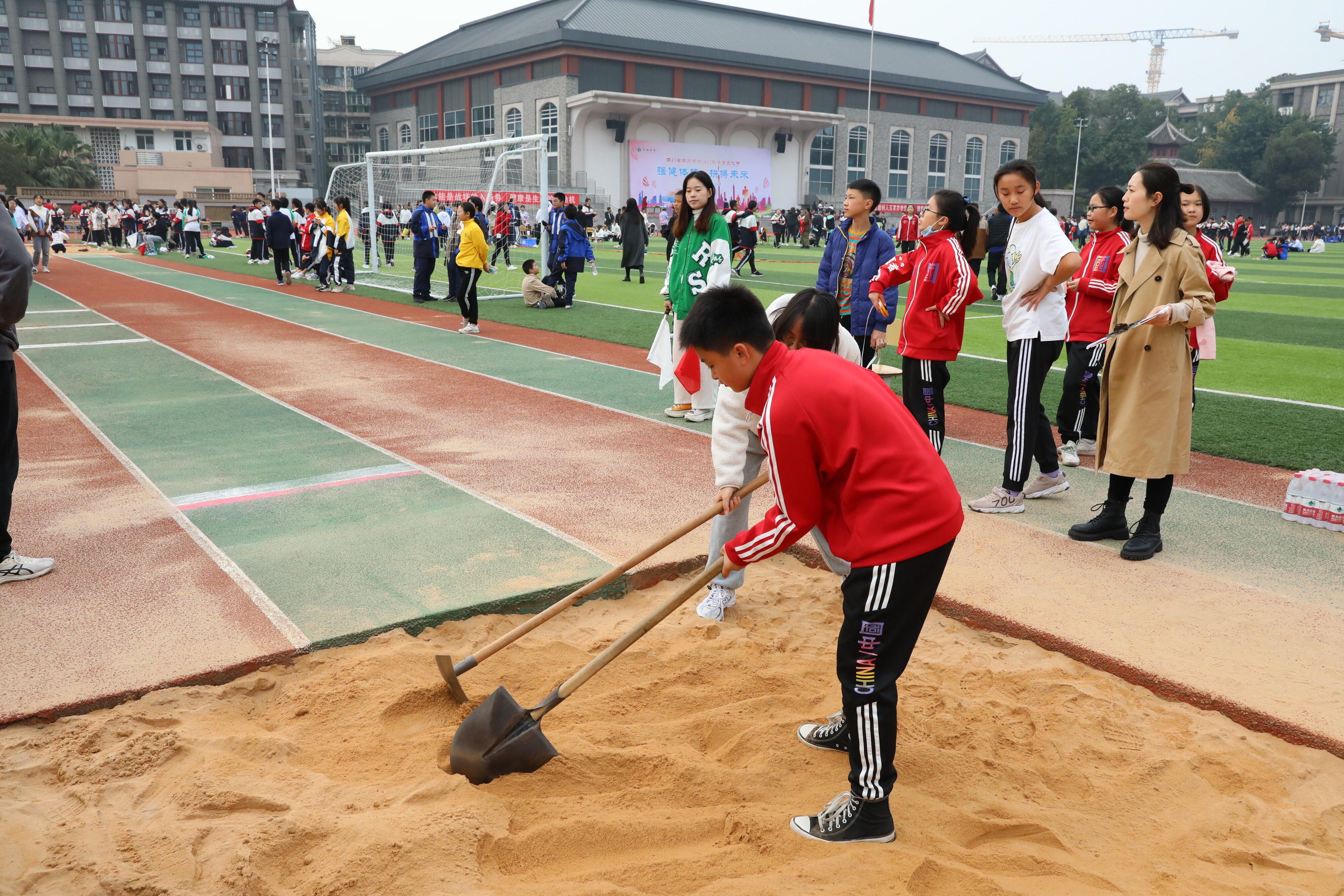 七年級(jí)跳遠(yuǎn)比賽,志愿者學(xué)生平整比賽場(chǎng)地
