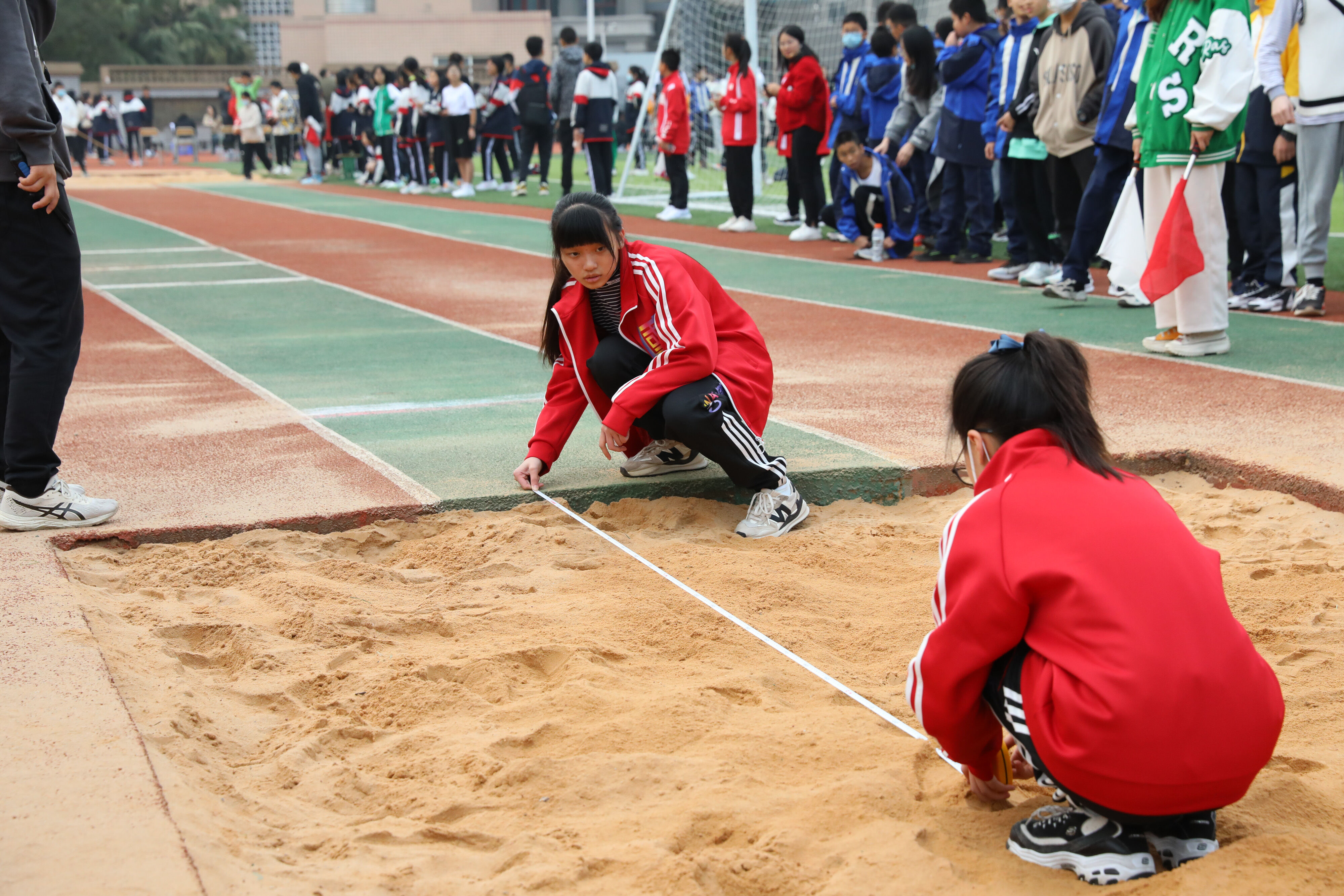 八年級跳遠(yuǎn)比賽,志愿者認(rèn)真測量選手成績
