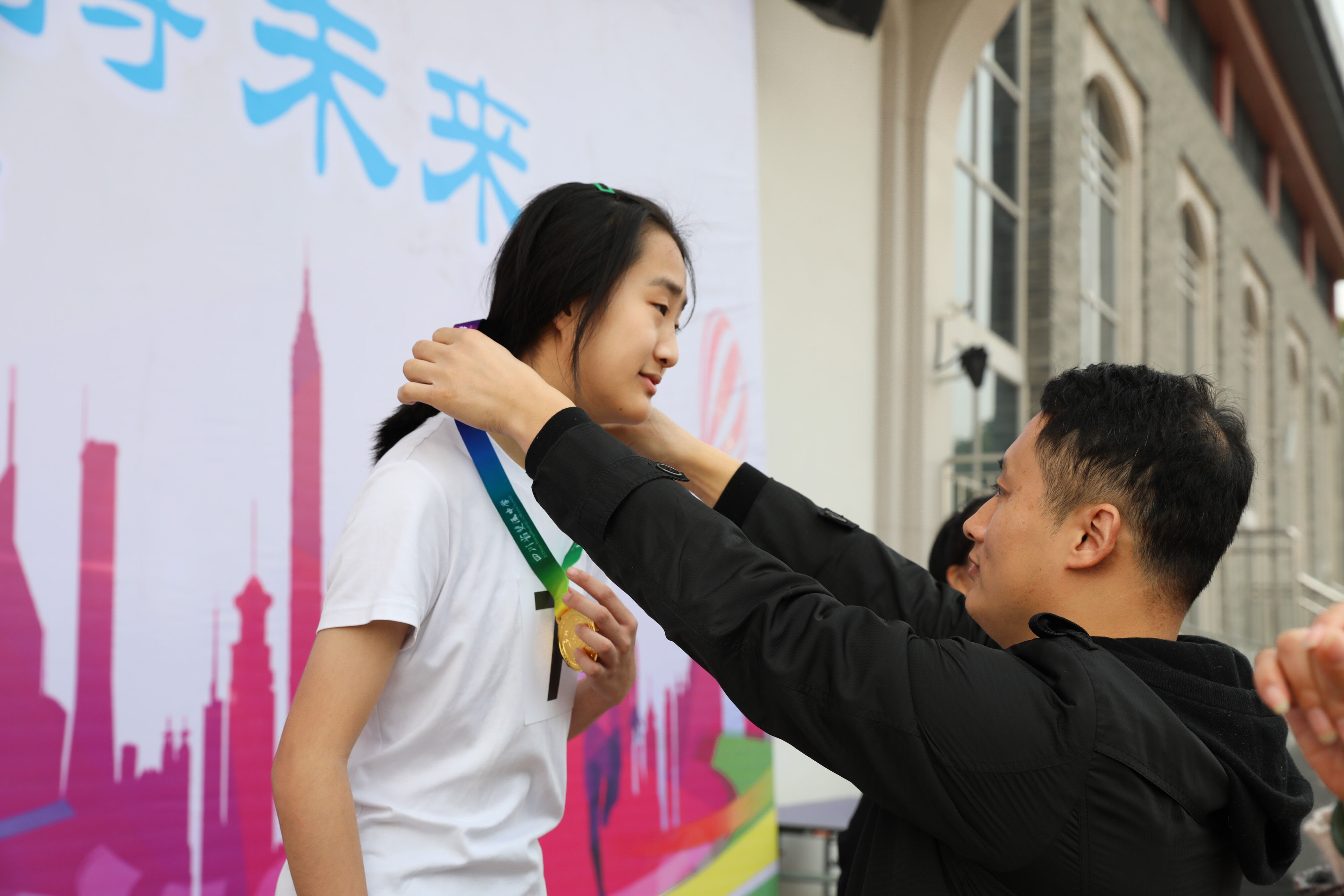 胡劍老師為初二女子200米比賽獲獎同學(xué)頒獎