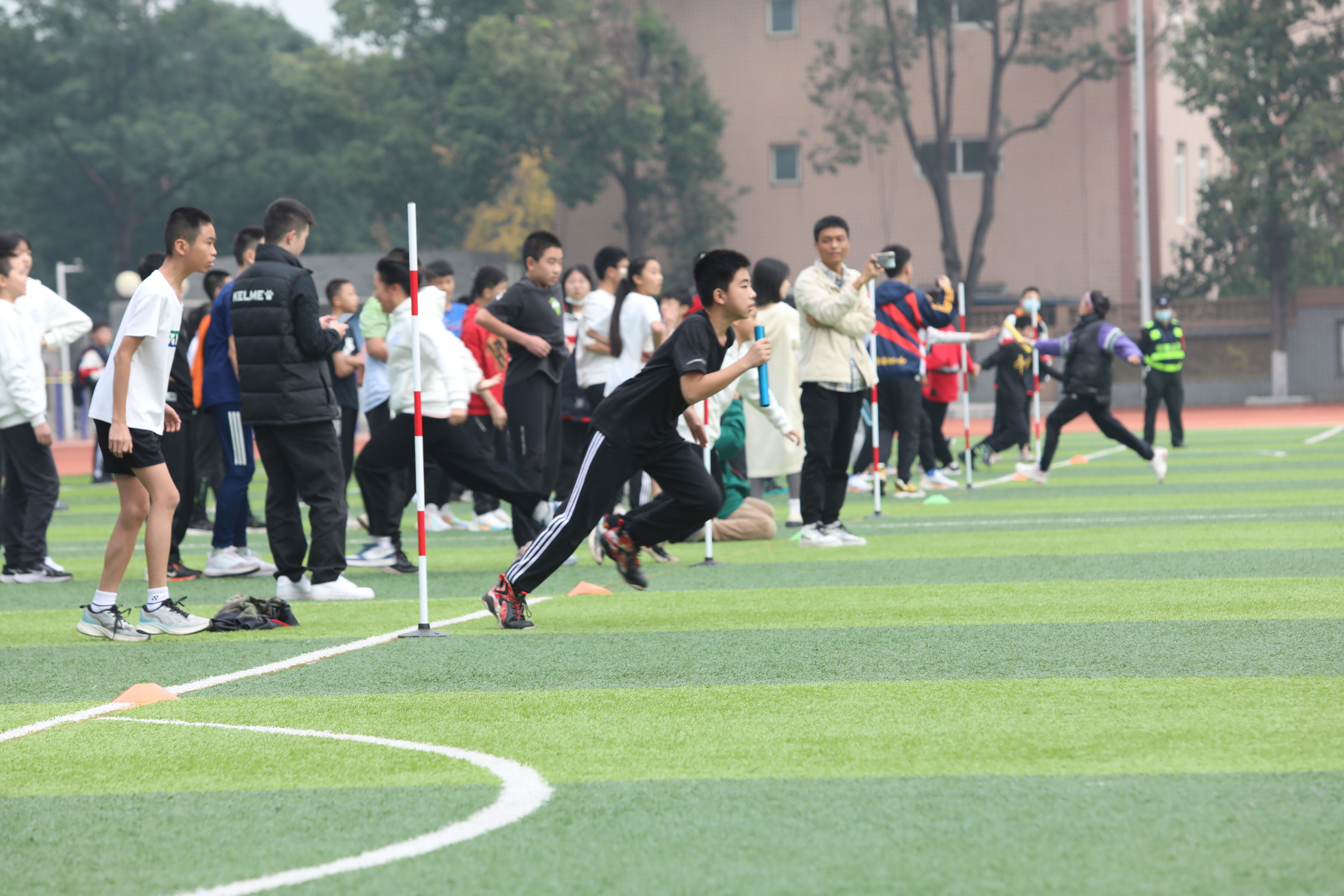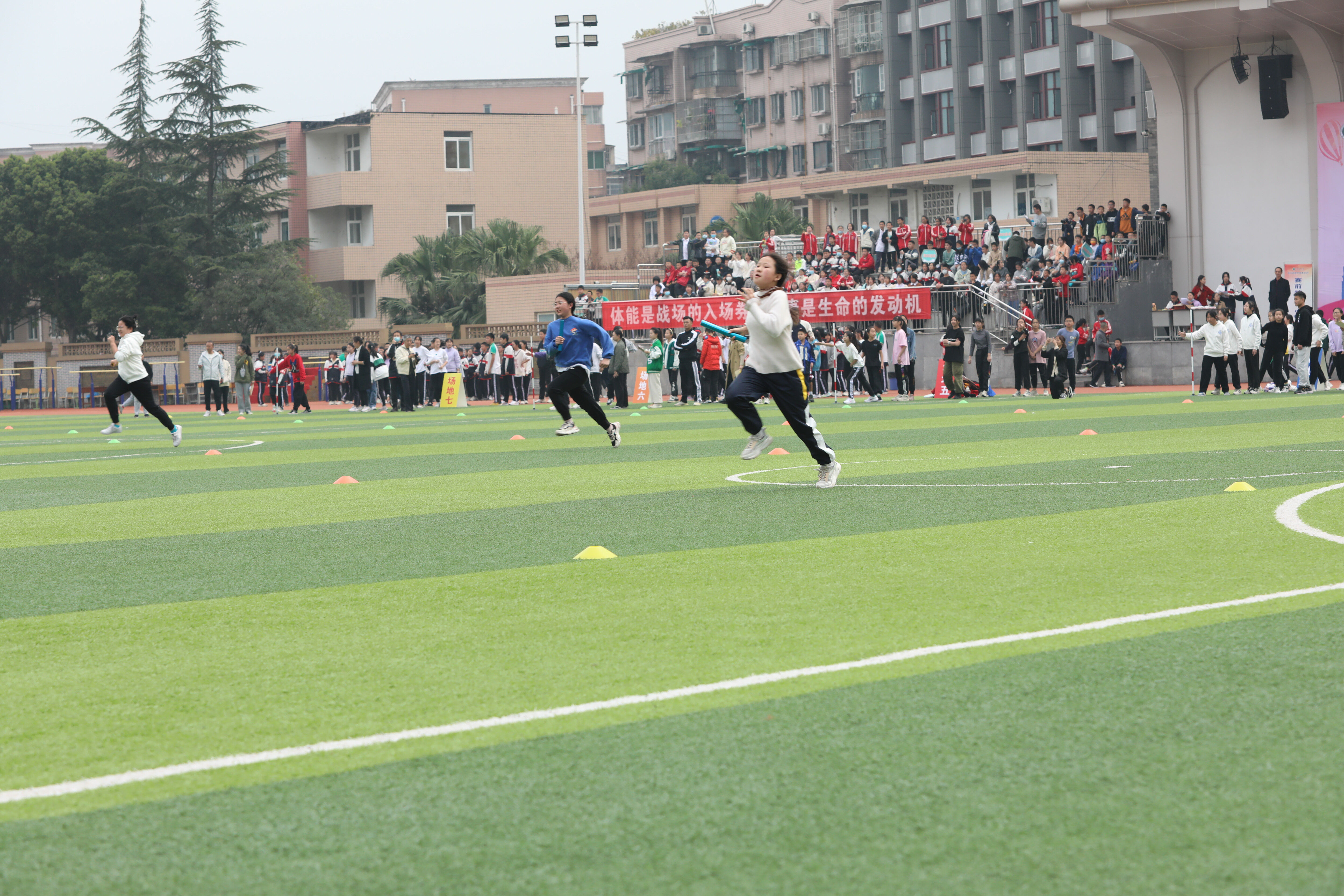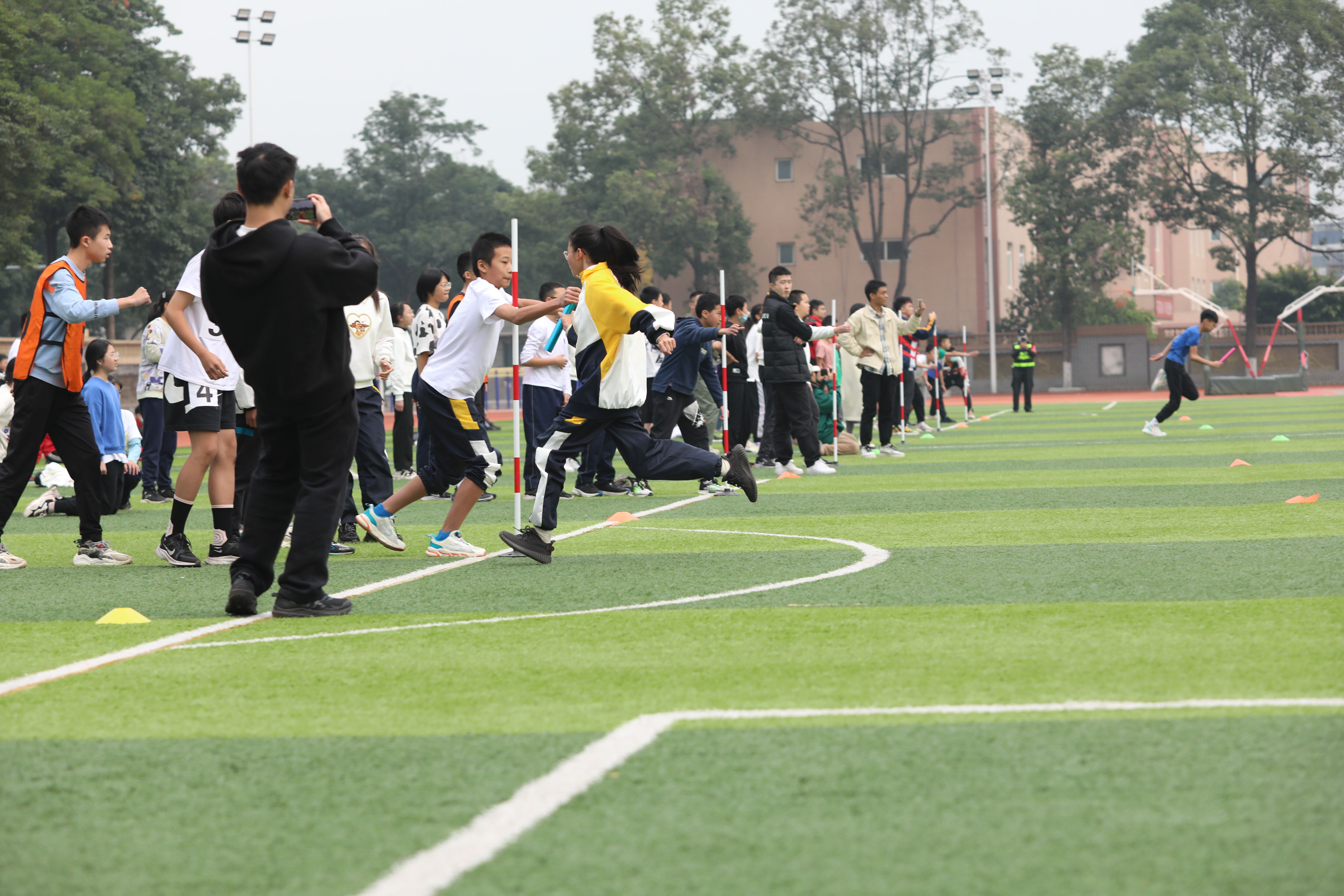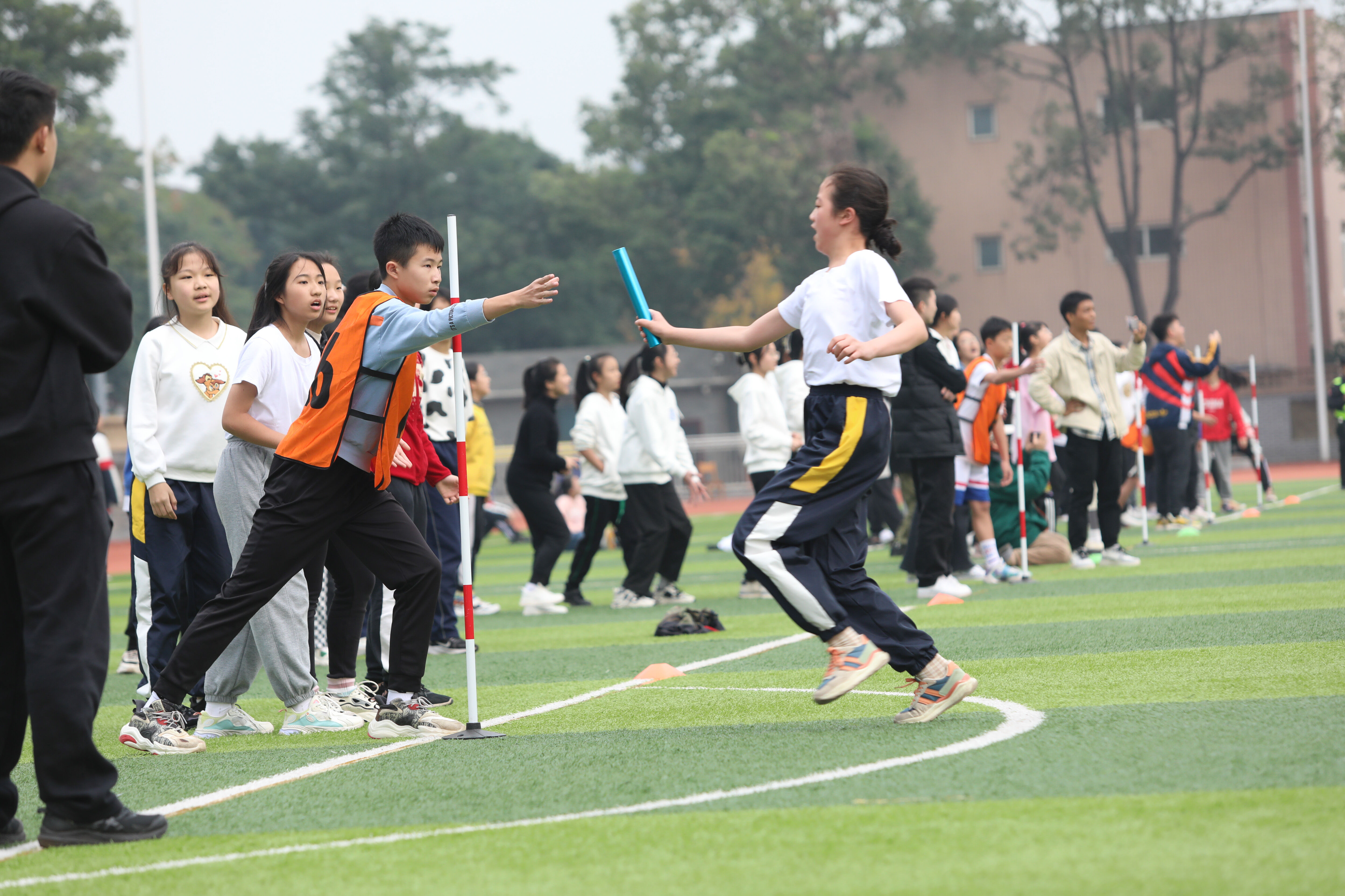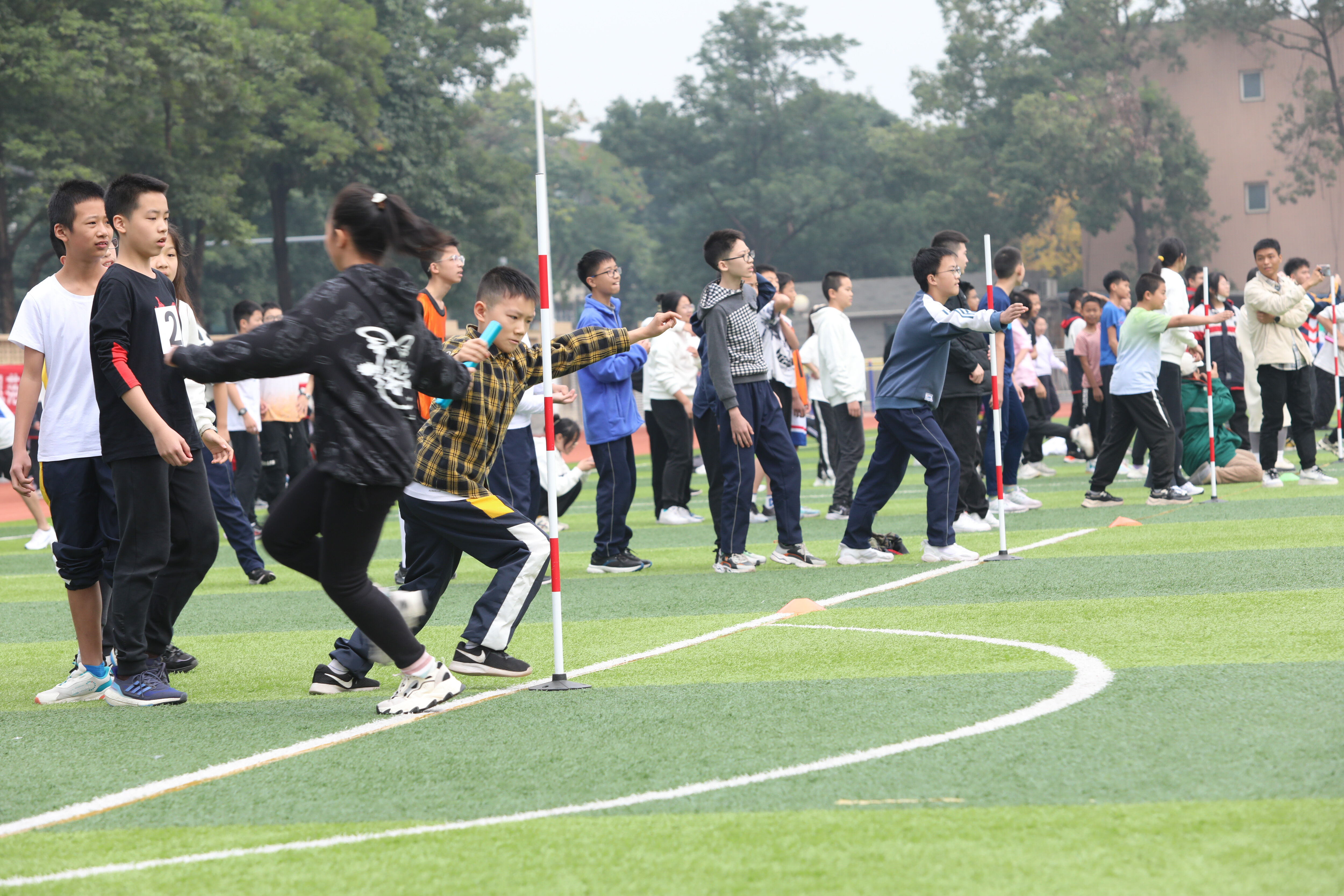 七年級混合接力比賽,場邊觀眾為參賽同學(xué)加油