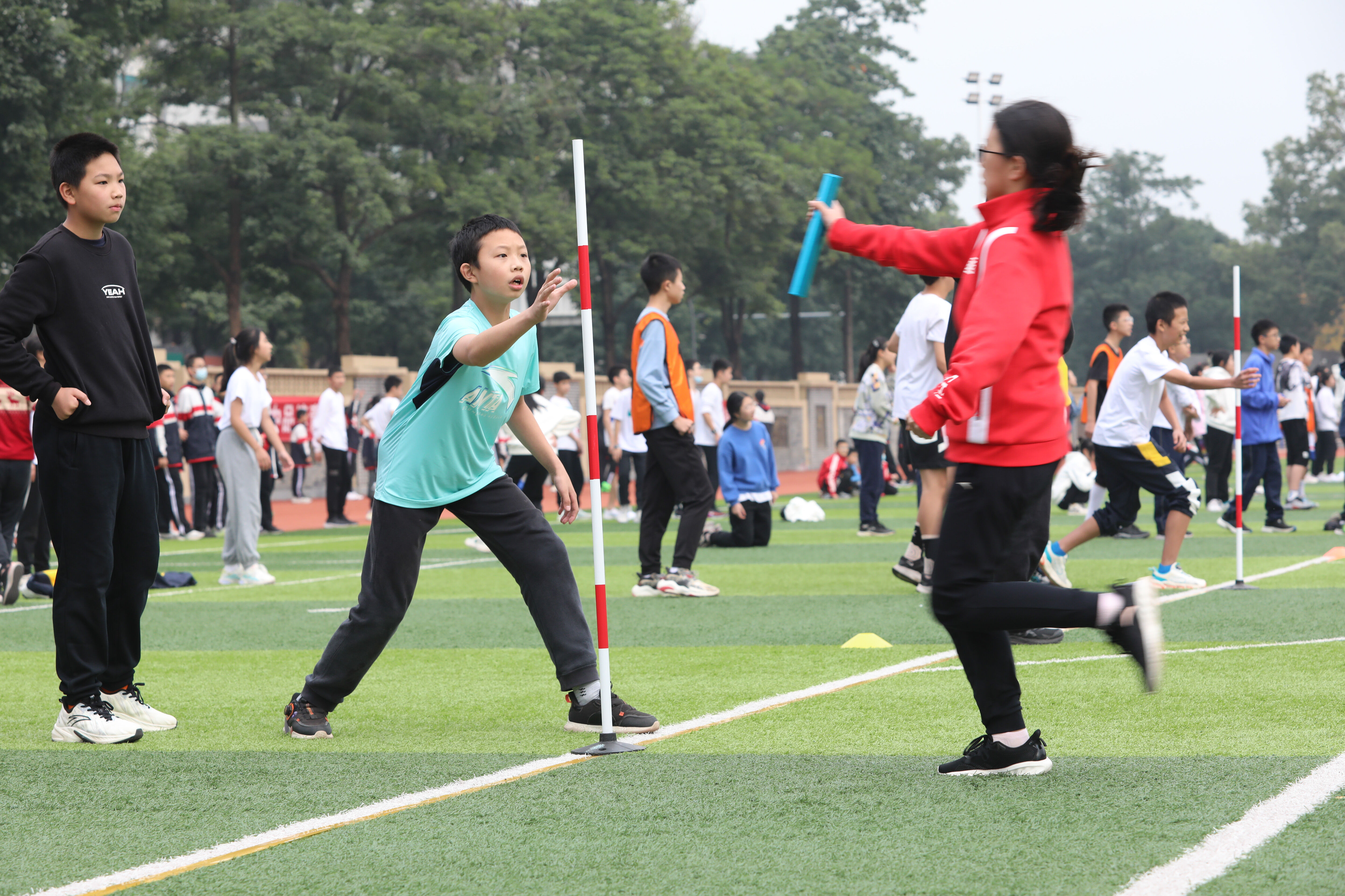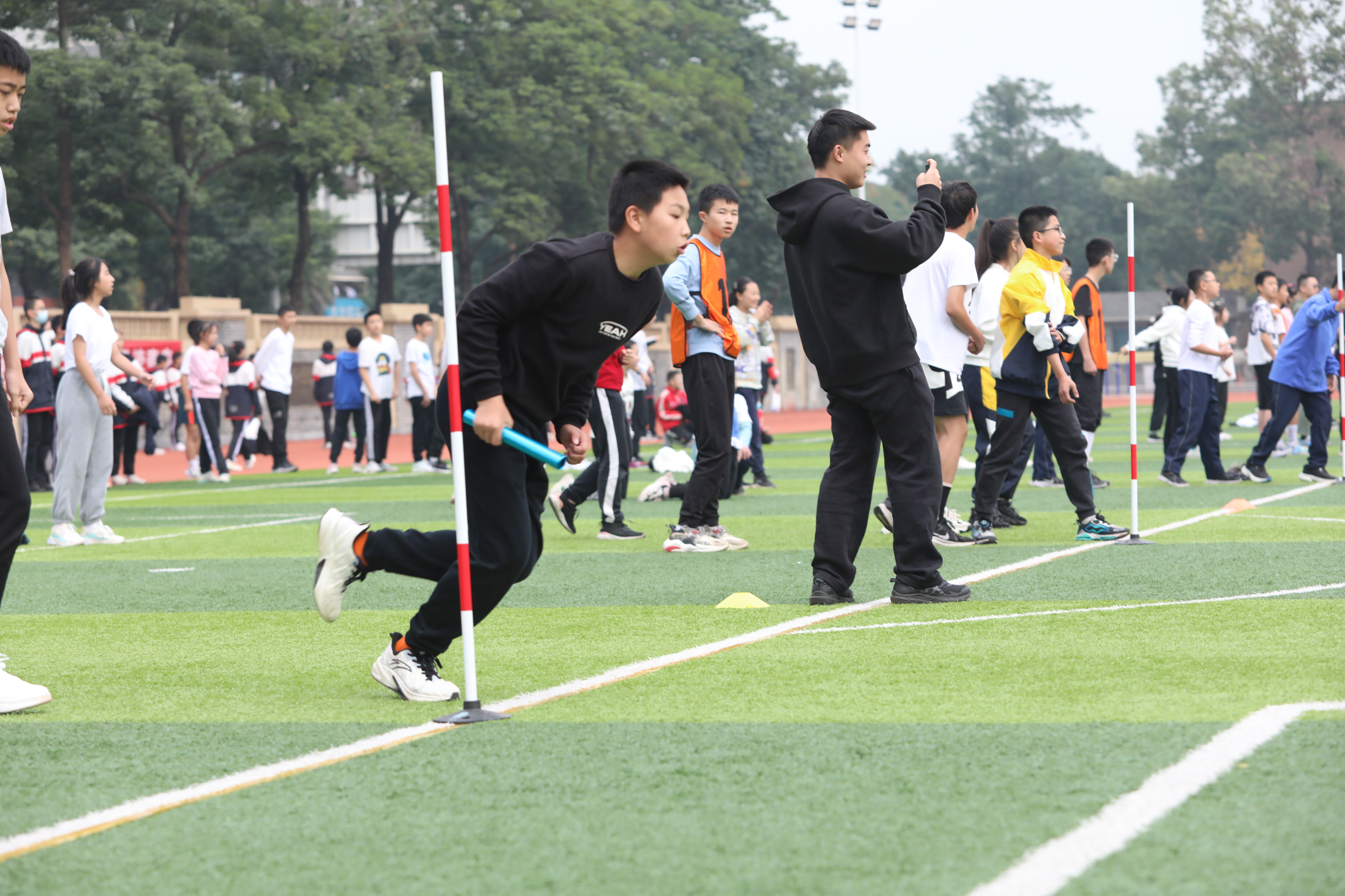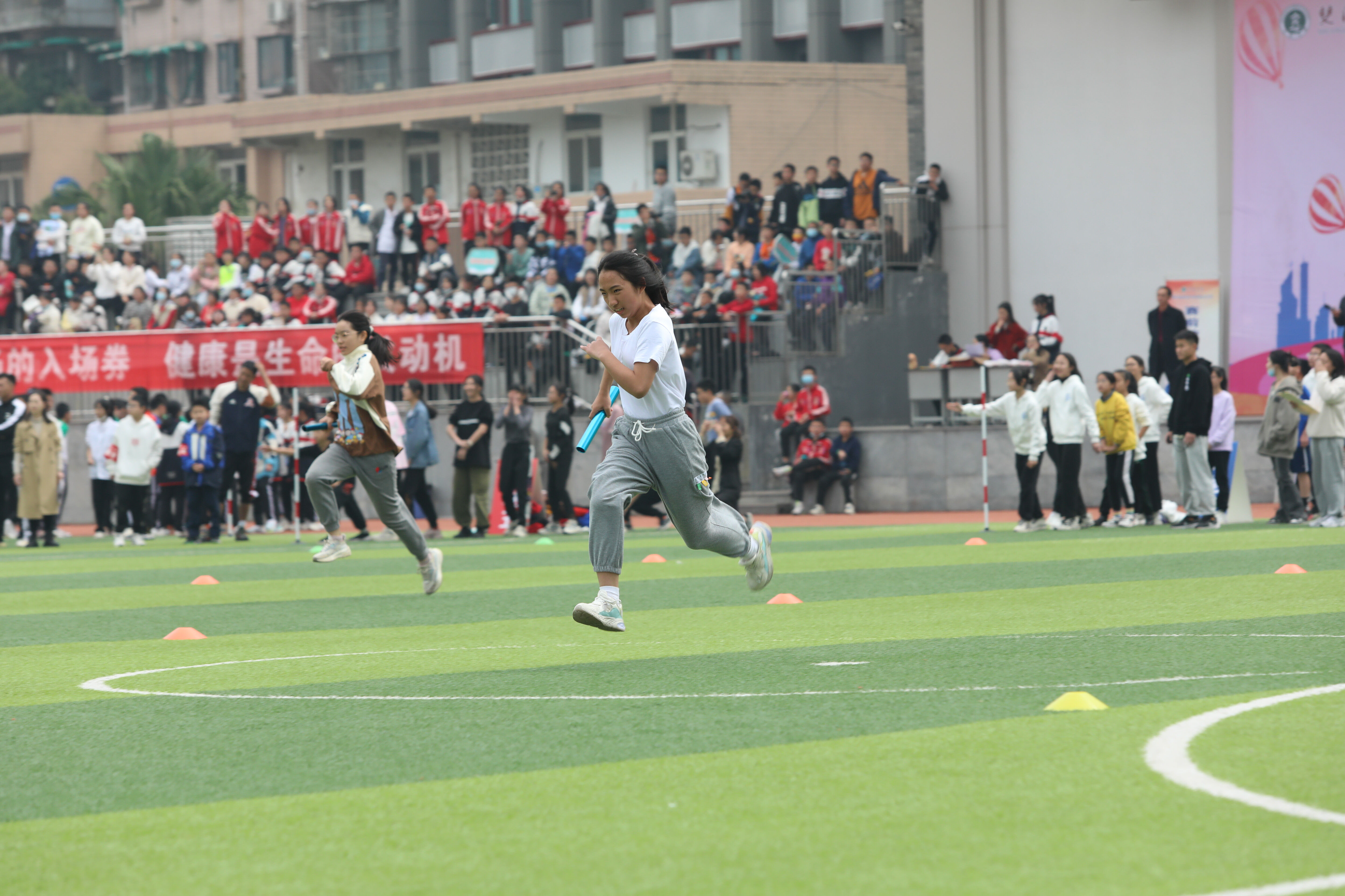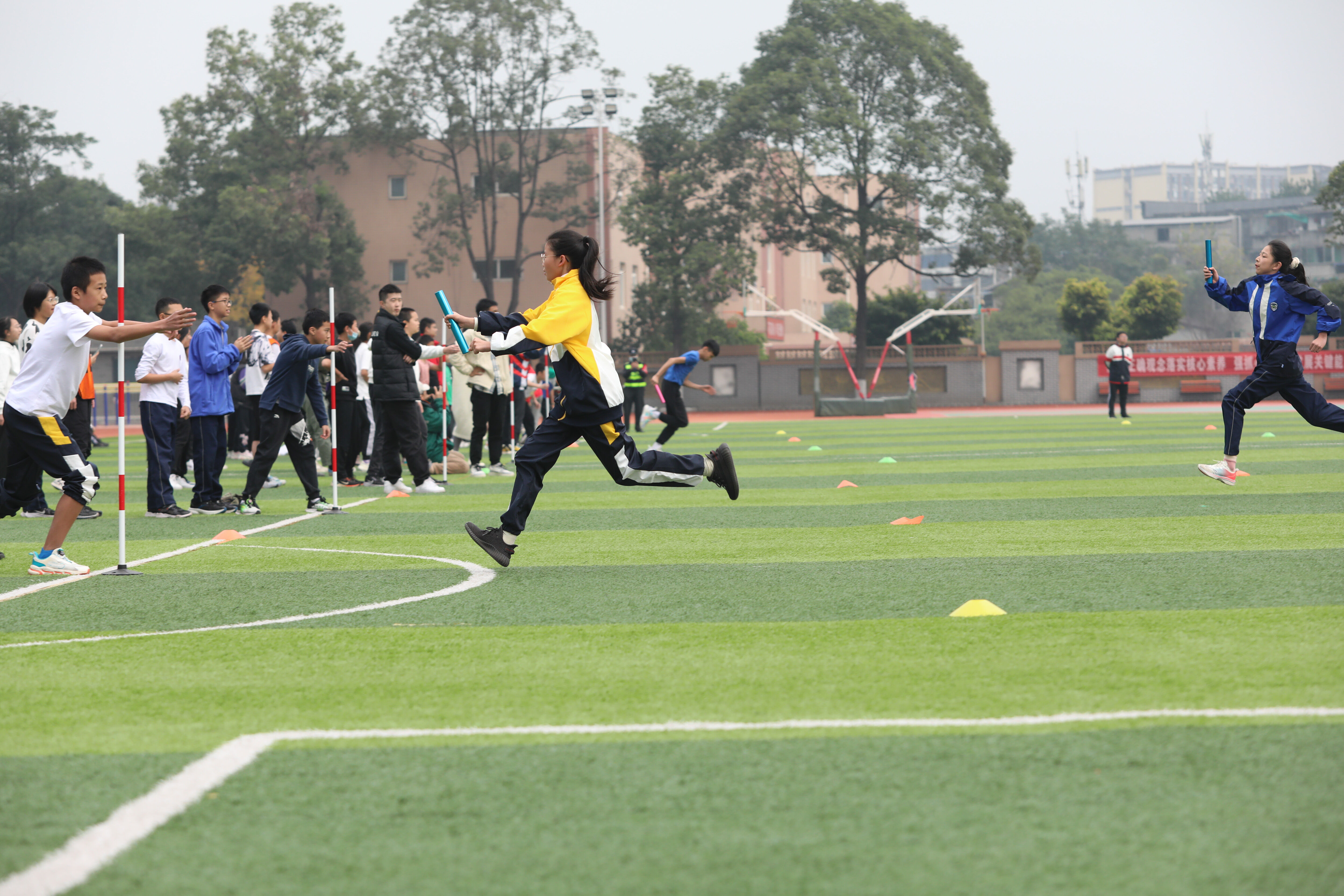 七年級混合接力比賽,場邊觀眾為參賽同學(xué)加油