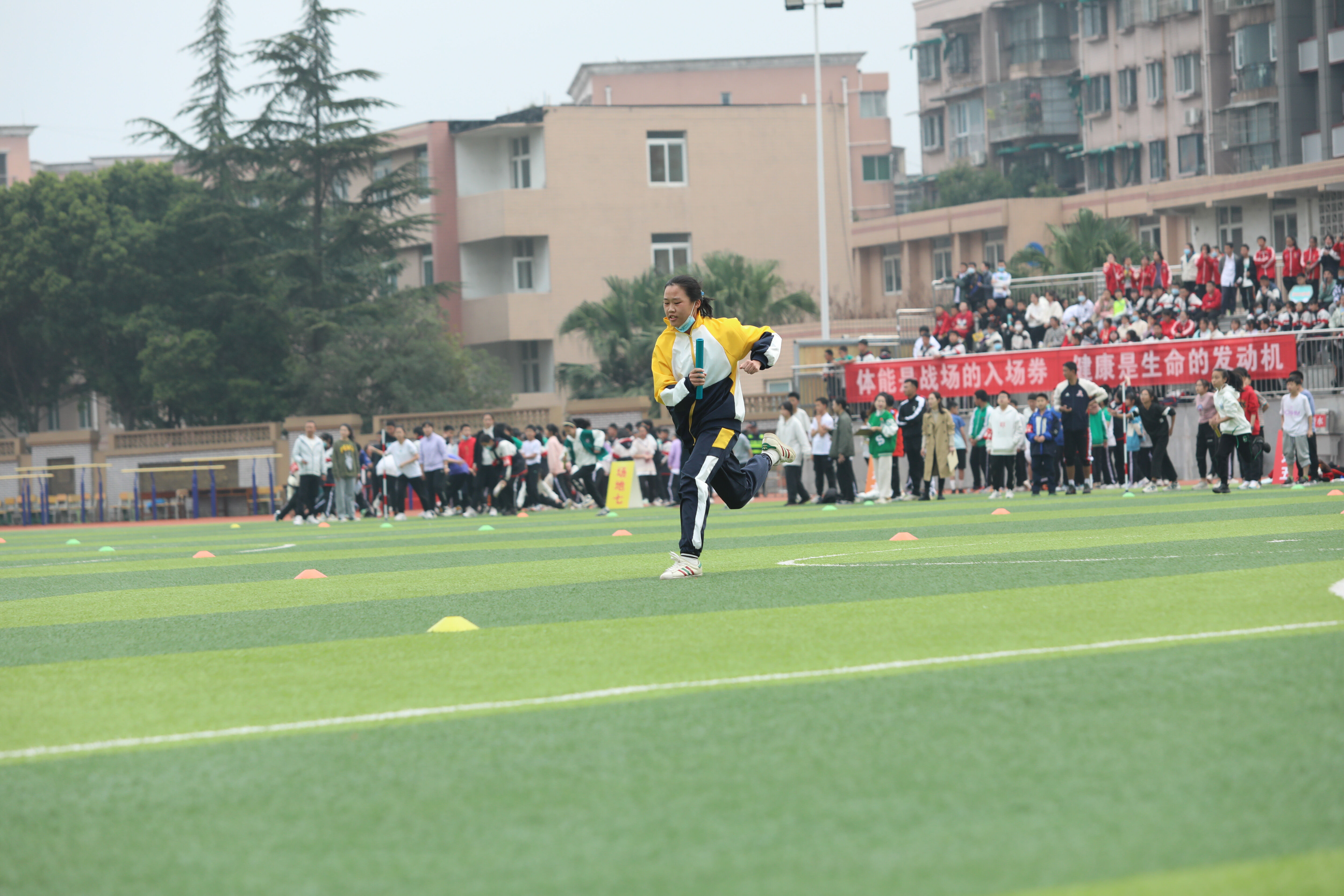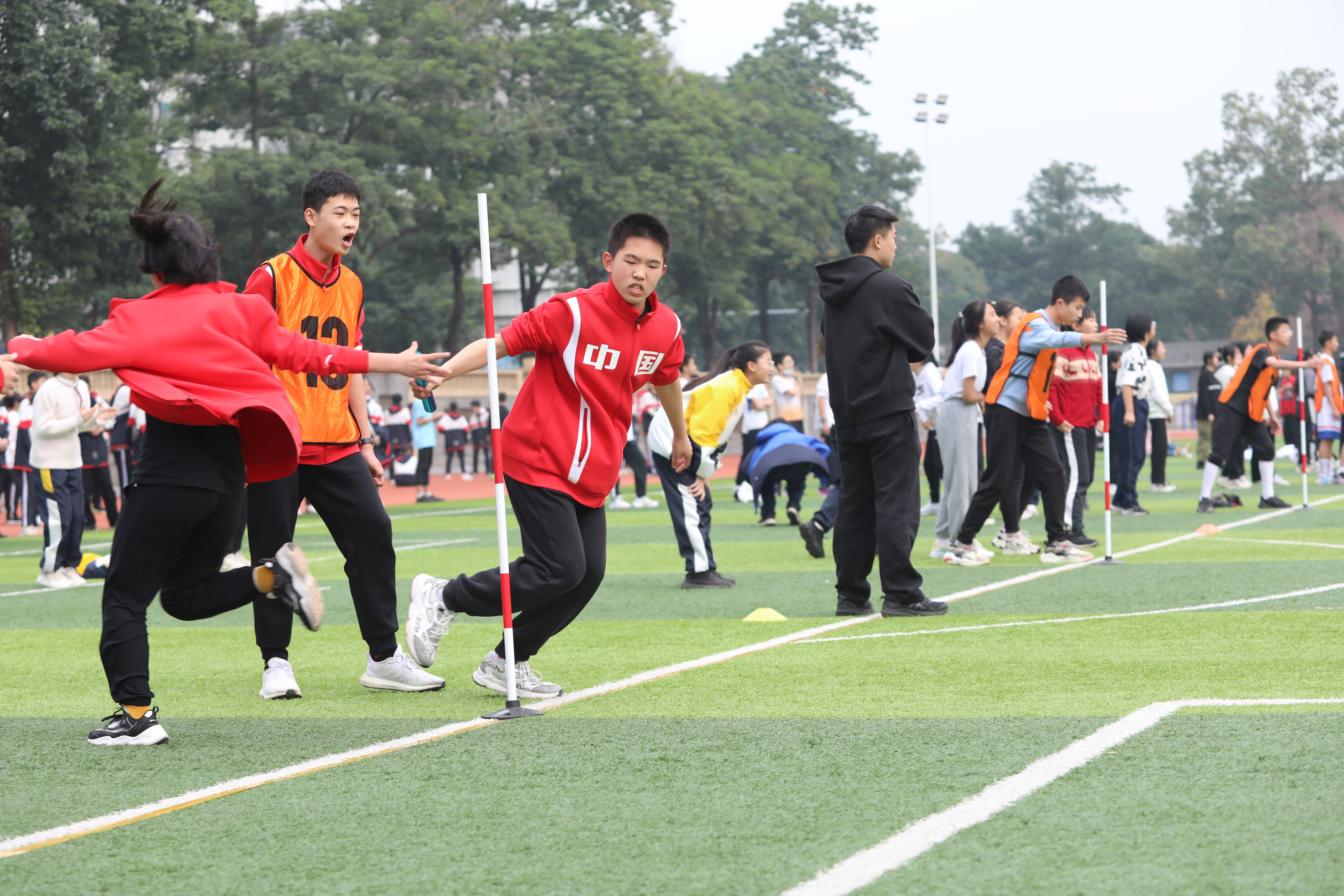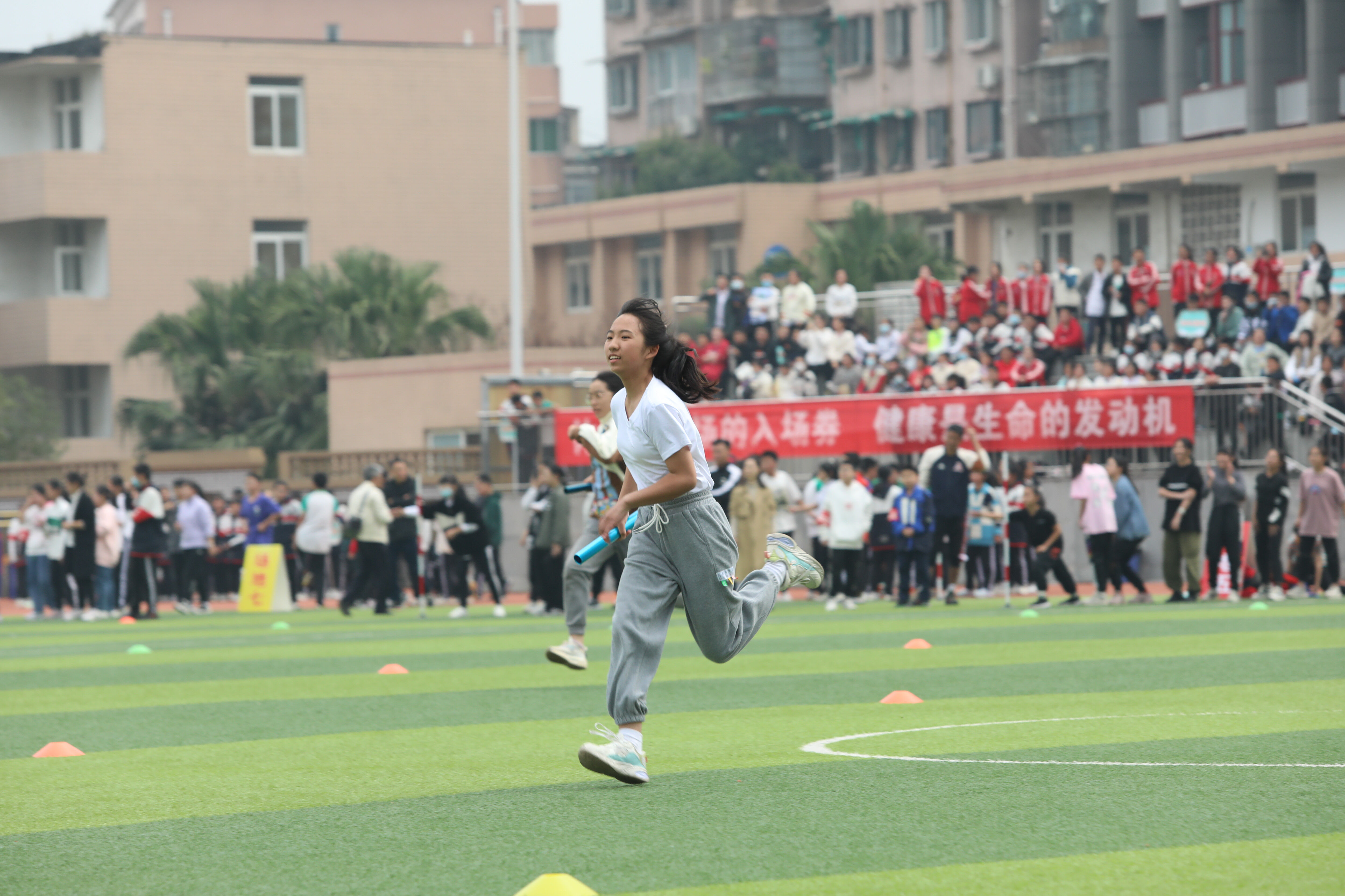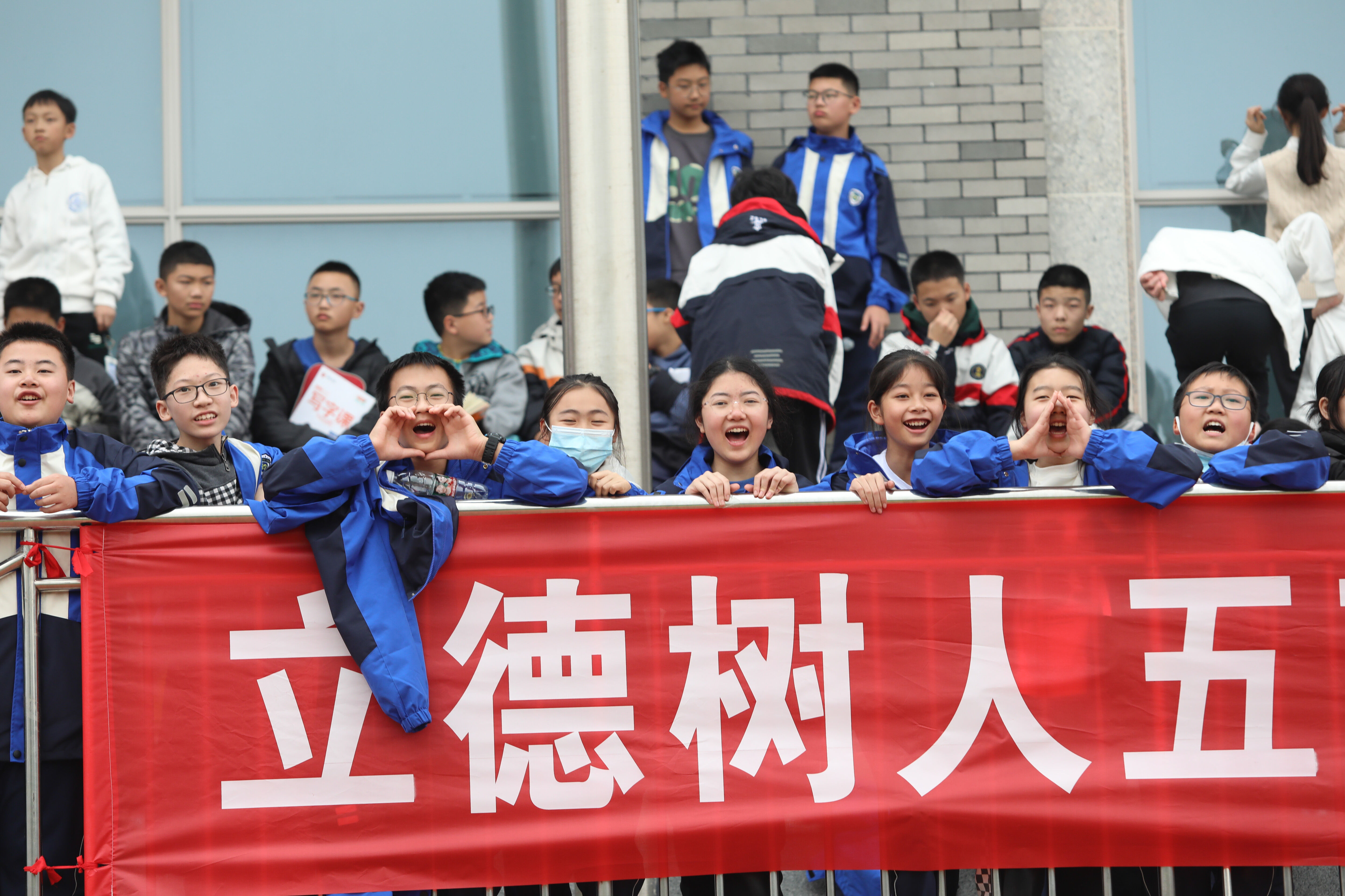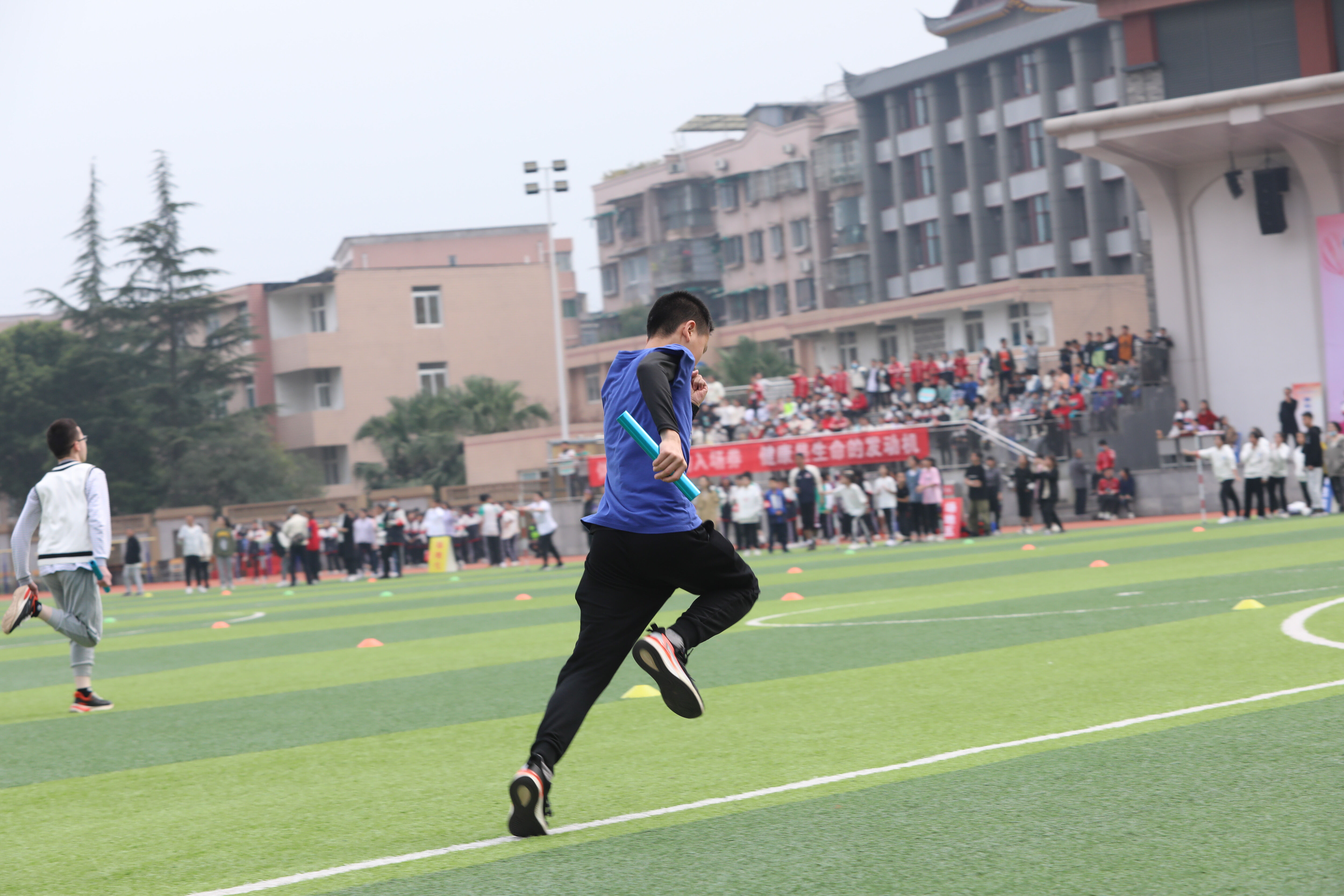 七年級混合接力比賽,場邊觀眾為參賽同學(xué)加油