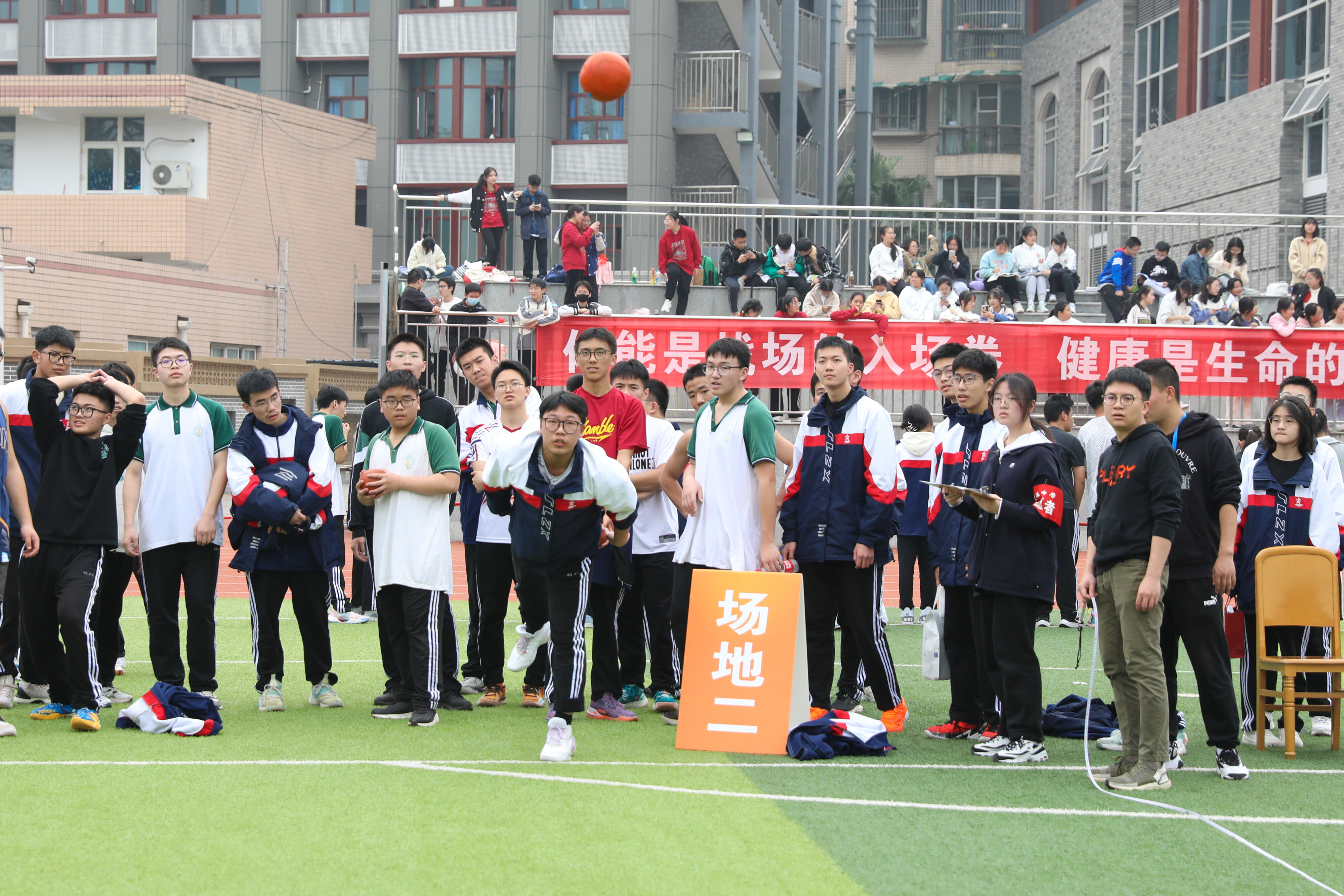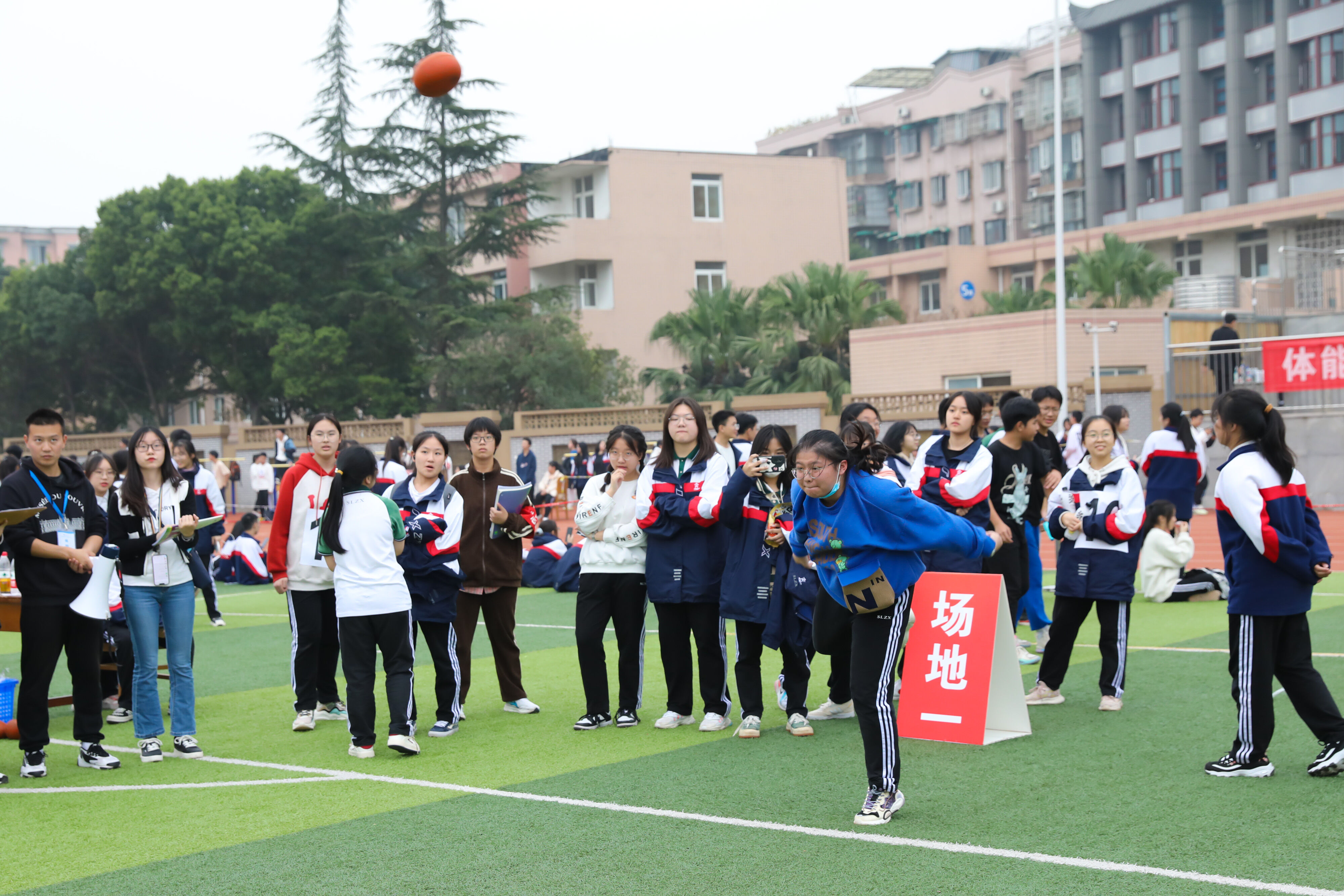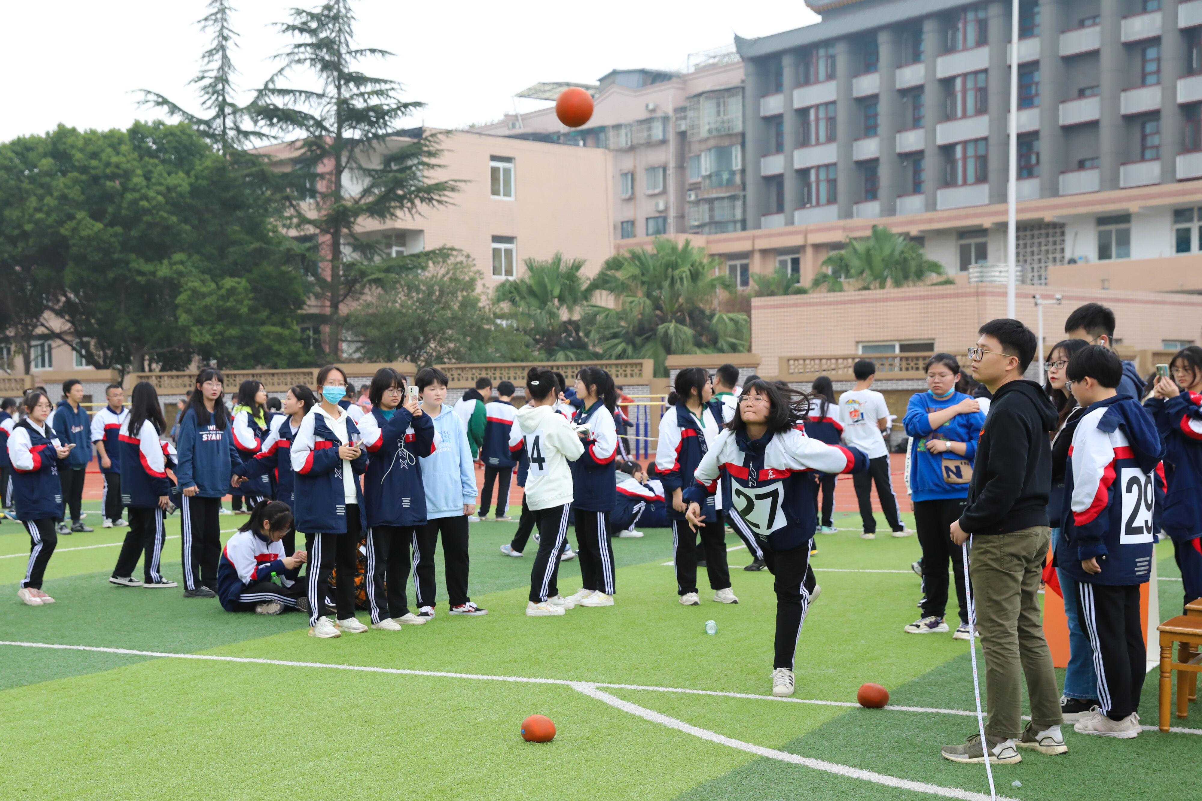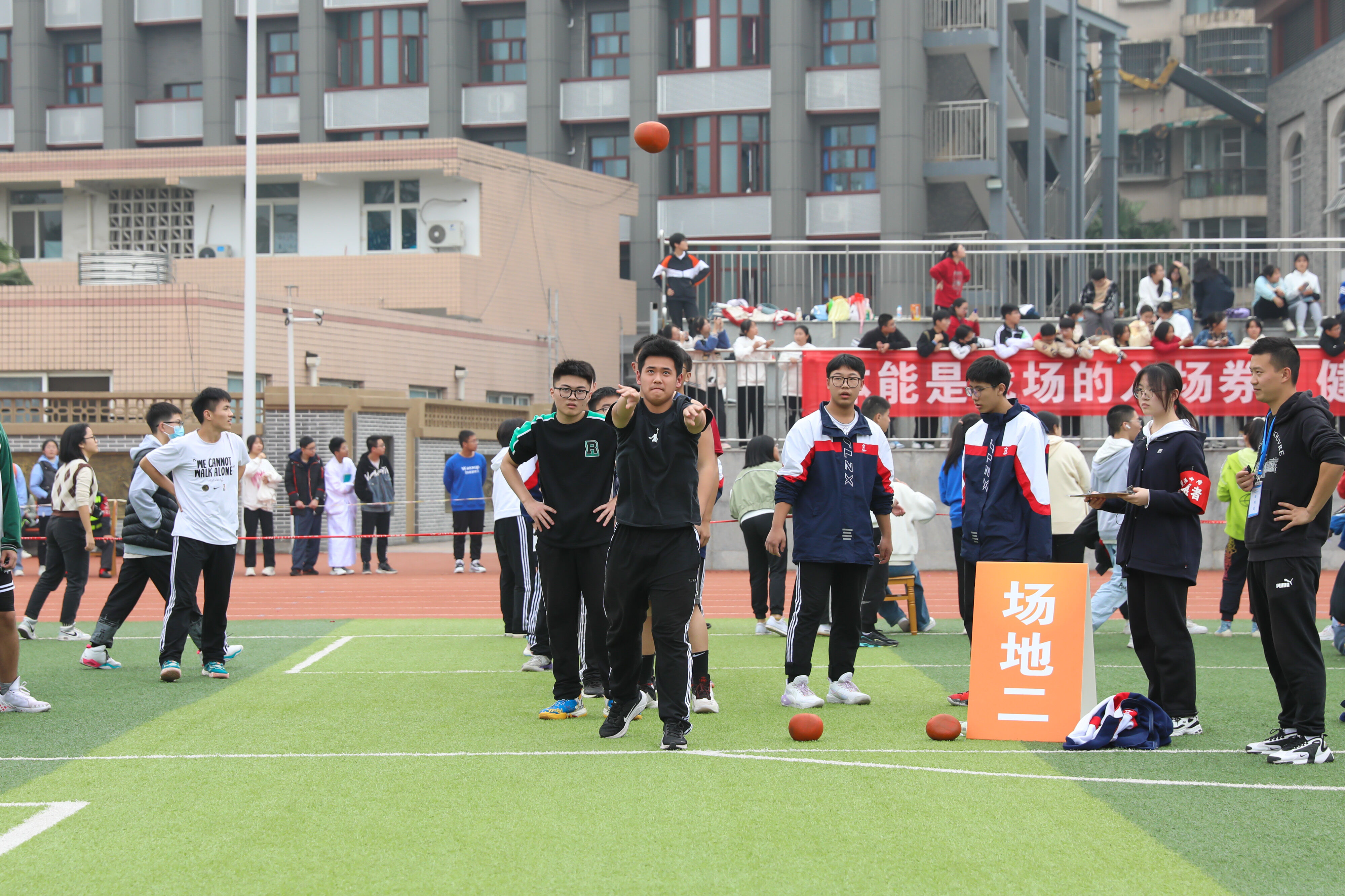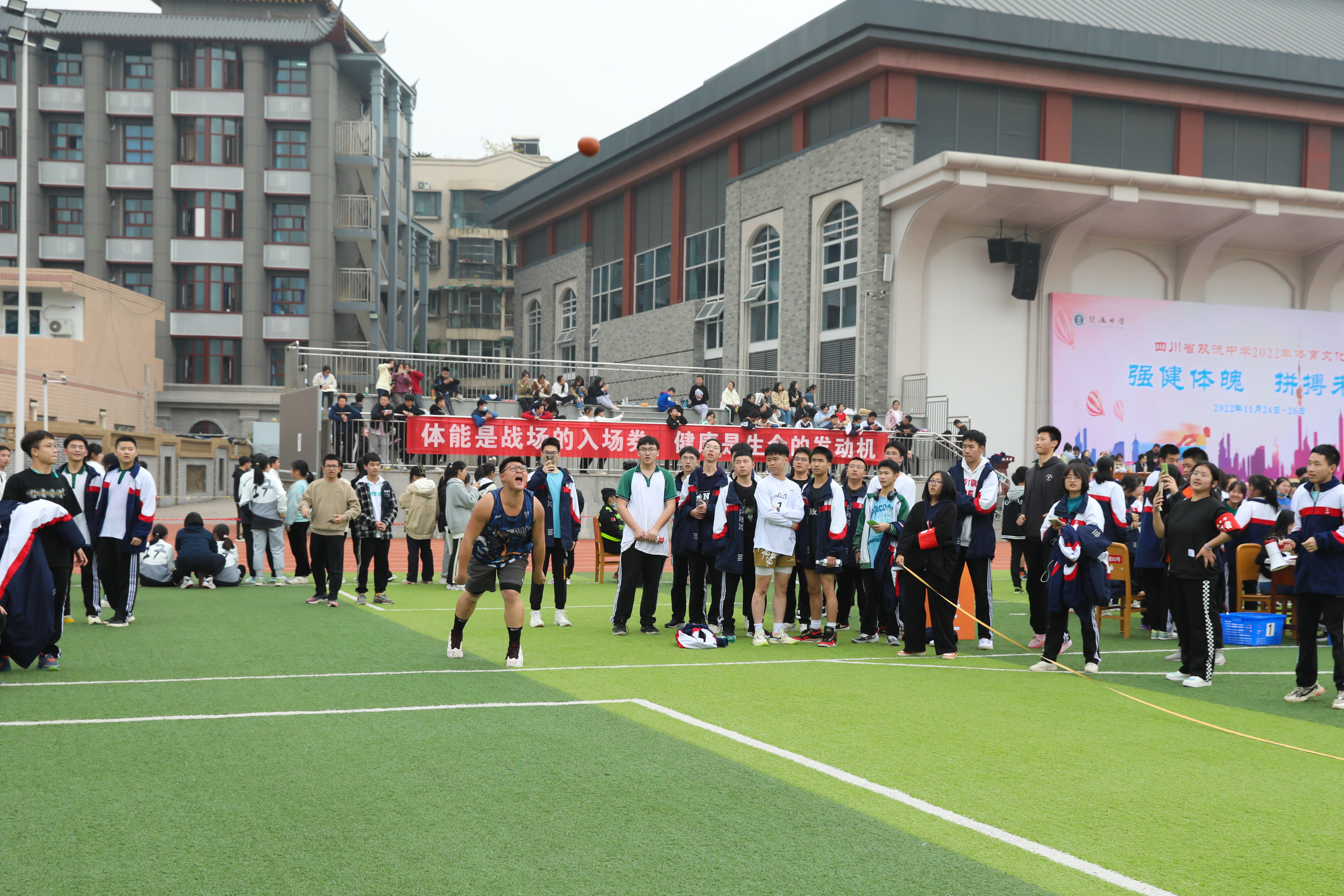 2022年11月25日下午,高二年級實(shí)心球比賽在運(yùn)動(dòng)場舉行。圖為 男子實(shí)心球比賽