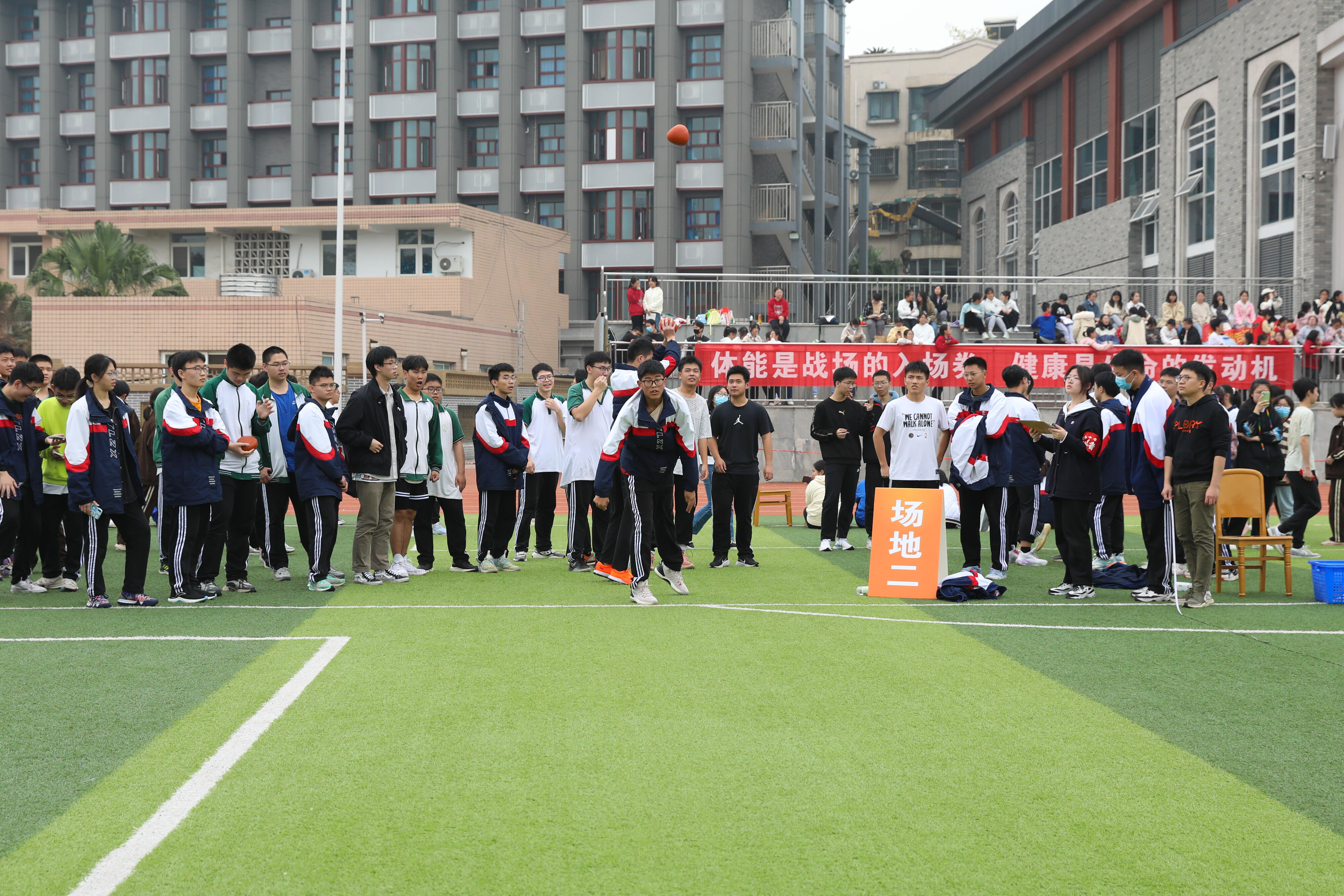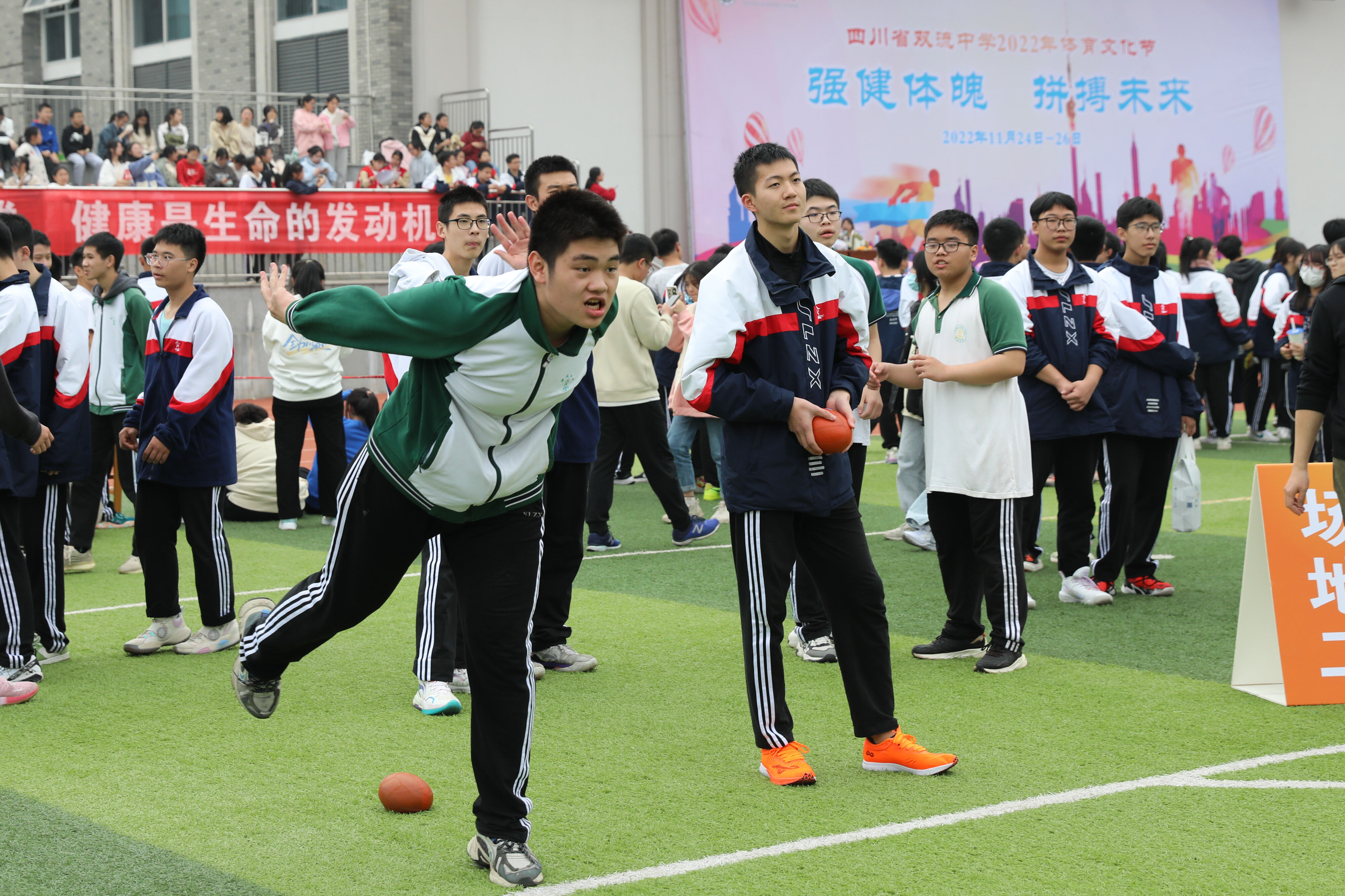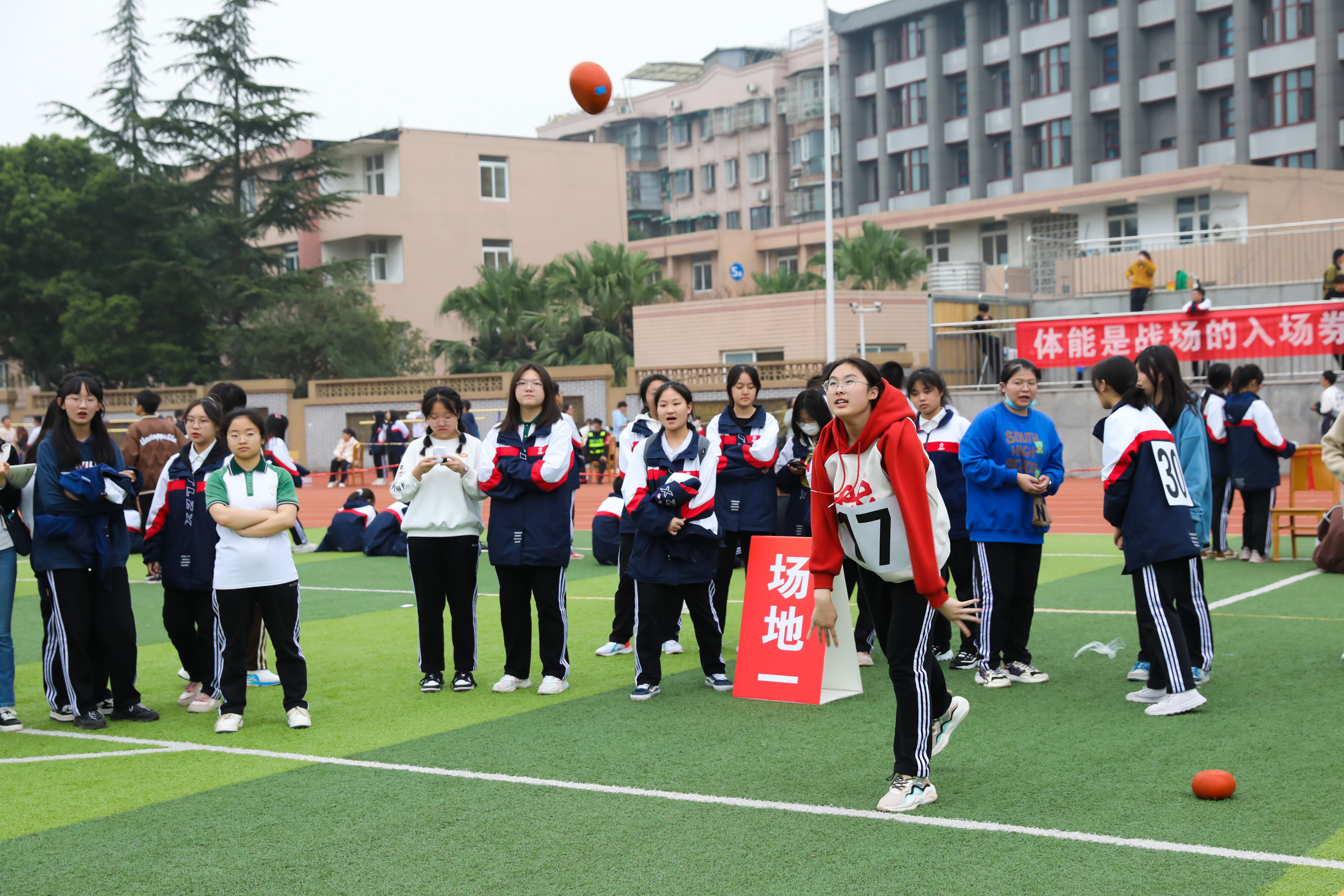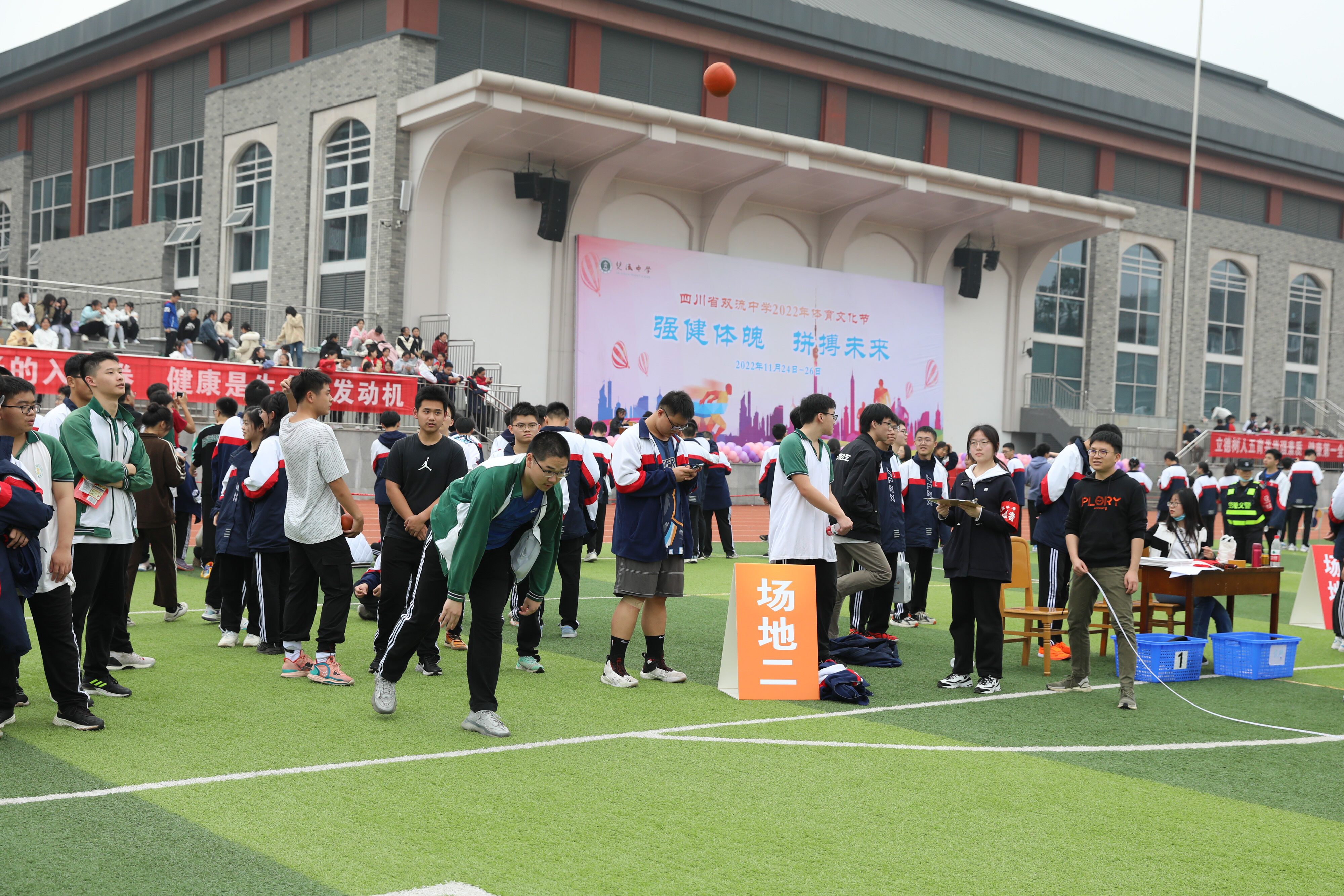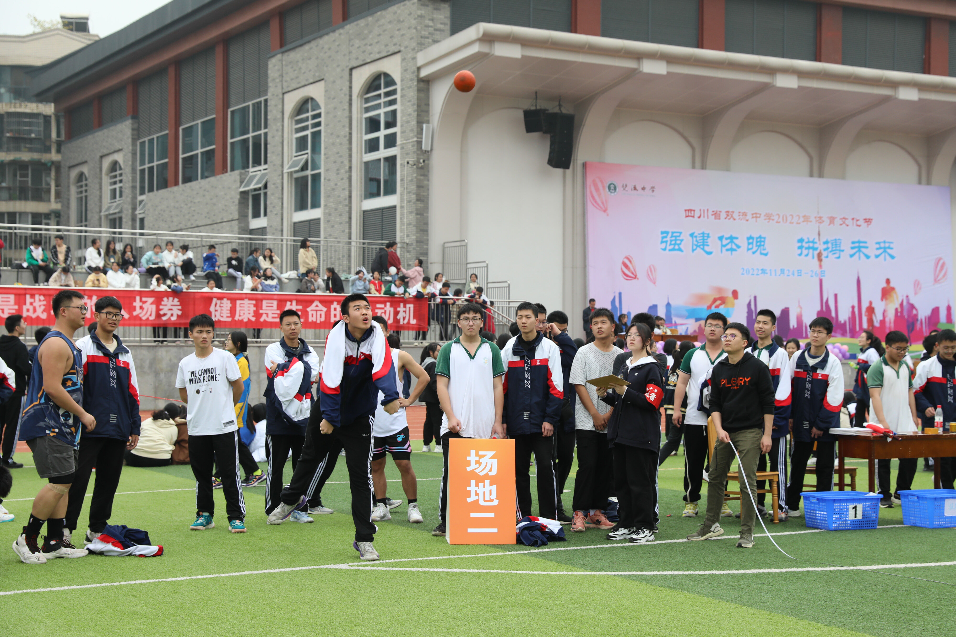 2022年11月25日下午,高二年級實(shí)心球比賽在運(yùn)動(dòng)場舉行。圖為 男子實(shí)心球比賽