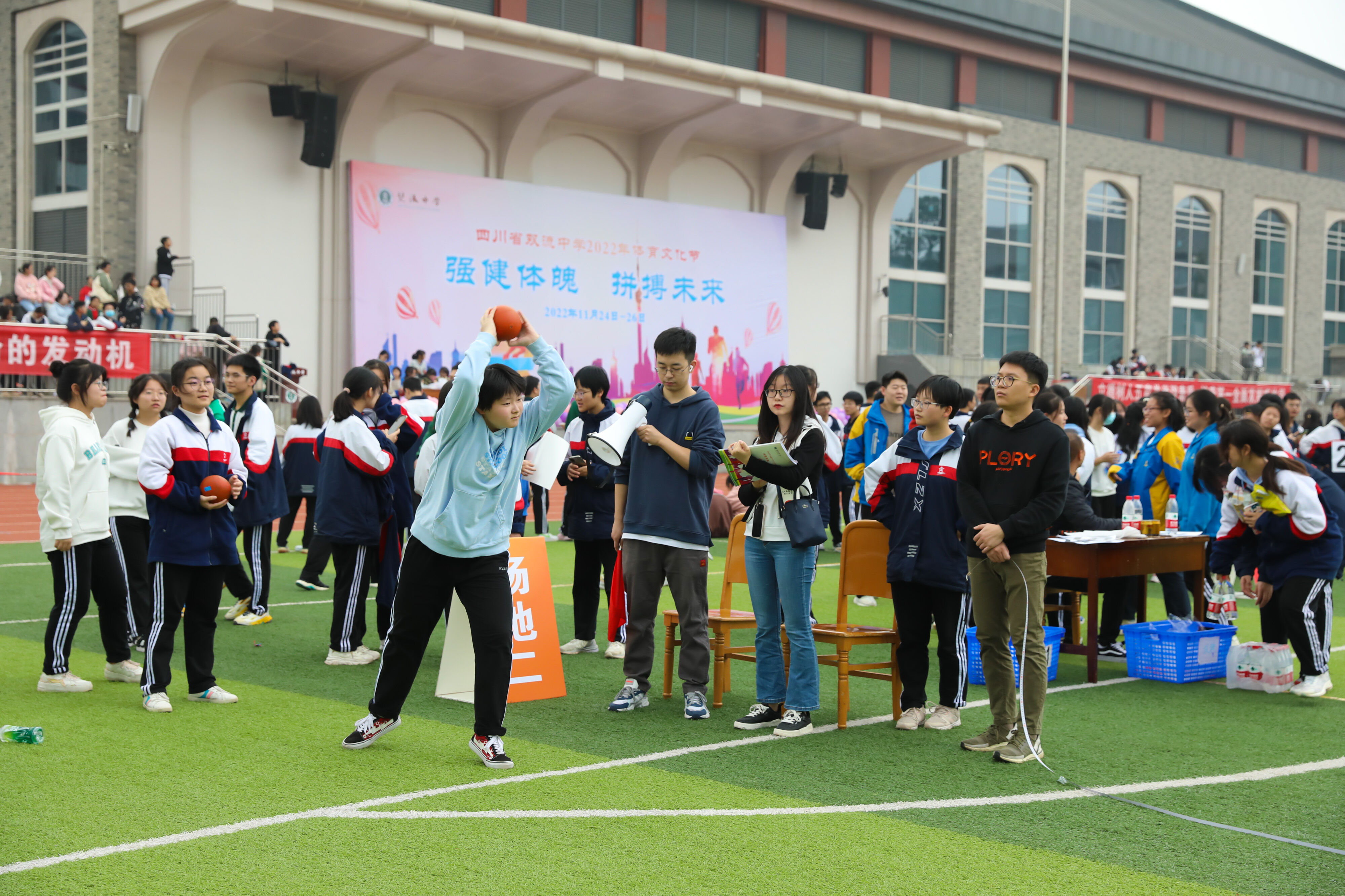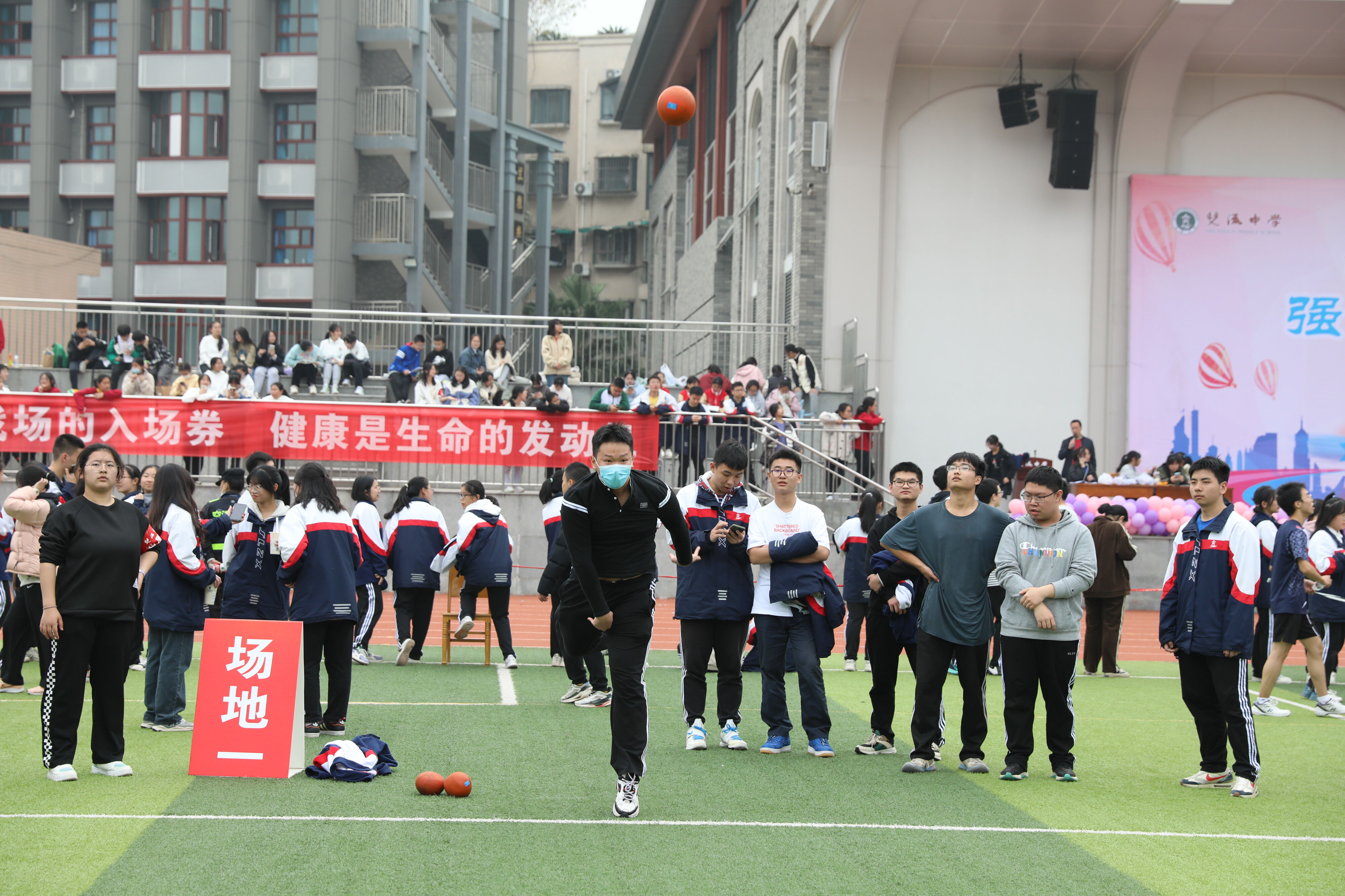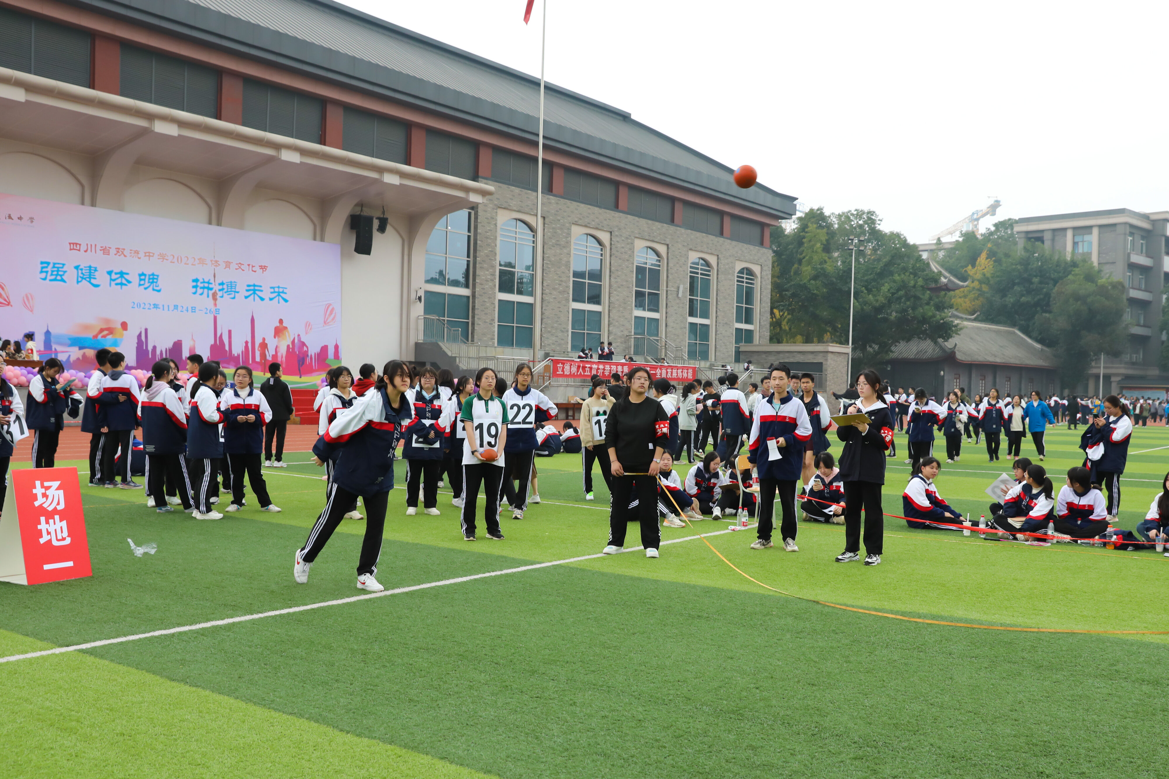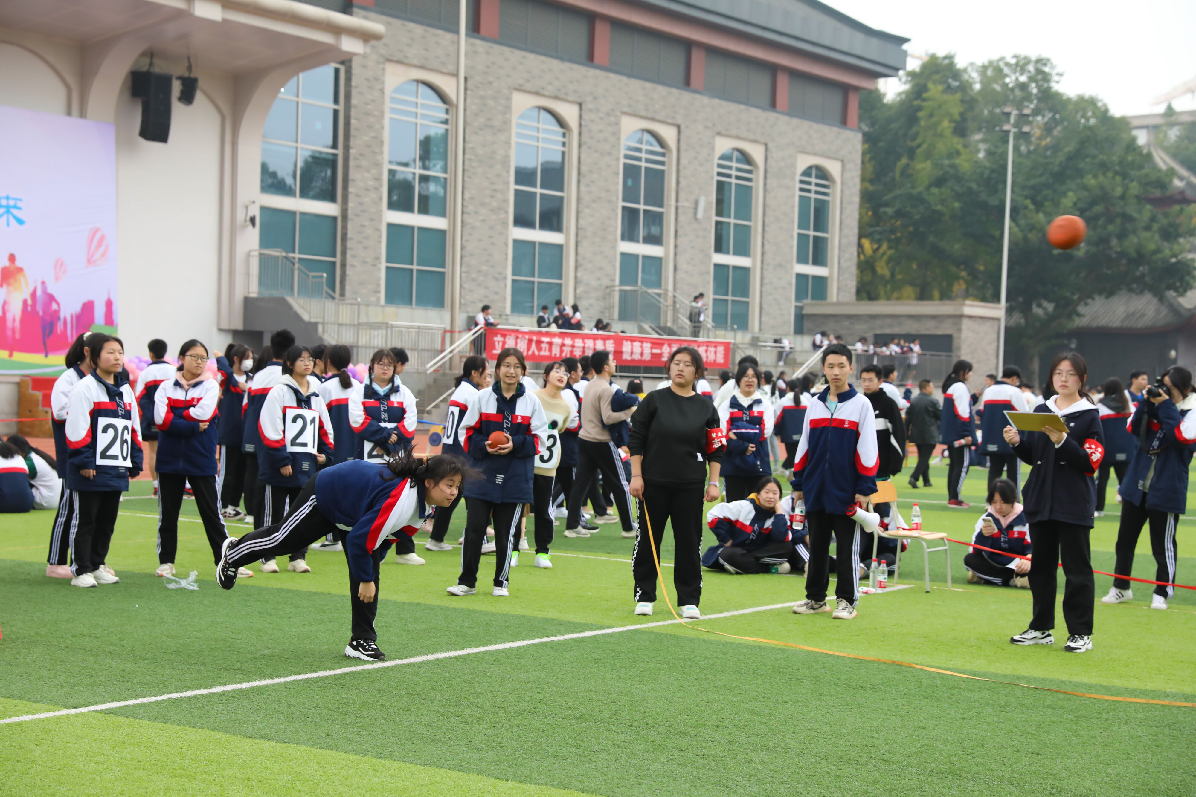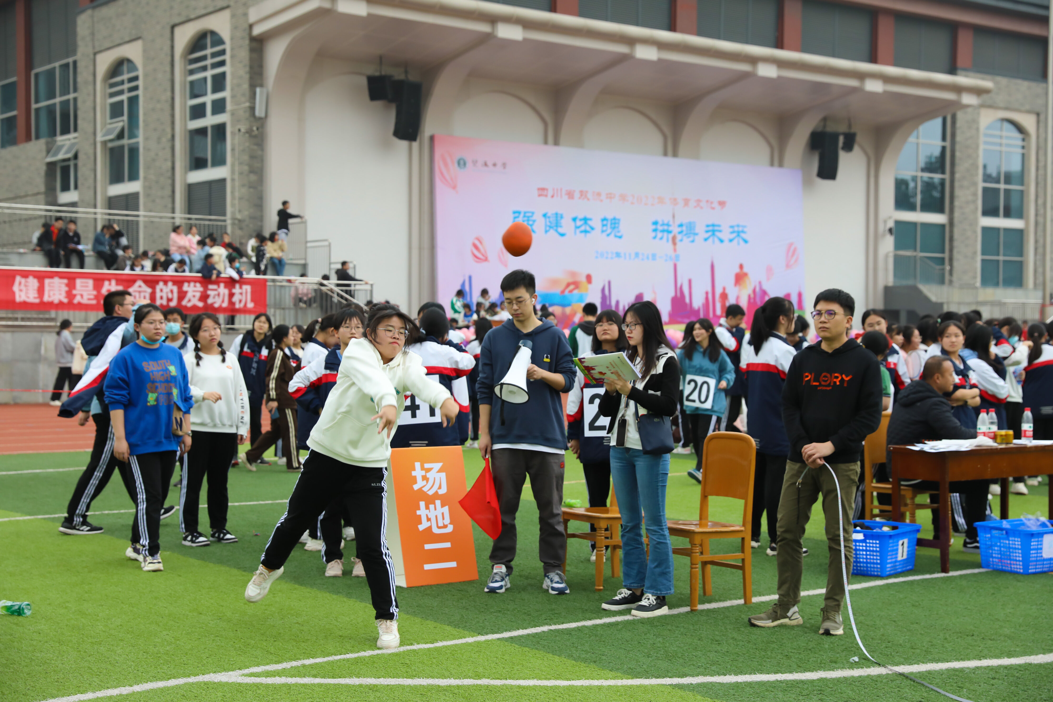 2022年11月25日下午,高二年級實(shí)心球比賽在運(yùn)動(dòng)場舉行。圖為 男子實(shí)心球比賽