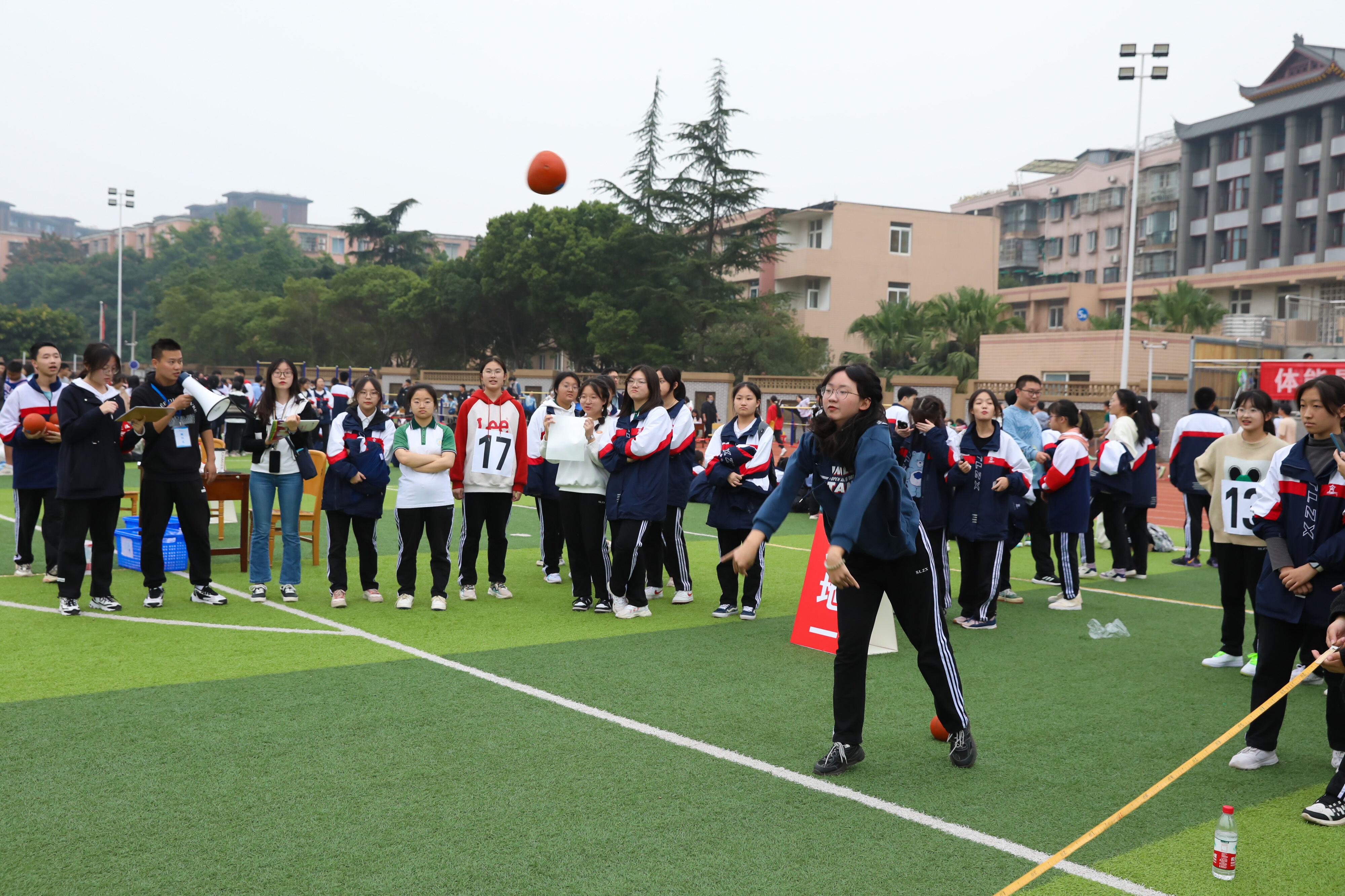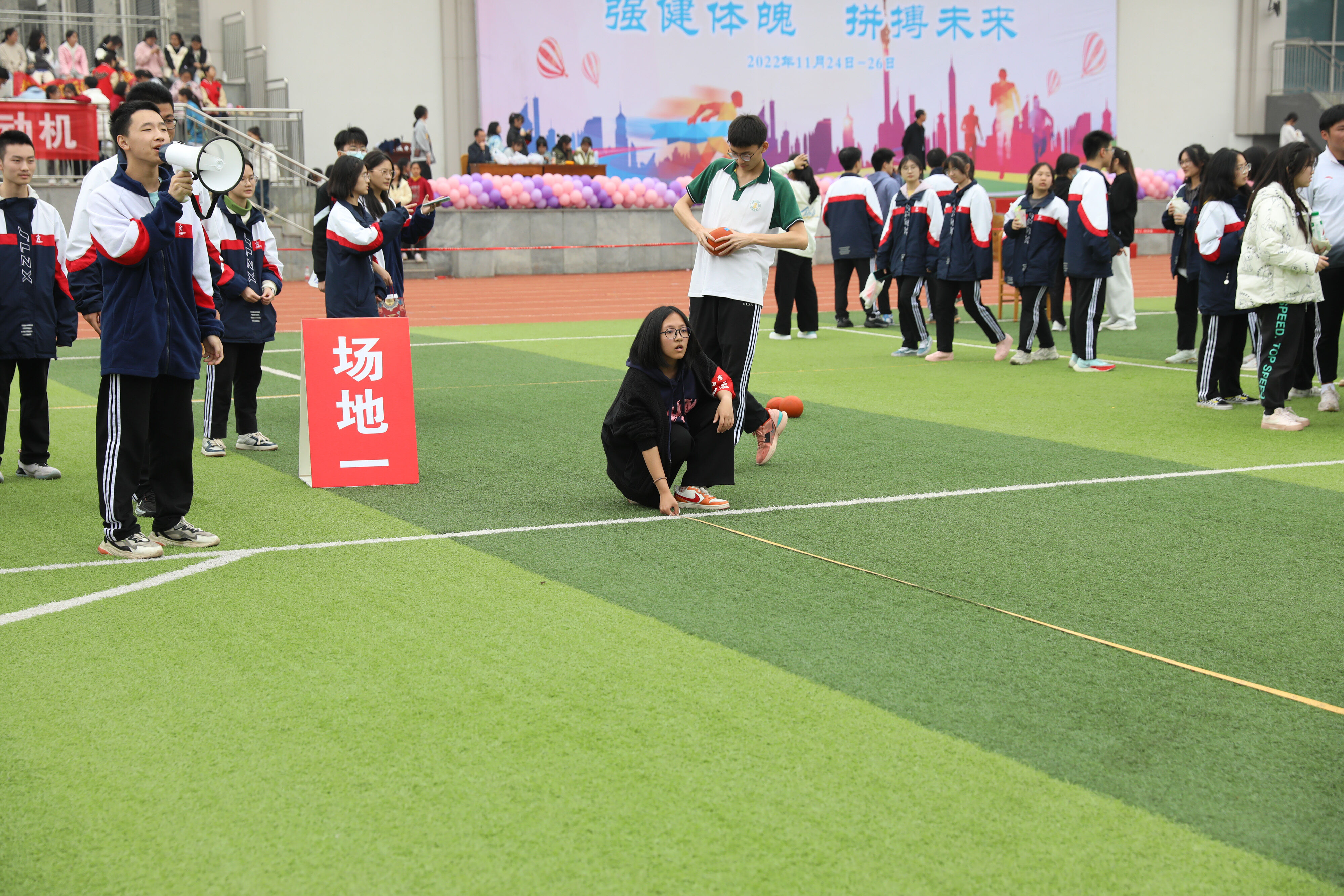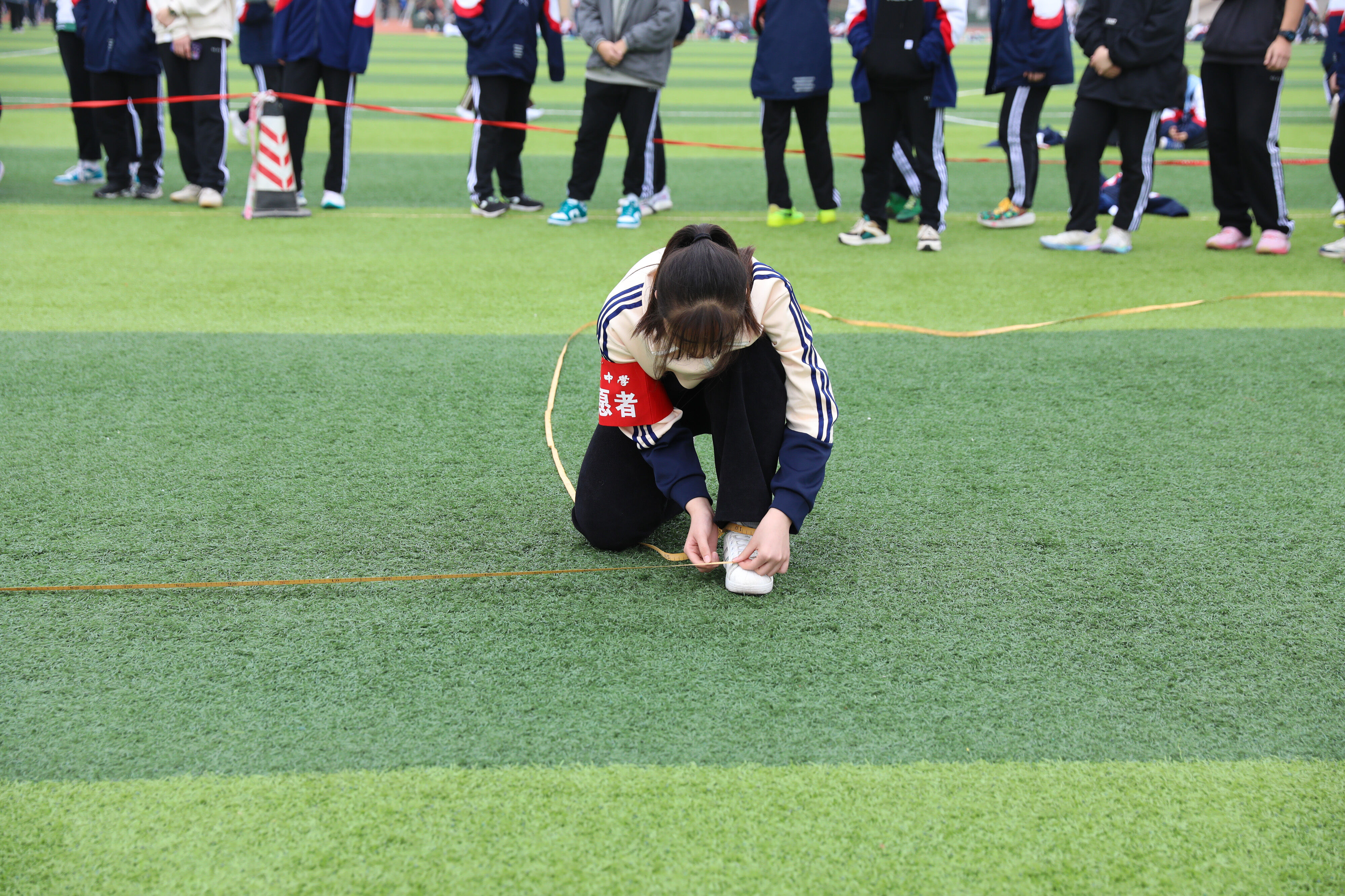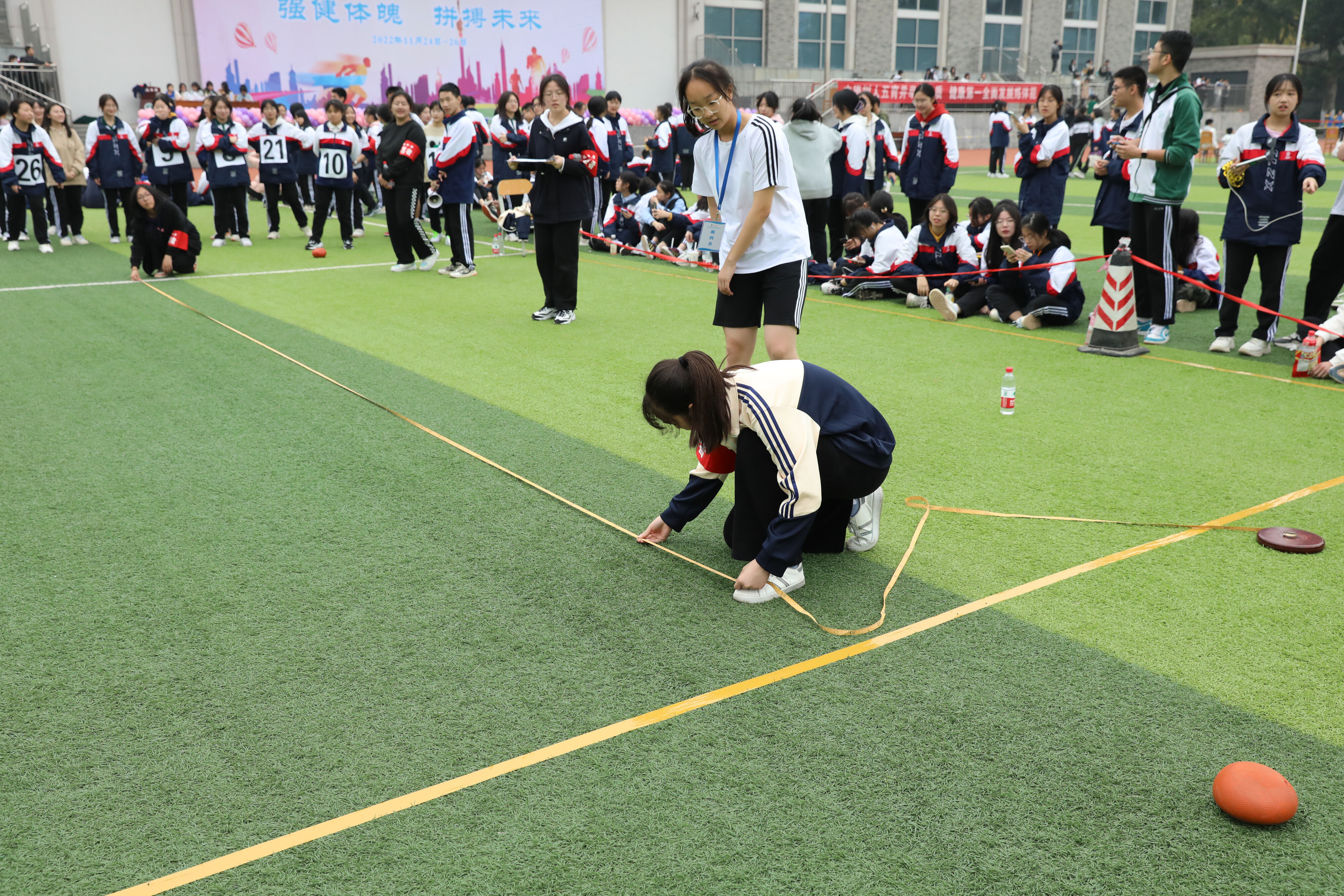 2022年11月25日下午,高二年級實(shí)心球比賽在運(yùn)動(dòng)場舉行。圖為 志愿者認(rèn)真測量
