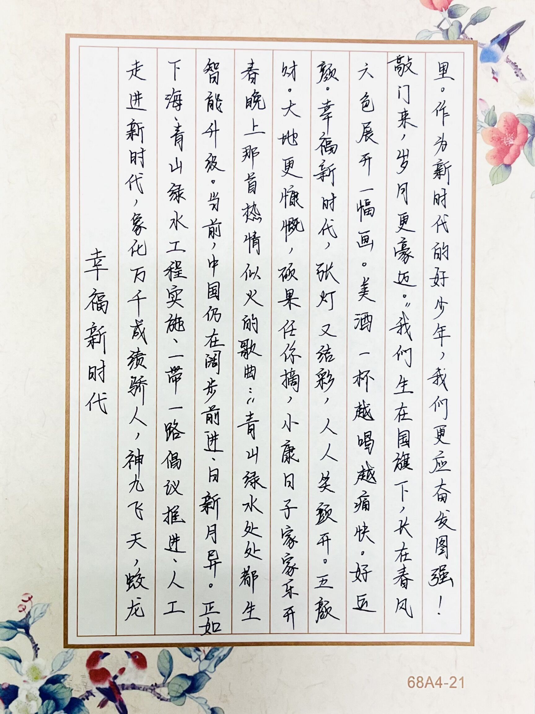 為深入貫徹習(xí)近平新時(shí)代中國(guó)特色社會(huì)主義思想和黨的二十大精神,提升少年兒童的審美能力和創(chuàng)造能力,展示反映當(dāng)代少年兒童精神風(fēng)貌的優(yōu)秀美術(shù)作品,雙流中學(xué)初中部藝體組從2022年11月中旬開(kāi)始,展開(kāi)了為期兩個(gè)月的主題樂(lè)畫(huà)活動(dòng)。圖為:八年級(jí)6班 郭昕萌 書(shū)法作品