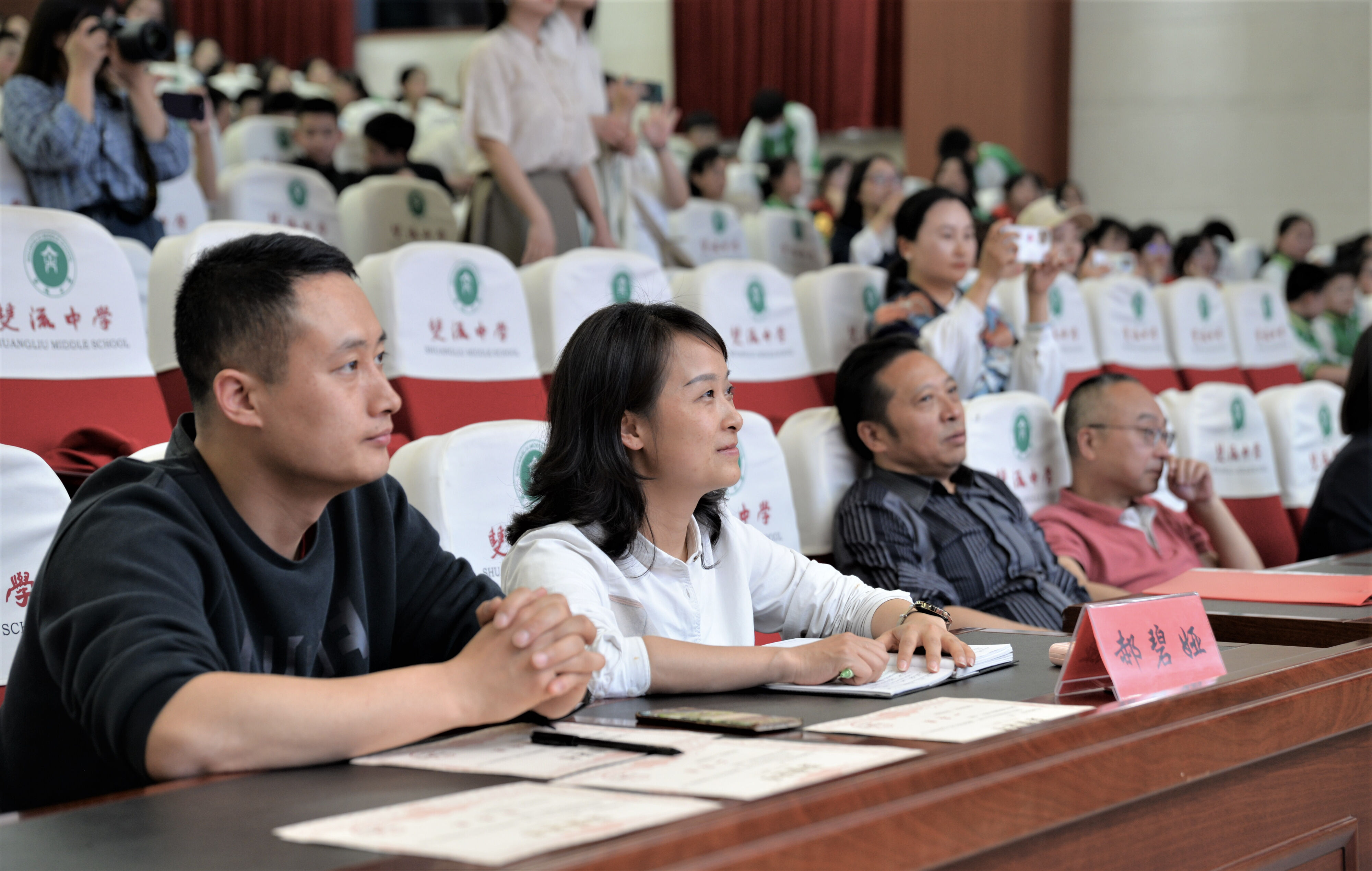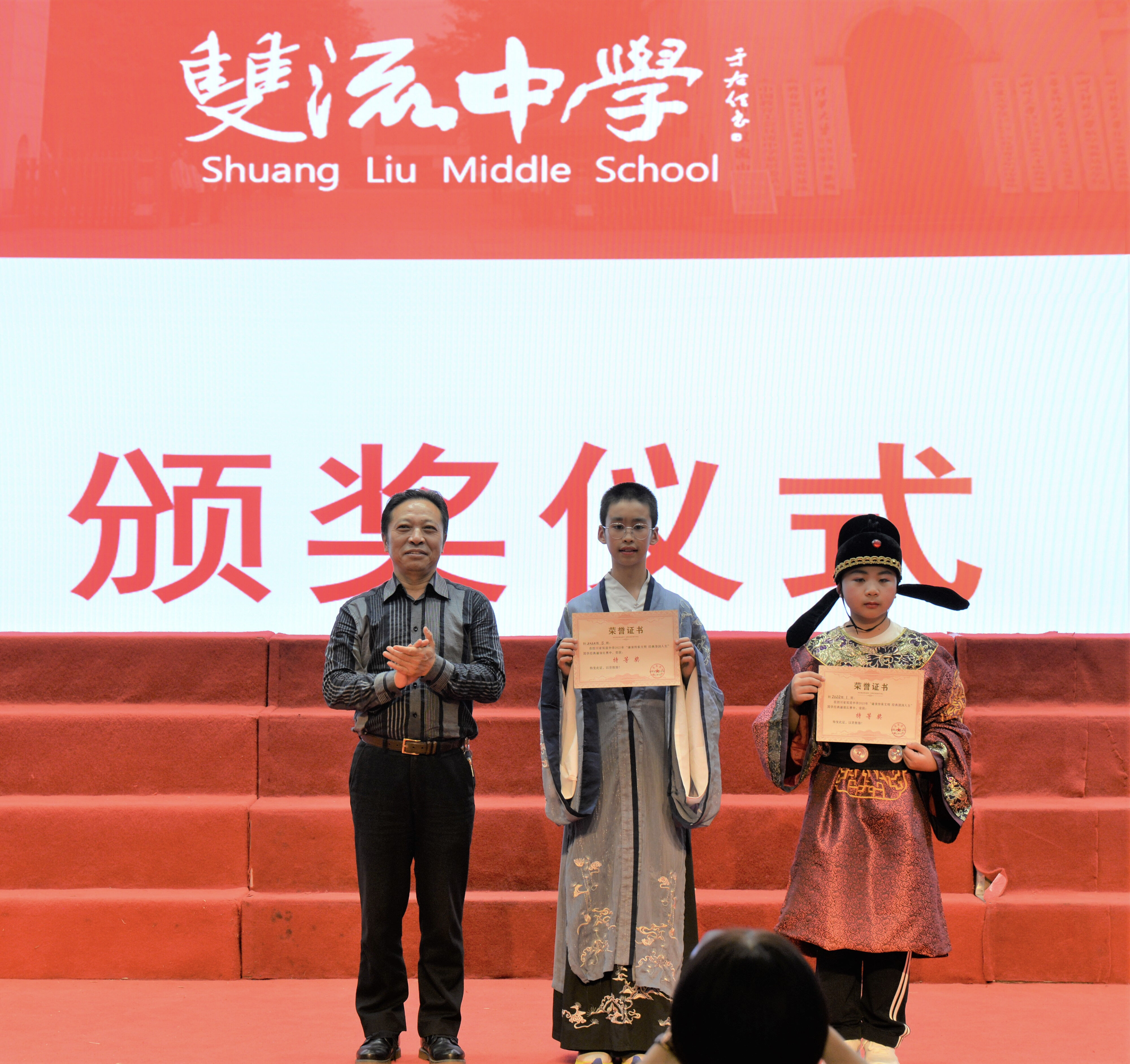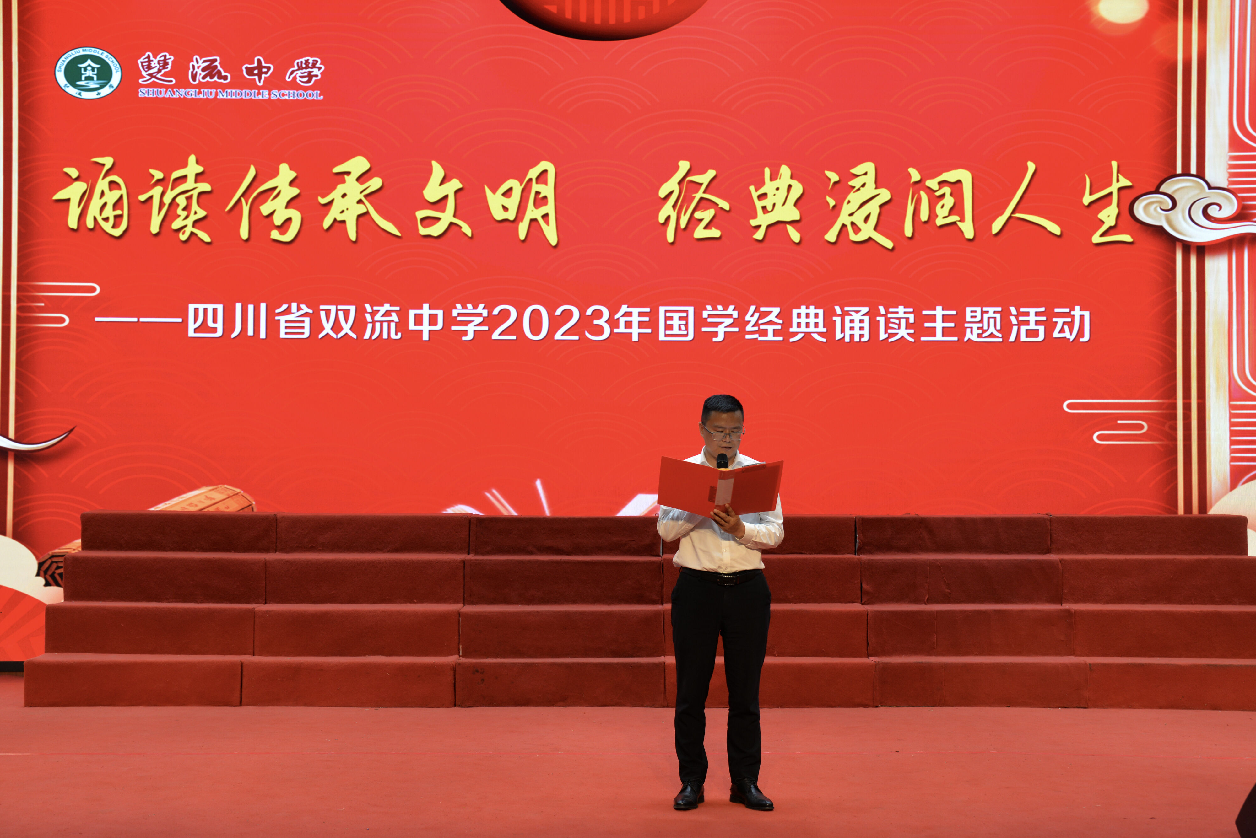 2023年4月27日晚,雙流中學(xué)初中部七年級(jí)在玉蘭廳開展了以“誦讀傳承文明·經(jīng)典浸潤人生”為主題的國學(xué)經(jīng)典朗誦比賽。雙流中學(xué)黨委書記黃超、工會(huì)主席田明建、德育安全處主任郝碧婭、德育安全處副主任夏小平、團(tuán)委副書記白玲及評(píng)委老師出席本次活動(dòng)。(圖為 雙流中學(xué)黨委書記黃超參加活動(dòng))