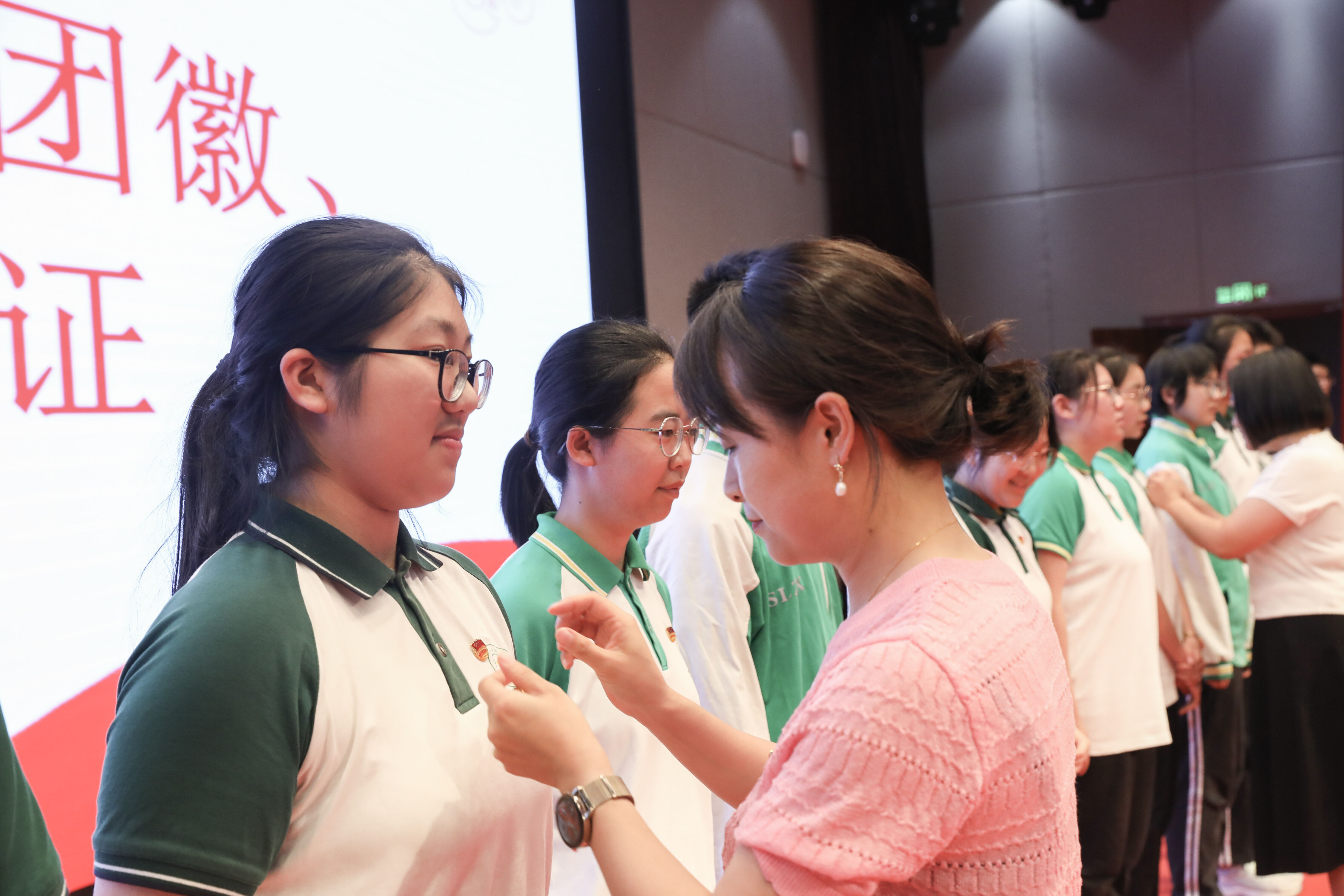 校領(lǐng)導(dǎo)為新團(tuán)員代表佩戴團(tuán)徽