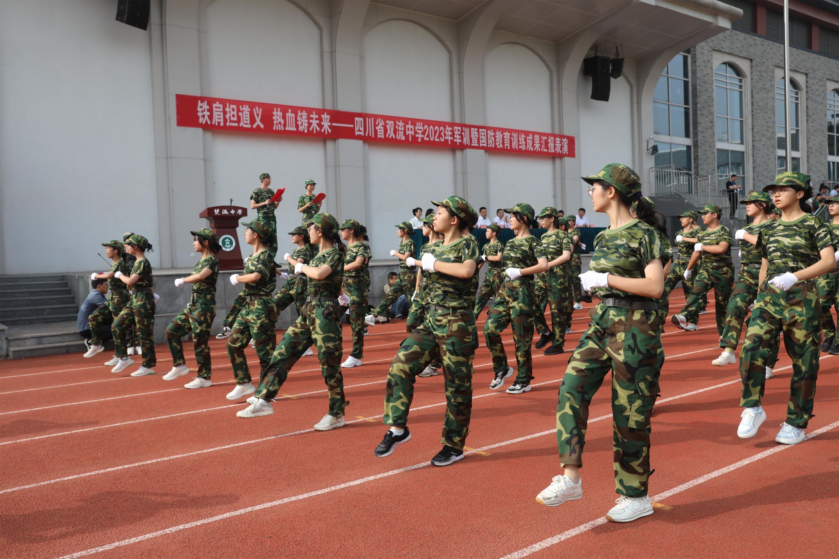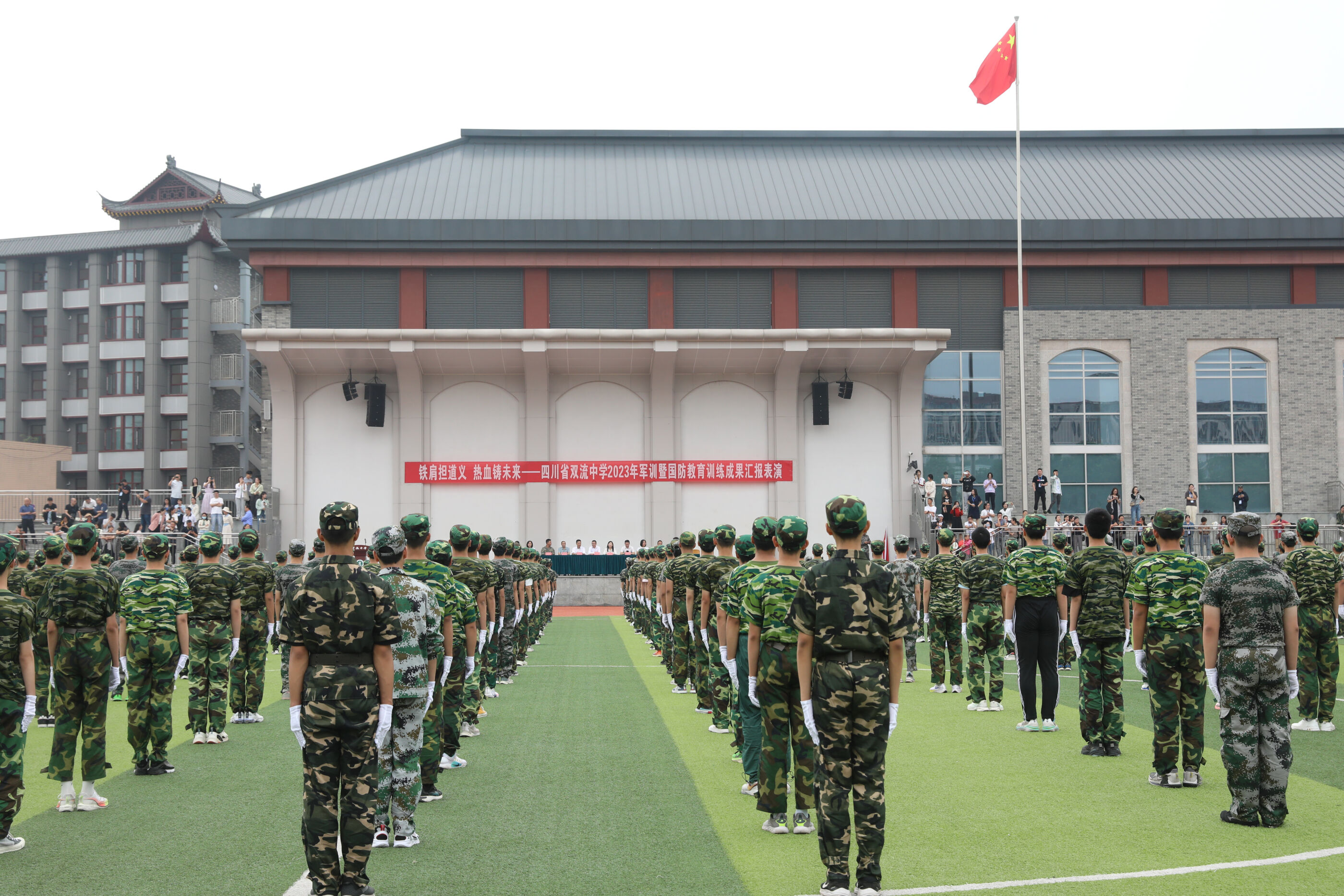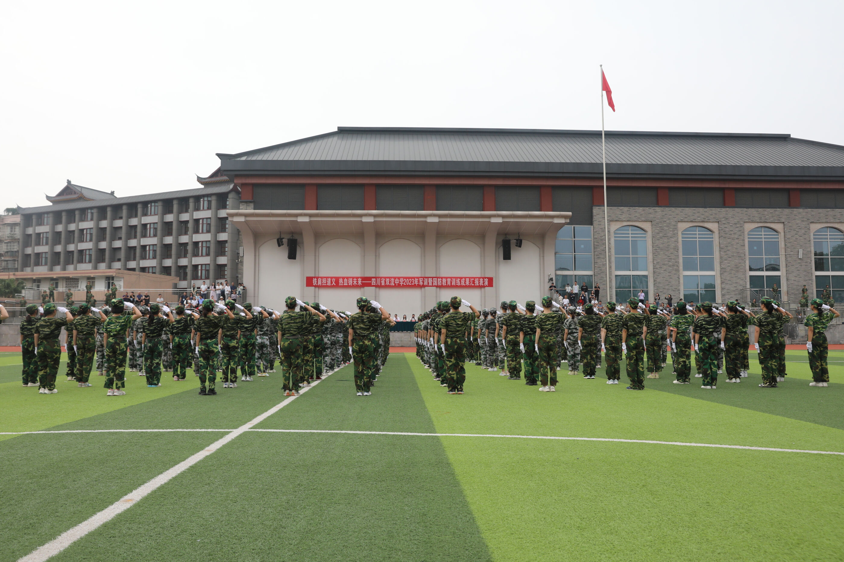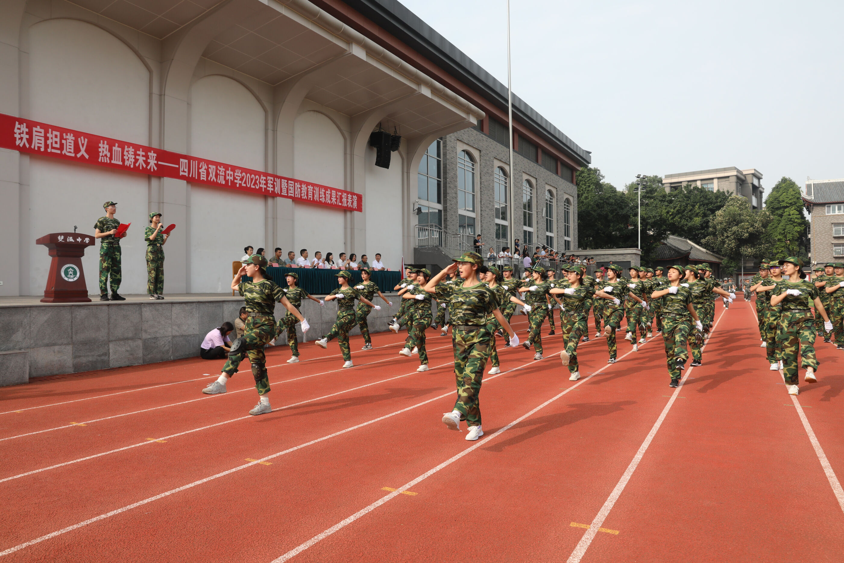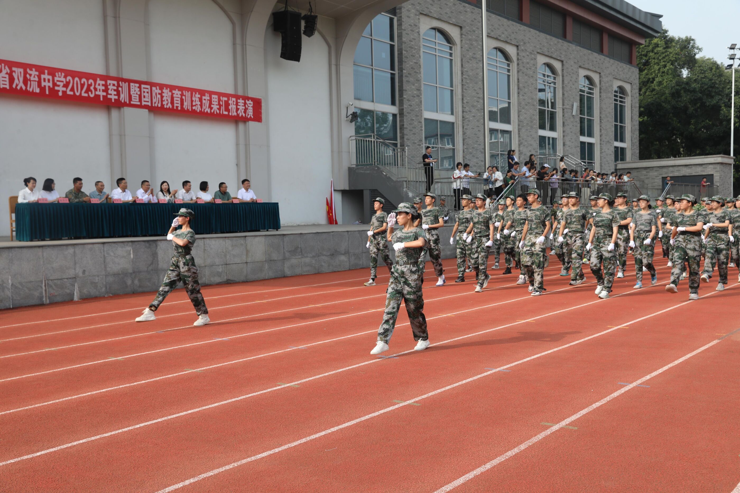 2023年9月28日上午,我校2023級新生軍訓(xùn)暨國防教育結(jié)訓(xùn)成果匯報表演在操場隆重舉行。軍訓(xùn)團(tuán)團(tuán)長趙大陸,四川省雙流中學(xué)黨委書記、校長黃超,黨委副書記、副校長譚紅,黨委副書記向發(fā)友,副校長徐天福及部分行政出席,德育安全處主任郝碧婭主持儀式。