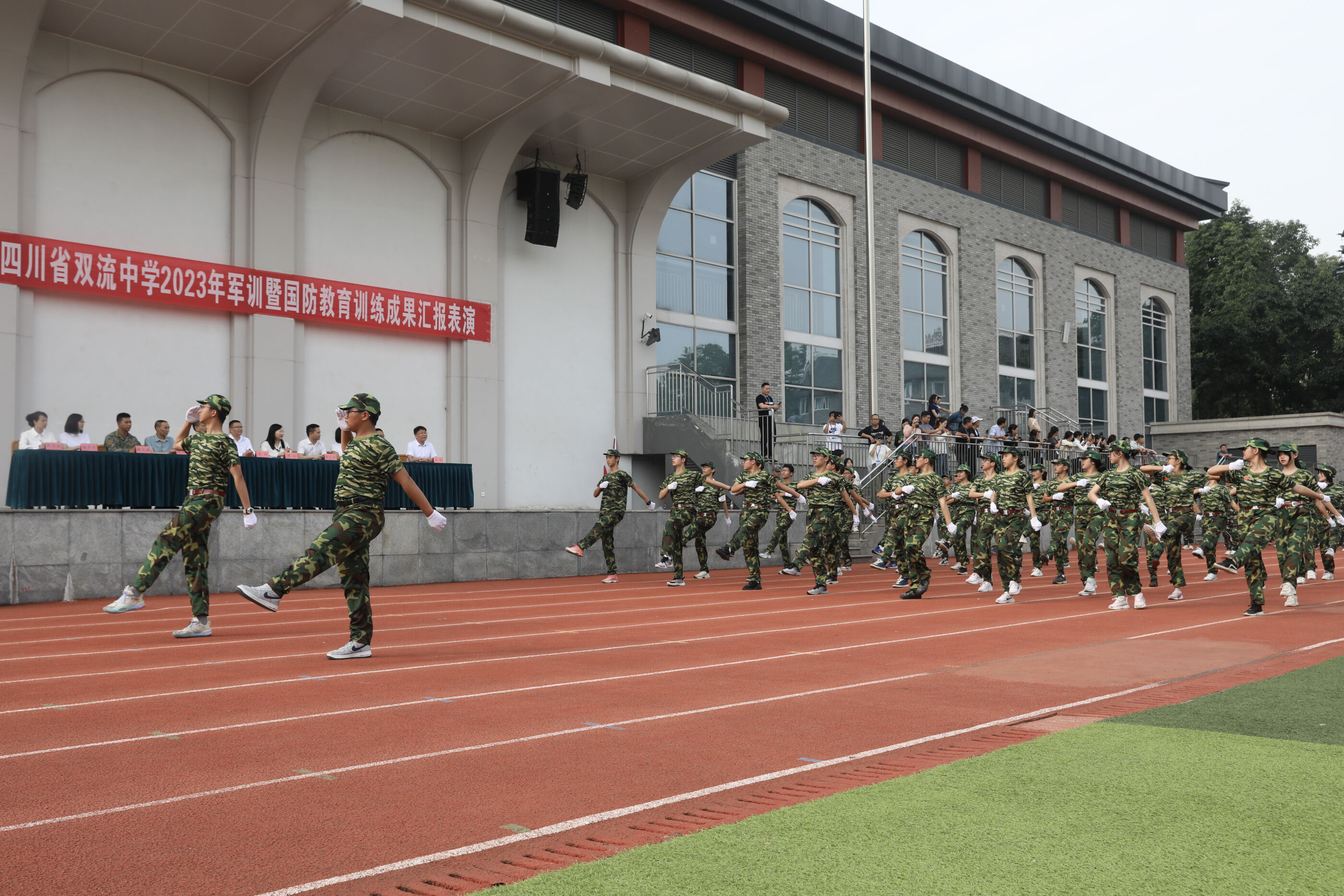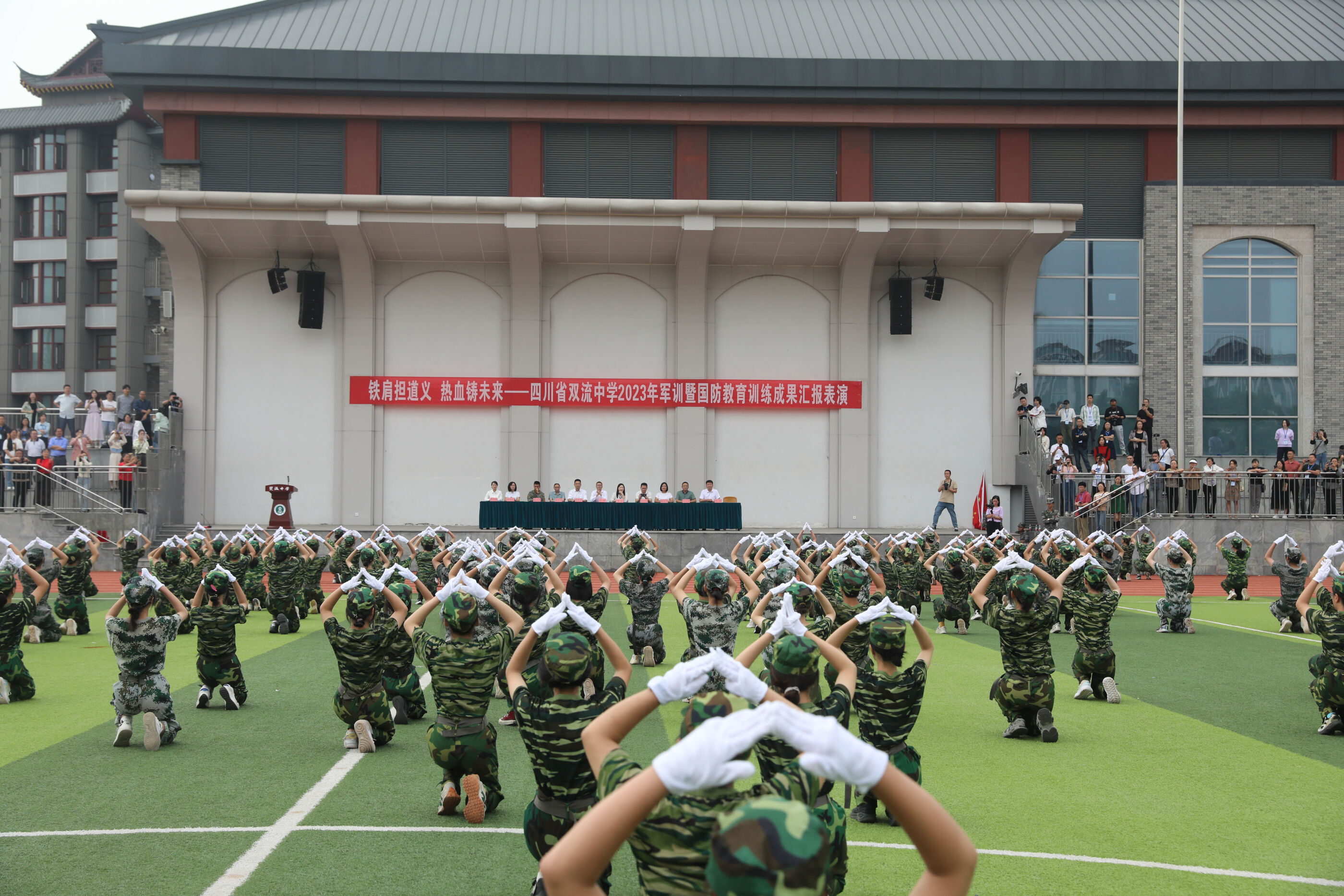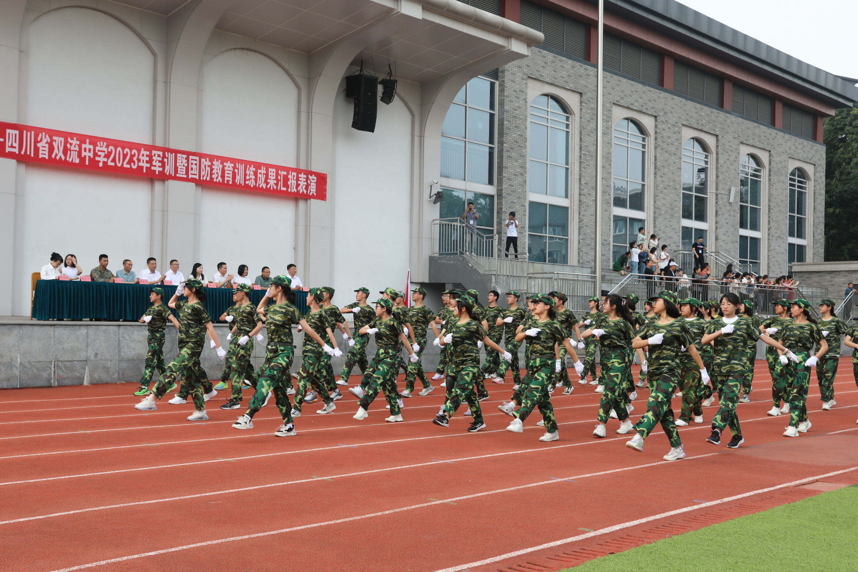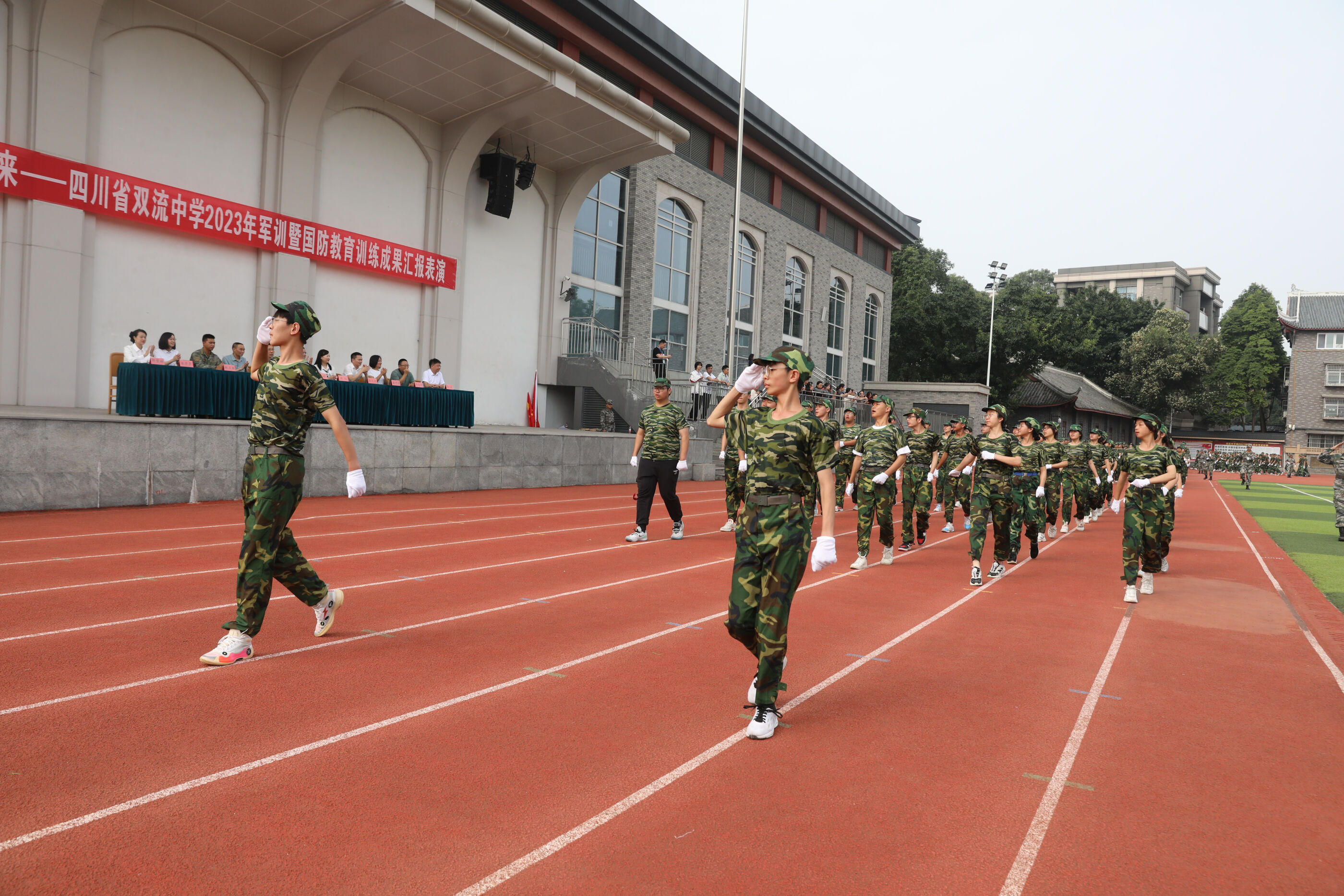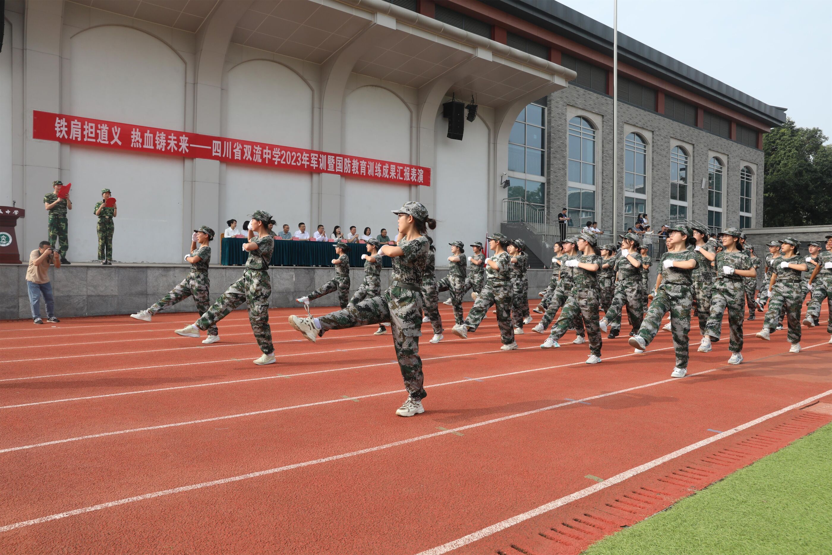 2023年9月28日上午,我校2023級新生軍訓(xùn)暨國防教育結(jié)訓(xùn)成果匯報表演在操場隆重舉行。軍訓(xùn)團(tuán)團(tuán)長趙大陸,四川省雙流中學(xué)黨委書記、校長黃超,黨委副書記、副校長譚紅,黨委副書記向發(fā)友,副校長徐天福及部分行政出席,德育安全處主任郝碧婭主持儀式。