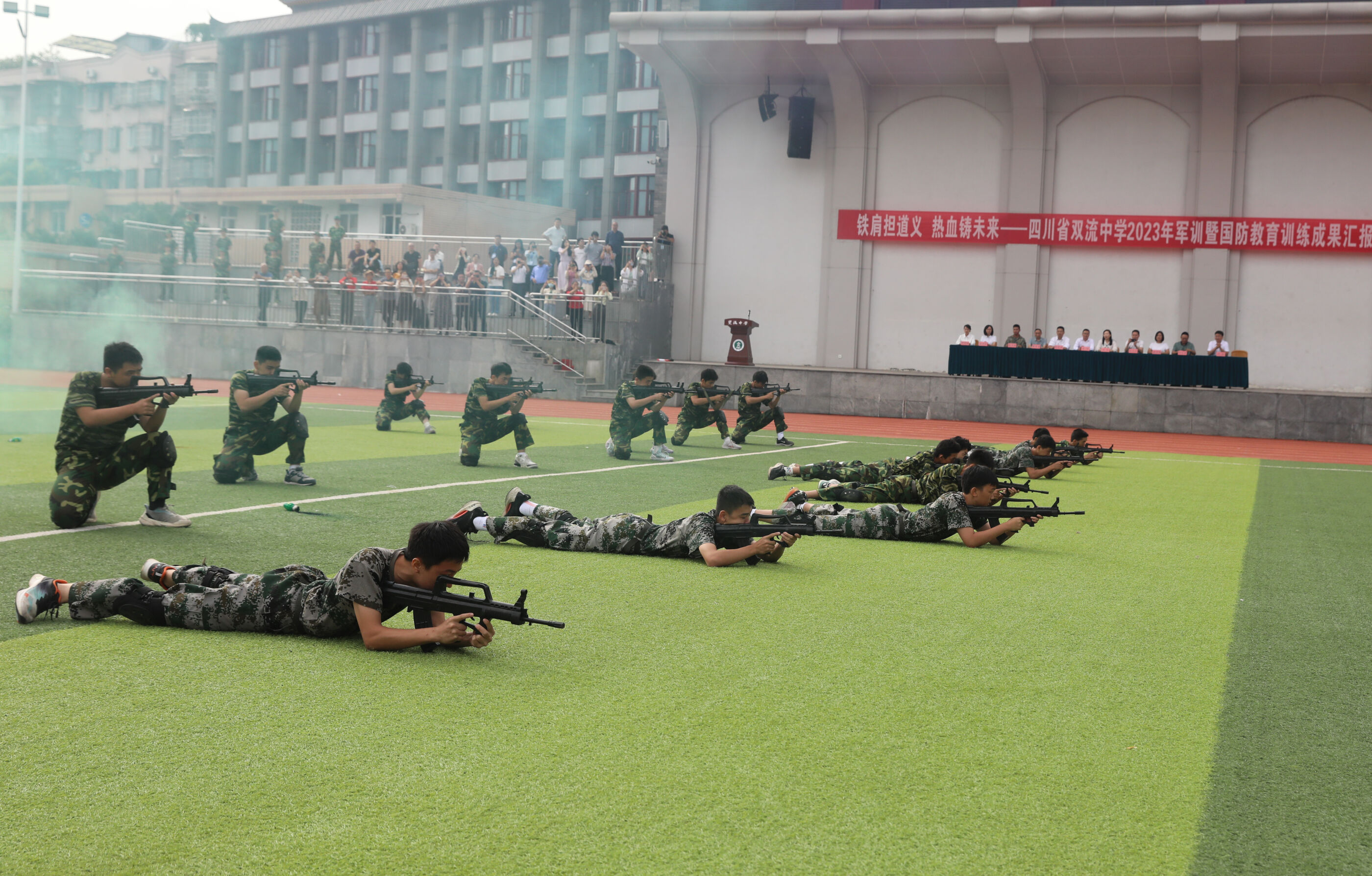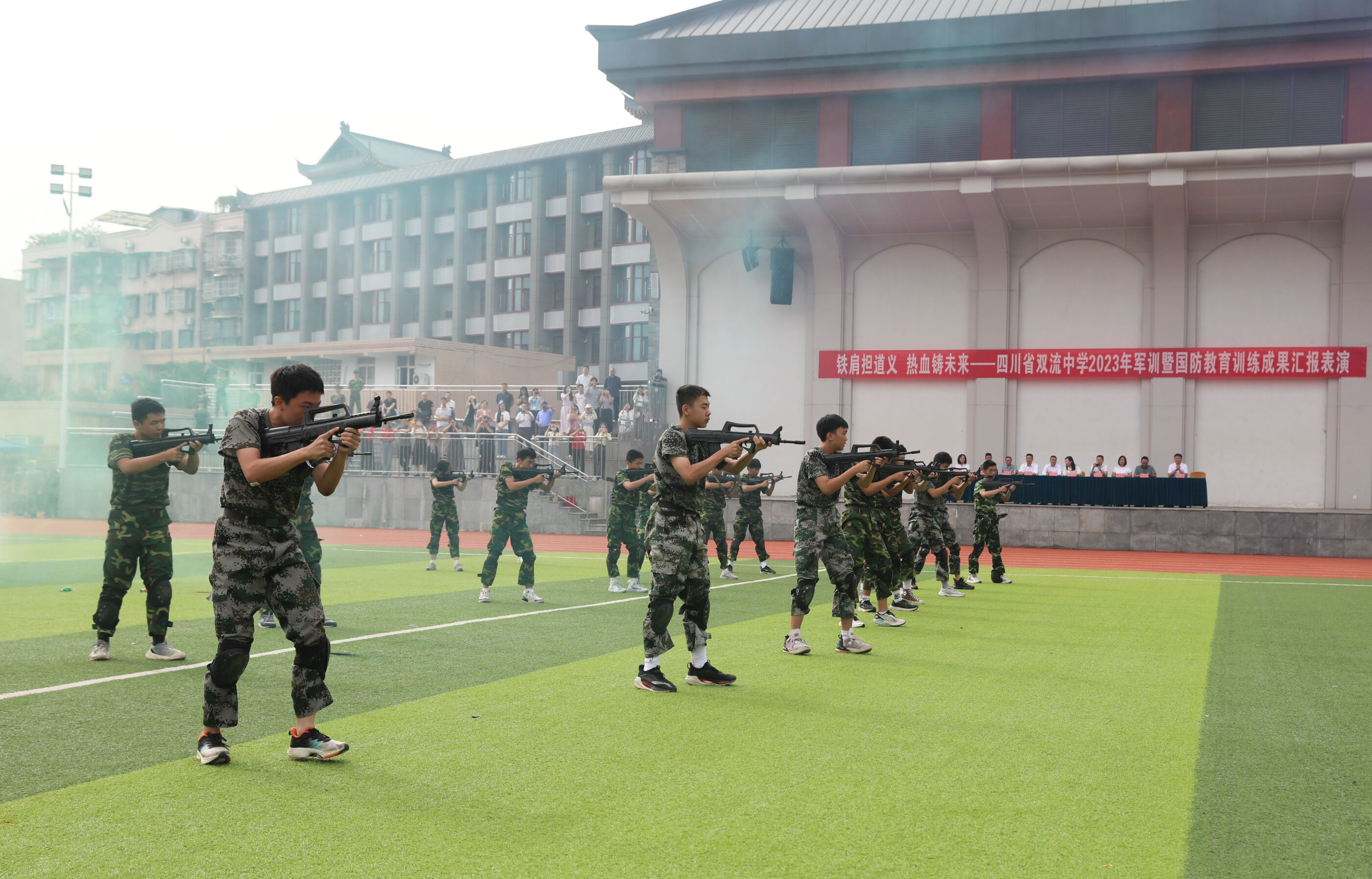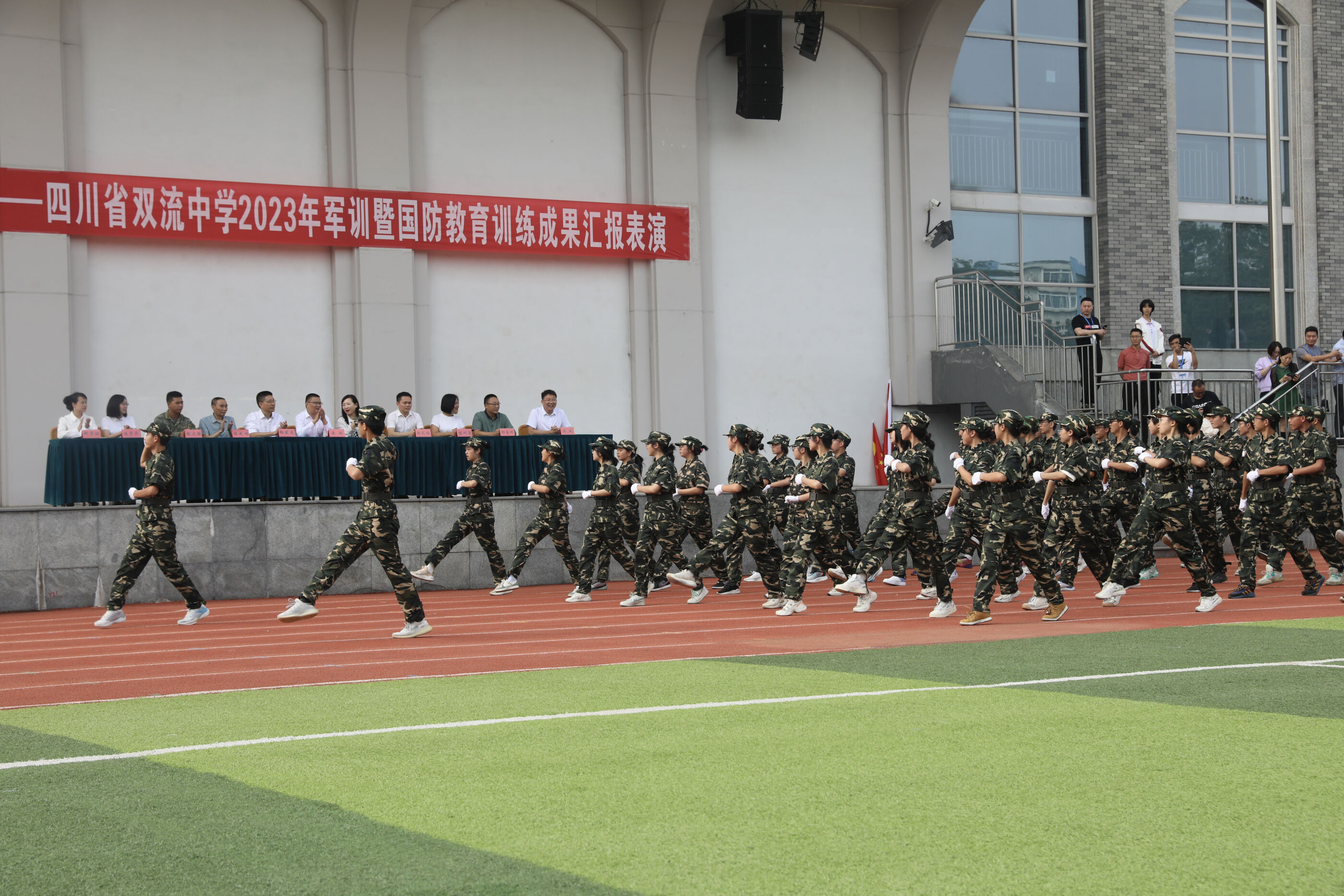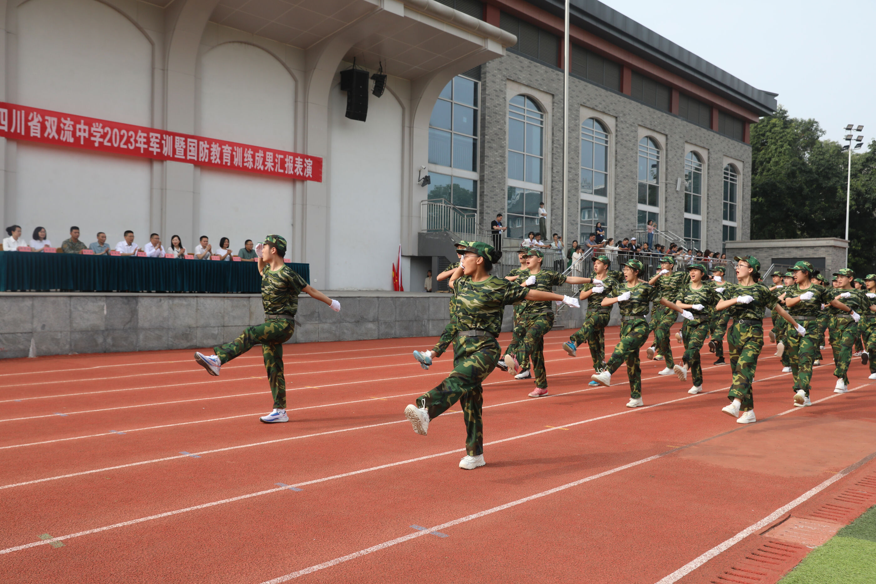 2023年9月28日上午,我校2023級新生軍訓(xùn)暨國防教育結(jié)訓(xùn)成果匯報表演在操場隆重舉行。軍訓(xùn)團(tuán)團(tuán)長趙大陸,四川省雙流中學(xué)黨委書記、校長黃超,黨委副書記、副校長譚紅,黨委副書記向發(fā)友,副校長徐天福及部分行政出席,德育安全處主任郝碧婭主持儀式。