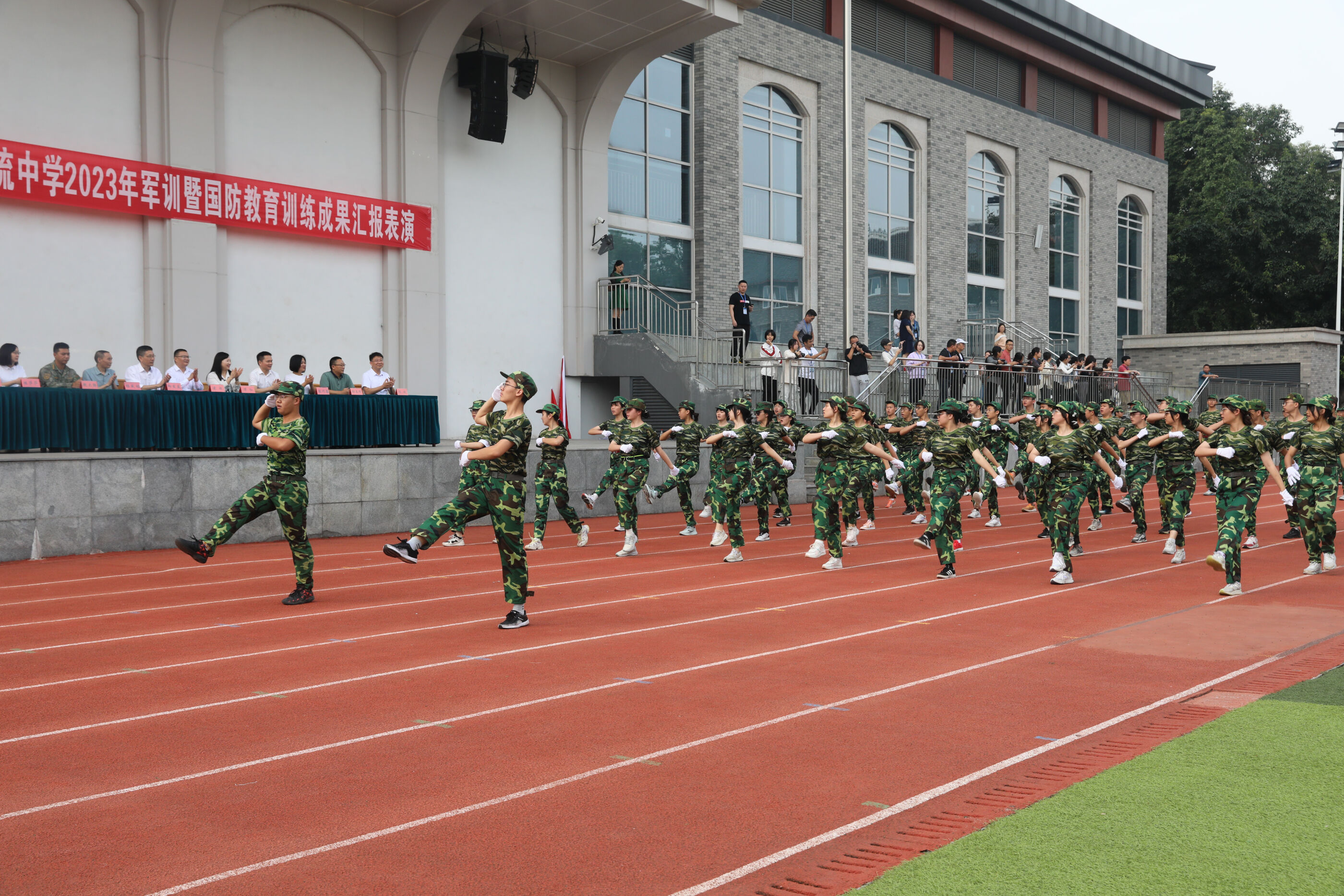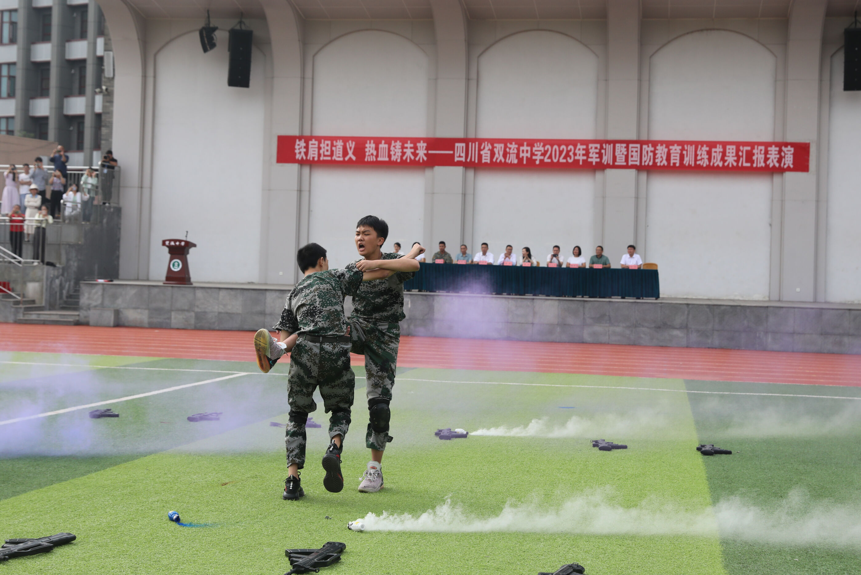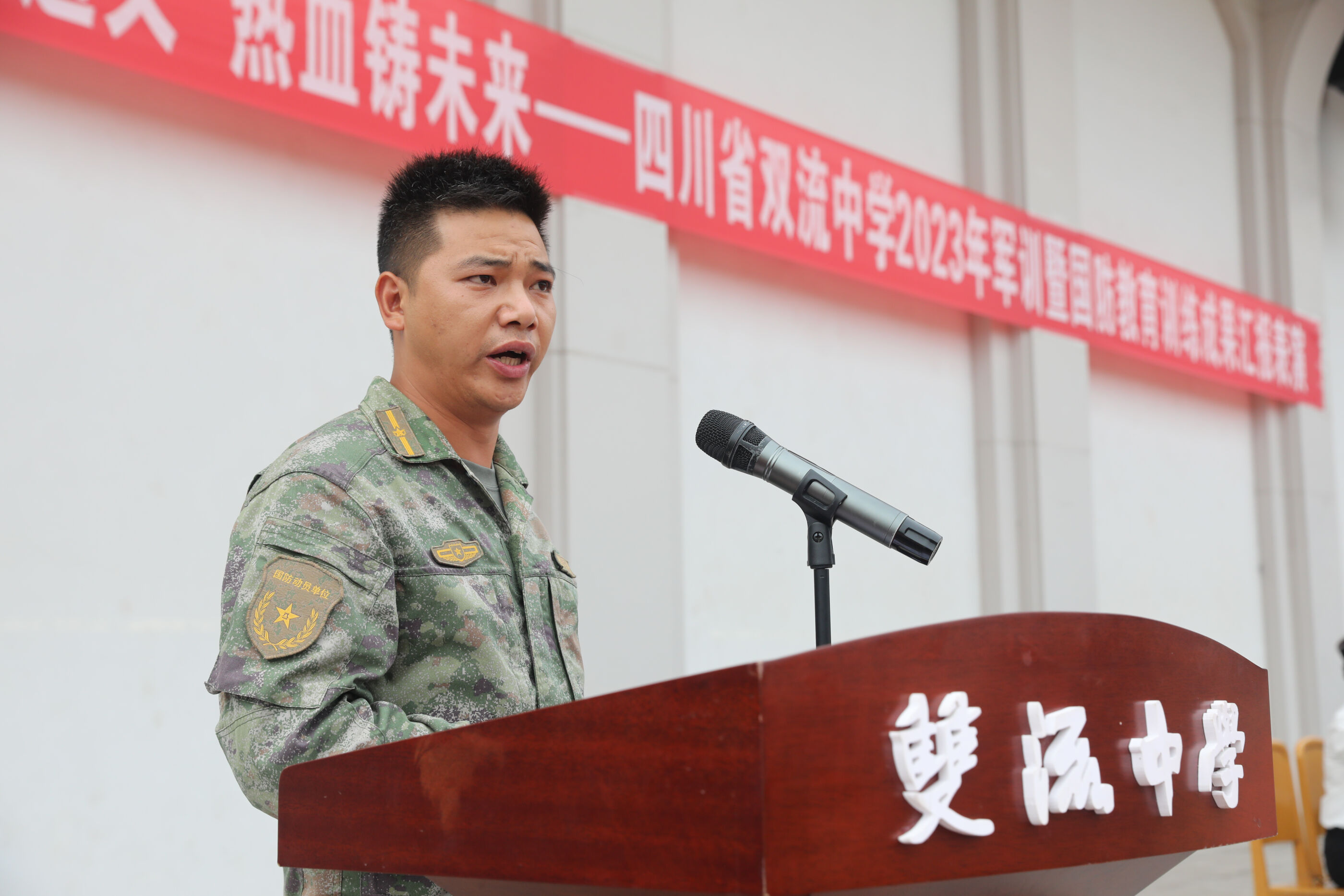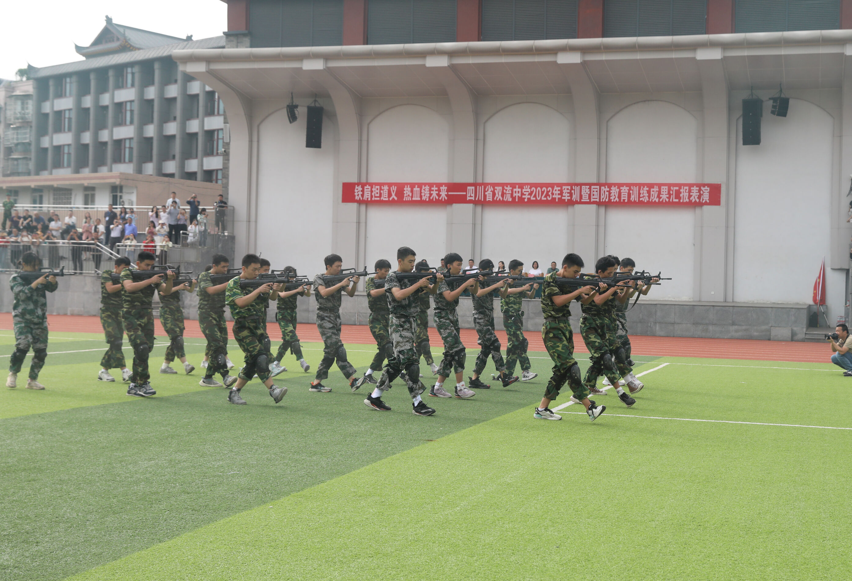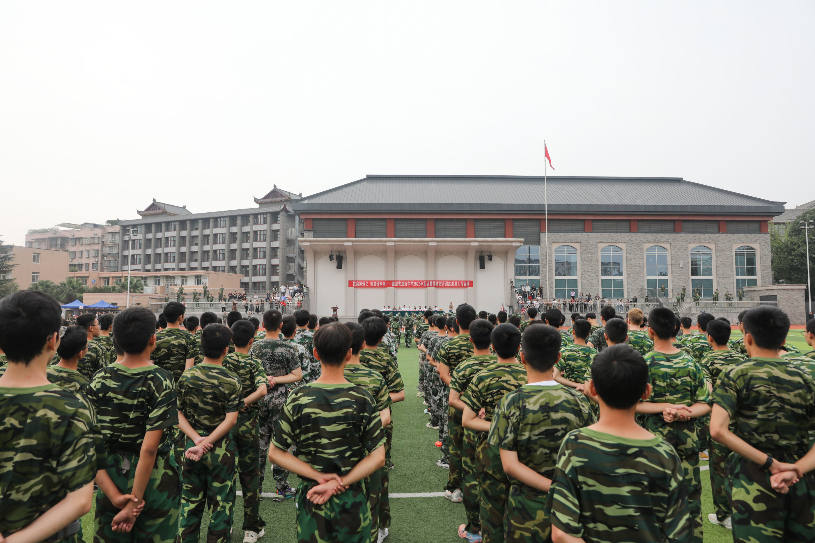2023年9月28日上午,我校2023級新生軍訓(xùn)暨國防教育結(jié)訓(xùn)成果匯報表演在操場隆重舉行。軍訓(xùn)團(tuán)團(tuán)長趙大陸,四川省雙流中學(xué)黨委書記、校長黃超,黨委副書記、副校長譚紅,黨委副書記向發(fā)友,副校長徐天福及部分行政出席,德育安全處主任郝碧婭主持儀式。